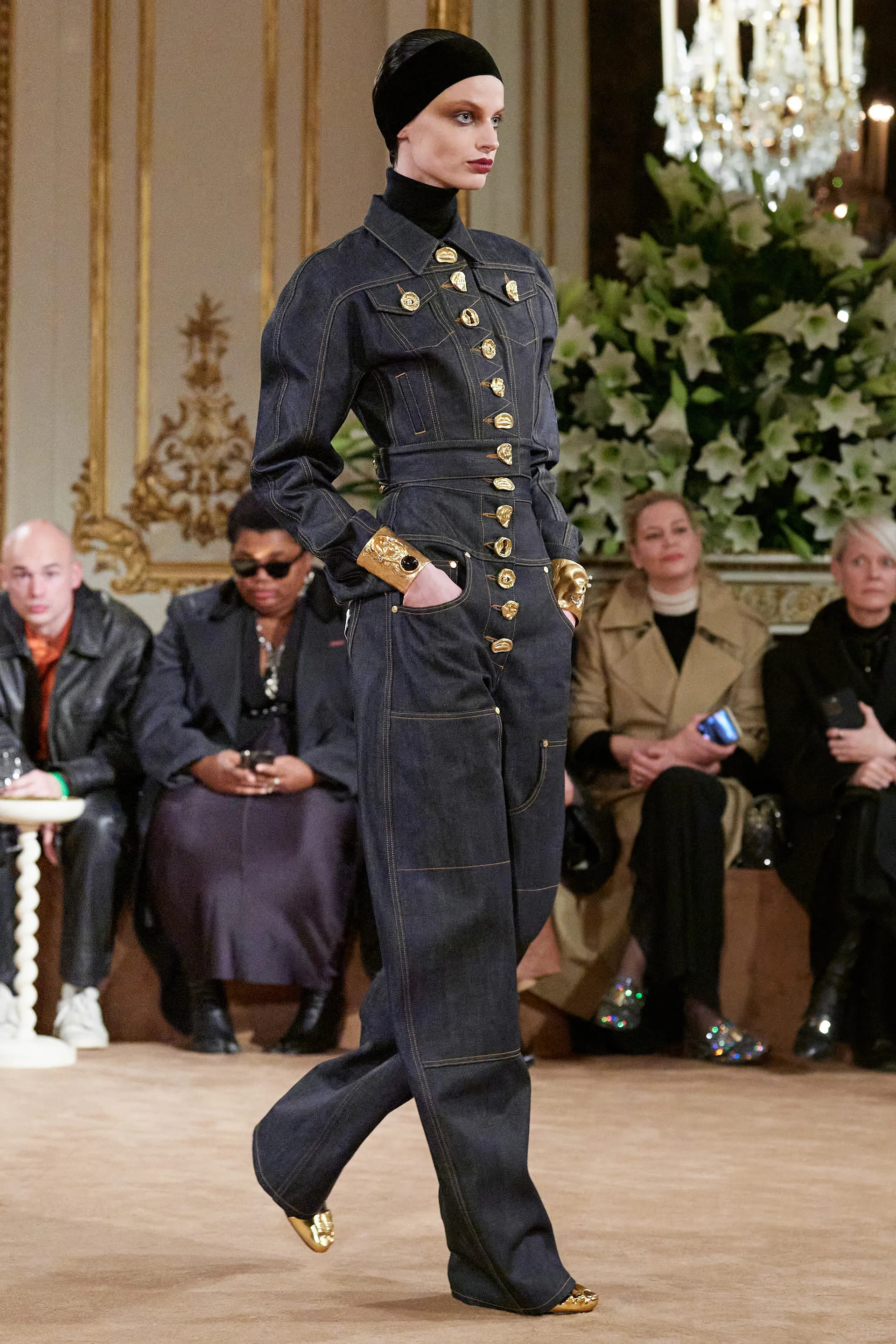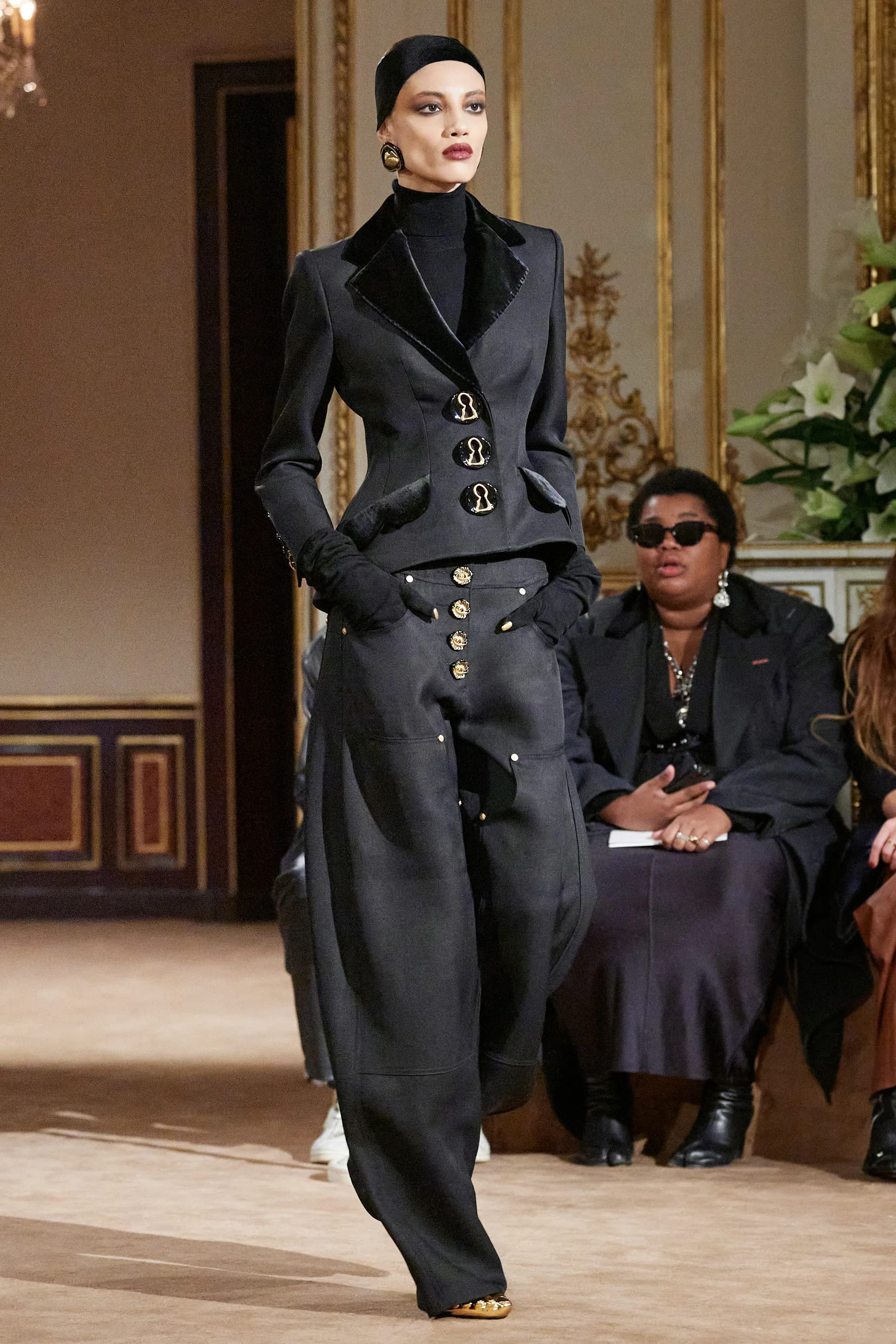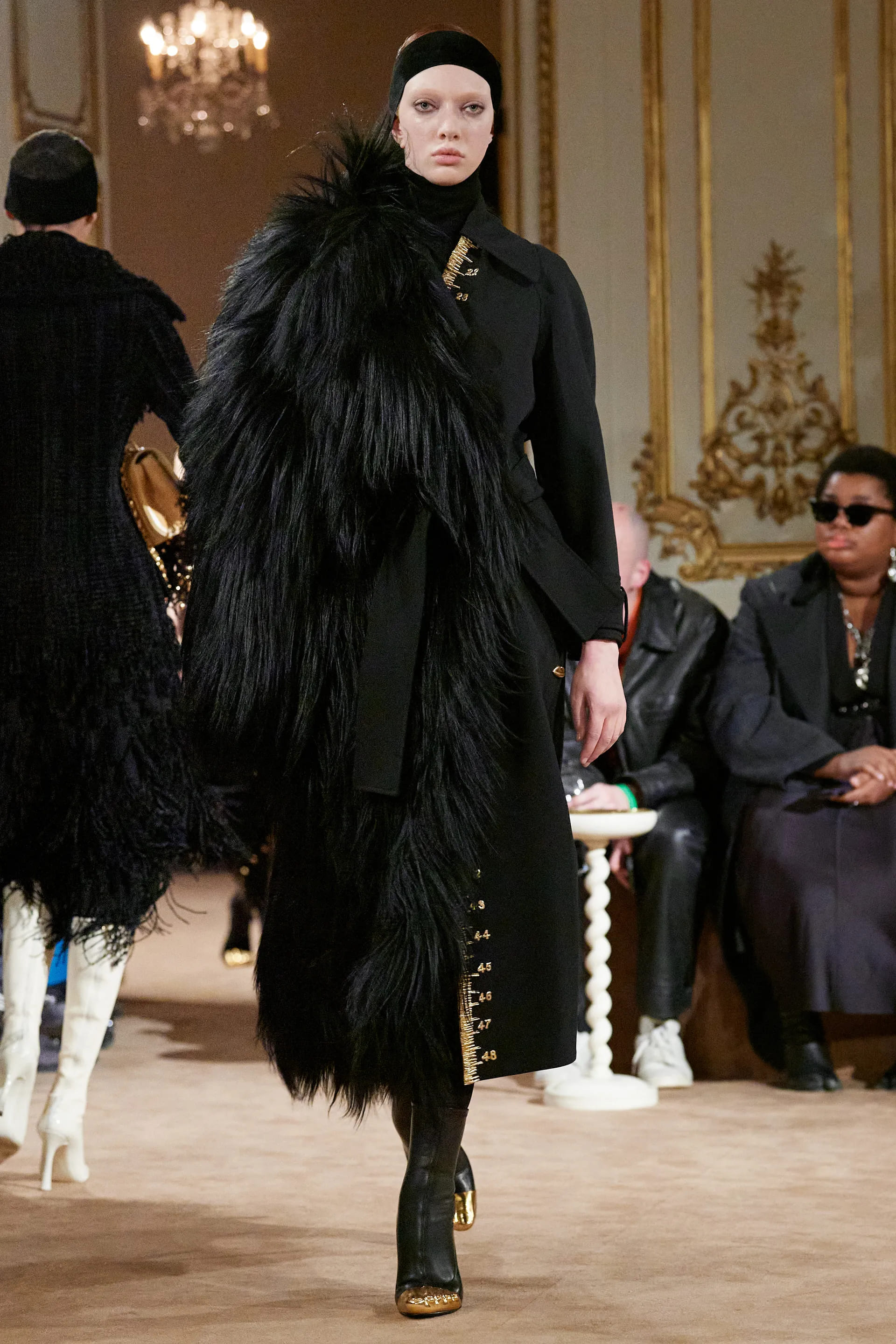 Також Schiaparelli презентували й пальта з обробкою тканини у вигляді морських водорослів, костюми з приталеними жакетами та широкими штанями у денімі та велюрі та, уперше, об’ємні зимні парки.