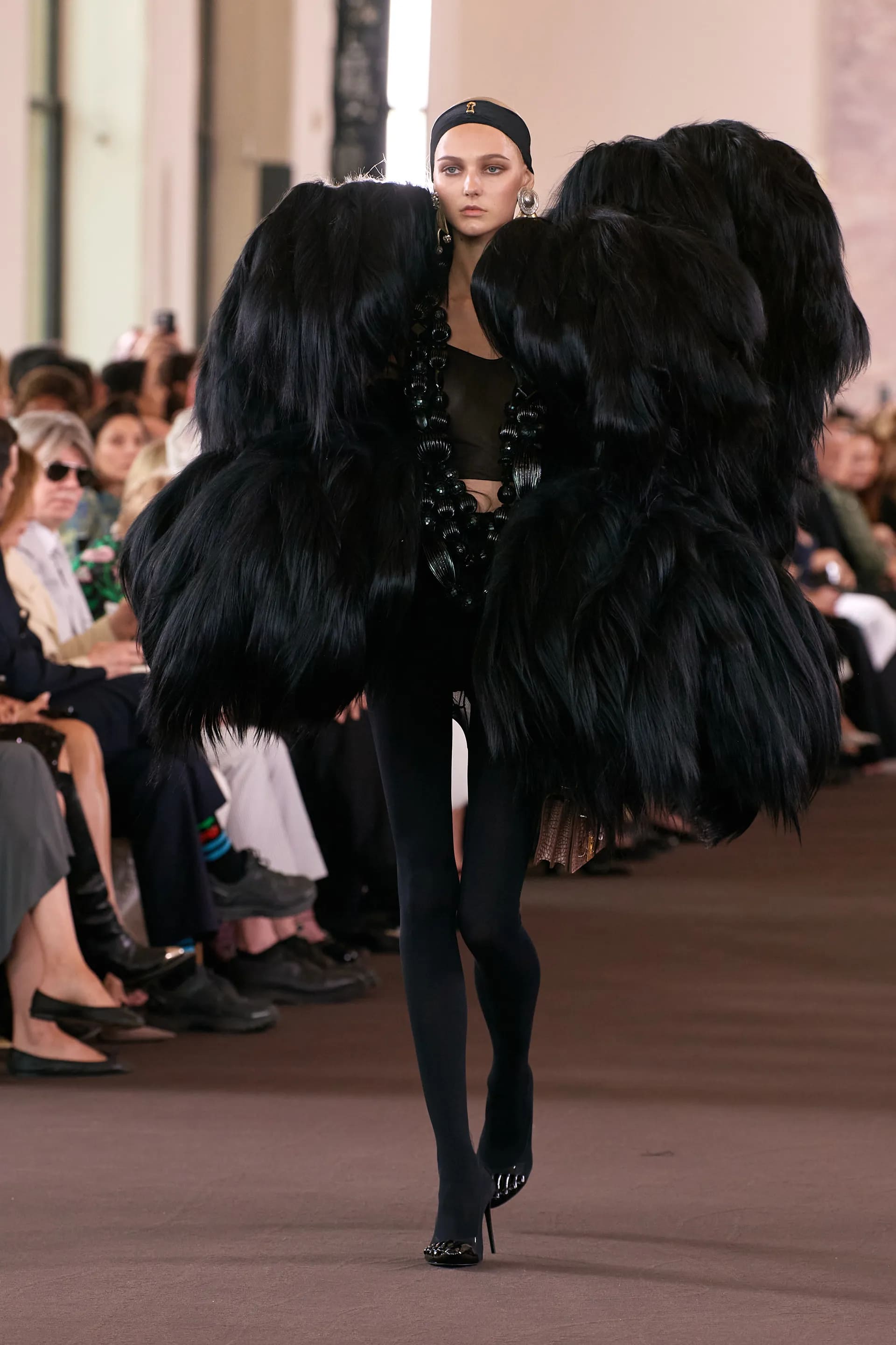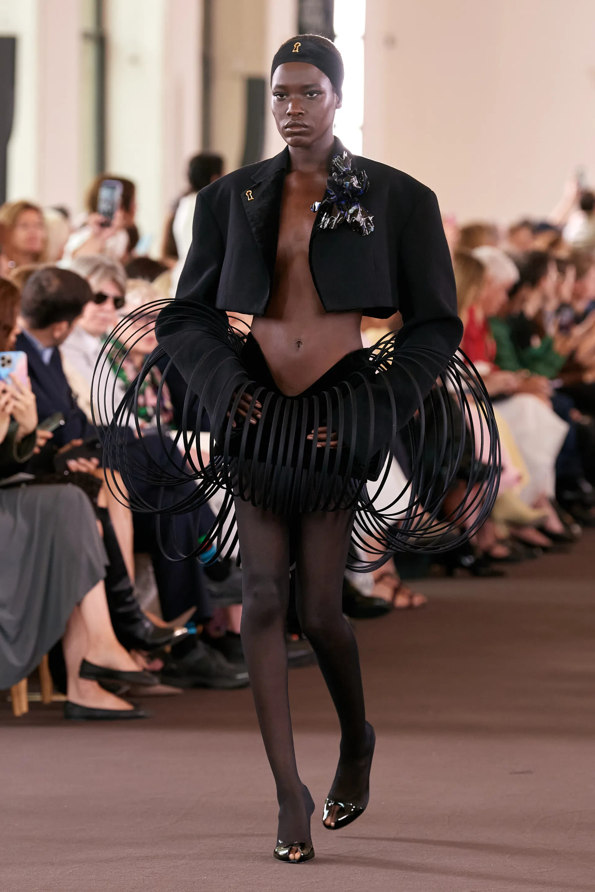 Показ відкриває тріо чорно-білих вбрань з геометричним подолом спідниці чи коміром пальта. І знову знаковий мотив, який є даниною засновниці Ельзі Скіапареллі — зображення рук.