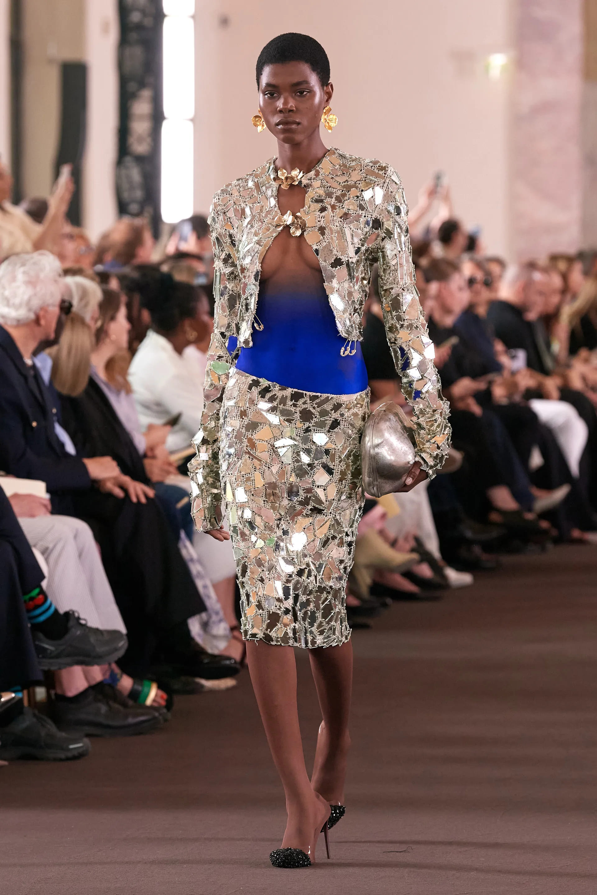 Гра сюрреалізму та артистичності продовжується з аксесуарами або декором айтемів у формі знайомих золотавих губ, вух, листви, і навіть дерев’яних лялькових рук. З кожним образом Розберрі рухається шляхом максималізму, представляючи грайливі всипані лелітками комбінації, прикрашені вибухом кольору індиго.
