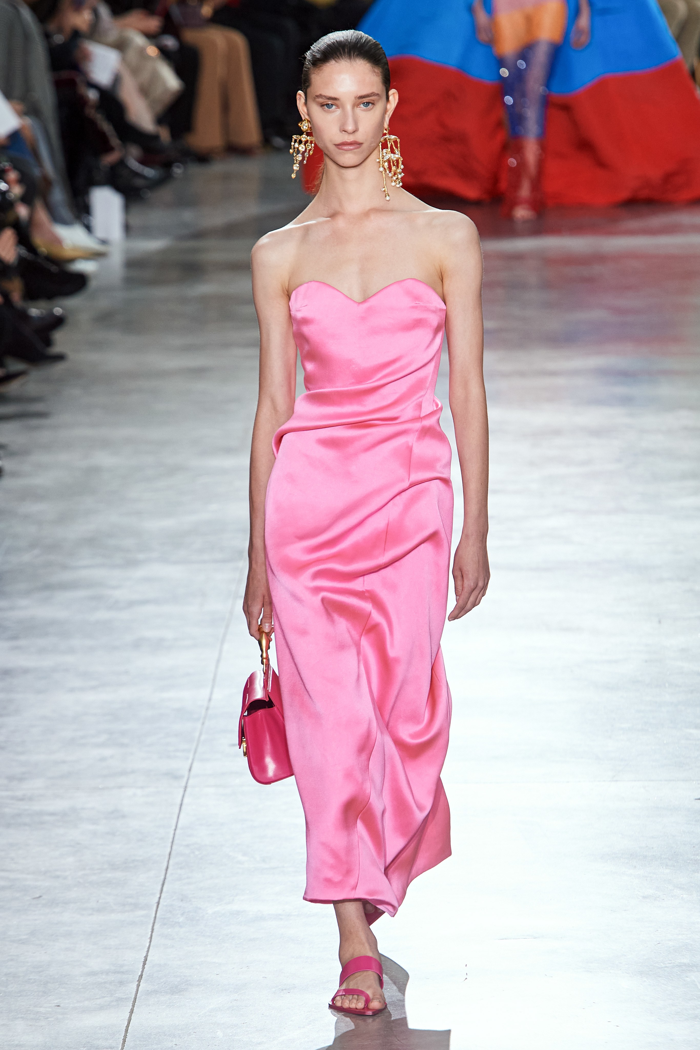 На что обратить внимание: на сочетание белого с розовым, на украшения, равномерно покрывающие платье и тело. Тонкие золотые пояса и жгуты, обвивающие талию и бёдра поверх костюмов, платьев и верхней одежды. Простая обувь в пользу роскошного декора.
