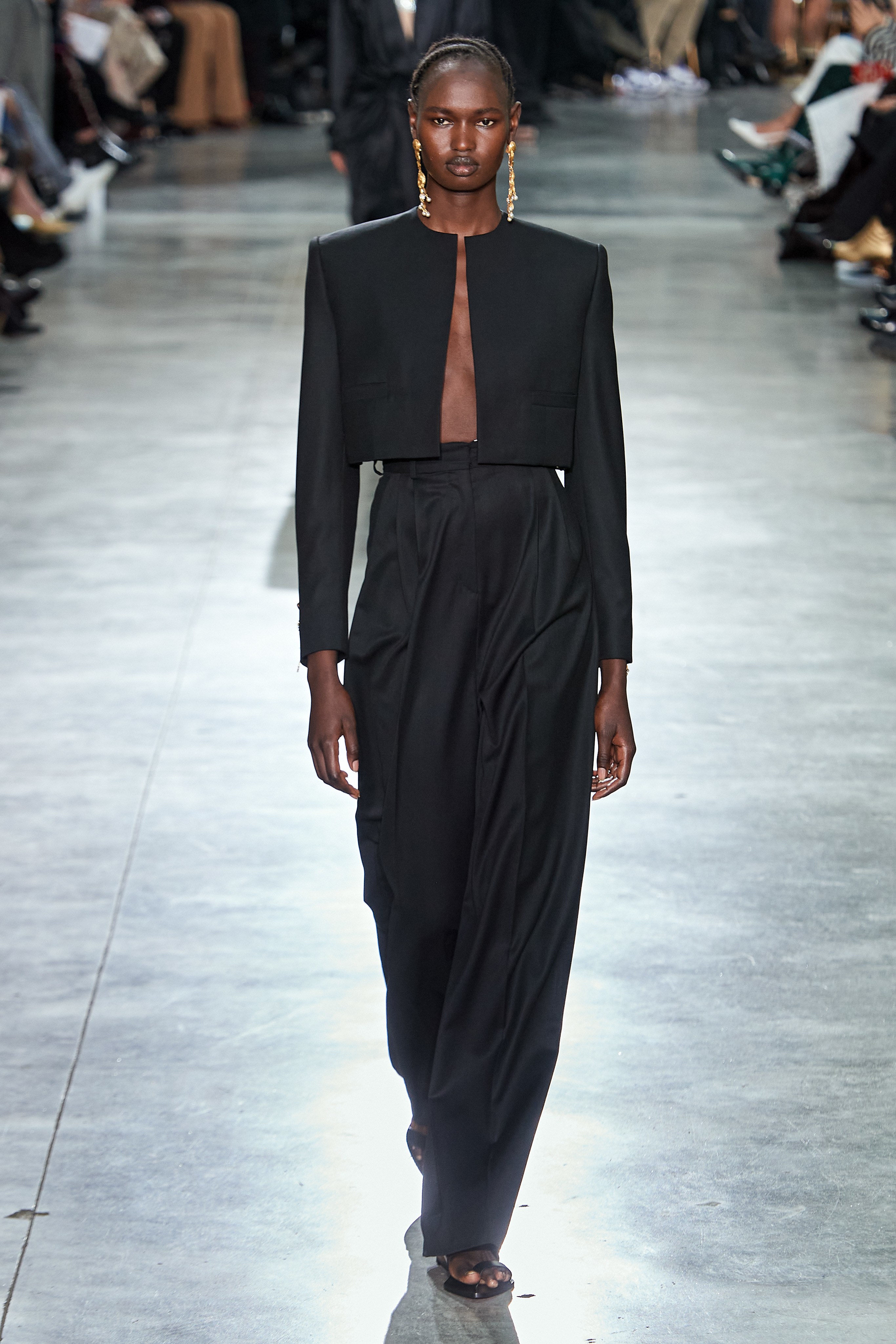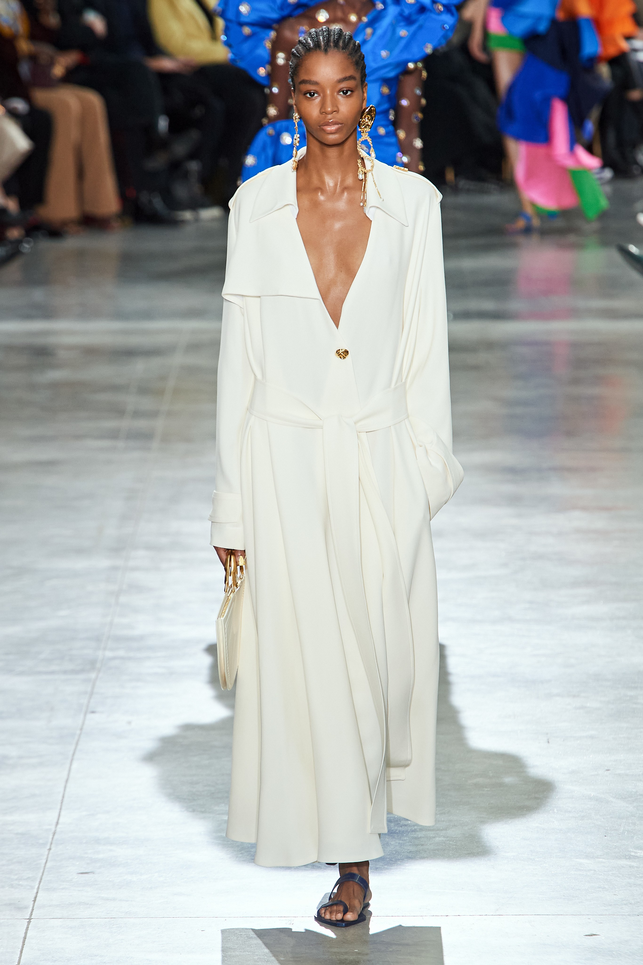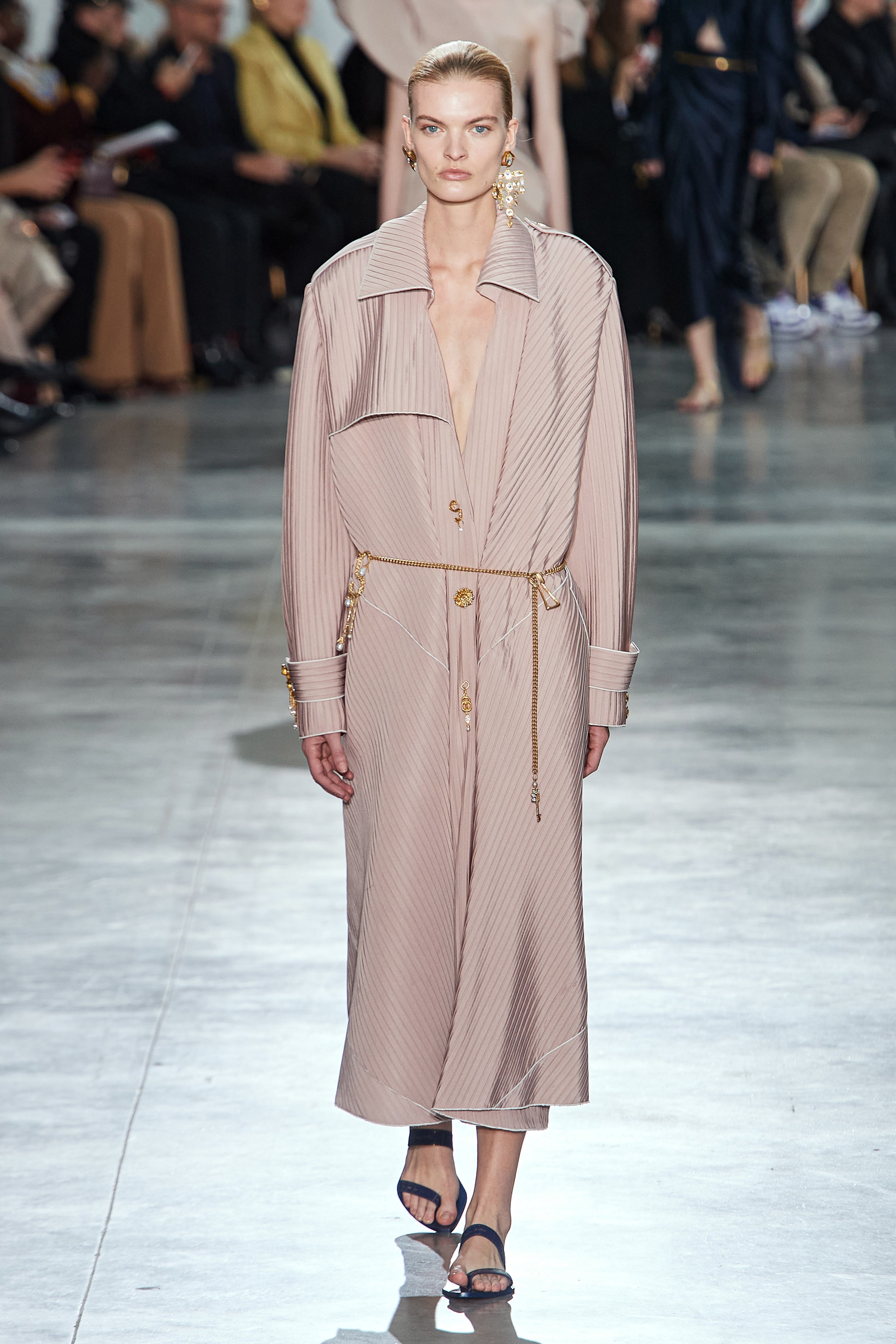 Актуальные тренды: свободно ниспадающие тренчи, голые платья, укороченные жакеты и свободные брюки, элегантность 40-х, массивные золотые украшения, простая обувь.
