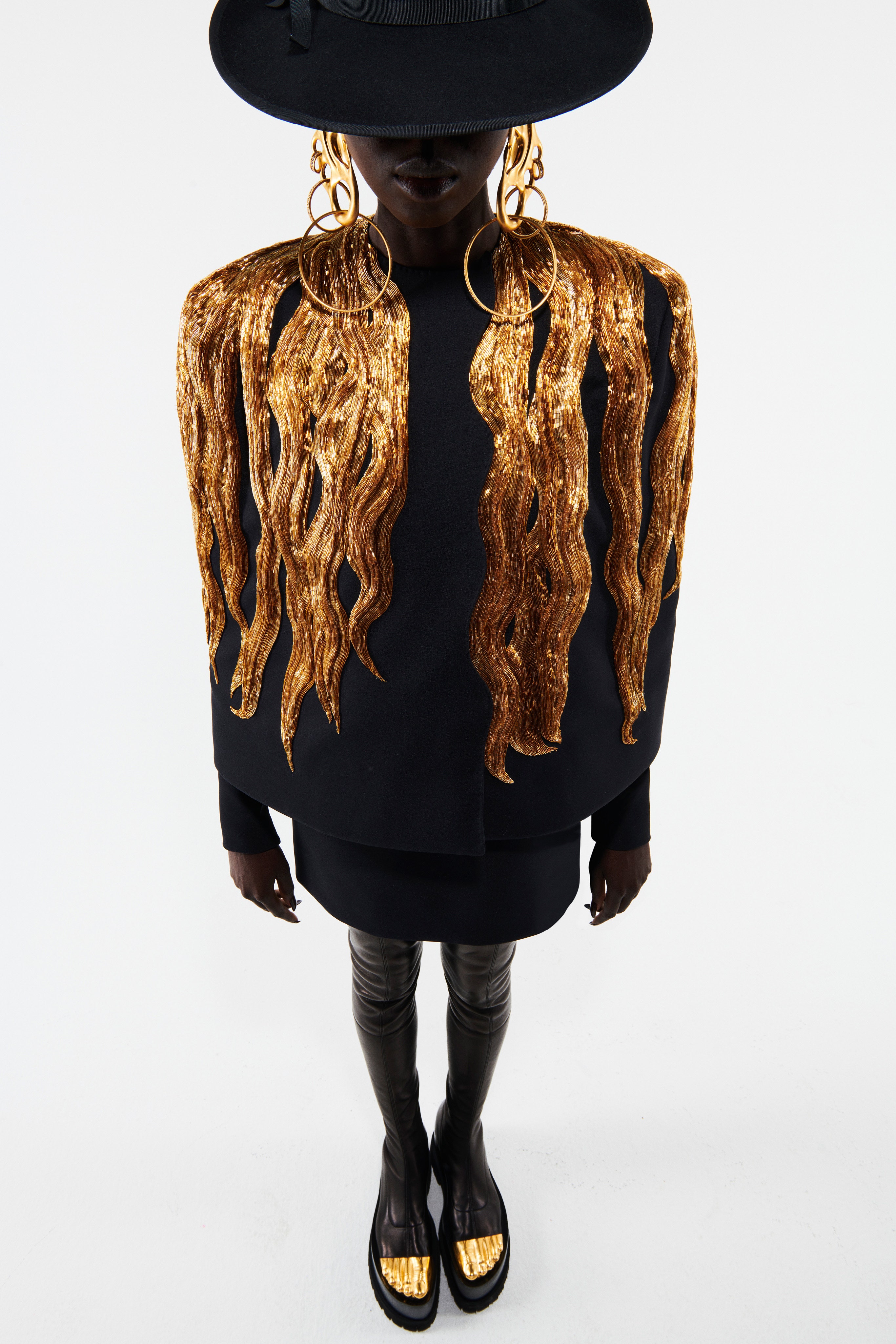 Креативный директор легендарного бренда также намекает на традиционно роскошные силуэты и цвета, вроде блузы или пышной вечерней накидки с гипертрофированными тяжелыми рукавами. Линию затейливых аксессуаров пополнили кольца-накладки с длинными золотыми ногтями, сумочки в виде замков и украшения в виде золотых зубов.