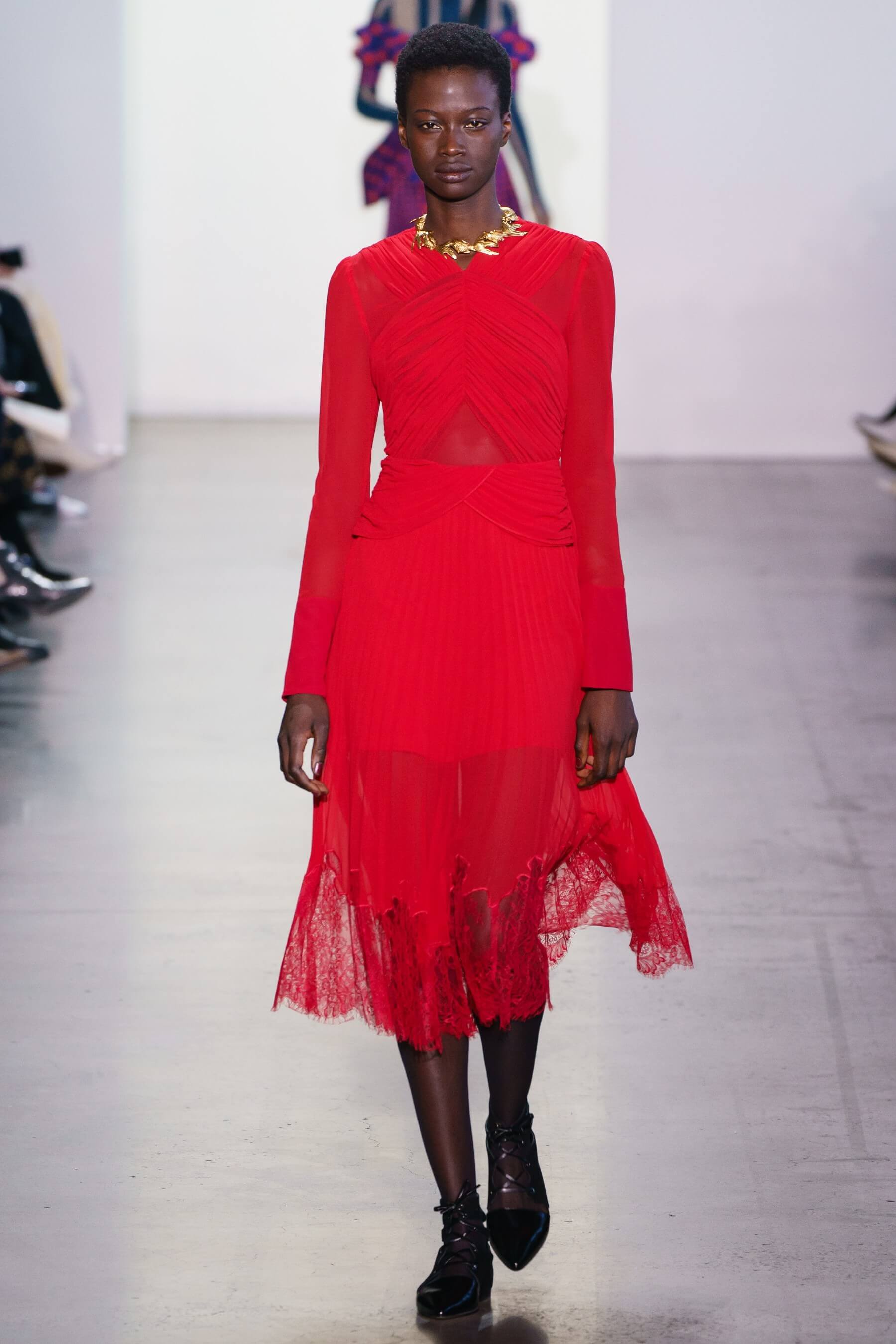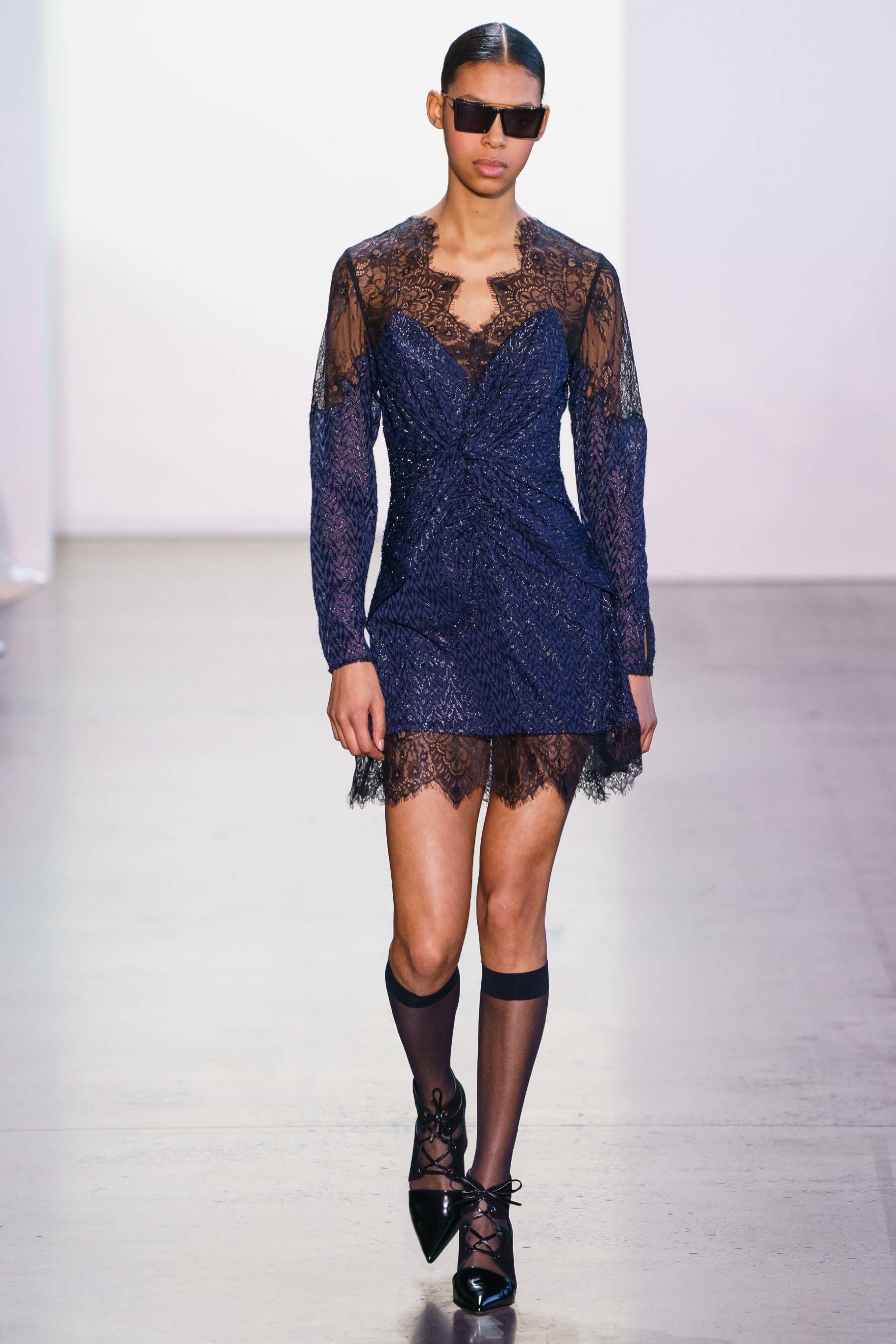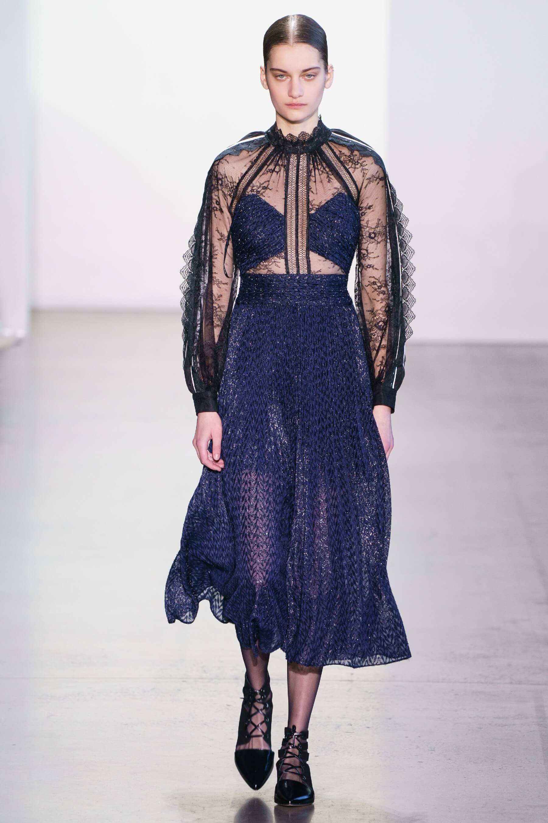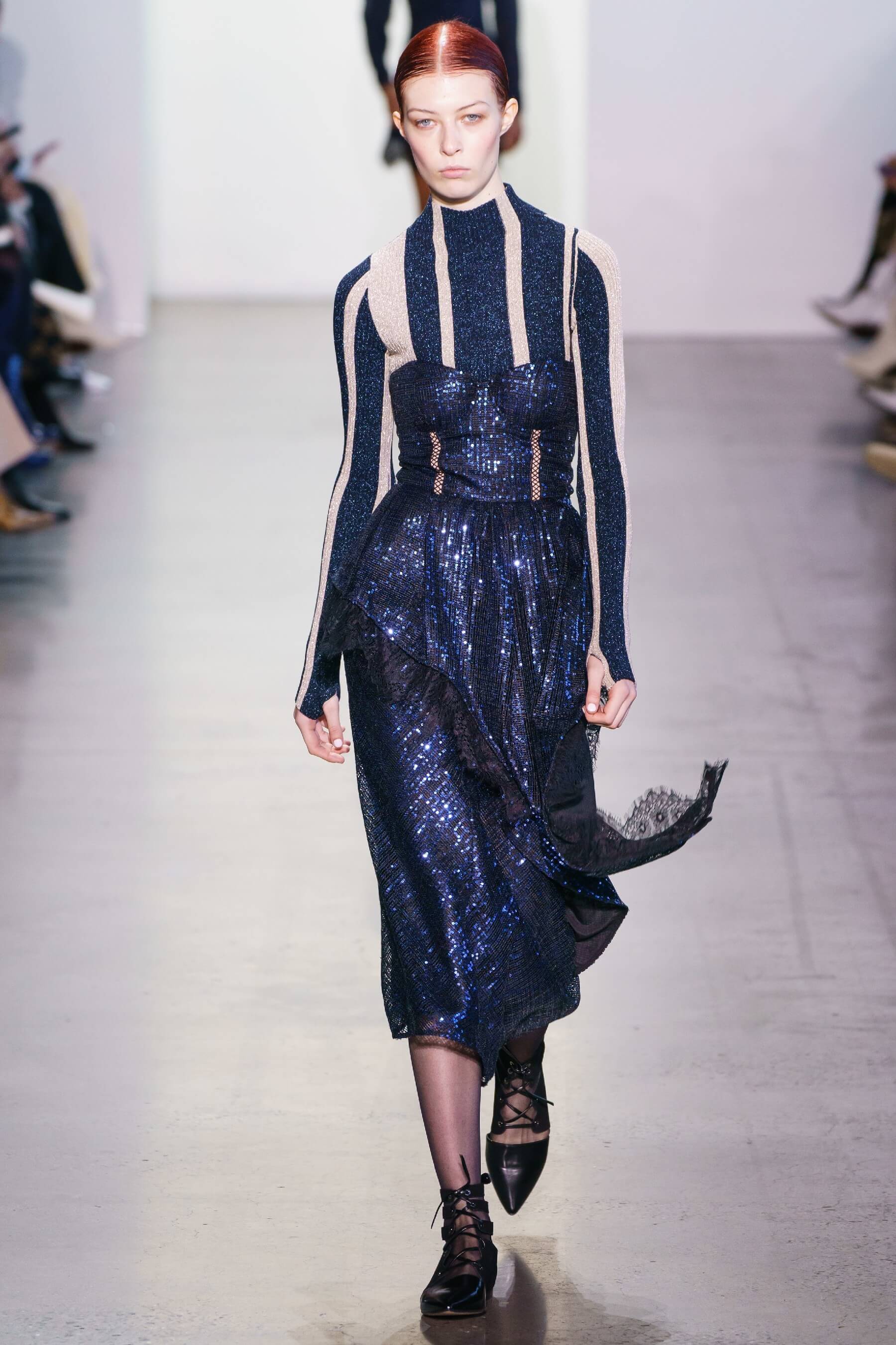 Сам дизайнер выразил свои чувства: ему хотелось сделать типичный образ девушки Self-Portrait более изысканным и ретроспективным, придав лоска с помощью фактур и силуэтов. На моделях были вязаные гольфы из люрекса с эффектом второй кожи, поверх которых идеально скроенные, были надеты ставшие привычными для Чонга романтичные платья. Любовь дизайнера к коллажу привела к синтезу эстетики прошлых колелкций и нового виденья.