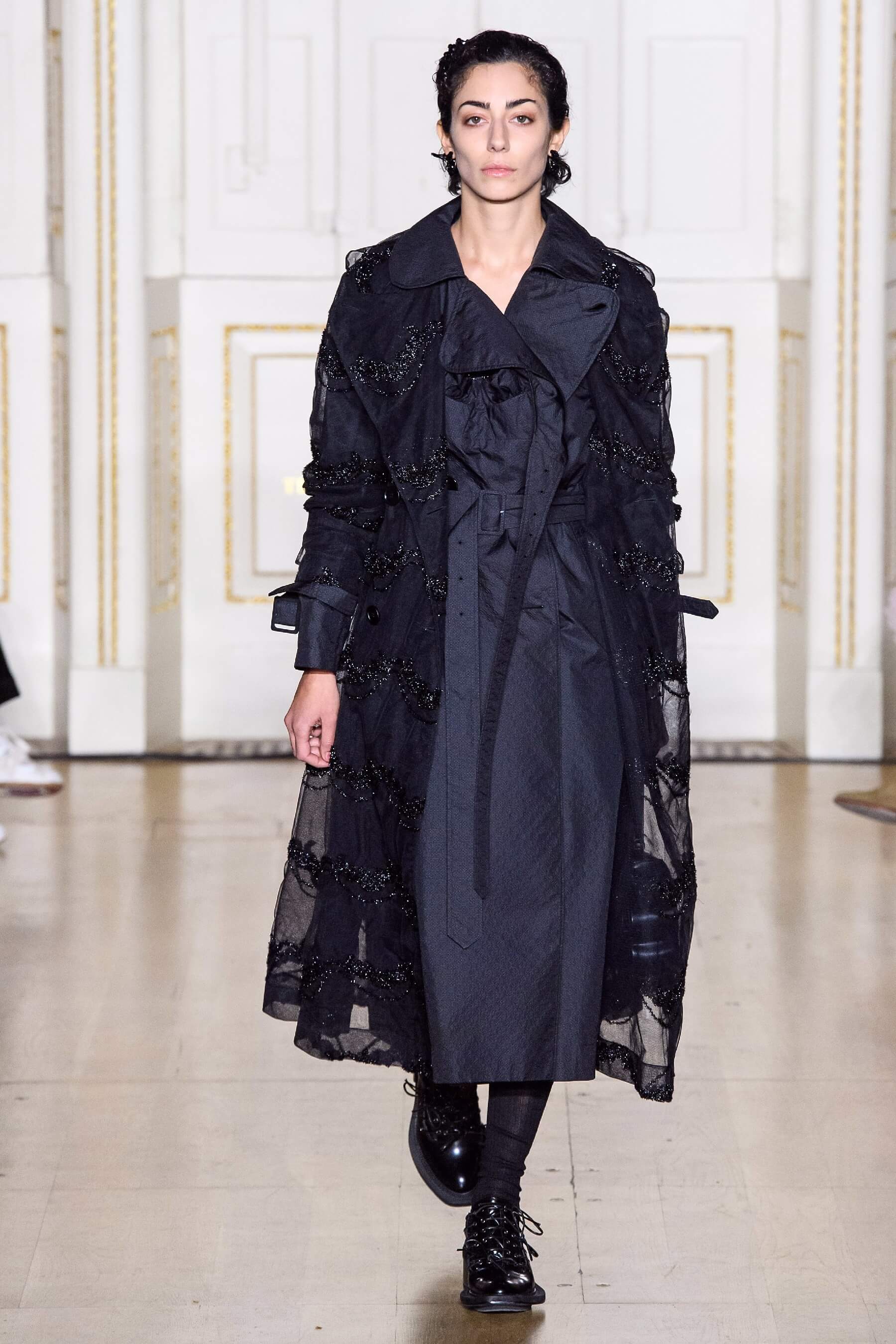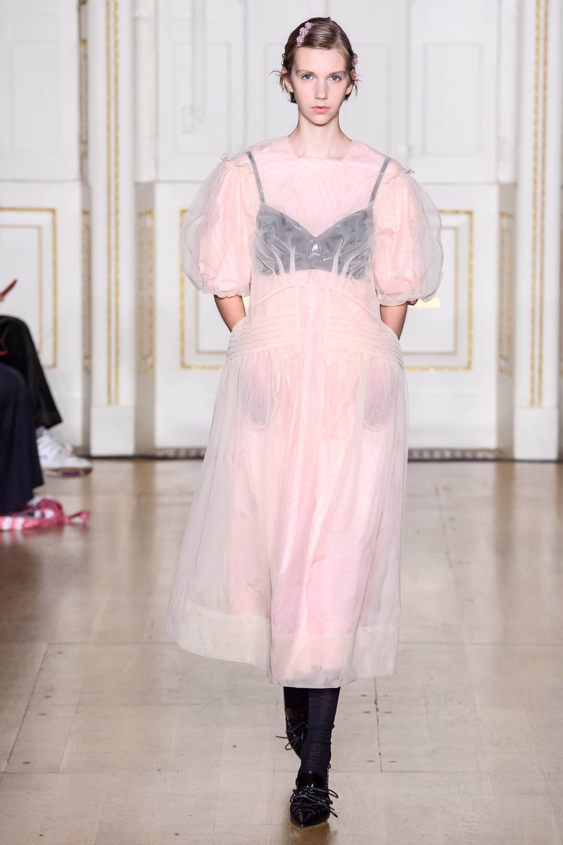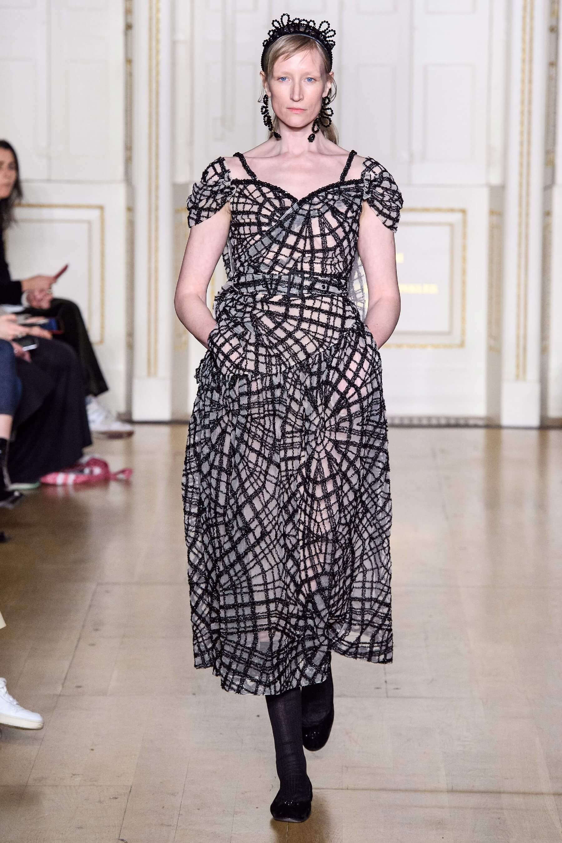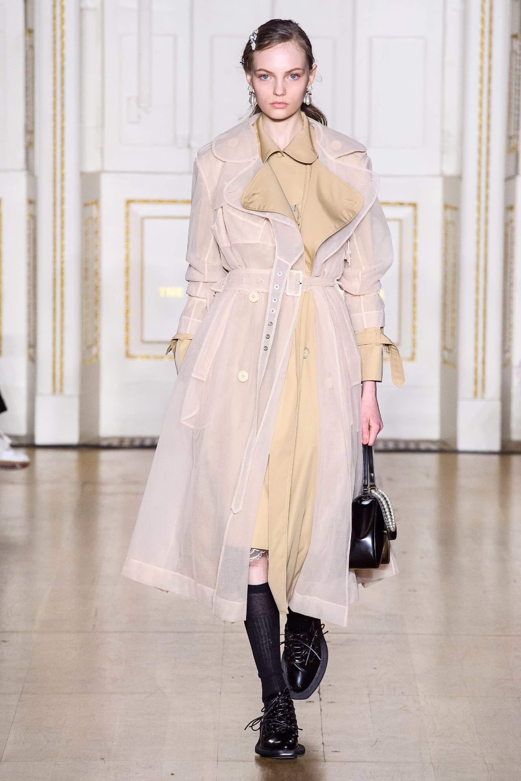 Из органзы полностью или частично выполнены тренчи, бра и платья-дезабилье, а также широкие устойчивые брюки-блумеры, немного инфантильно выглядывающие из-под подолов. Принты на платьях и пальто — оммаж культовому скульптору Луизе Буржуа и её самому известному творению — "паучихе Маман" в Лондоне.