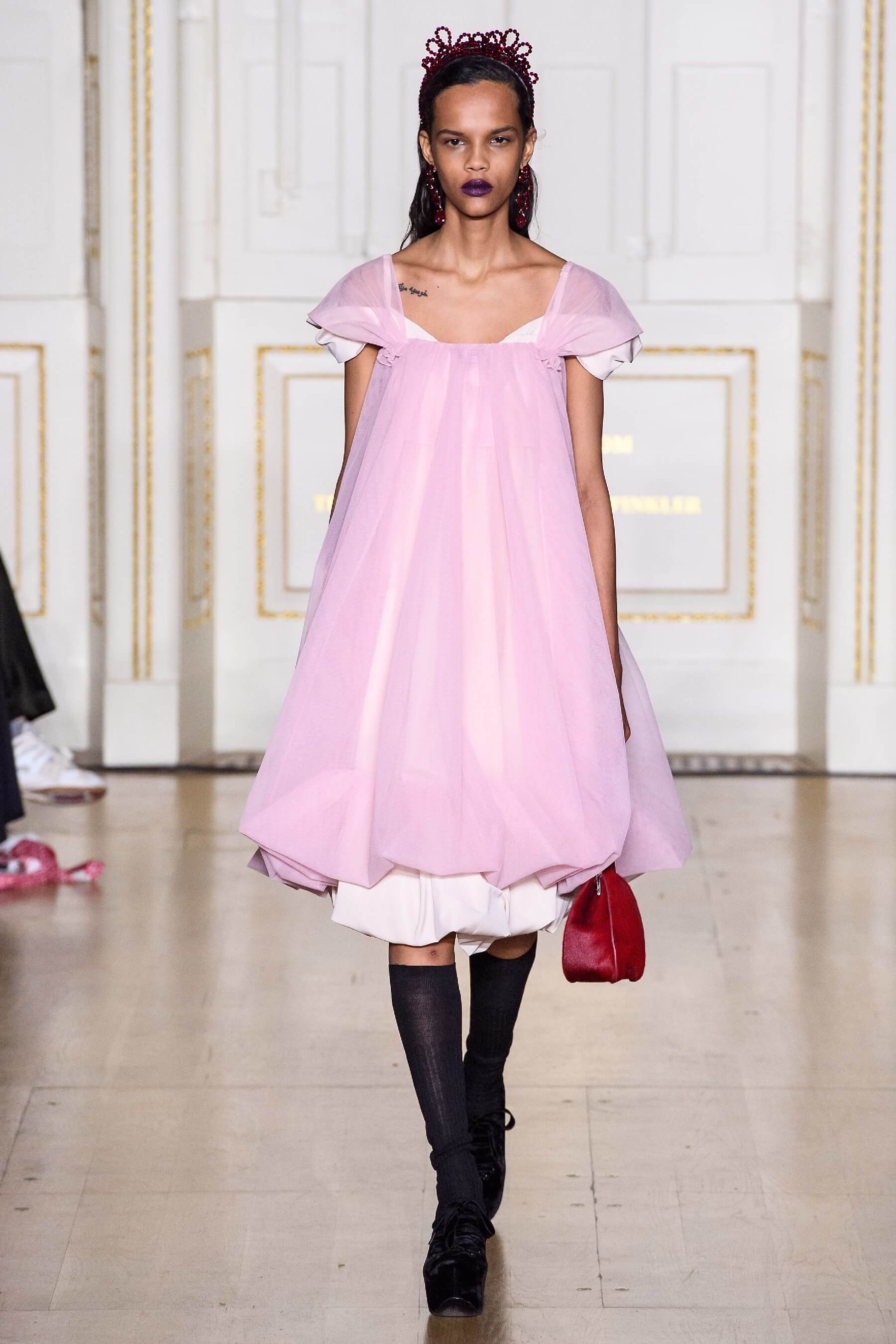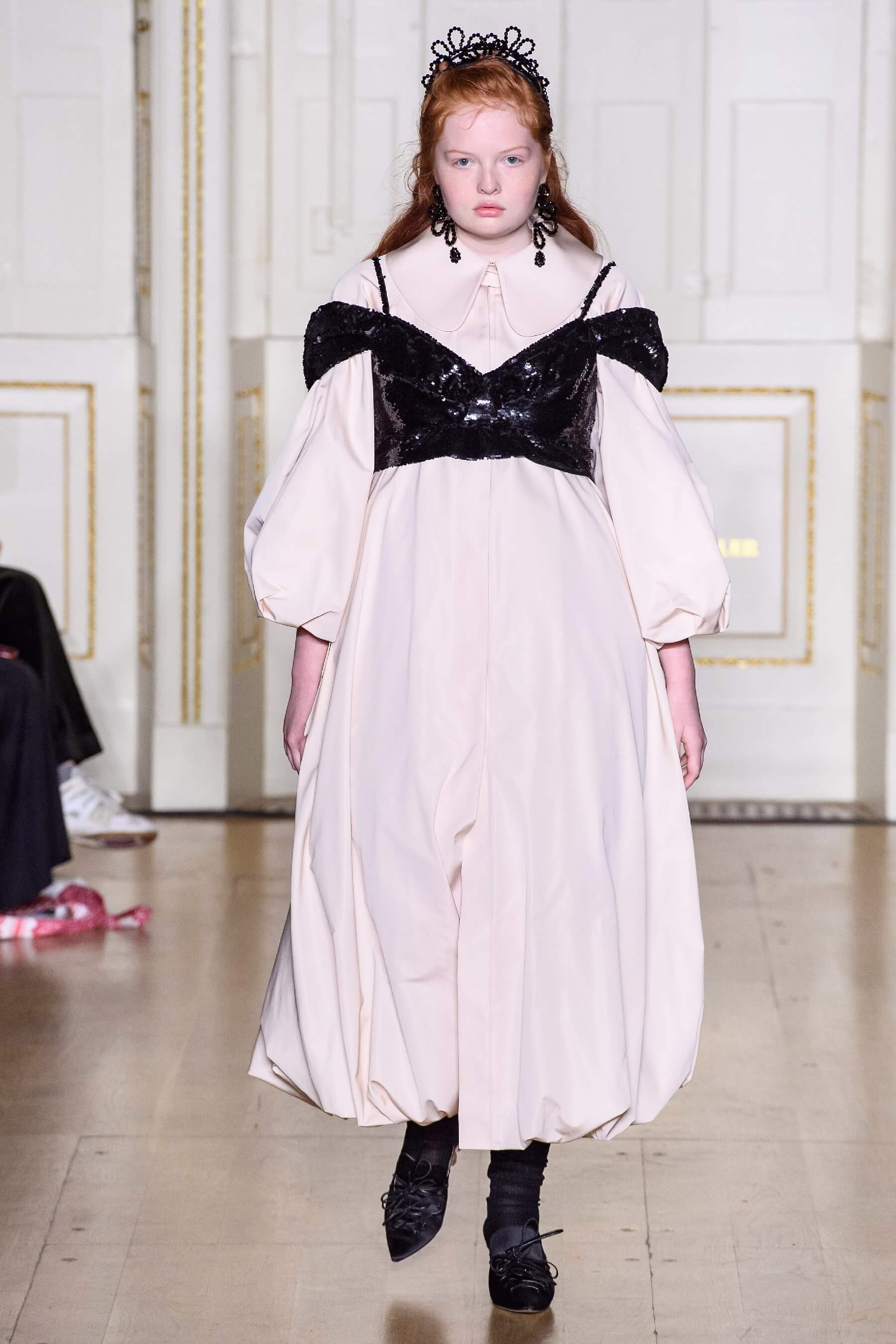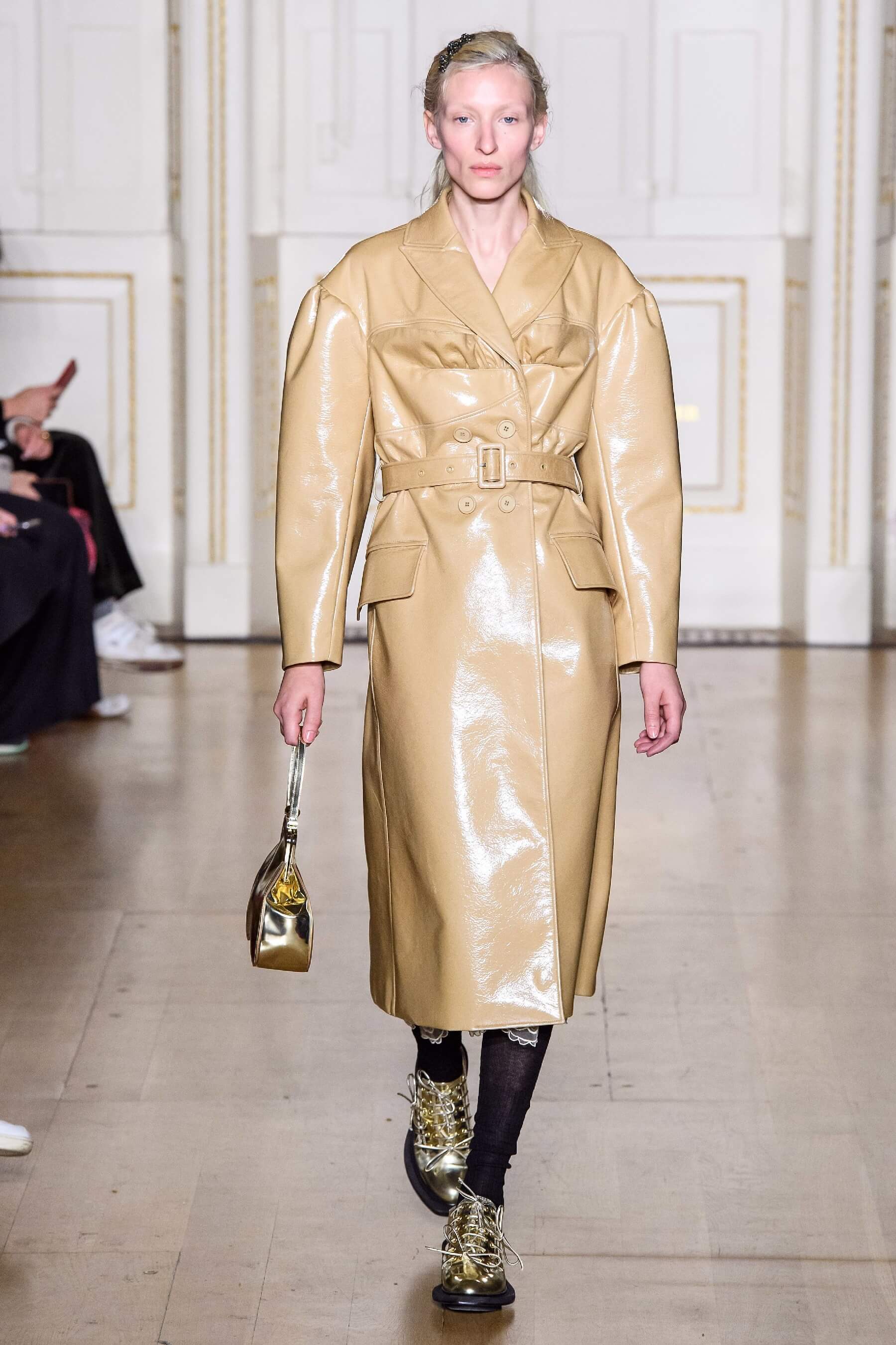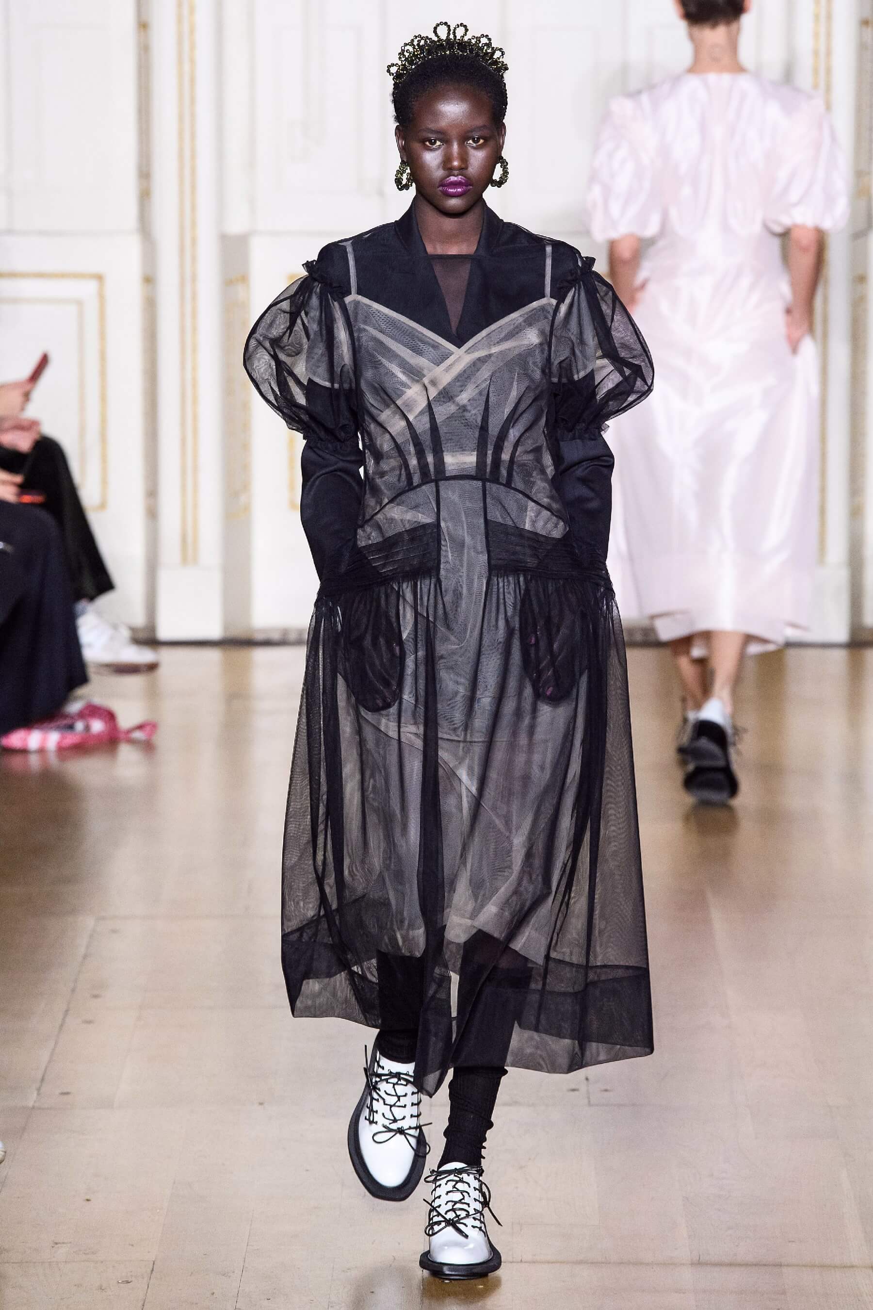 Из органзы полностью или частично выполнены тренчи, бра и платья-дезабилье, а также широкие устойчивые брюки-блумеры, немного инфантильно выглядывающие из-под подолов. Принты на платьях и пальто — оммаж культовому скульптору Луизе Буржуа и её самому известному творению — "паучихе Маман" в Лондоне.