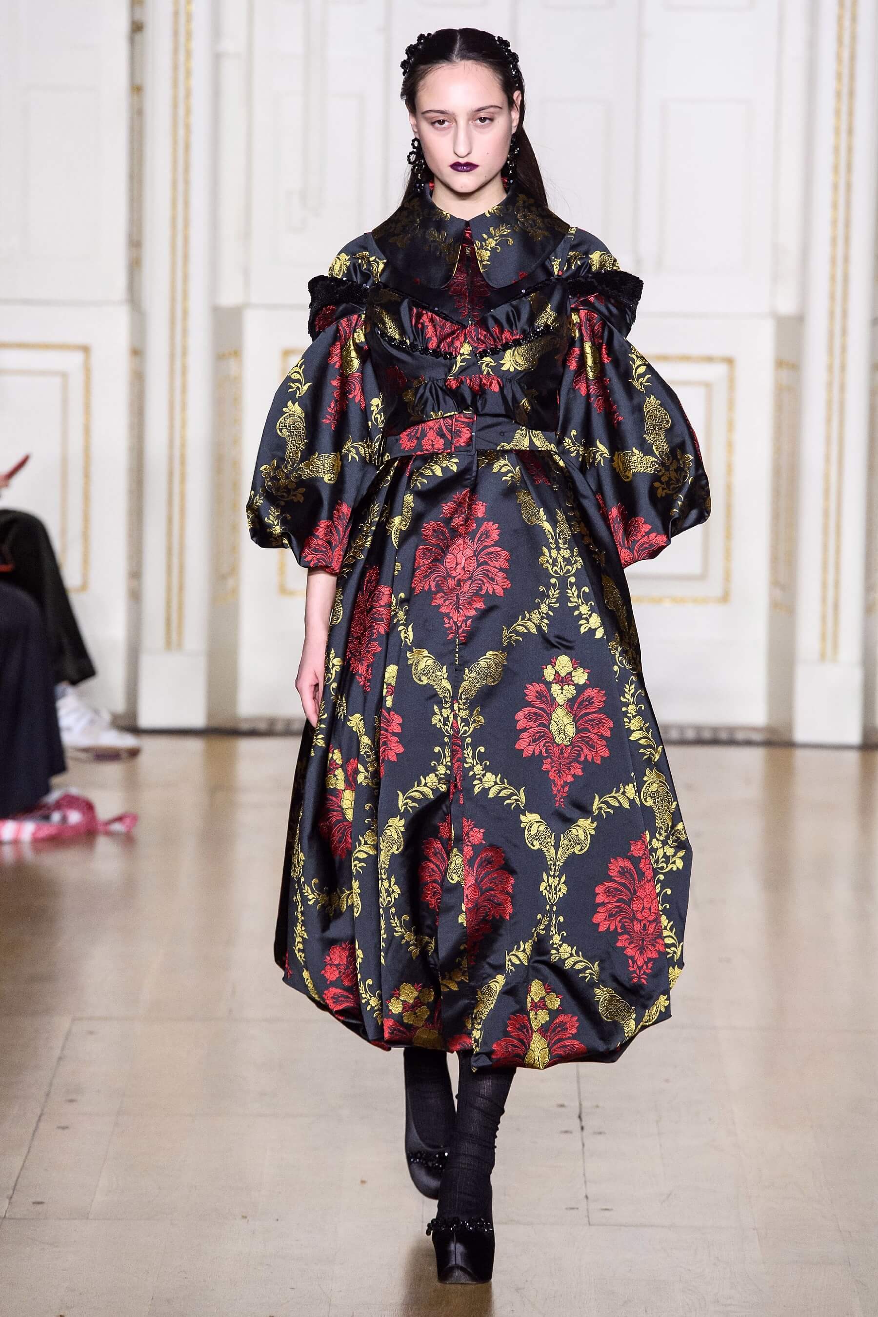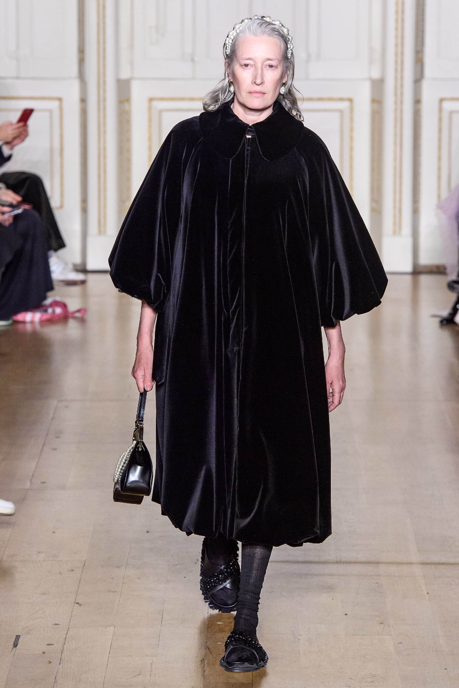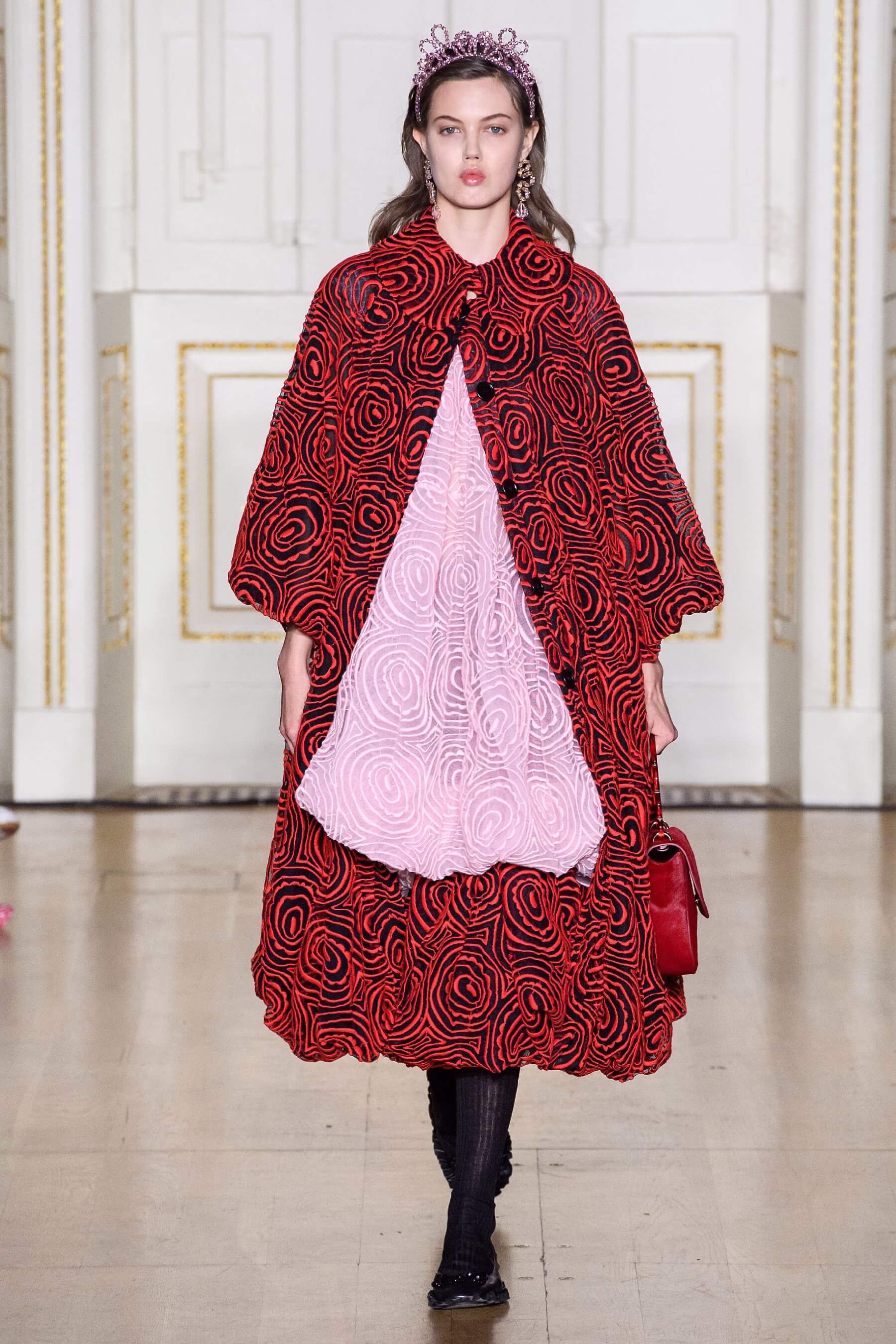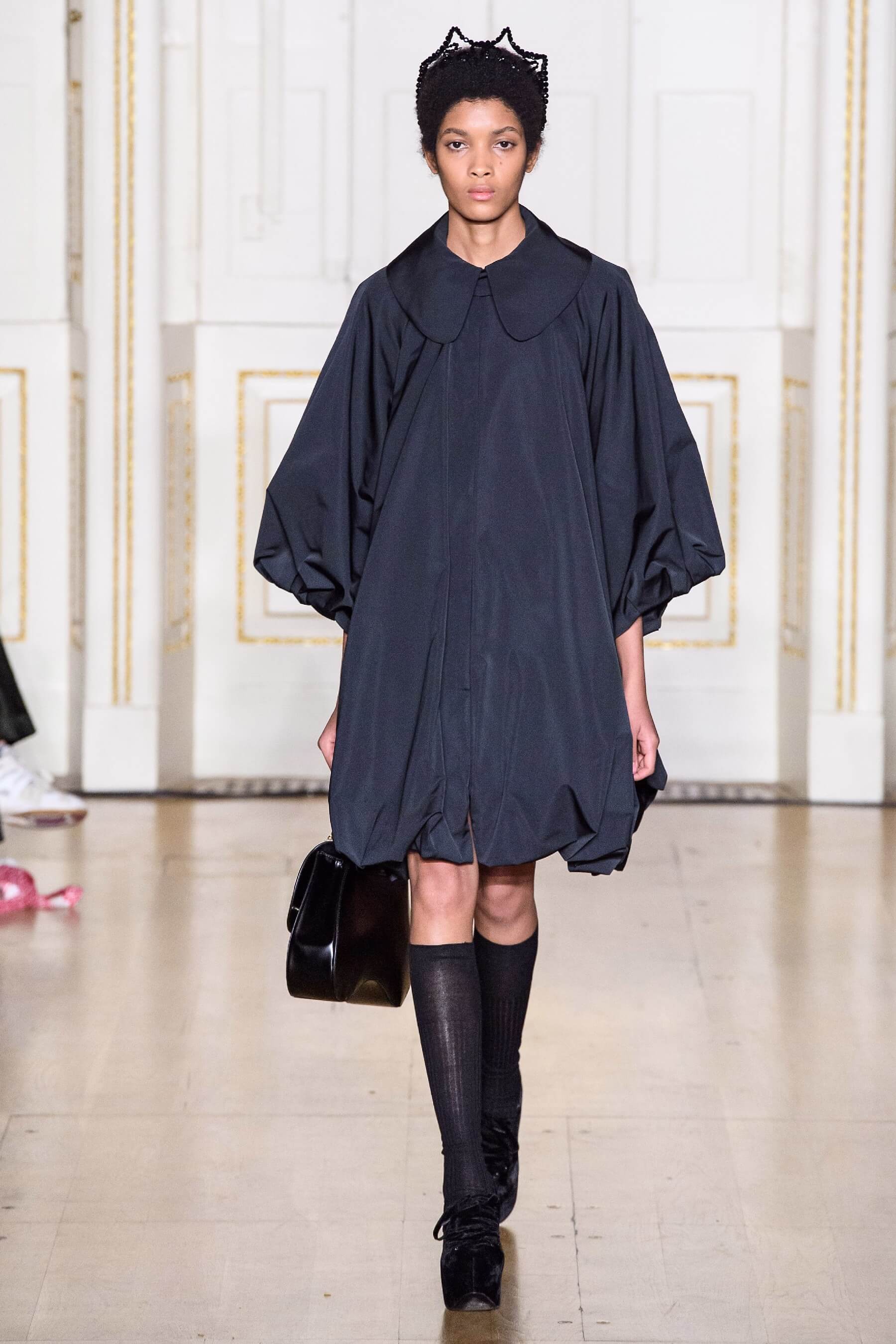 Покатые линии плеча объёмных пальто и присобранные рукава-фонарики на готических платьях из черного шелка не оставляют шанса отыскать в коллекции хотя бы долю игры в маскулинность. А вот источники вдохновения дизайнера имеют жутковатую историю: это фильм-экранизация сказки Андерсена "Красные башмачки" режиссёра Майкла Пауэлла и его же хоррор "Подглядывающий" (1960).