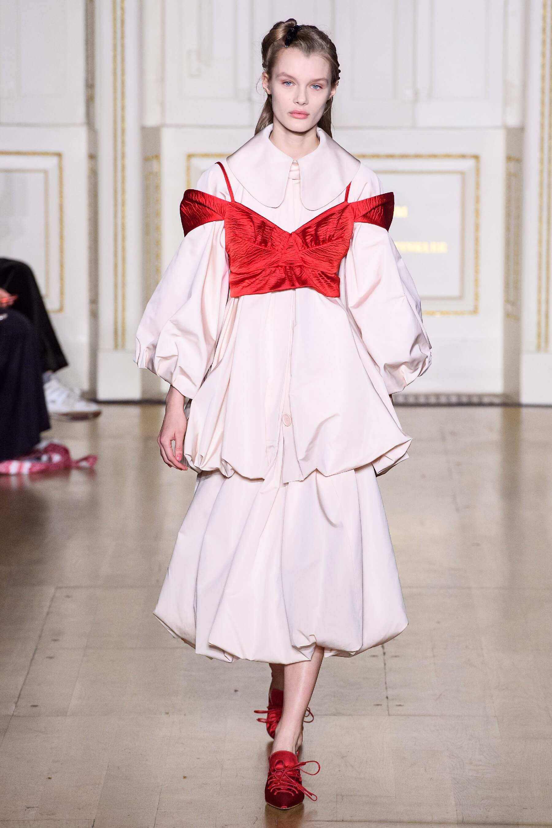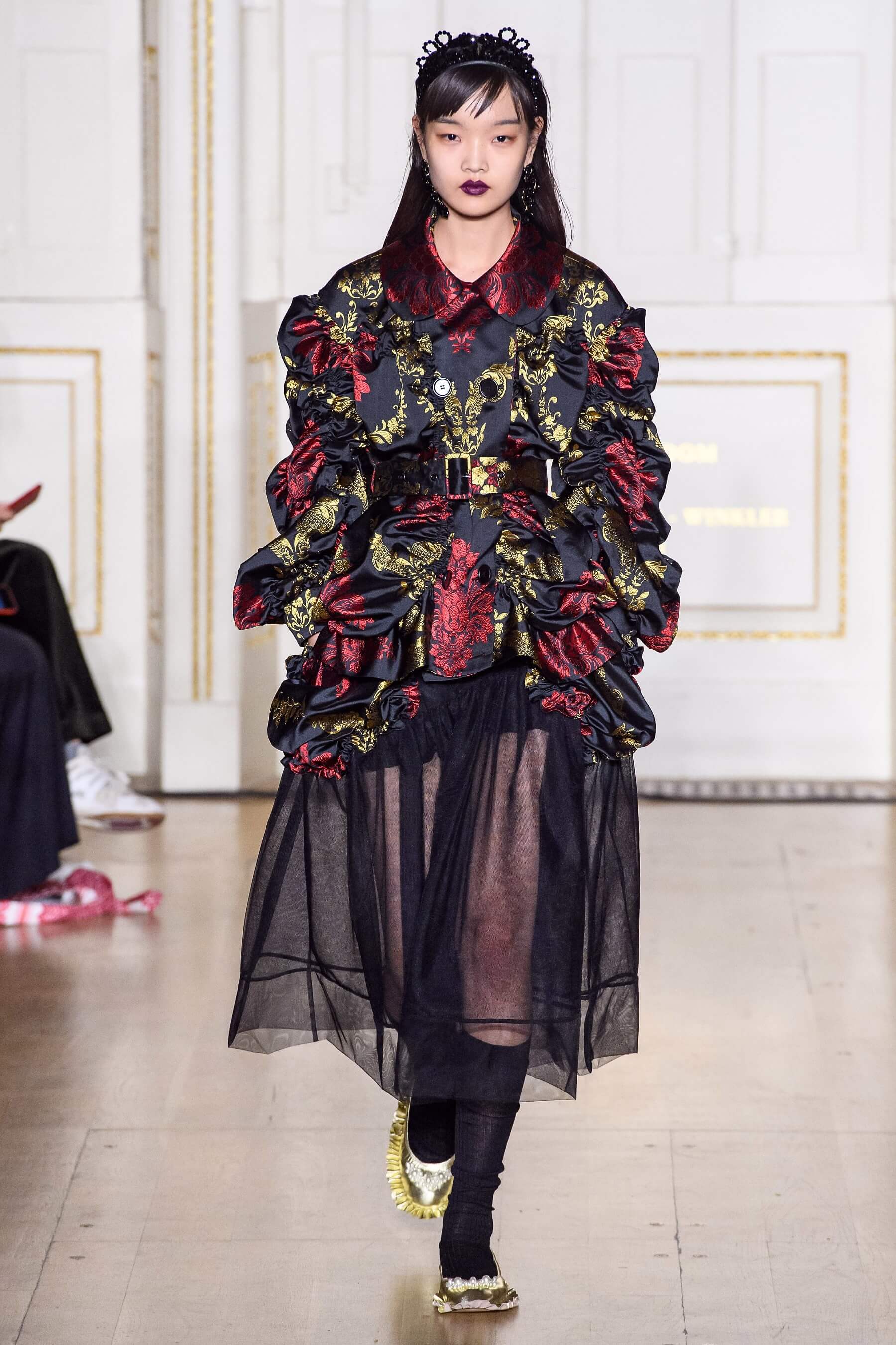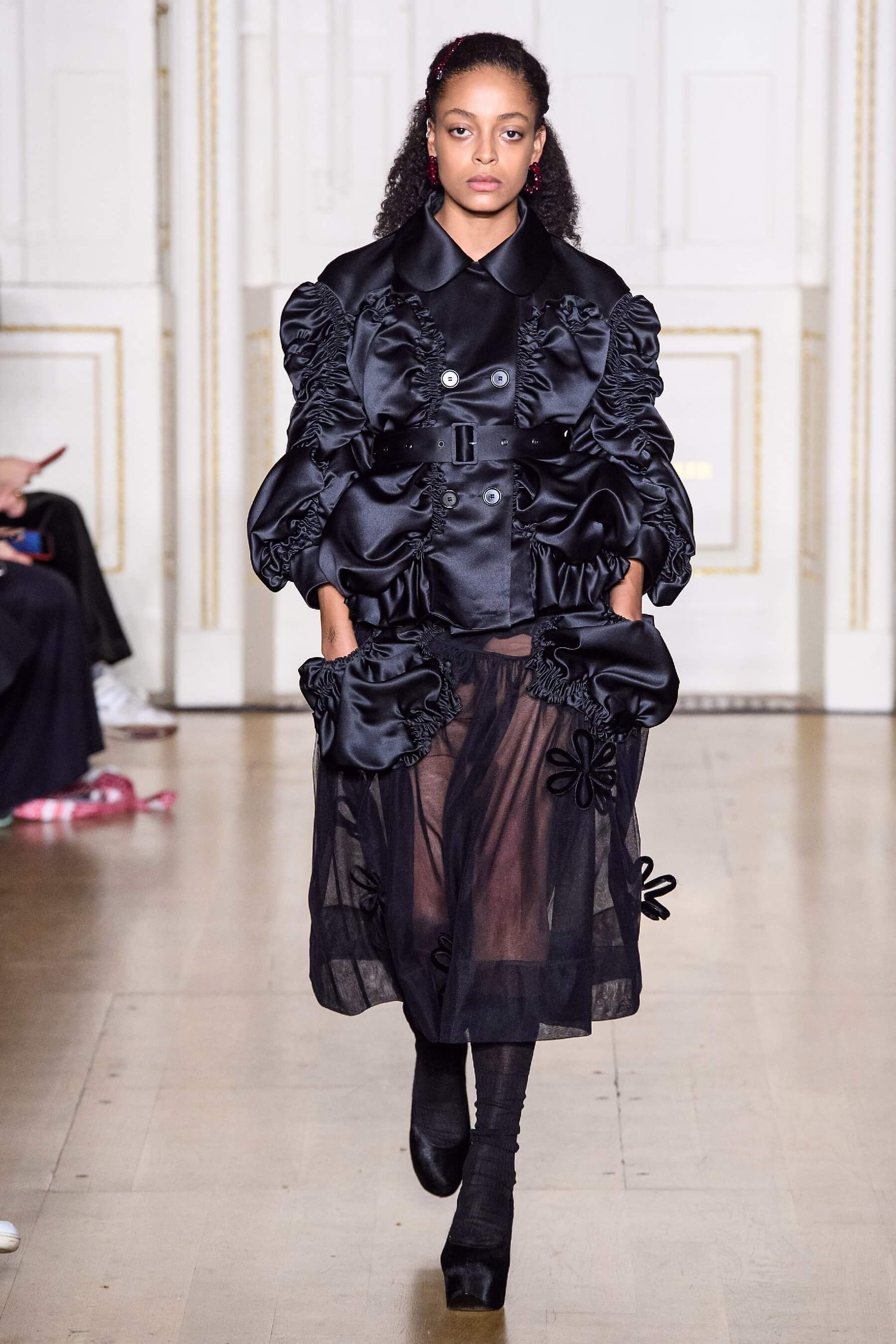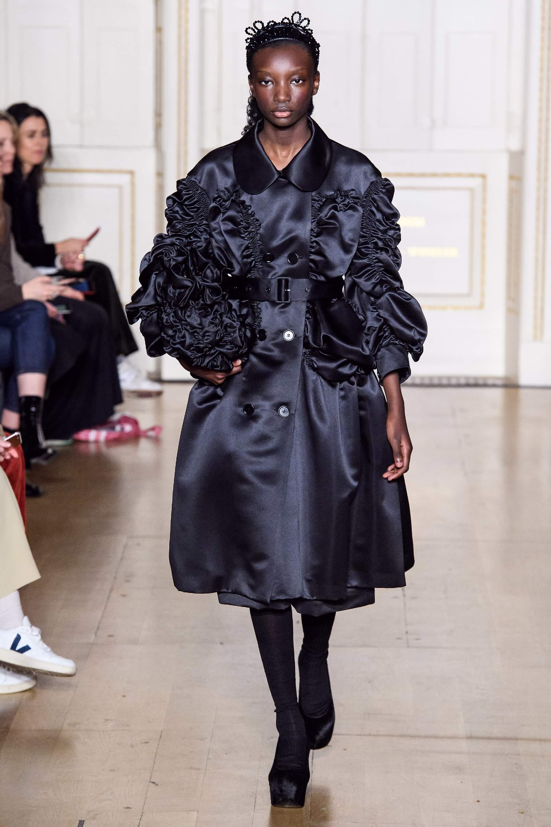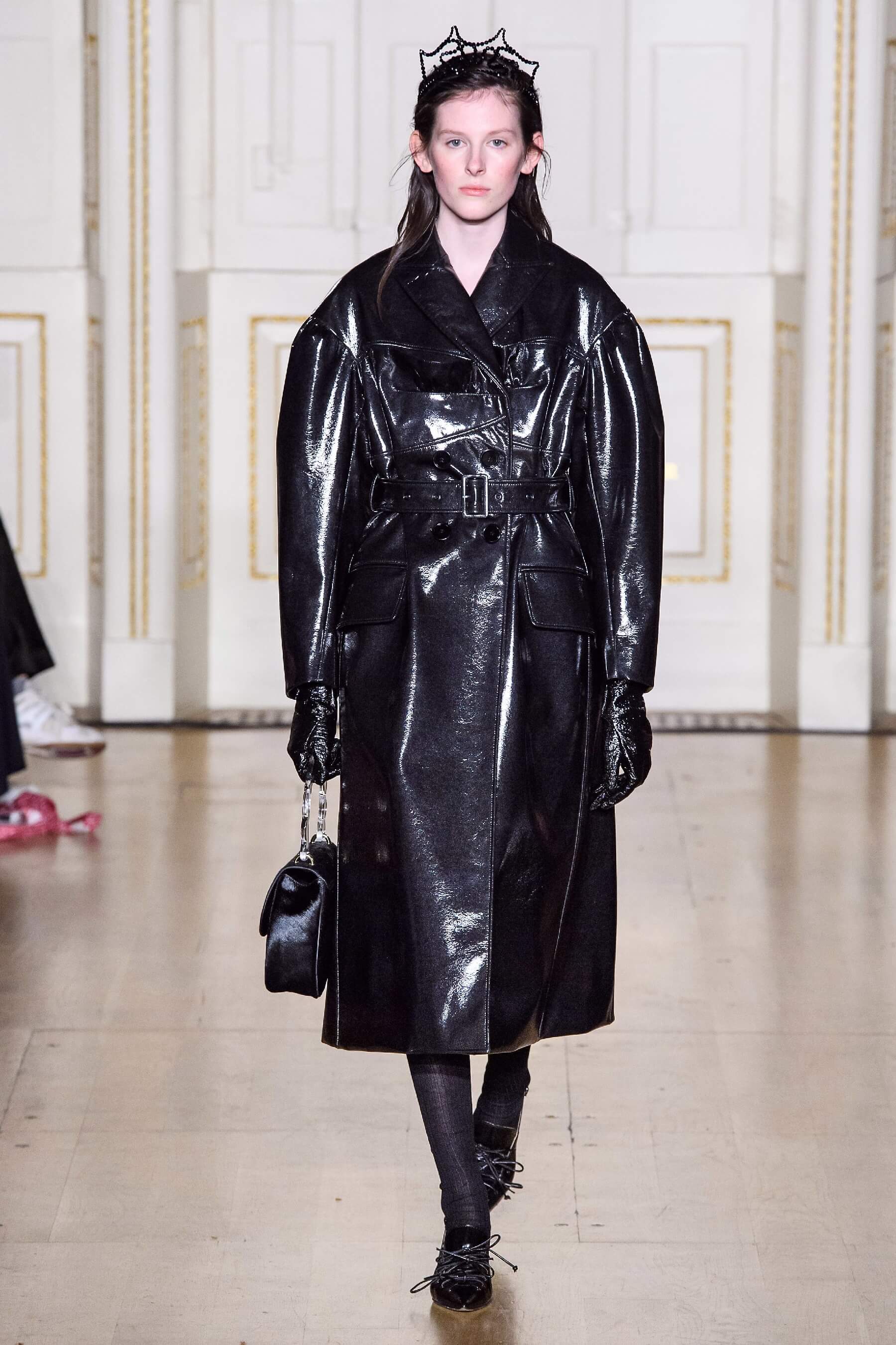 Покатые линии плеча объёмных пальто и присобранные рукава-фонарики на готических платьях из черного шелка не оставляют шанса отыскать в коллекции хотя бы долю игры в маскулинность. А вот источники вдохновения дизайнера имеют жутковатую историю: это фильм-экранизация сказки Андерсена "Красные башмачки" режиссёра Майкла Пауэлла и его же хоррор "Подглядывающий" (1960).