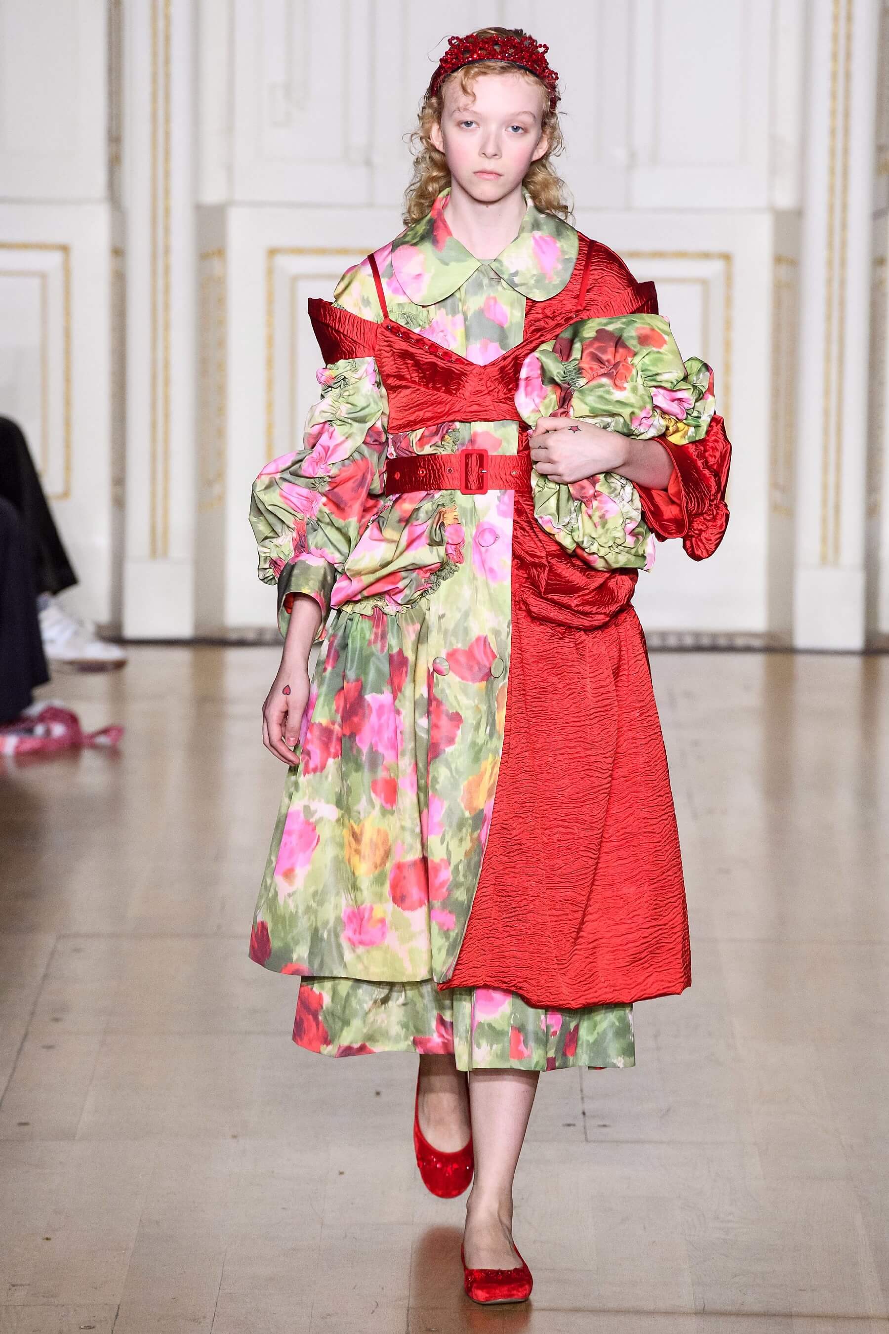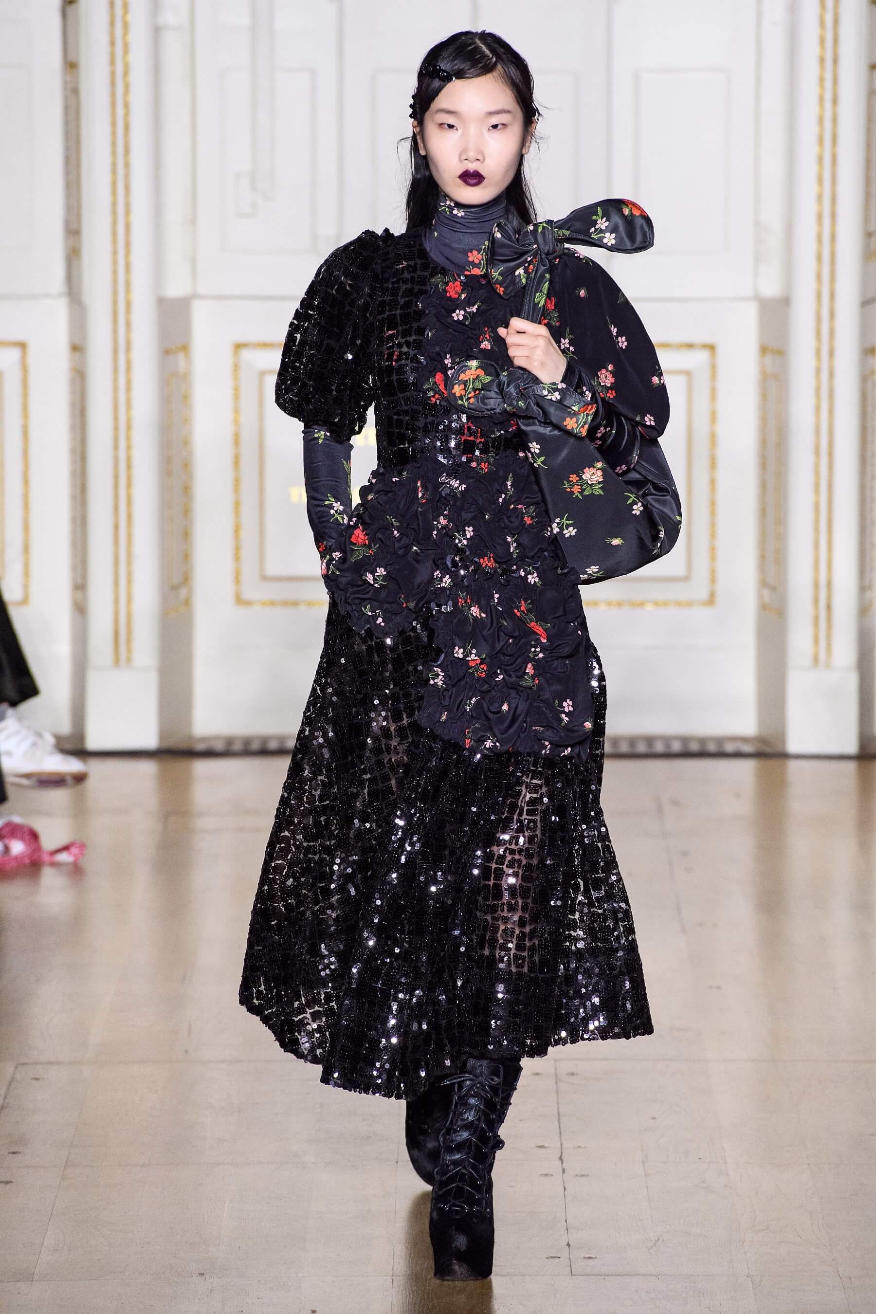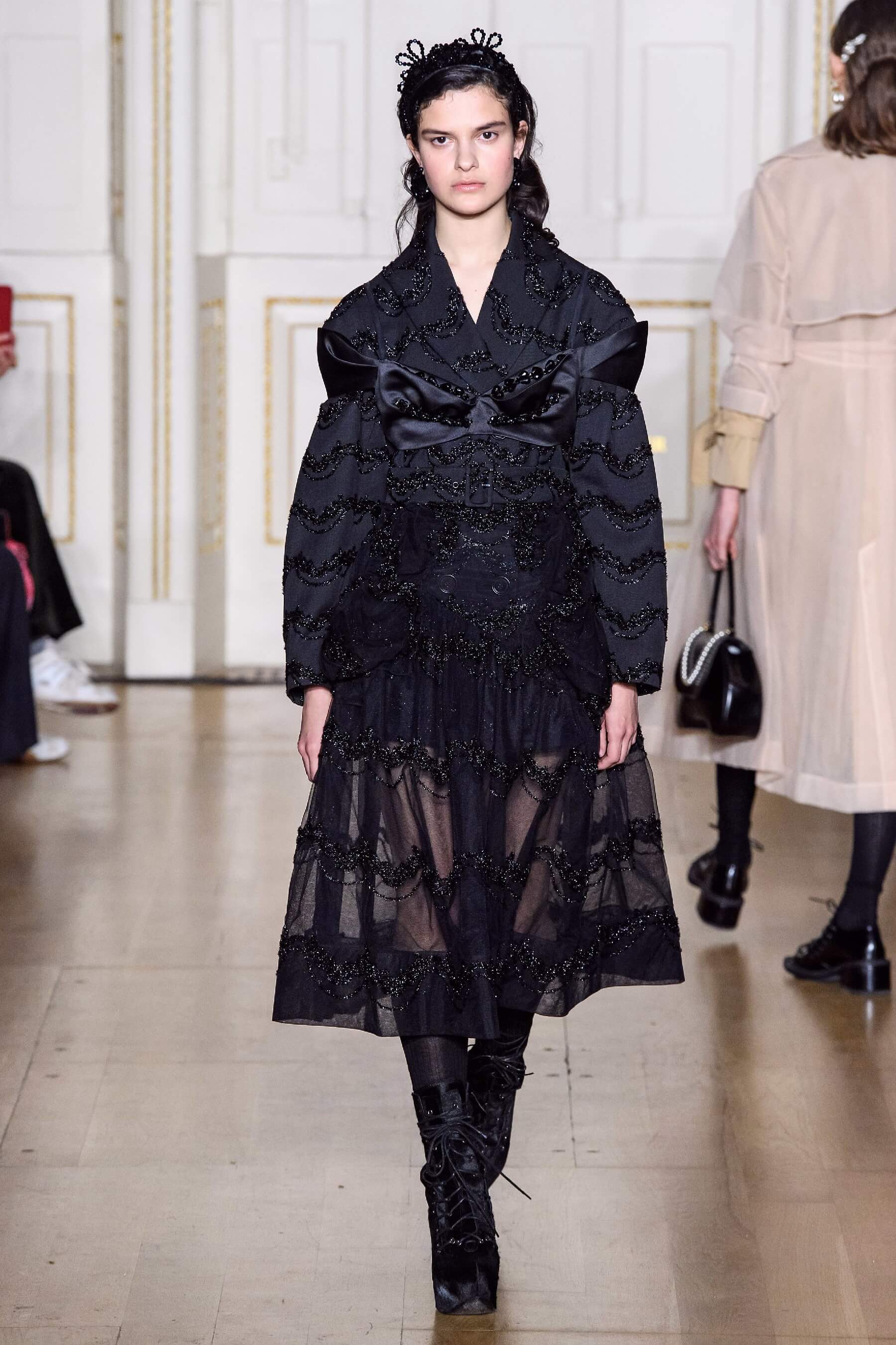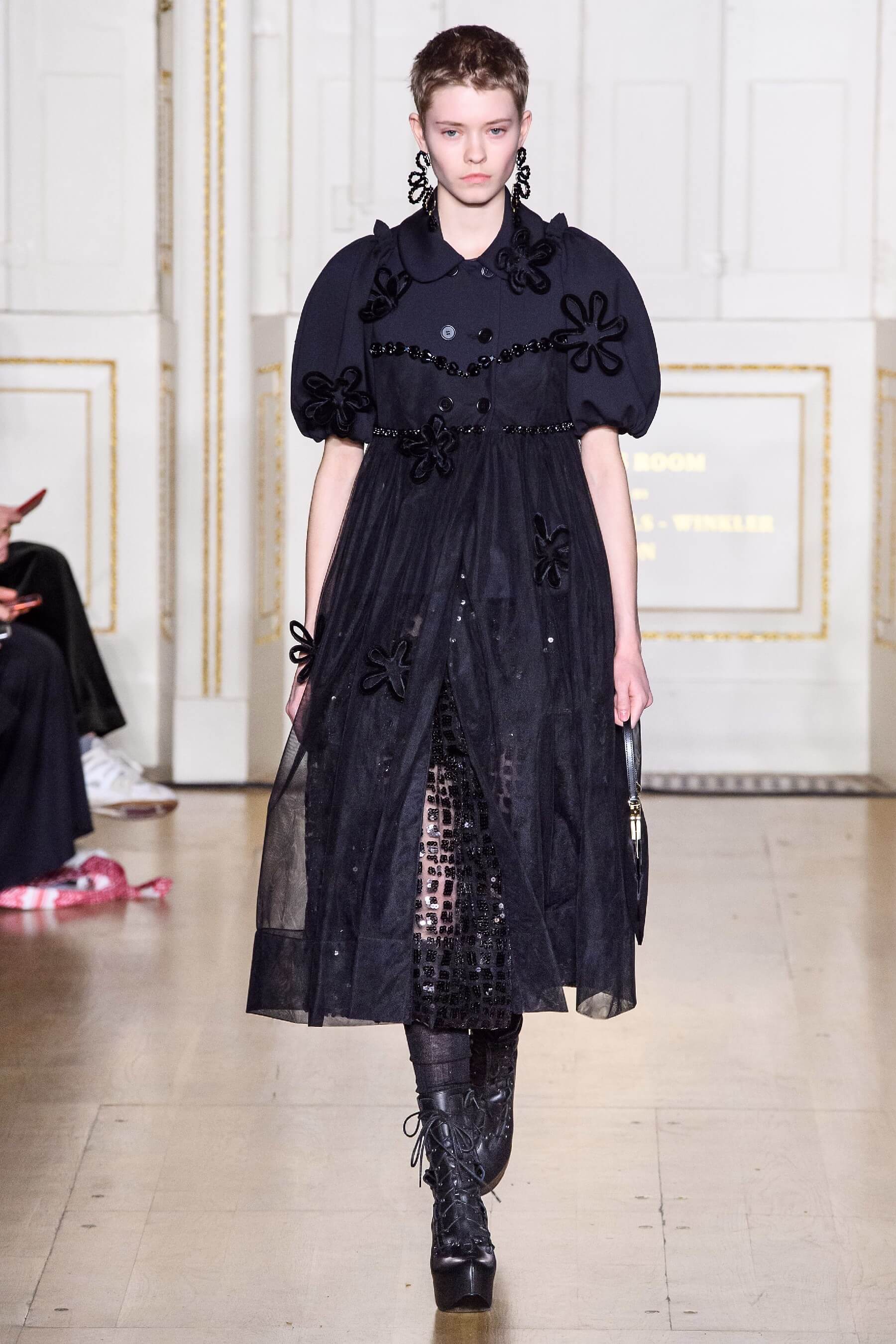 Покатые линии плеча объёмных пальто и присобранные рукава-фонарики на готических платьях из черного шелка не оставляют шанса отыскать в коллекции хотя бы долю игры в маскулинность. А вот источники вдохновения дизайнера имеют жутковатую историю: это фильм-экранизация сказки Андерсена "Красные башмачки" режиссёра Майкла Пауэлла и его же хоррор "Подглядывающий" (1960).
