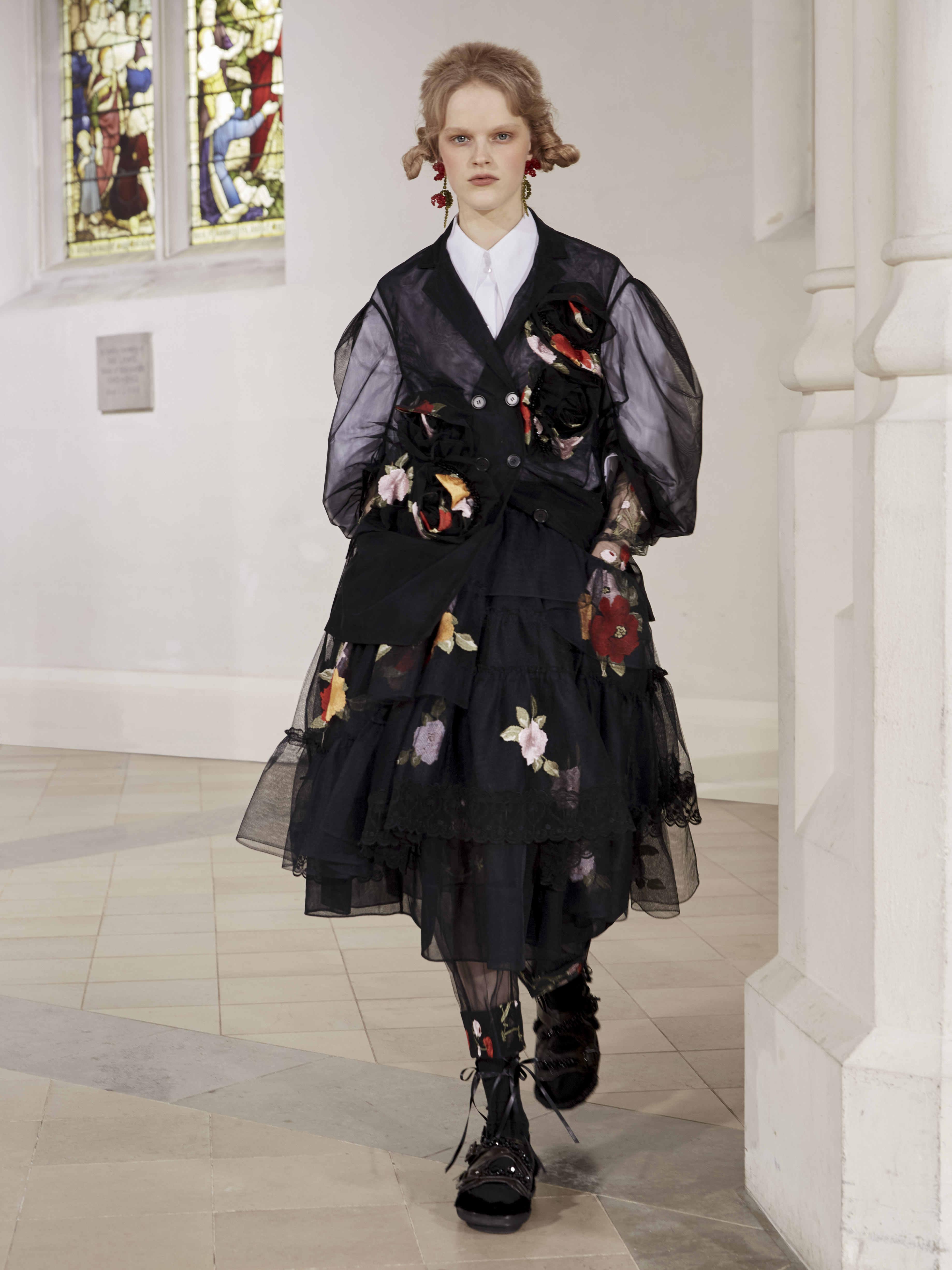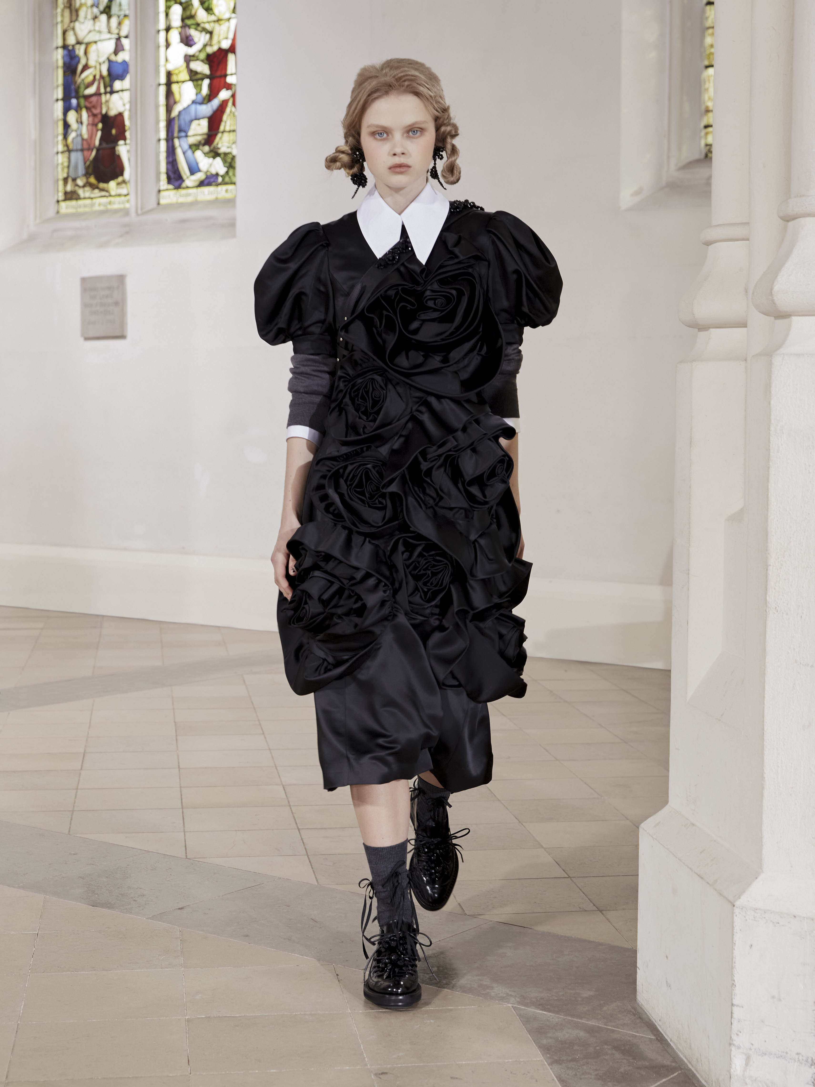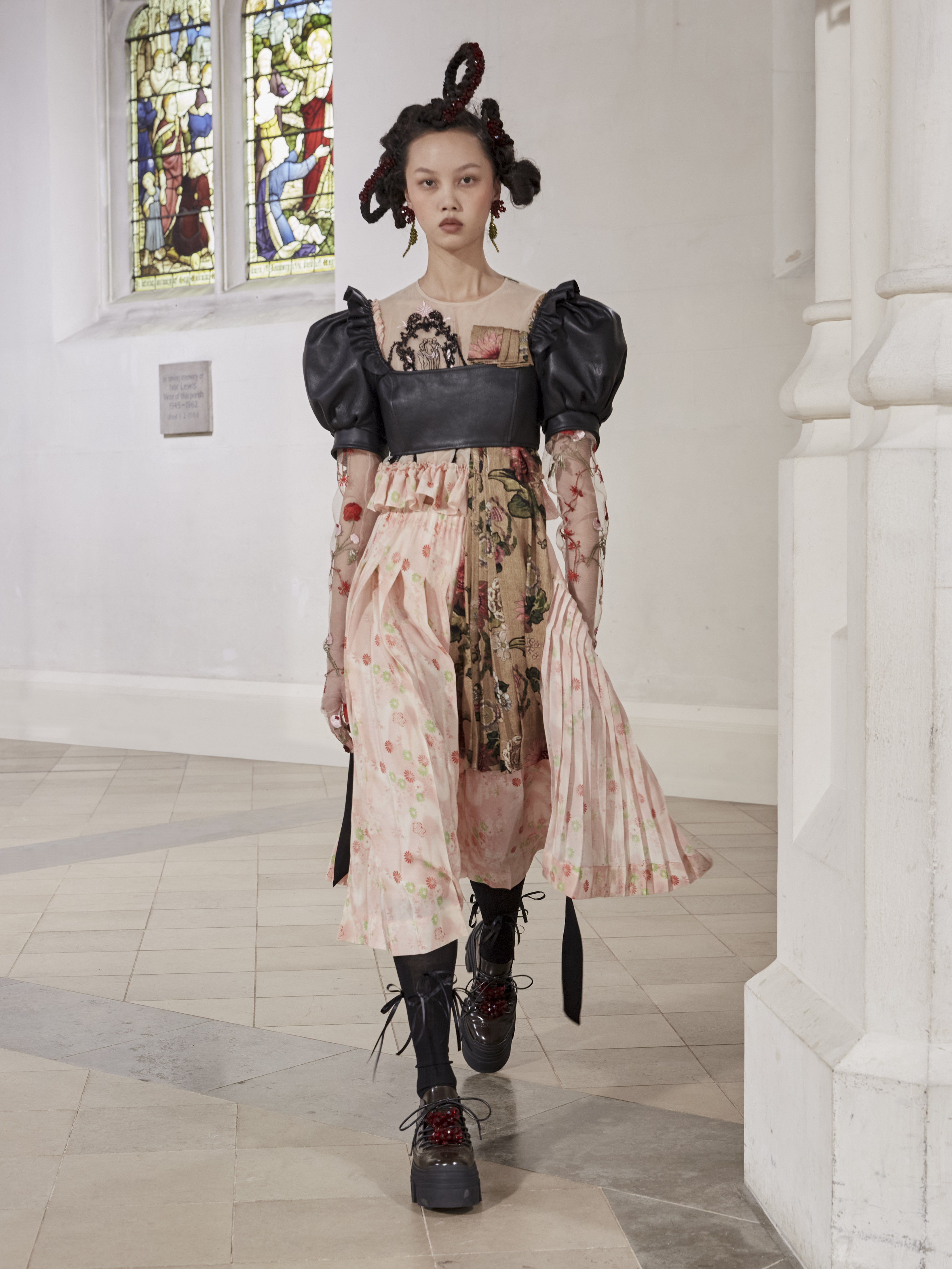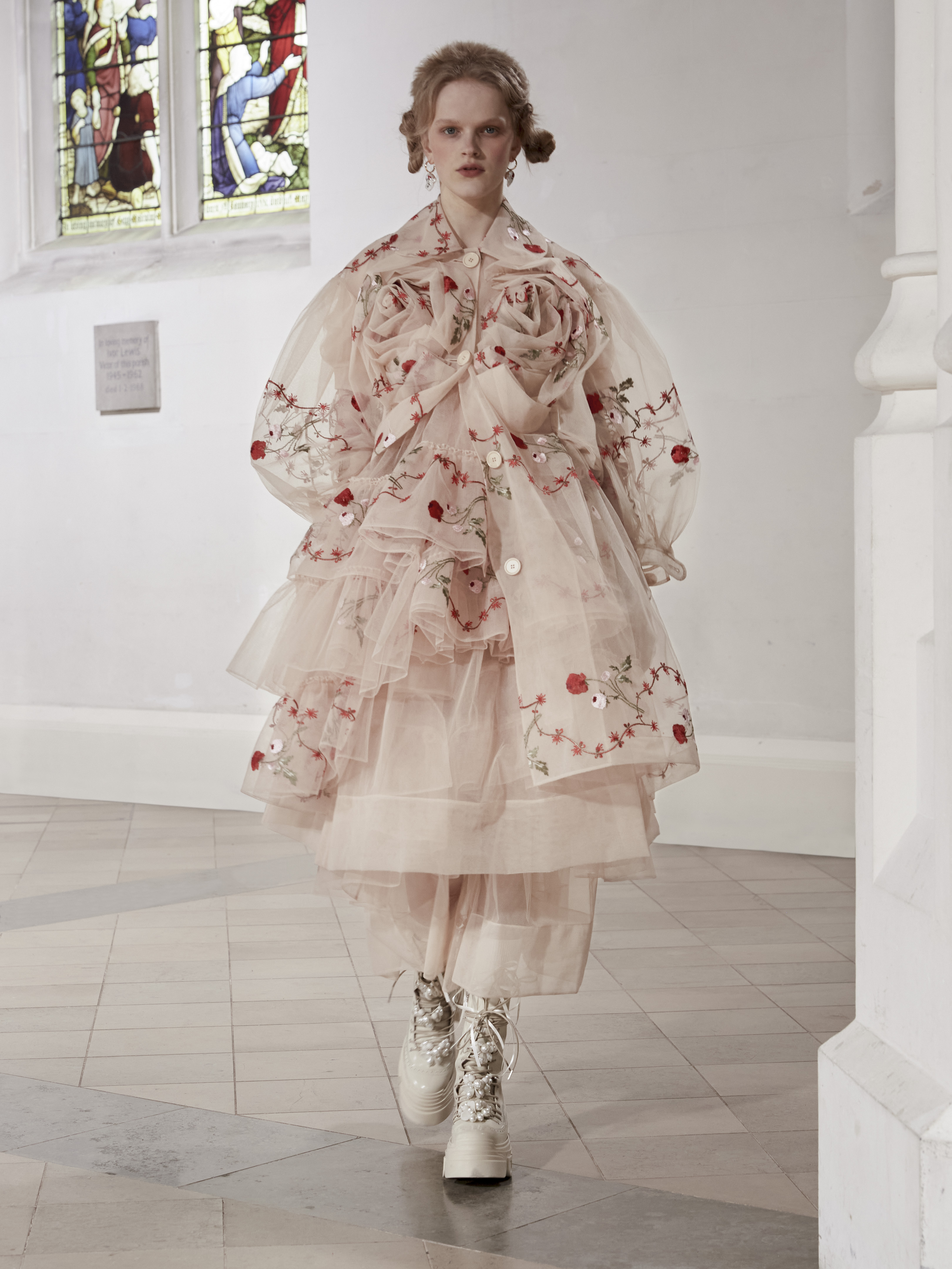 В Лондоне прошел показ коллекции Simone Rocha, и дизайнеру снова удалось удивить поклонников бренда. Подиум для моделей, которые традиционно выглядели как принцессы из сказок Ганса Христиана Андерсена, был сооружен среди витражных окон городской церкви Сент-Джонс.