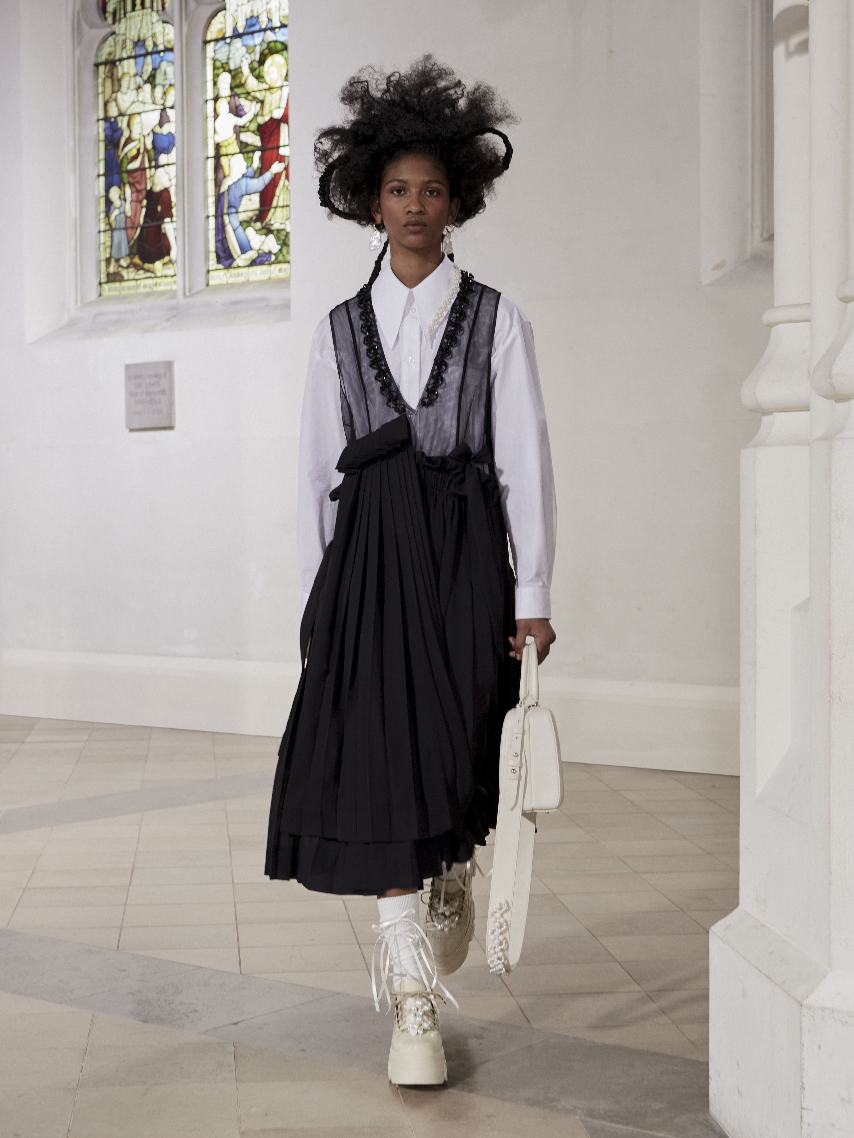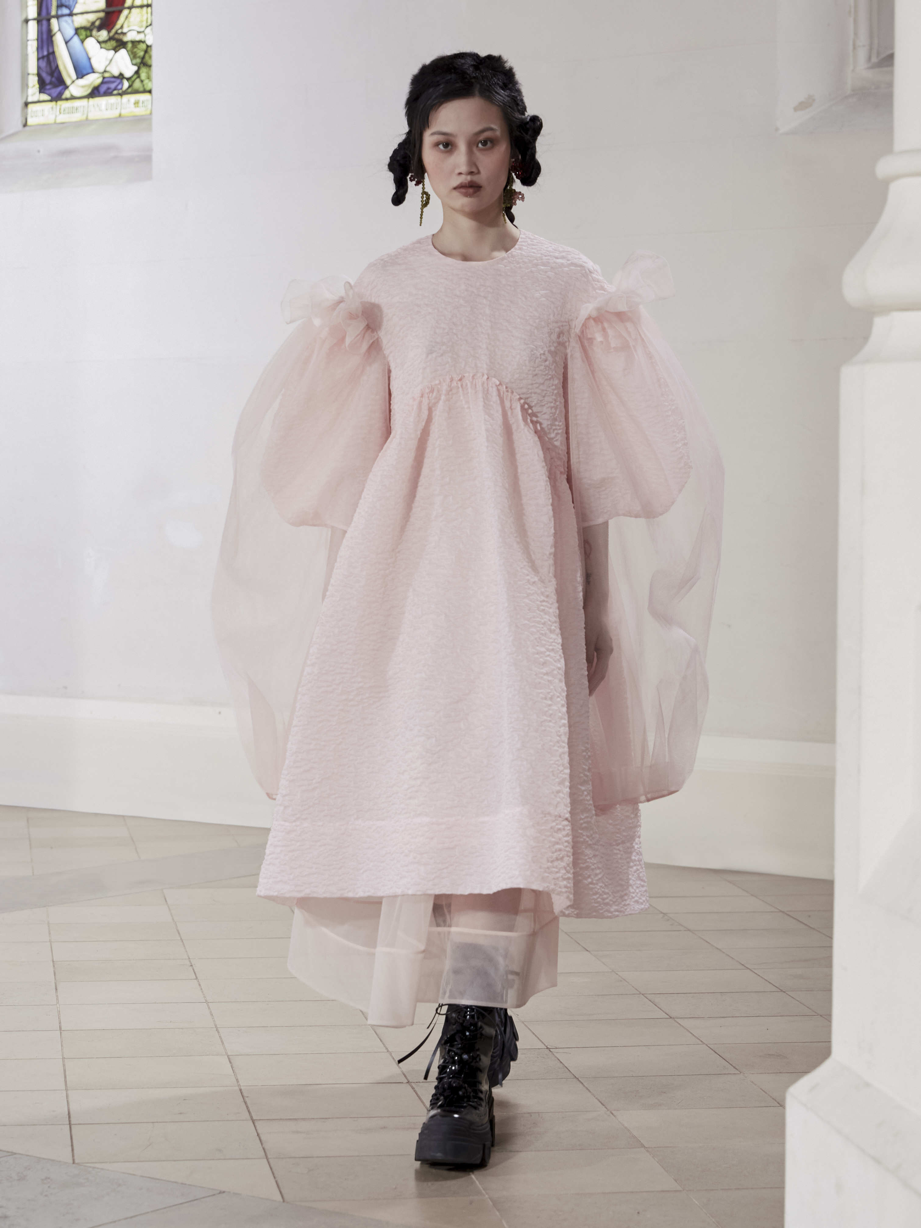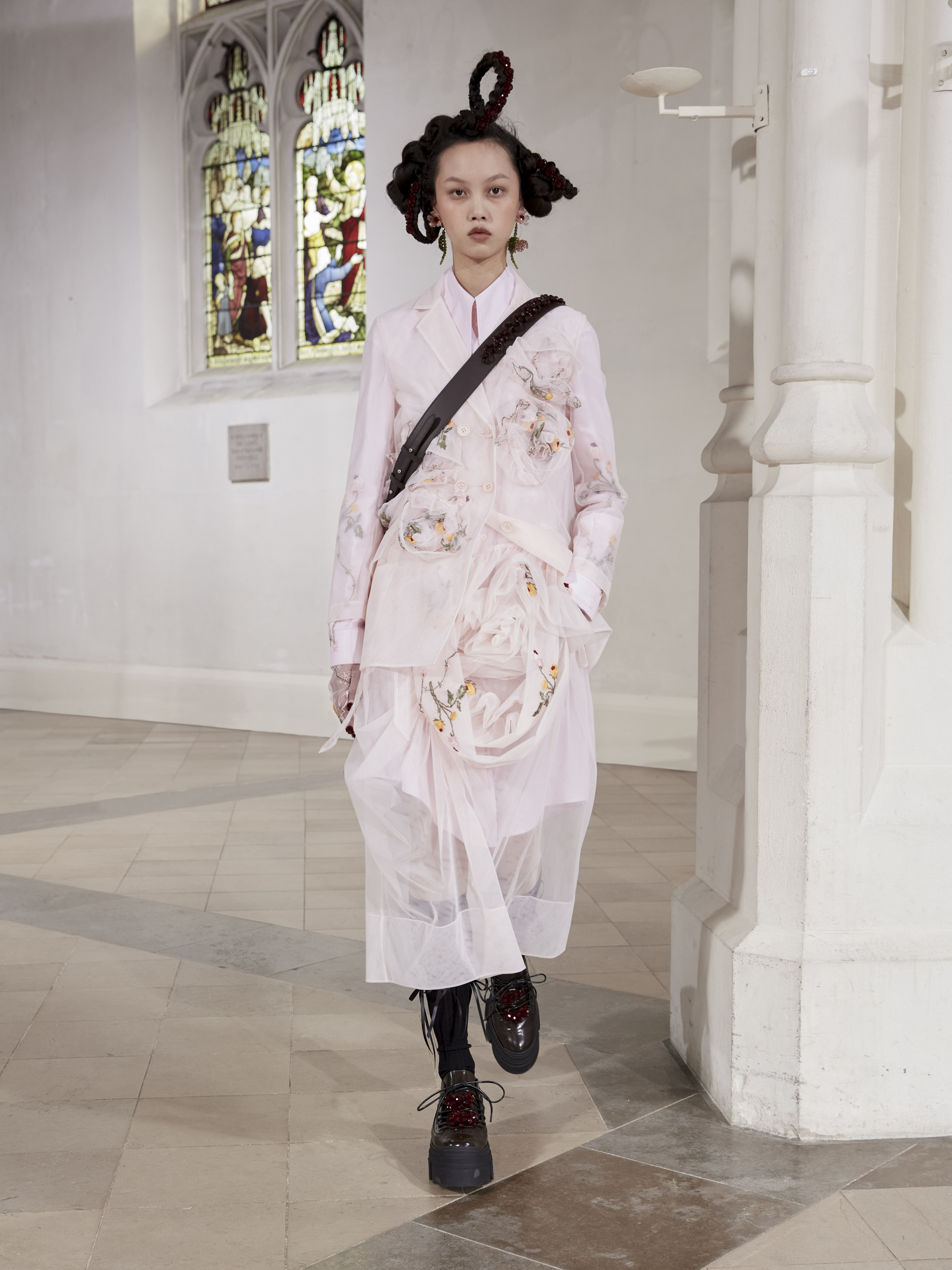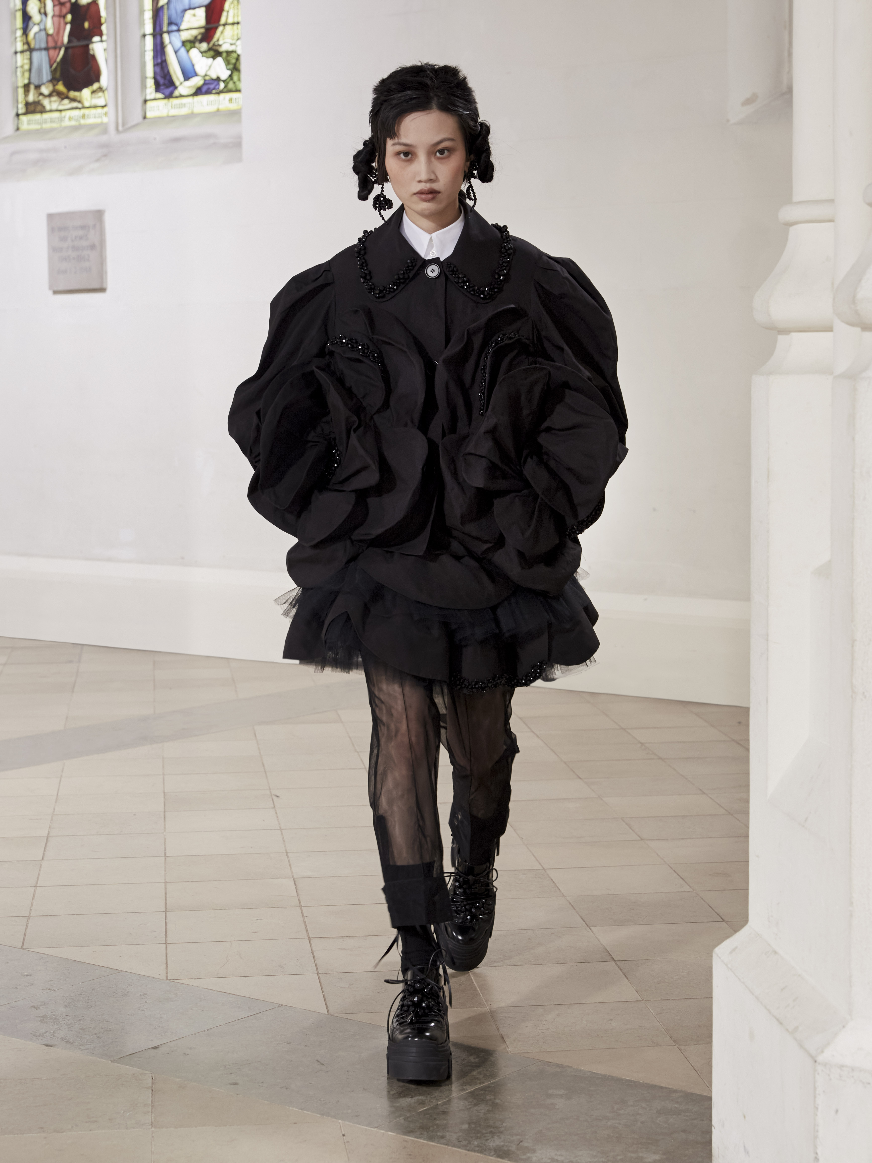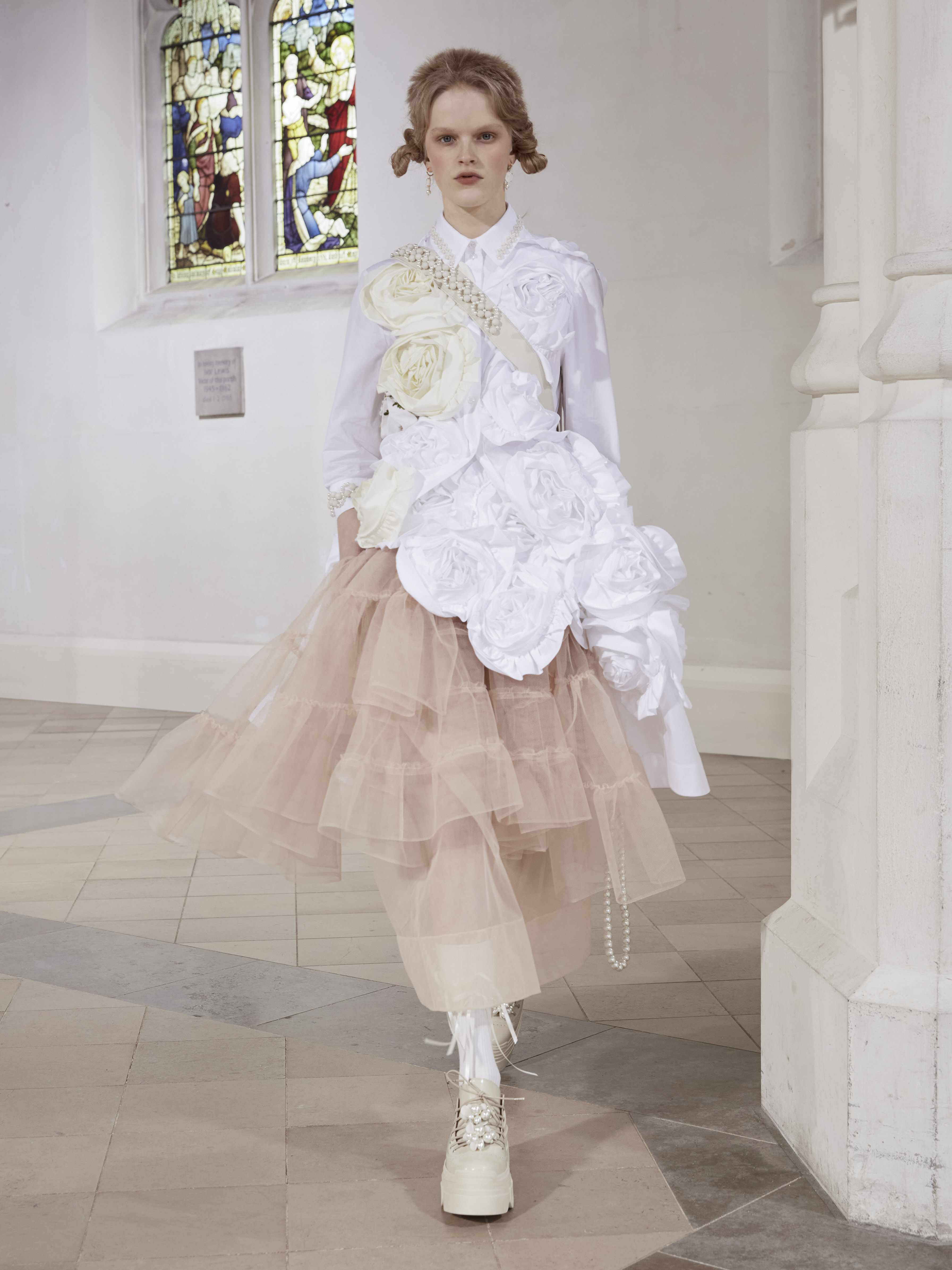 В Лондоне прошел показ коллекции Simone Rocha, и дизайнеру снова удалось удивить поклонников бренда. Подиум для моделей, которые традиционно выглядели как принцессы из сказок Ганса Христиана Андерсена, был сооружен среди витражных окон городской церкви Сент-Джонс.