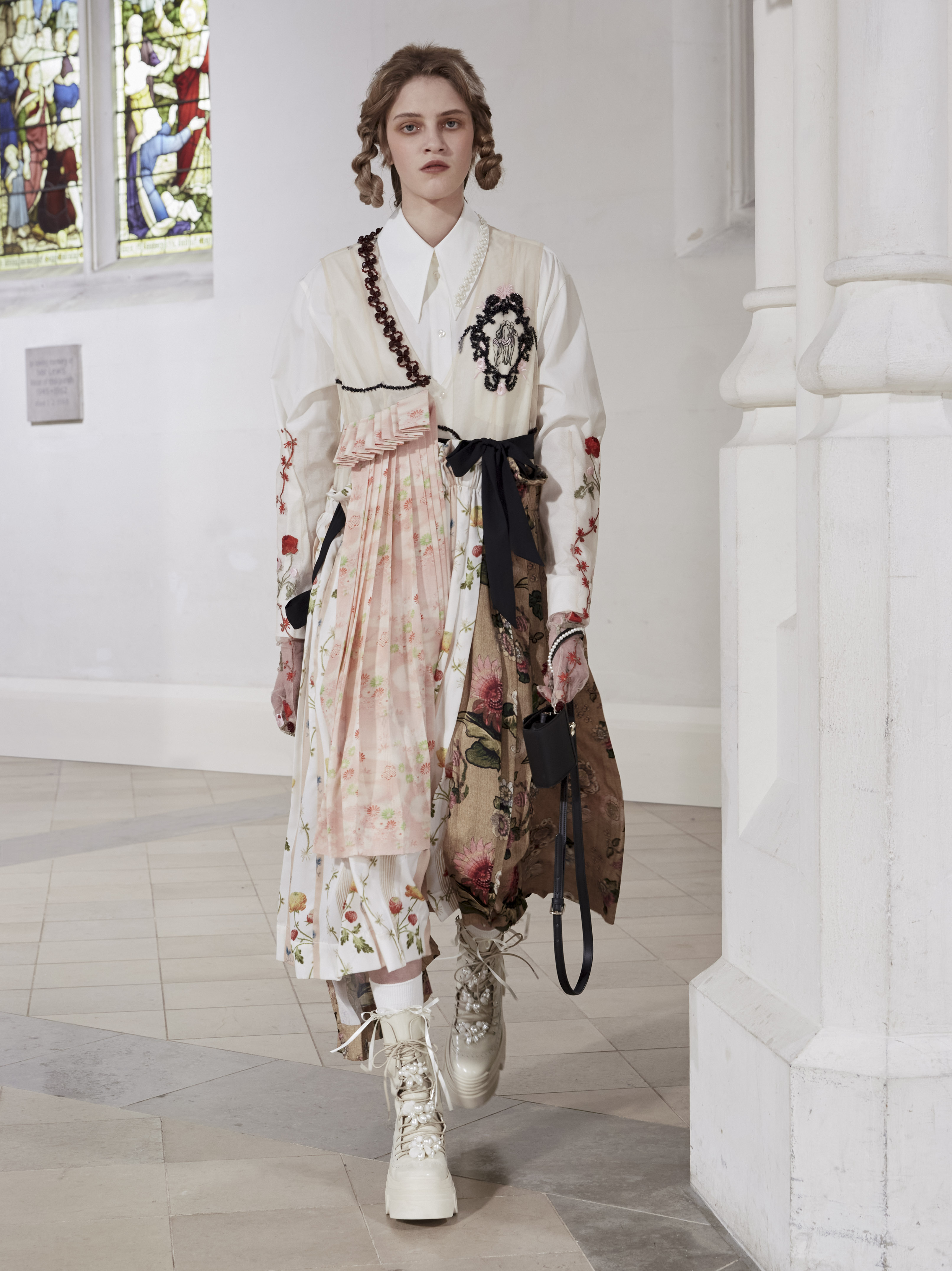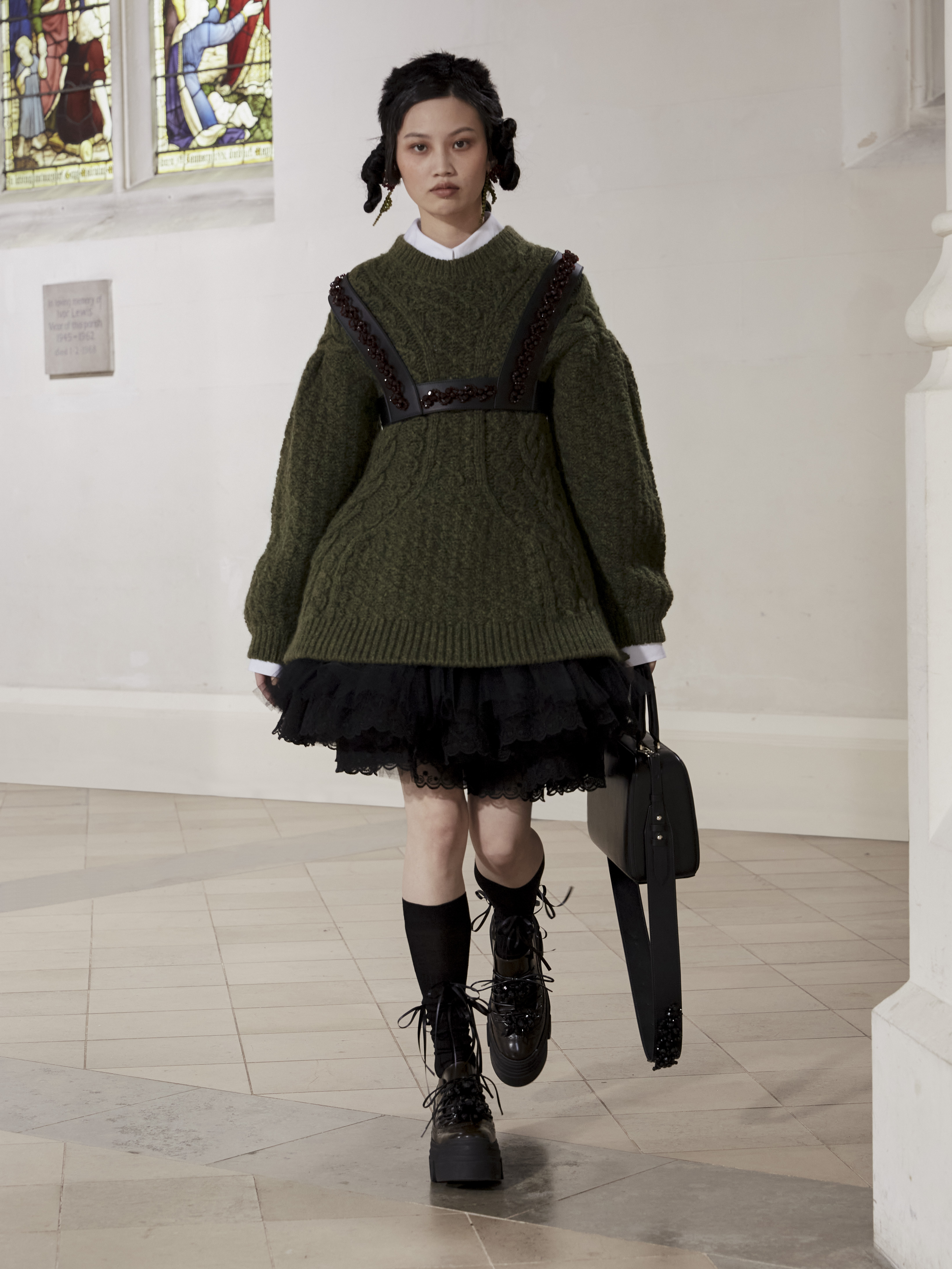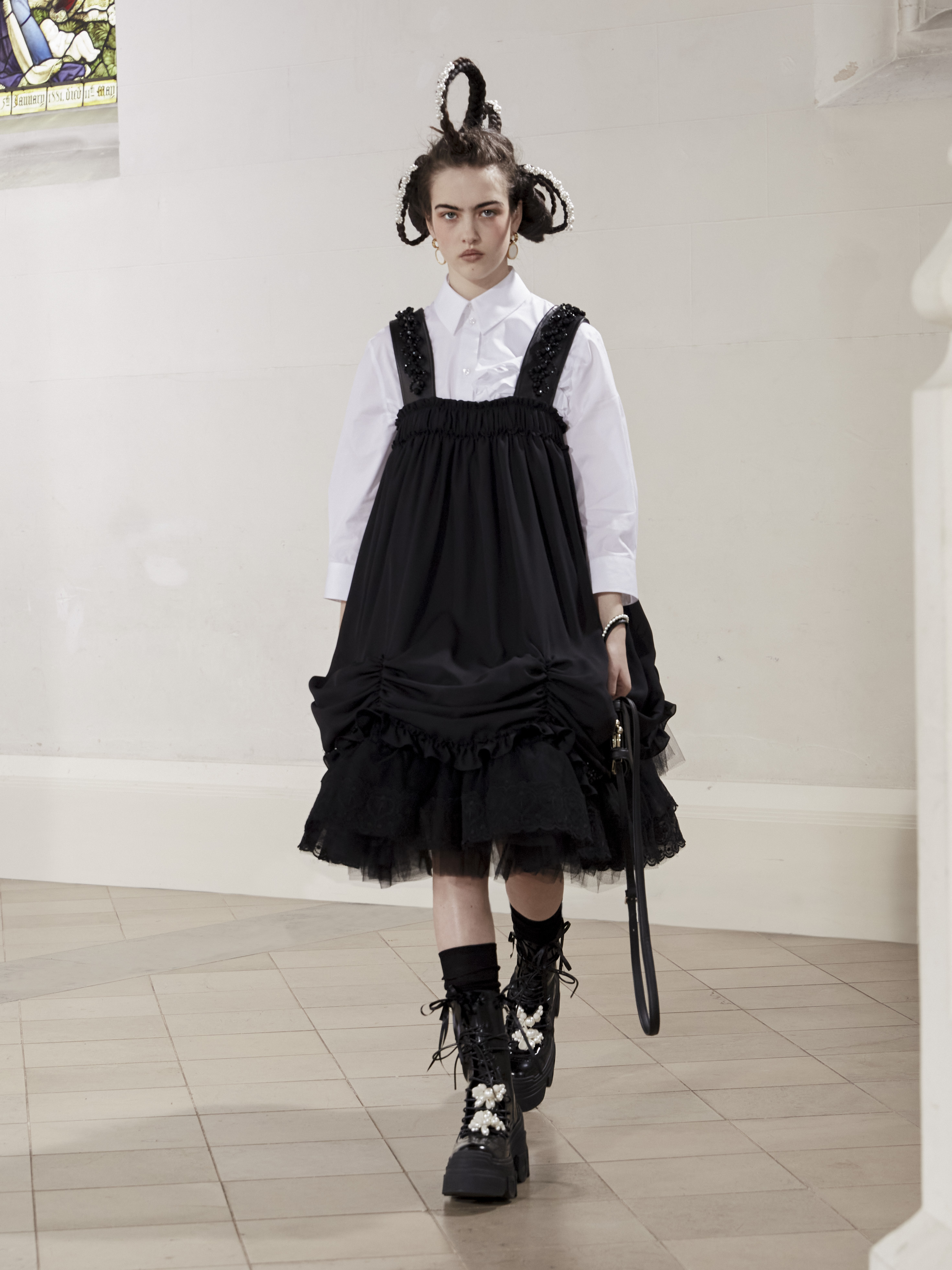 Симон Роша размышляет о хрупкости и брутальной силе и привычные структурные тренчи заменяет кожаными куртками-косухами и утилитарными плащами. Вдохновляясь униформой, дизайнер интегрирует в кукольный гардероб бренда свитеры и парки защитного цвета, но с неизменными бантами и розами, а в качестве аксессуаров вручает моделям ланч-боксы и школьные портфели. Грань между беззаботностью и эстетикой подконтрольности усиливают упряжи, или харнессы, надетые поверх воздушных слоистых нарядов и мягких свитеров.