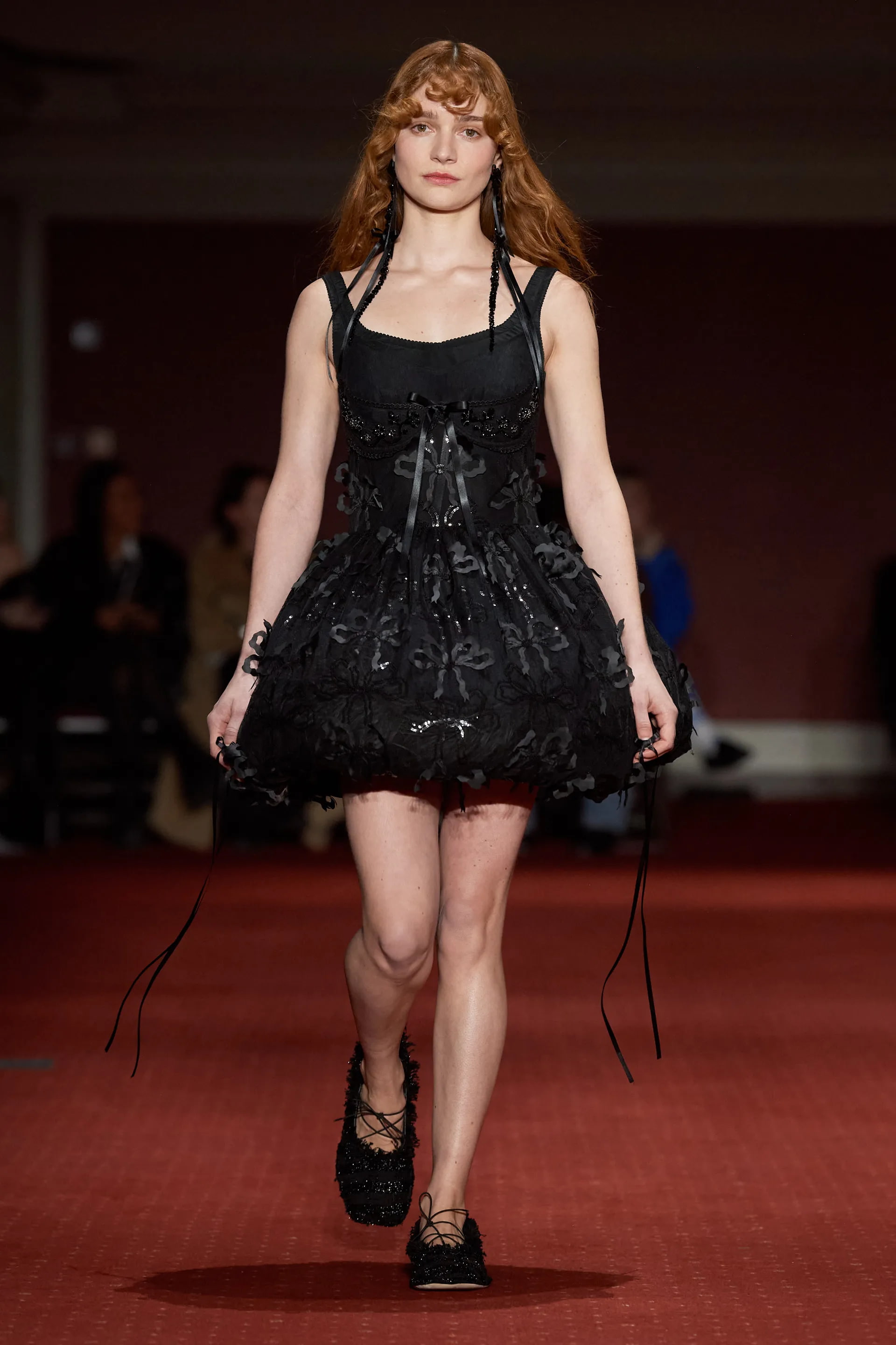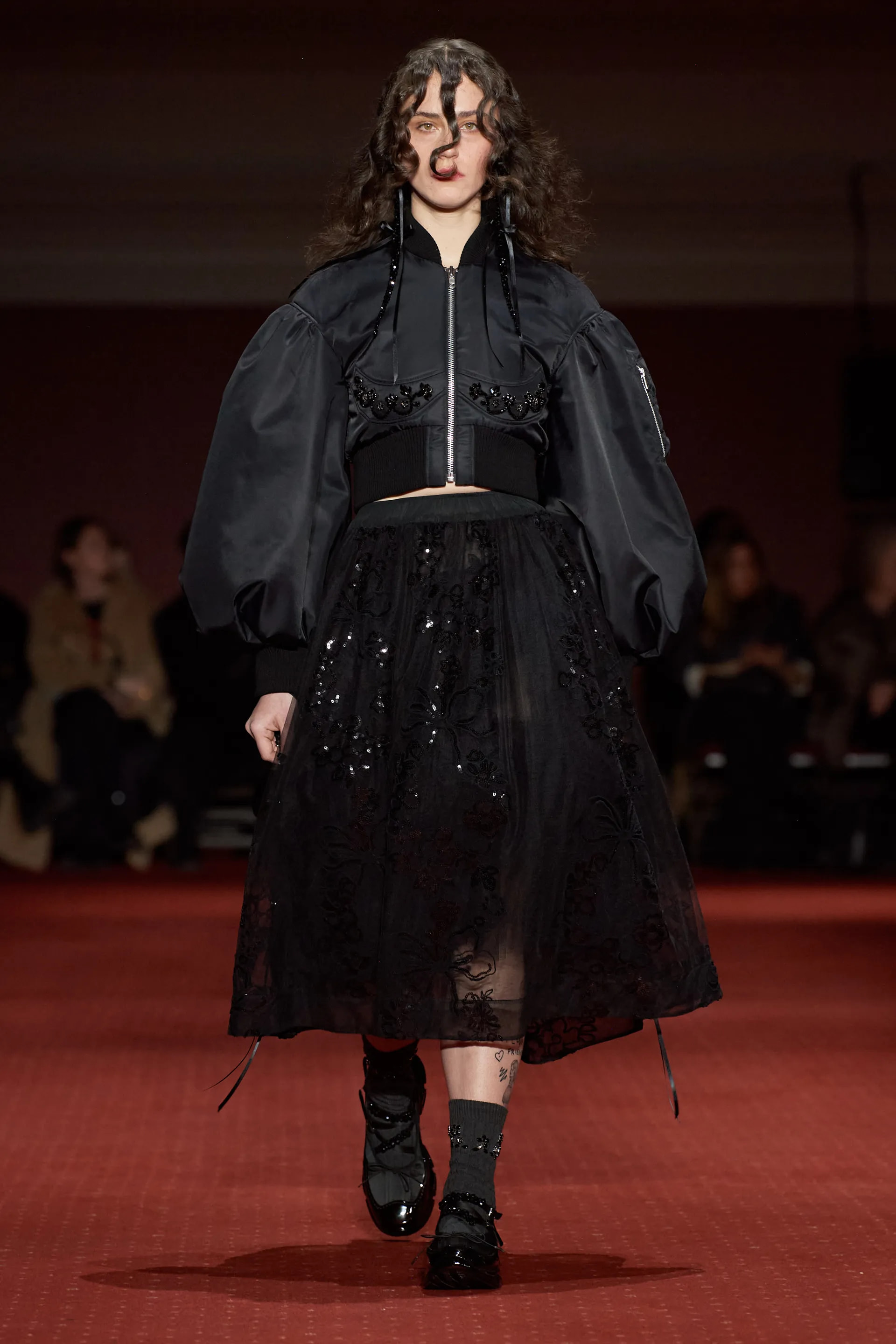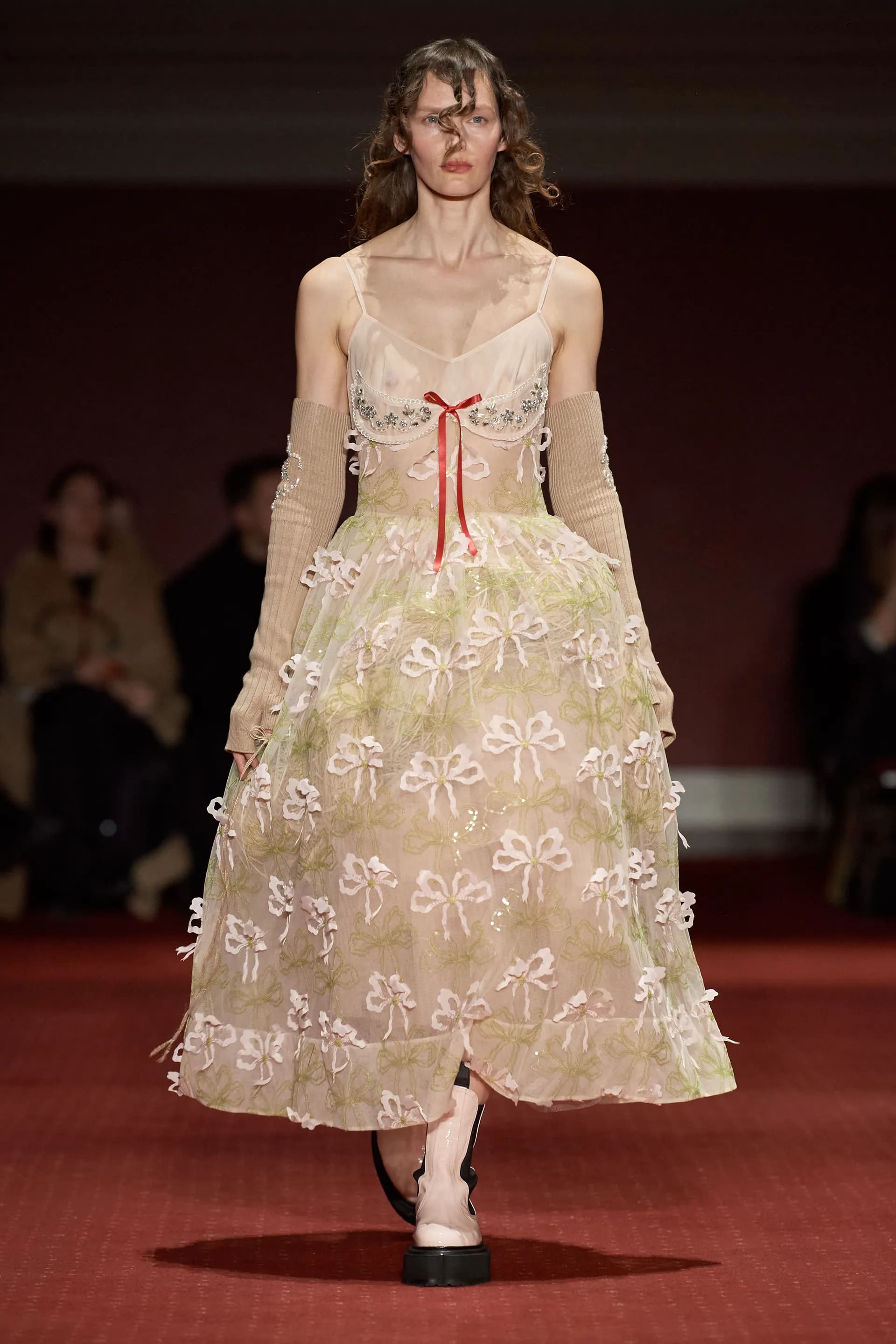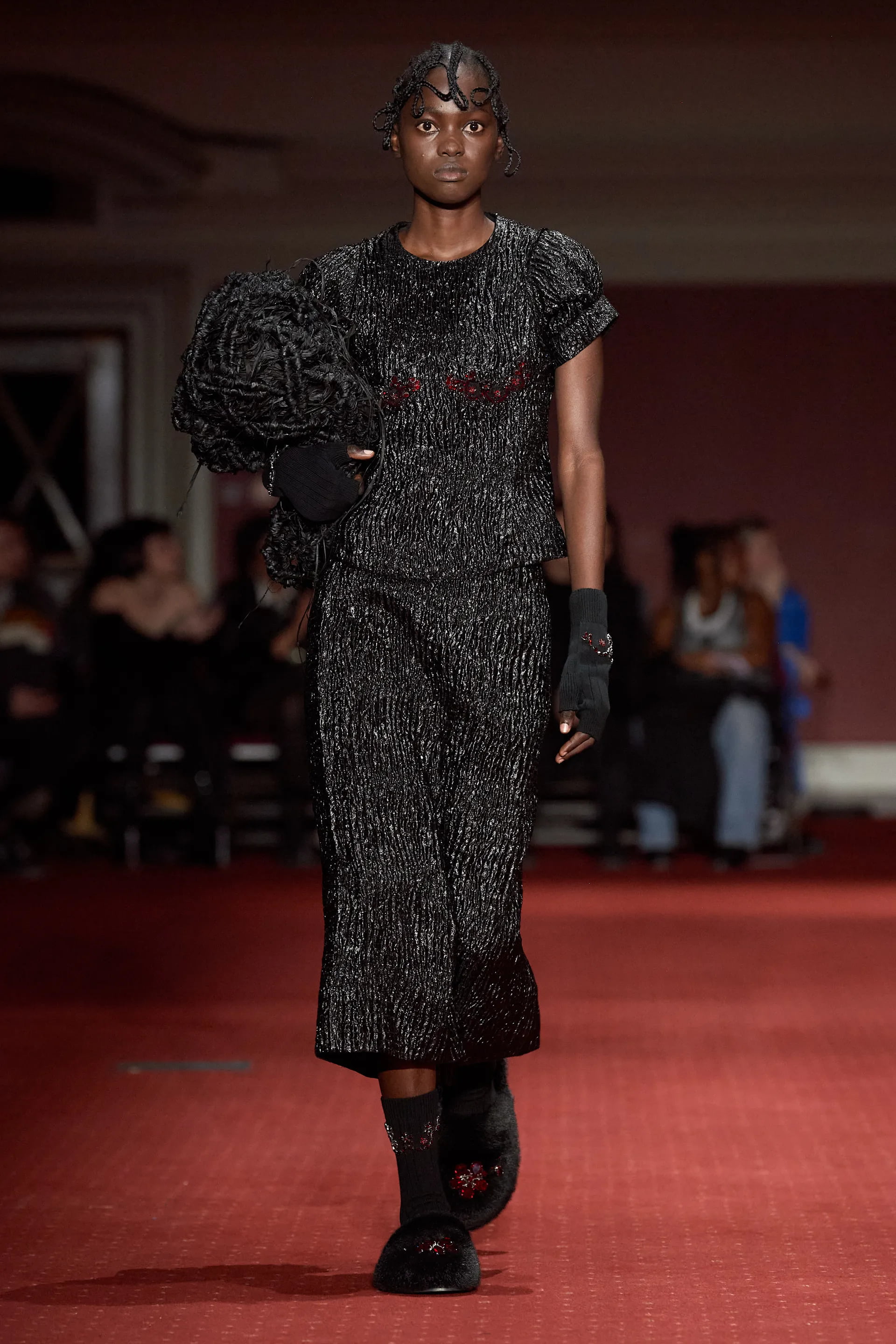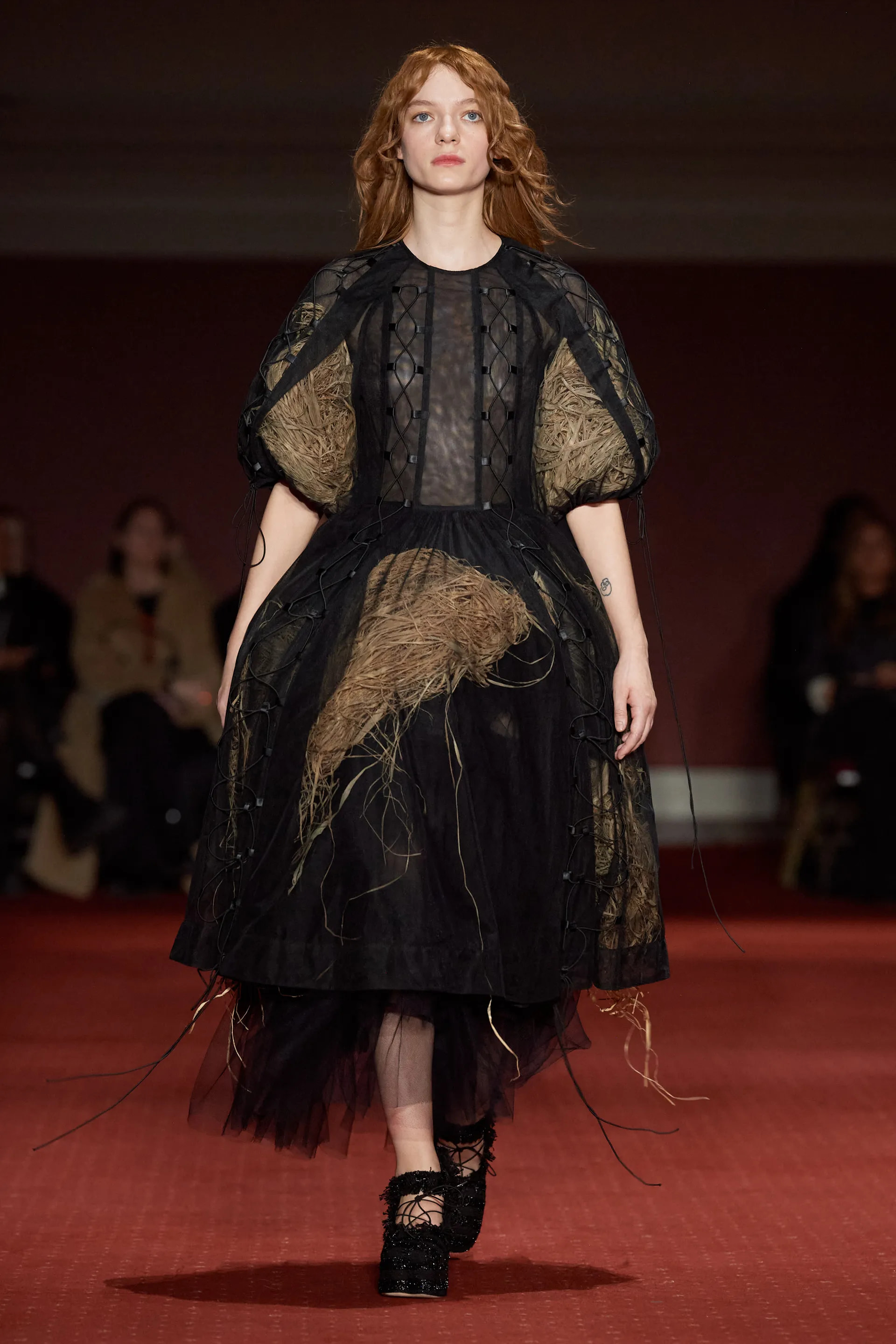 Об’ємні міді та мінісукні з криноліном, фактурні та реструктуровані класичні пальта і піджаки: це все досить класична історія для Simone Rocha. У цій колекції варто відмітити деталізацію до кожного луку: банти, бісер, вишивки на шкарептах та колготках, криноліни, наповнені сіном, квіткова вишивка паєтками та бісером, прикраси у вигляді кров’яних сліз, пухнасті балетки “Мері Джейн”. У прев’ю до колекції Сімон Роша зізналася, що ця колекція “змусила її по-новому оцінити технічну майстерність одягу”.