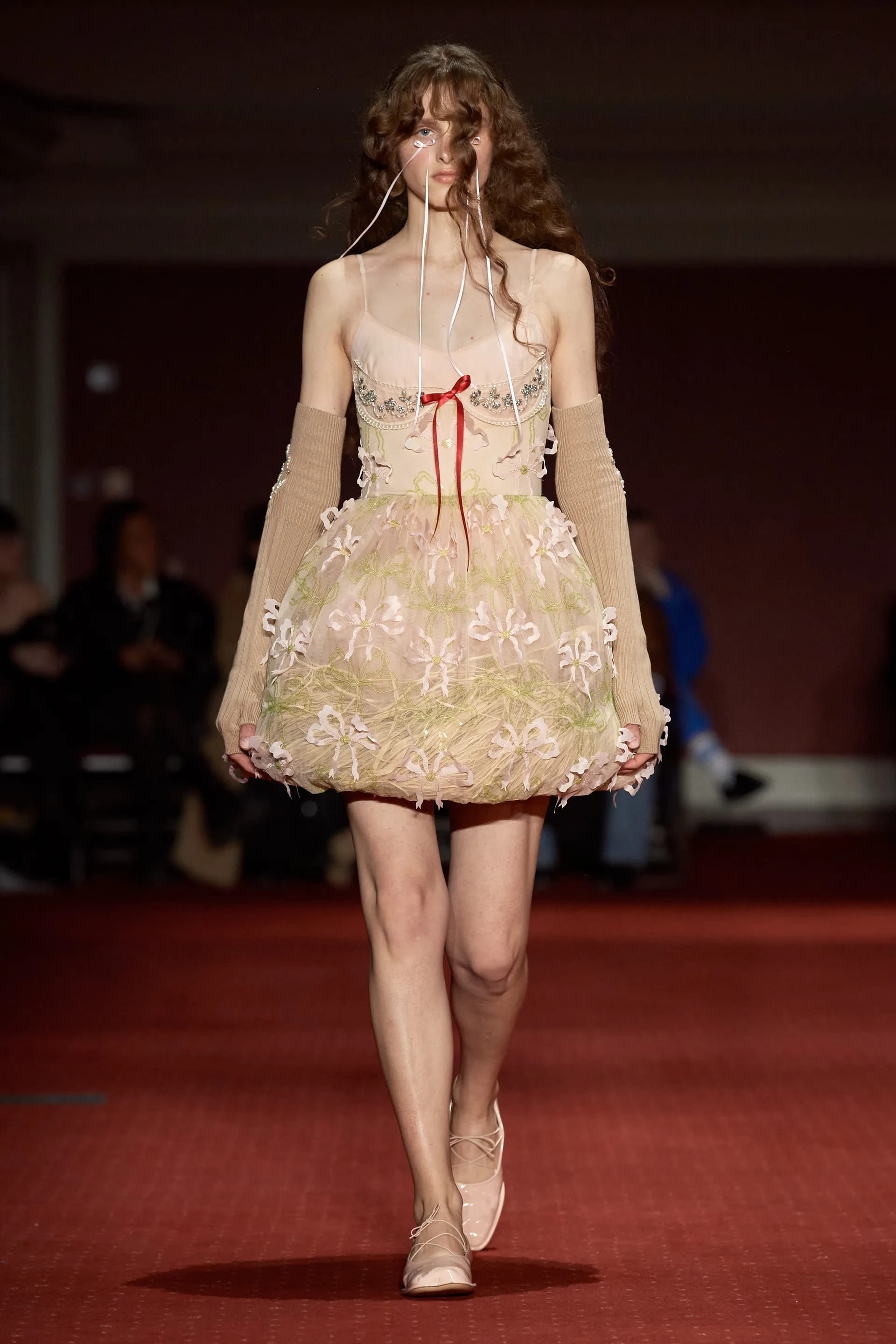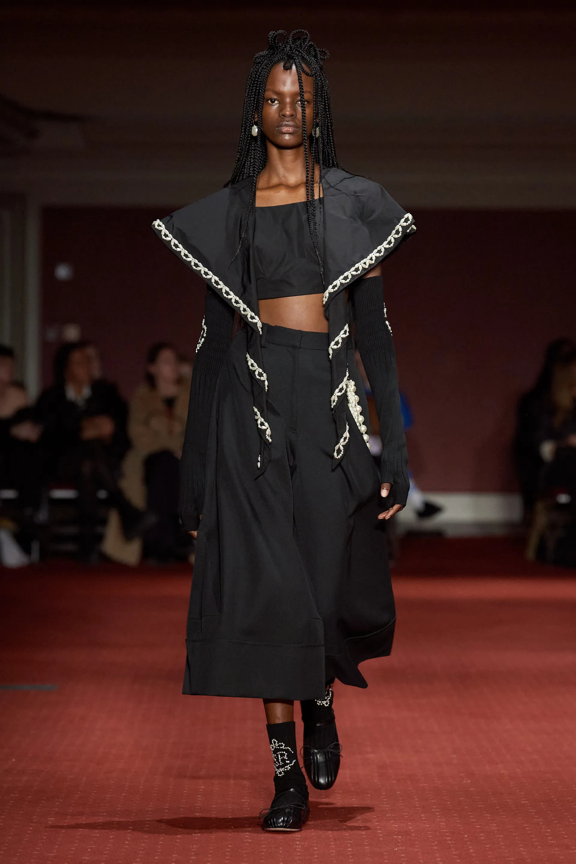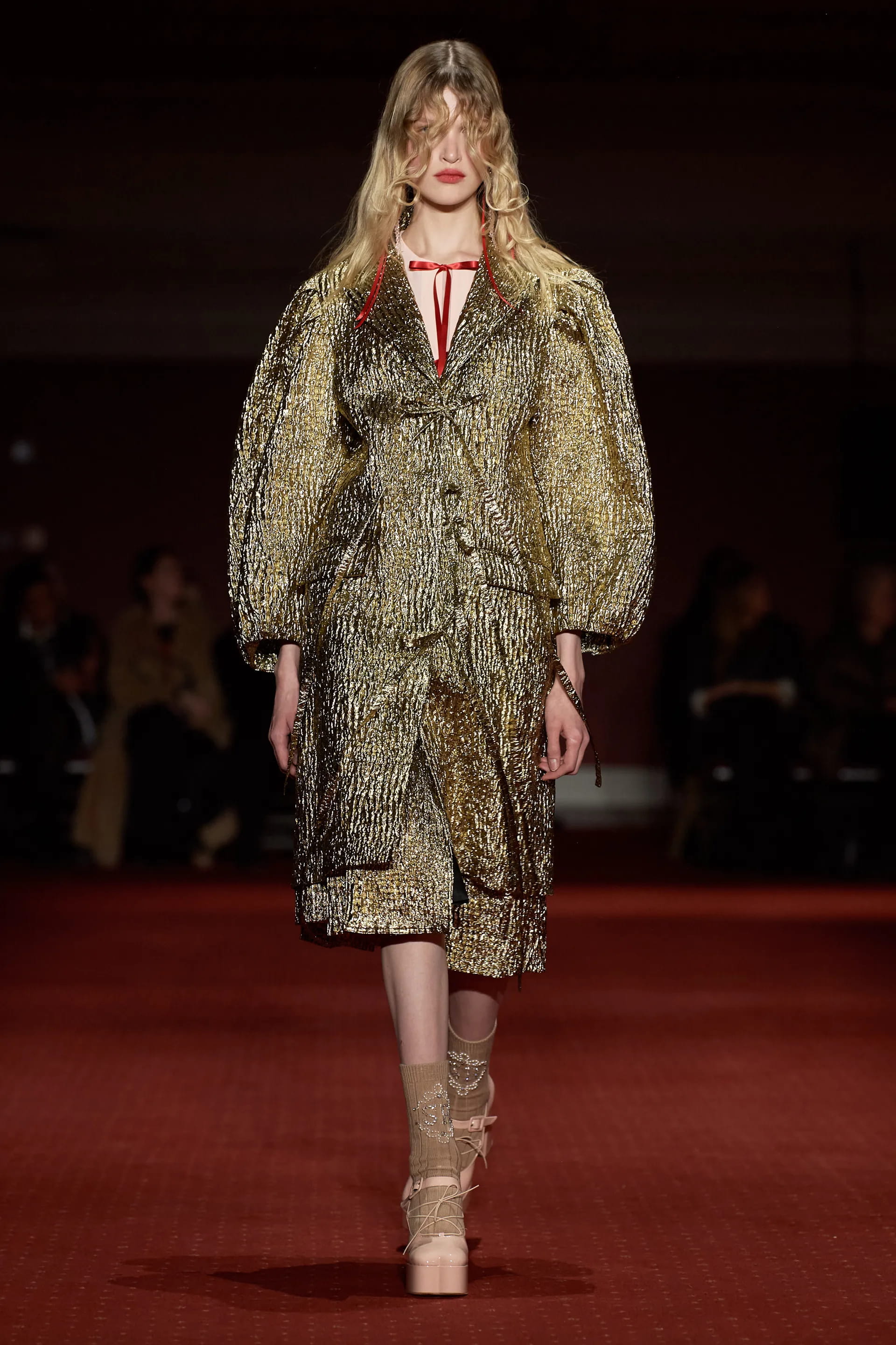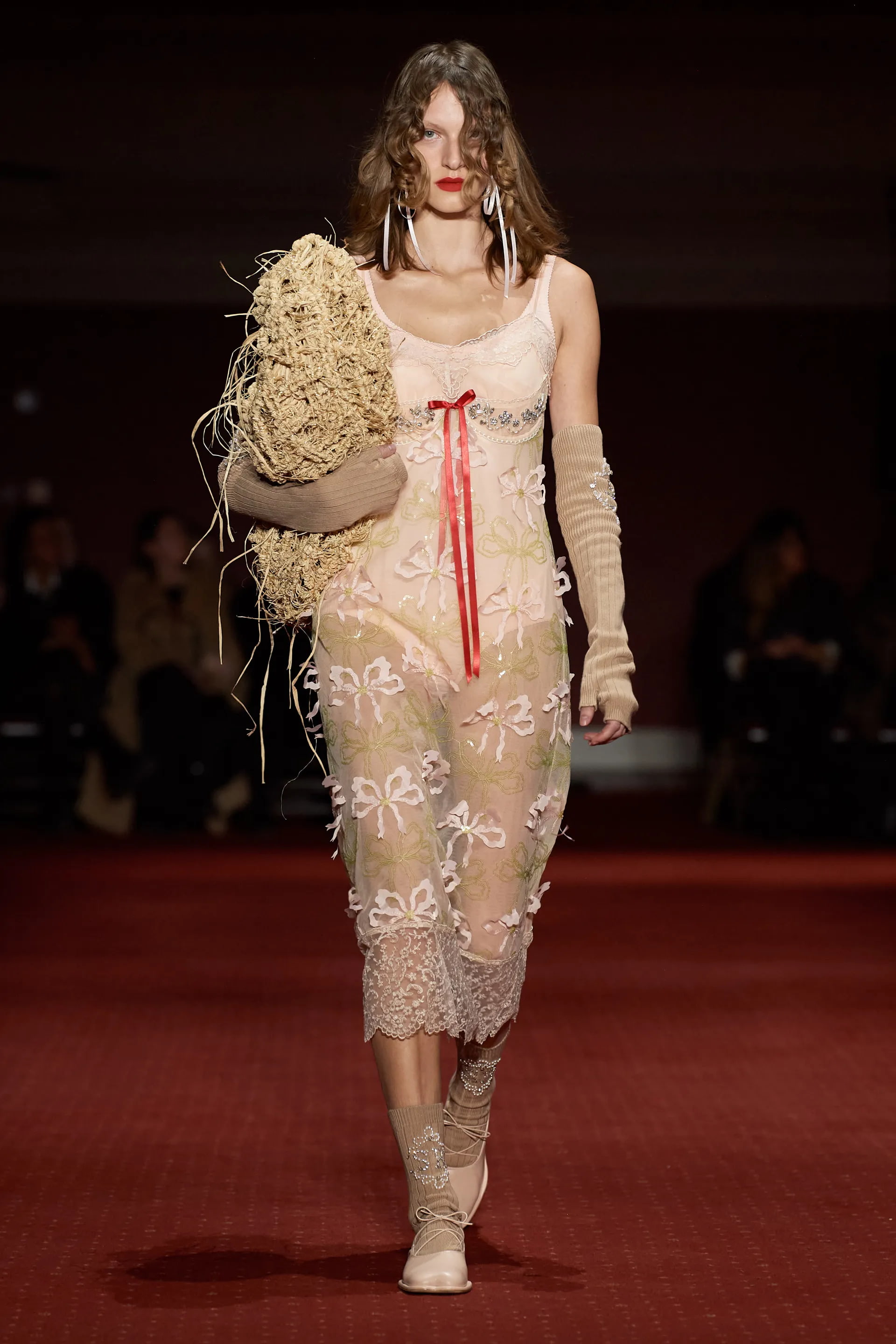 Об’ємні міді та мінісукні з криноліном, фактурні та реструктуровані класичні пальта і піджаки: це все досить класична історія для Simone Rocha. У цій колекції варто відмітити деталізацію до кожного луку: банти, бісер, вишивки на шкарептах та колготках, криноліни, наповнені сіном, квіткова вишивка паєтками та бісером, прикраси у вигляді кров’яних сліз, пухнасті балетки “Мері Джейн”. У прев’ю до колекції Сімон Роша зізналася, що ця колекція “змусила її по-новому оцінити технічну майстерність одягу”.