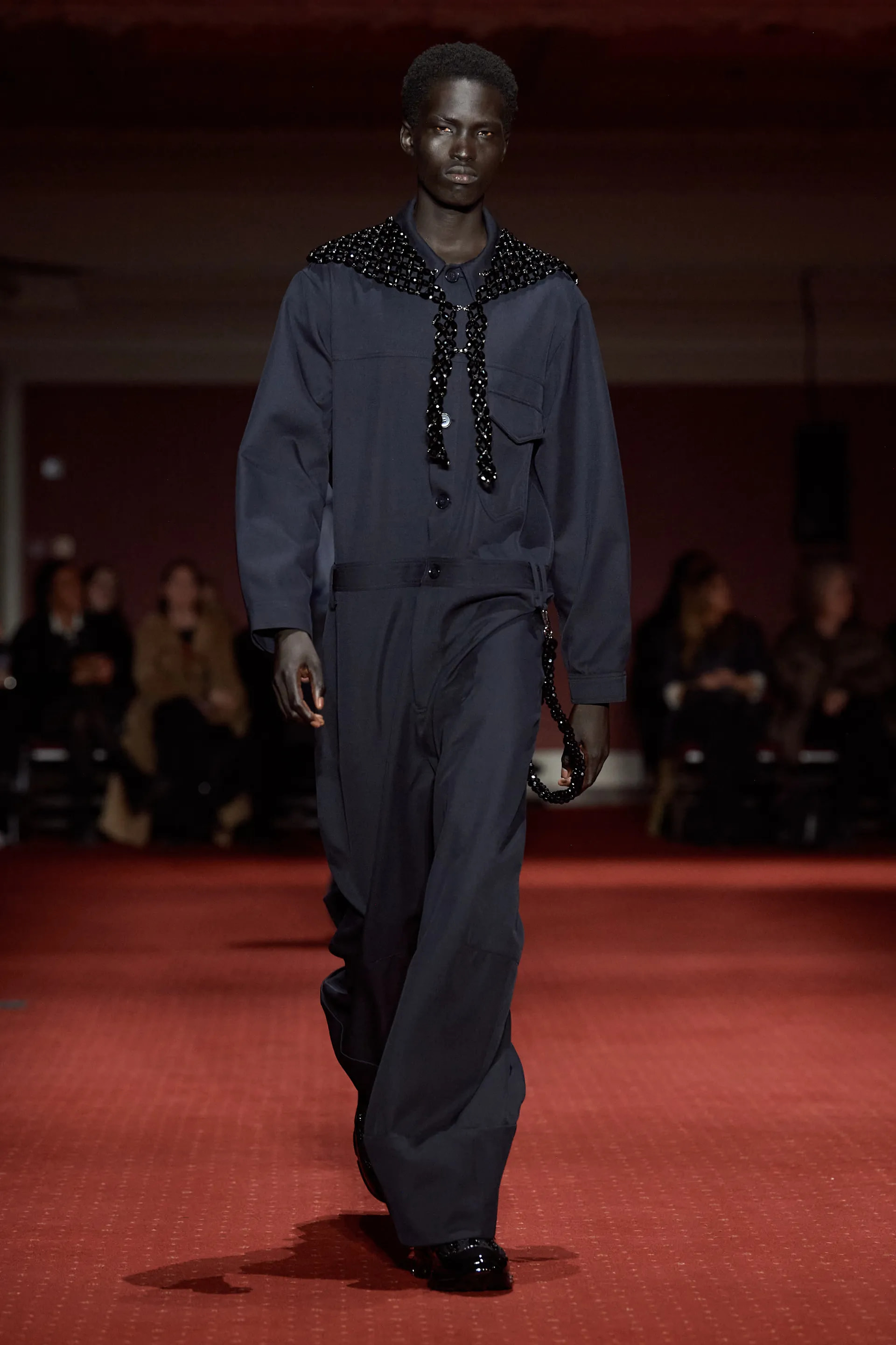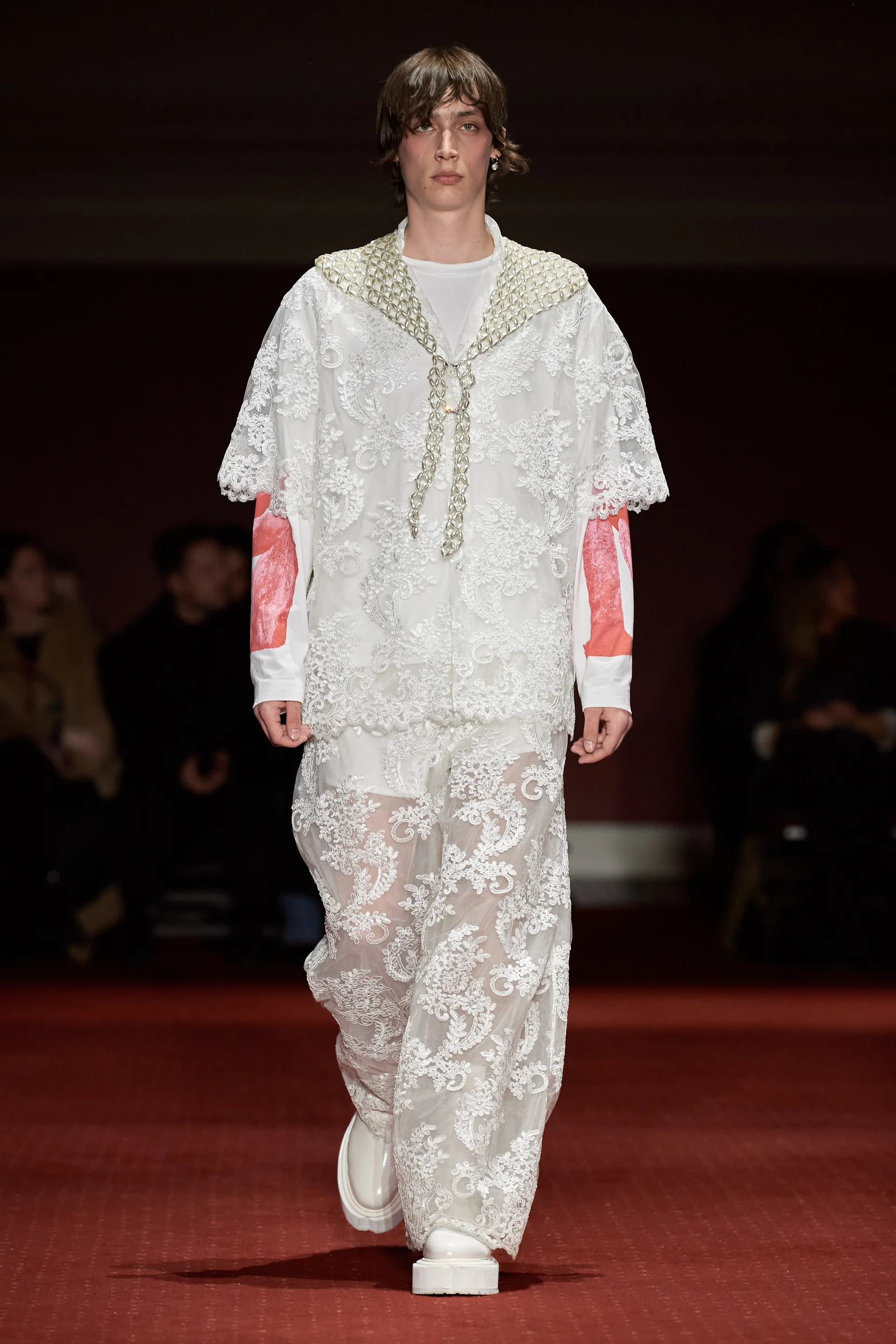 Чоловічий одяг у колекції вийшов не менш яскравий, а-гендерний, дуже деталізований та фемінізований. Чоловічий двобортний костюм дизайнерка доповнює масивною прикрасою з бісеру та кілтом, об’ємний бомбер фемінізує квітчастою вишивкою на тканині та мідіюбкою разом з класичними чоловічими челсі, максіоб’ємні сорочки з довгими рукавами та об’ємними прикрасами на спині, а також чоловічі сукні. Якщо раніше бренд створював таку історію лише в жіночій лінії, тепер це можна побачити і в чоловічому одязі. Таким чином бренд слідує за всесвітньою тенденцією а-гендерної моди.