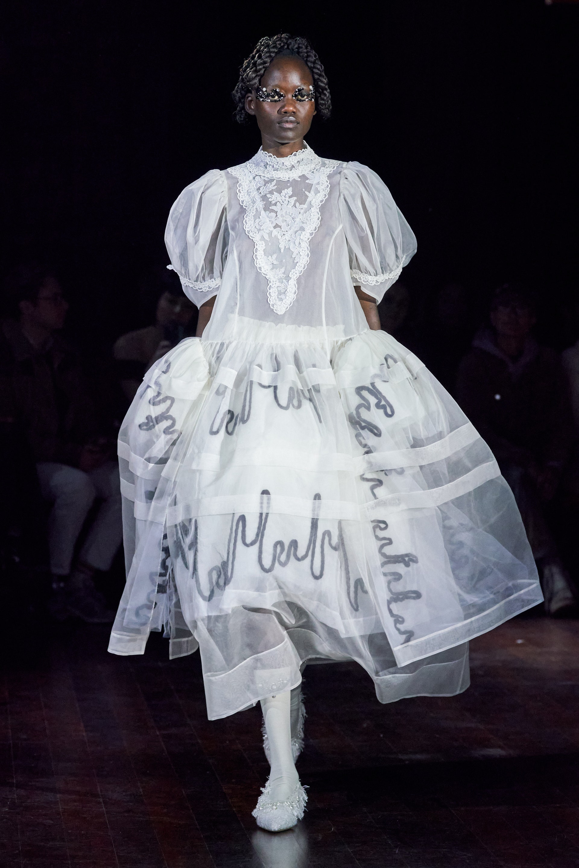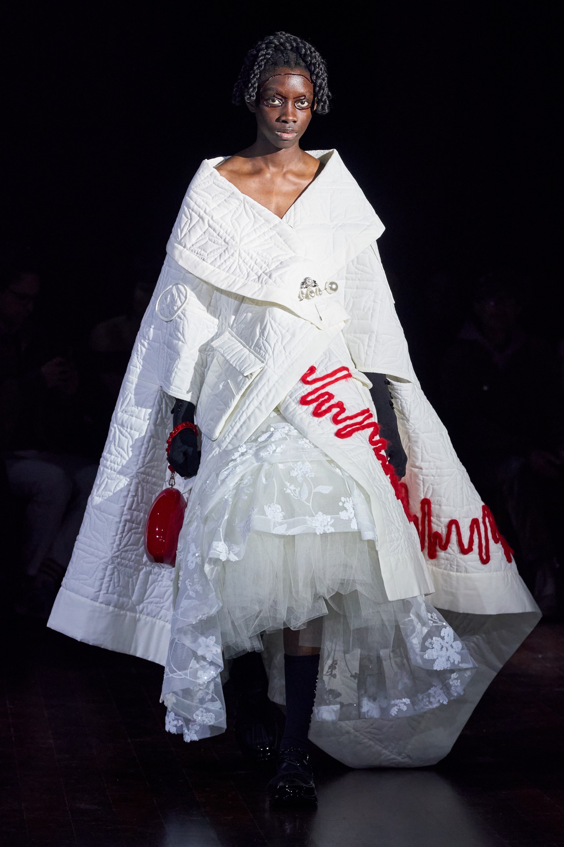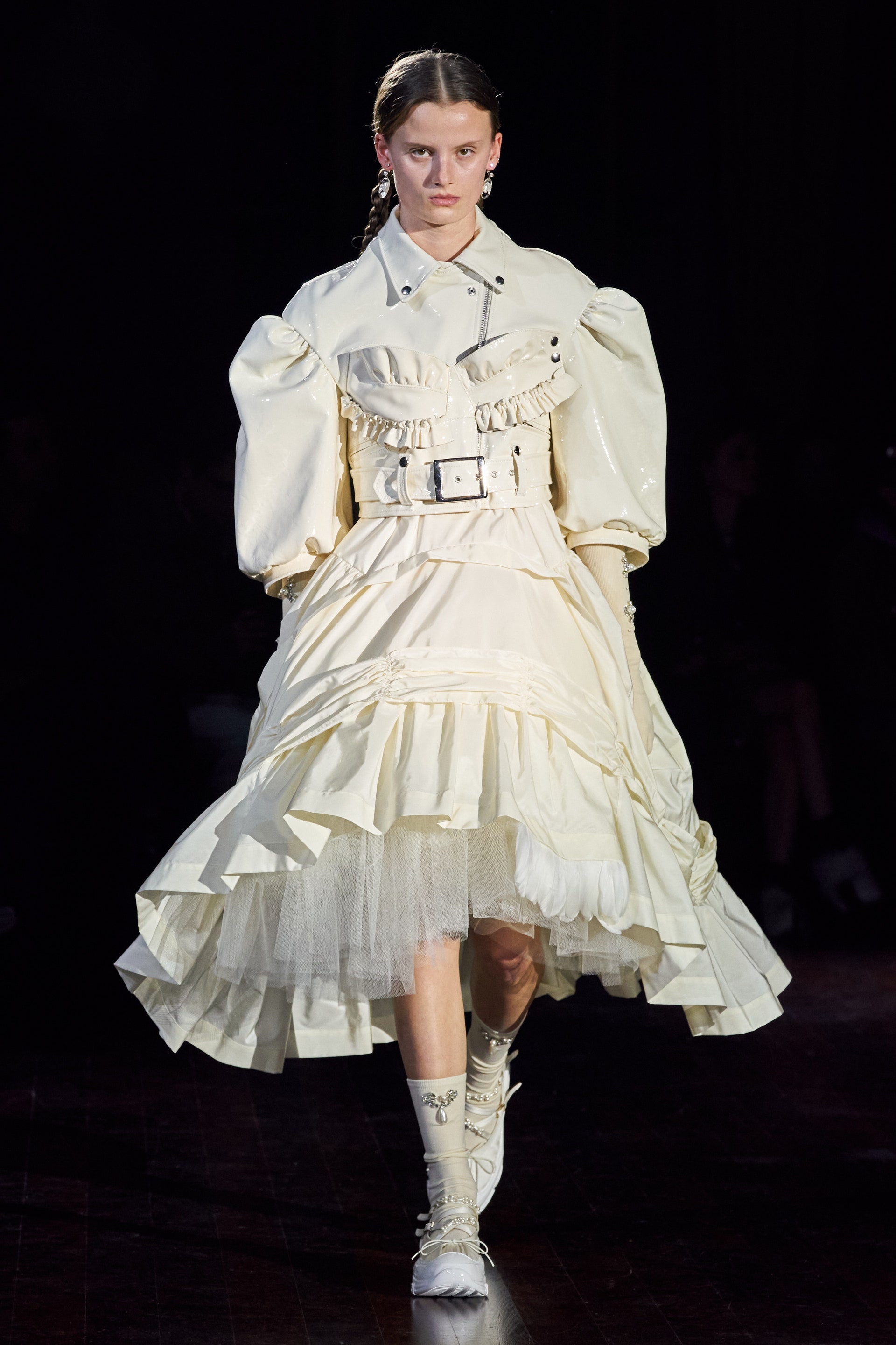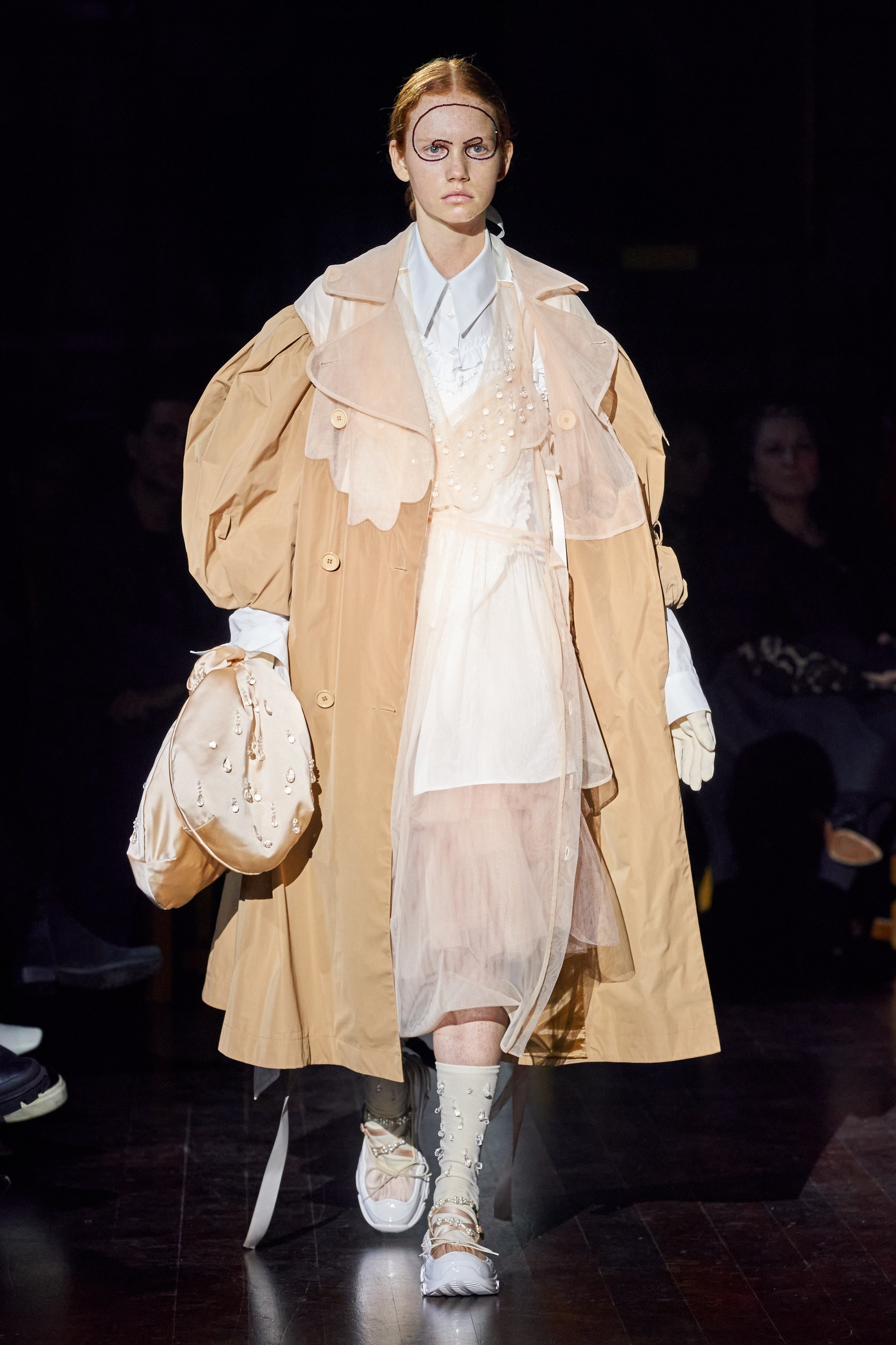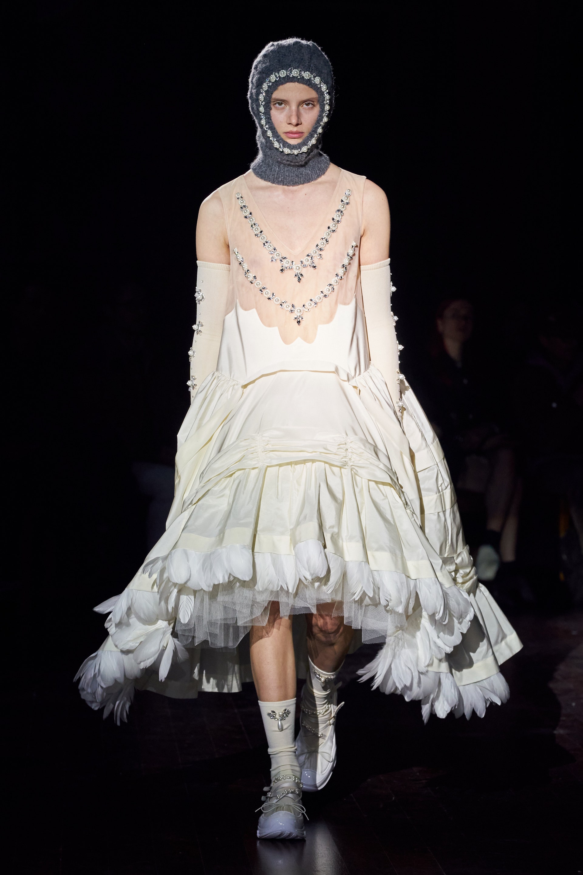 Немного тревожные (как и всегда в случае с Simone Rocha), полные романтического мистицизма образы на показе включали в себя "парящие" платья и юбки на кринолинах, вязаные капоры, стеганую верхнюю одежду и вязаные микрокардиганы. Фирменные куртки-косухи дизайнер "разъединила" в сложносоставные накидки, а объемные плащи дополнила бантами и белоснежными занавесями. Сообразно трагичному лейтмотиву фольклорного предания, наряды коллекции украшены рубиновыми капельками крови, при этом расшиты жемчугом и кристаллами, что подсвечивает царственность лебедей, в которых были превращены трое сыновей и дочь Лира.
