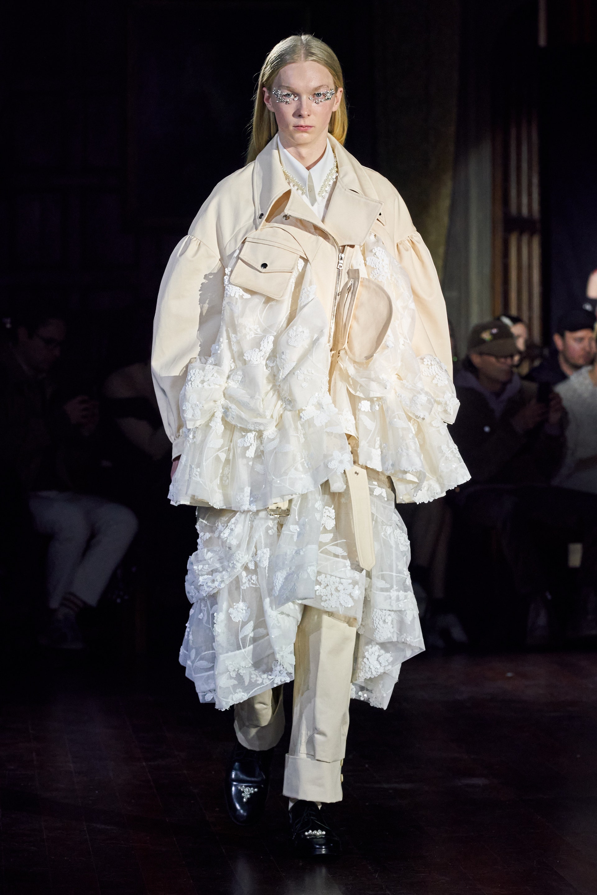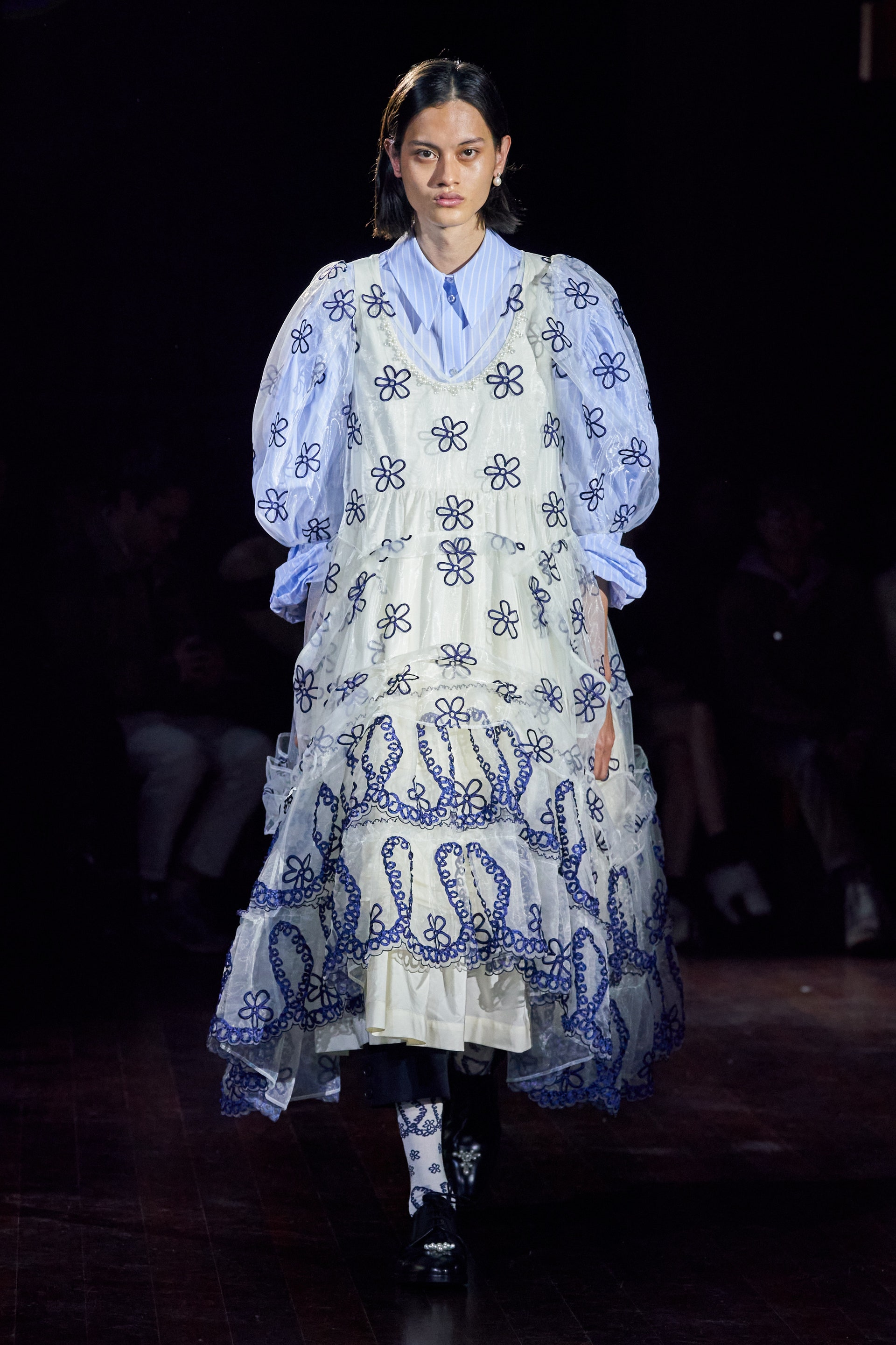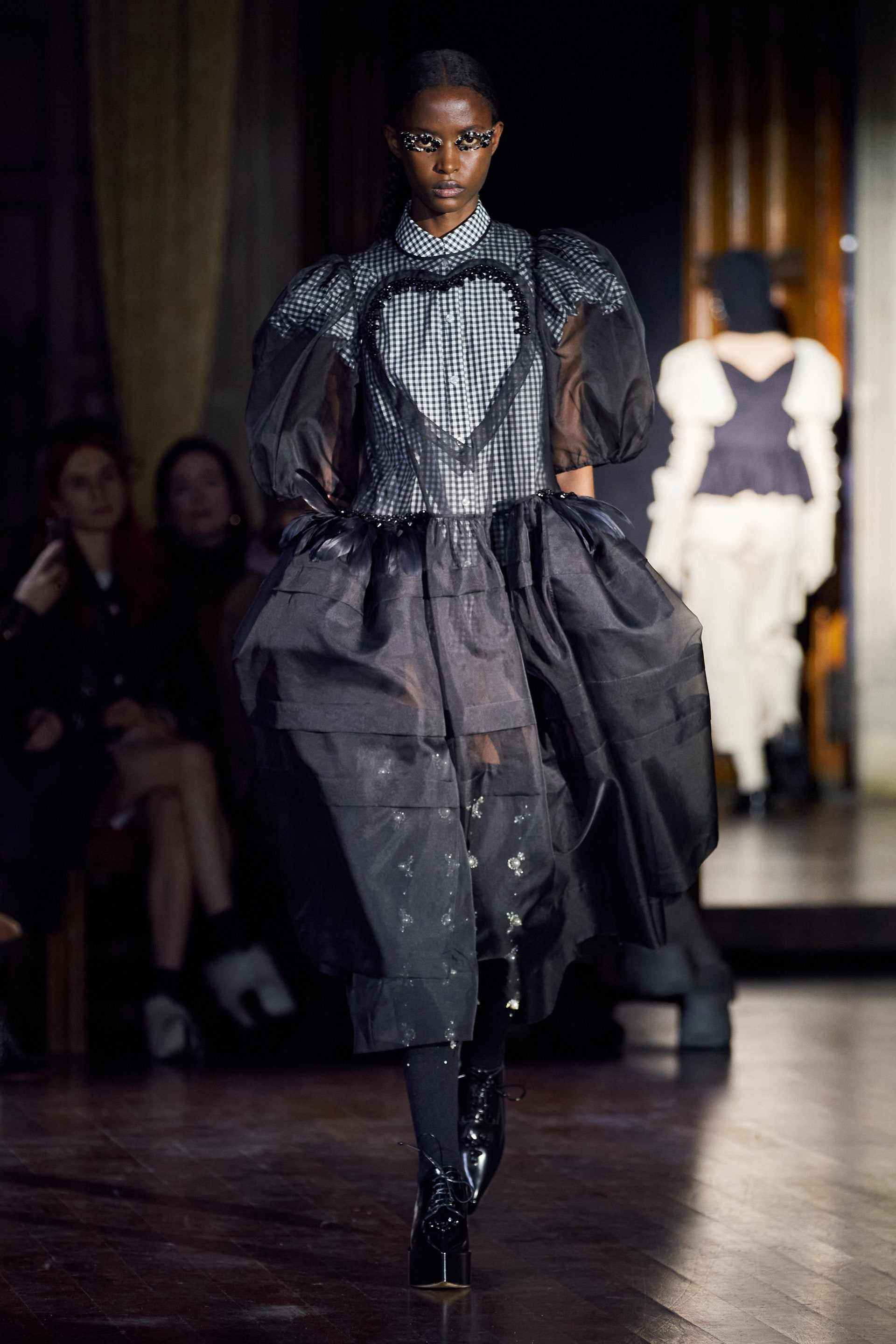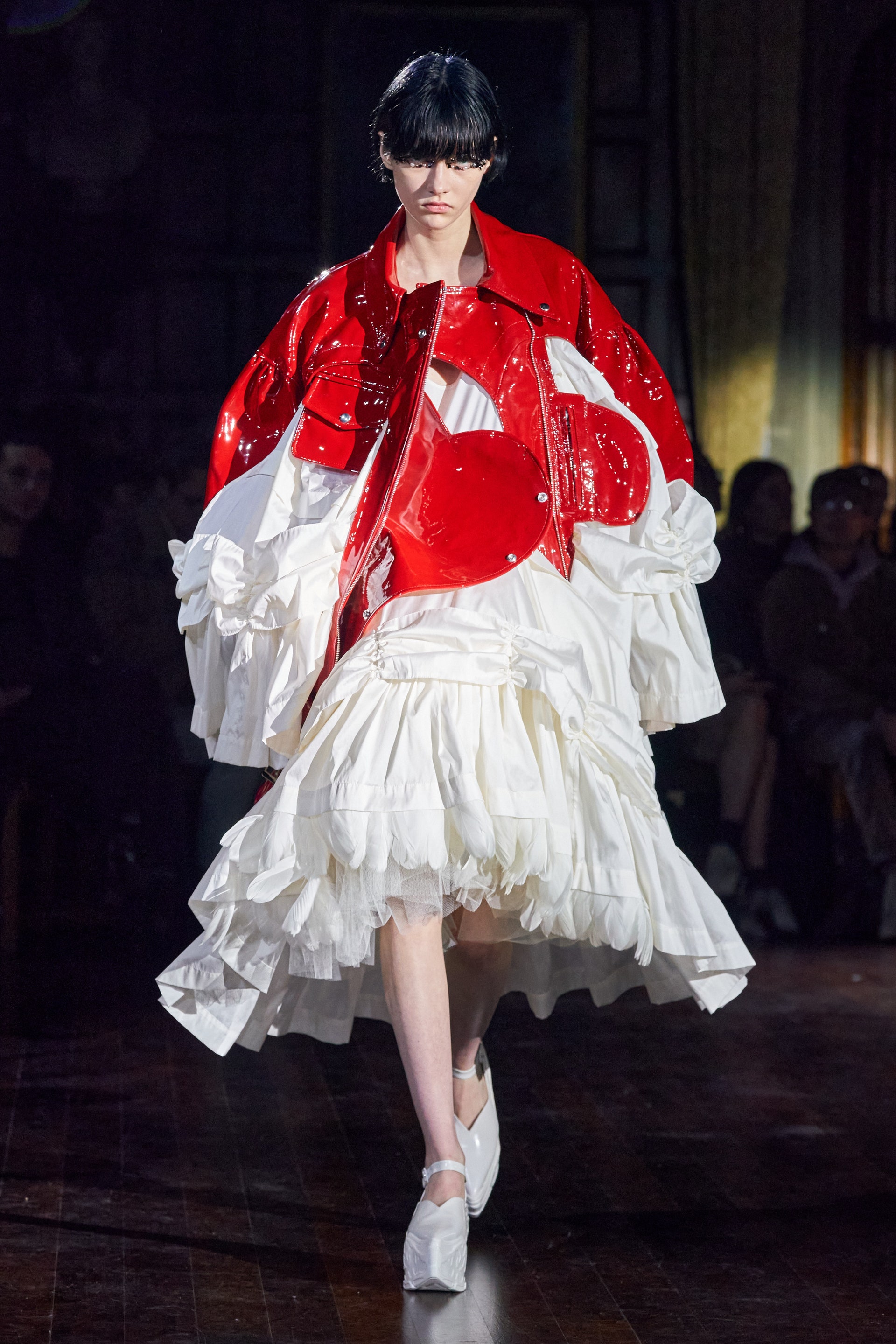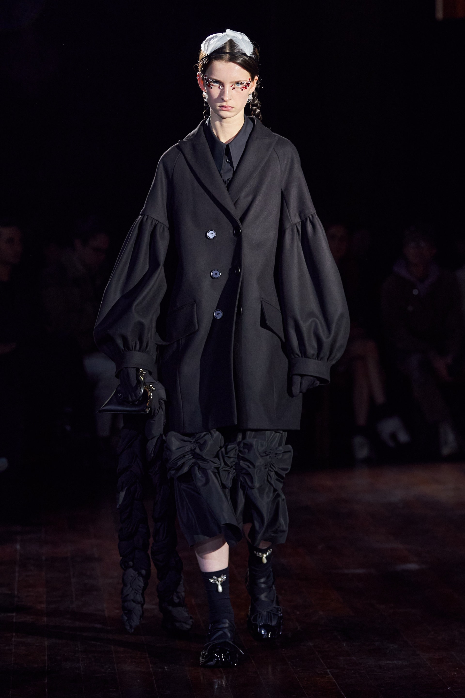 Немного тревожные (как и всегда в случае с Simone Rocha), полные романтического мистицизма образы на показе включали в себя "парящие" платья и юбки на кринолинах, вязаные капоры, стеганую верхнюю одежду и вязаные микрокардиганы. Фирменные куртки-косухи дизайнер "разъединила" в сложносоставные накидки, а объемные плащи дополнила бантами и белоснежными занавесями. Сообразно трагичному лейтмотиву фольклорного предания, наряды коллекции украшены рубиновыми капельками крови, при этом расшиты жемчугом и кристаллами, что подсвечивает царственность лебедей, в которых были превращены трое сыновей и дочь Лира.
