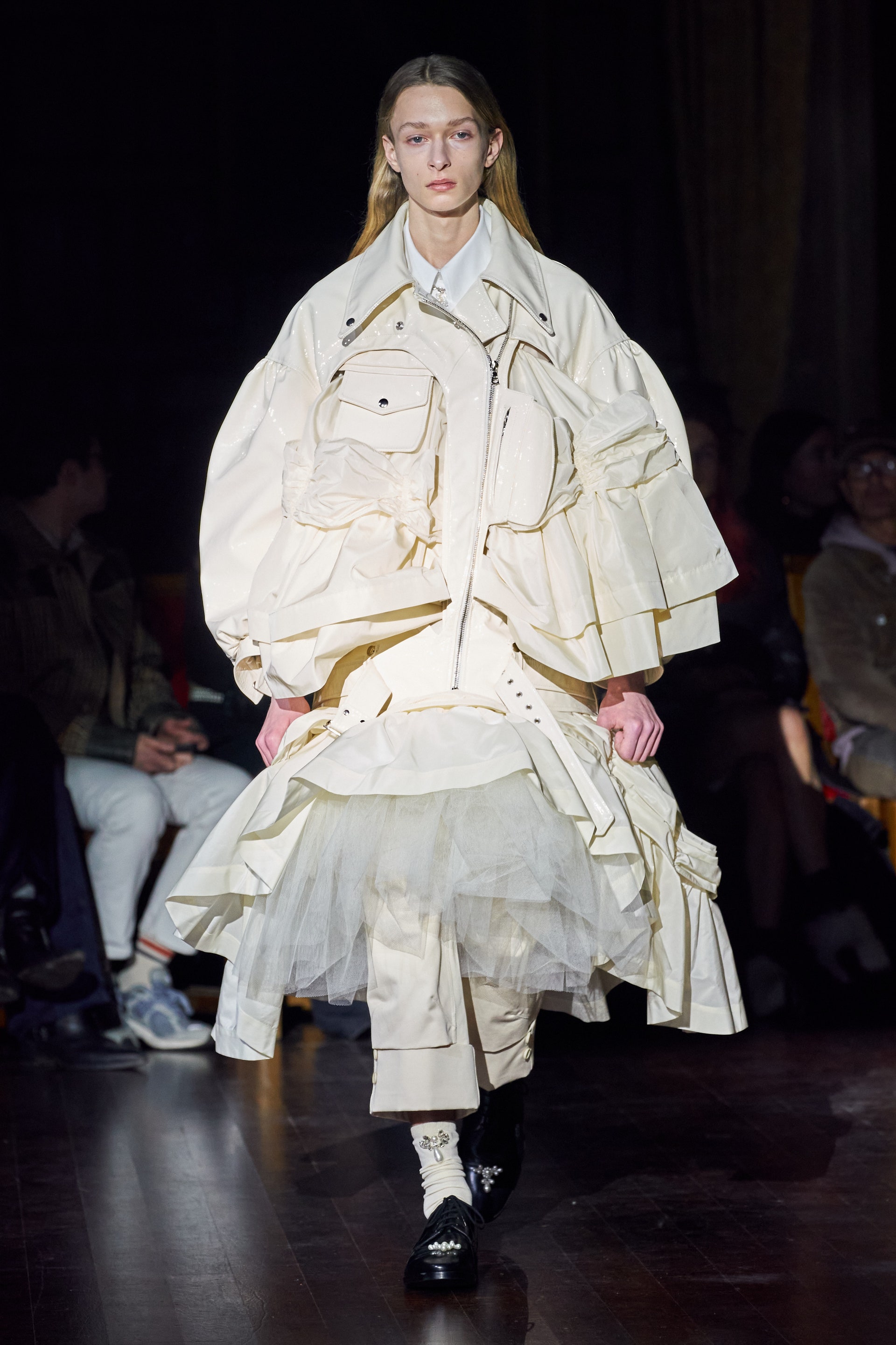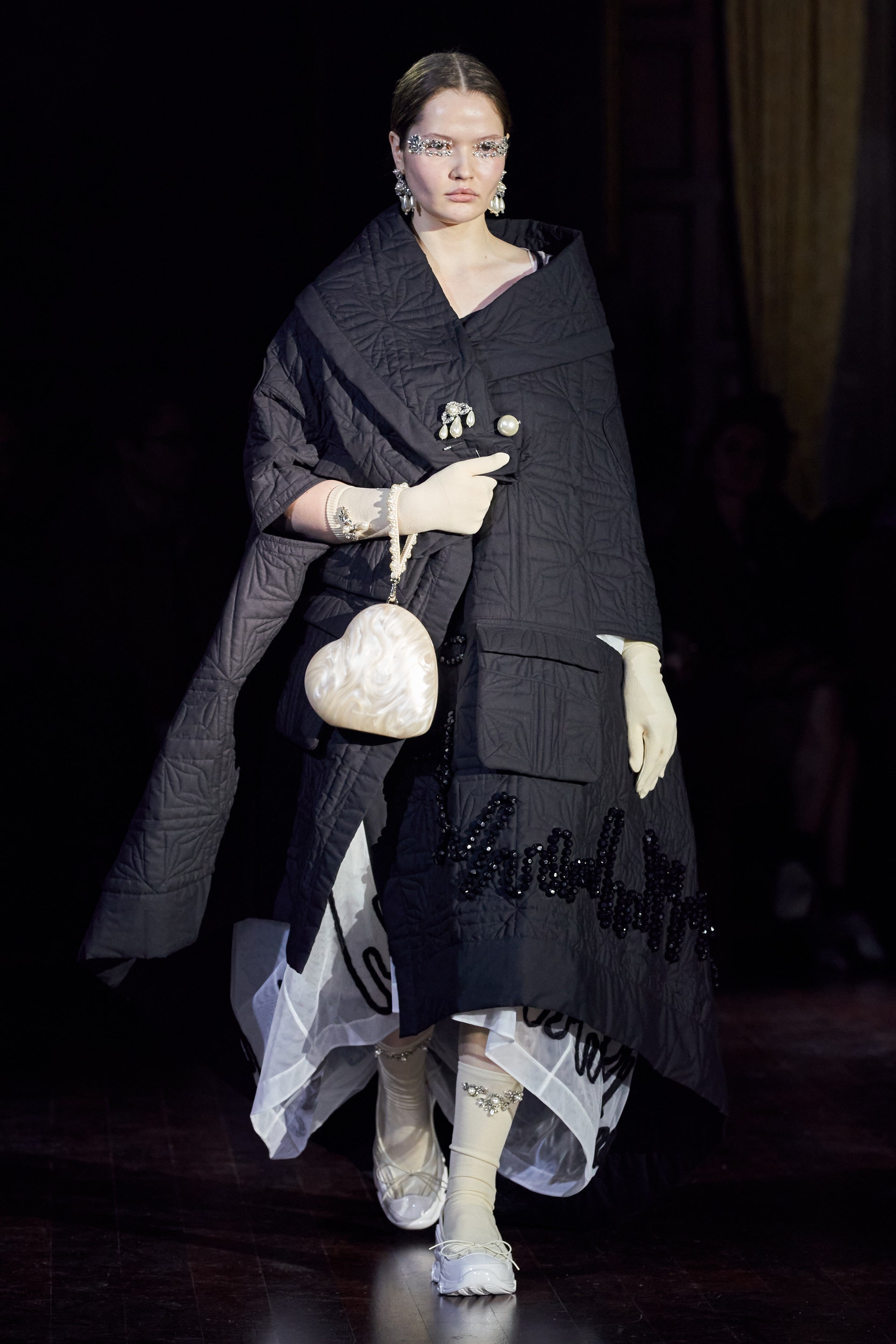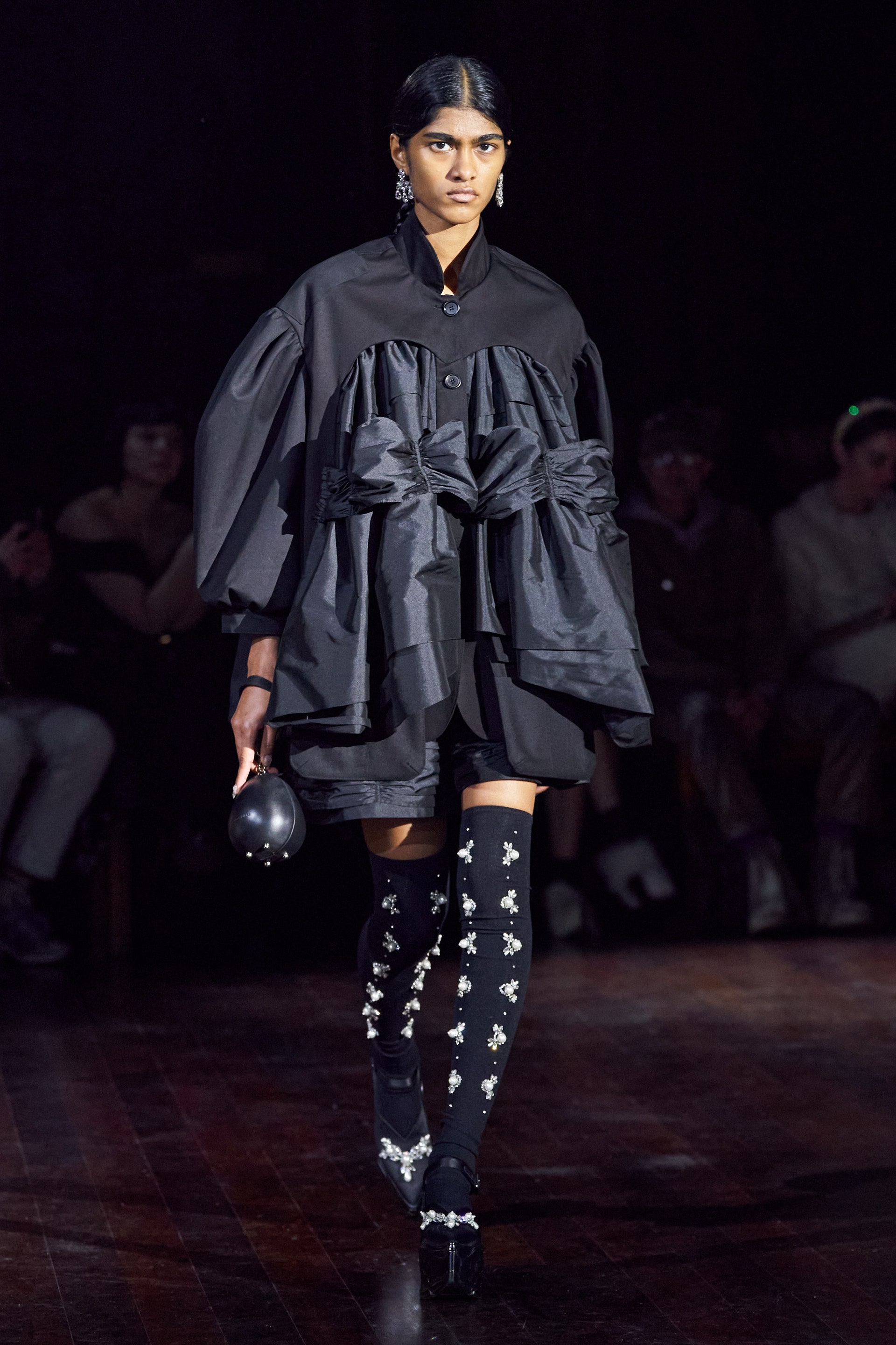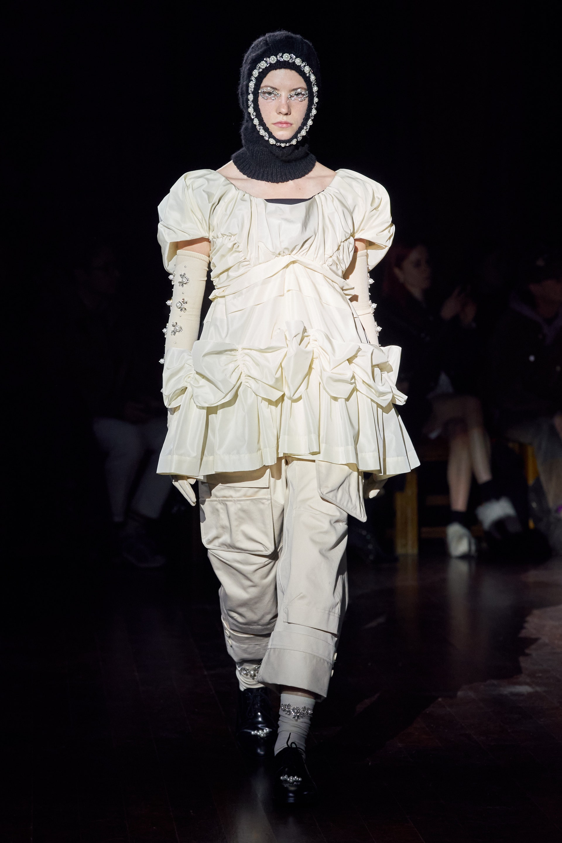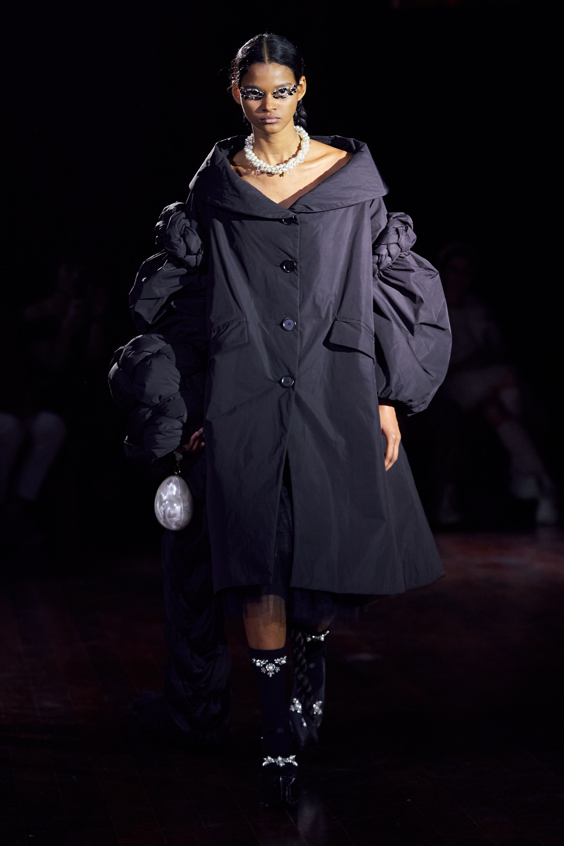 Немного тревожные (как и всегда в случае с Simone Rocha), полные романтического мистицизма образы на показе включали в себя "парящие" платья и юбки на кринолинах, вязаные капоры, стеганую верхнюю одежду и вязаные микрокардиганы. Фирменные куртки-косухи дизайнер "разъединила" в сложносоставные накидки, а объемные плащи дополнила бантами и белоснежными занавесями. Сообразно трагичному лейтмотиву фольклорного предания, наряды коллекции украшены рубиновыми капельками крови, при этом расшиты жемчугом и кристаллами, что подсвечивает царственность лебедей, в которых были превращены трое сыновей и дочь Лира.