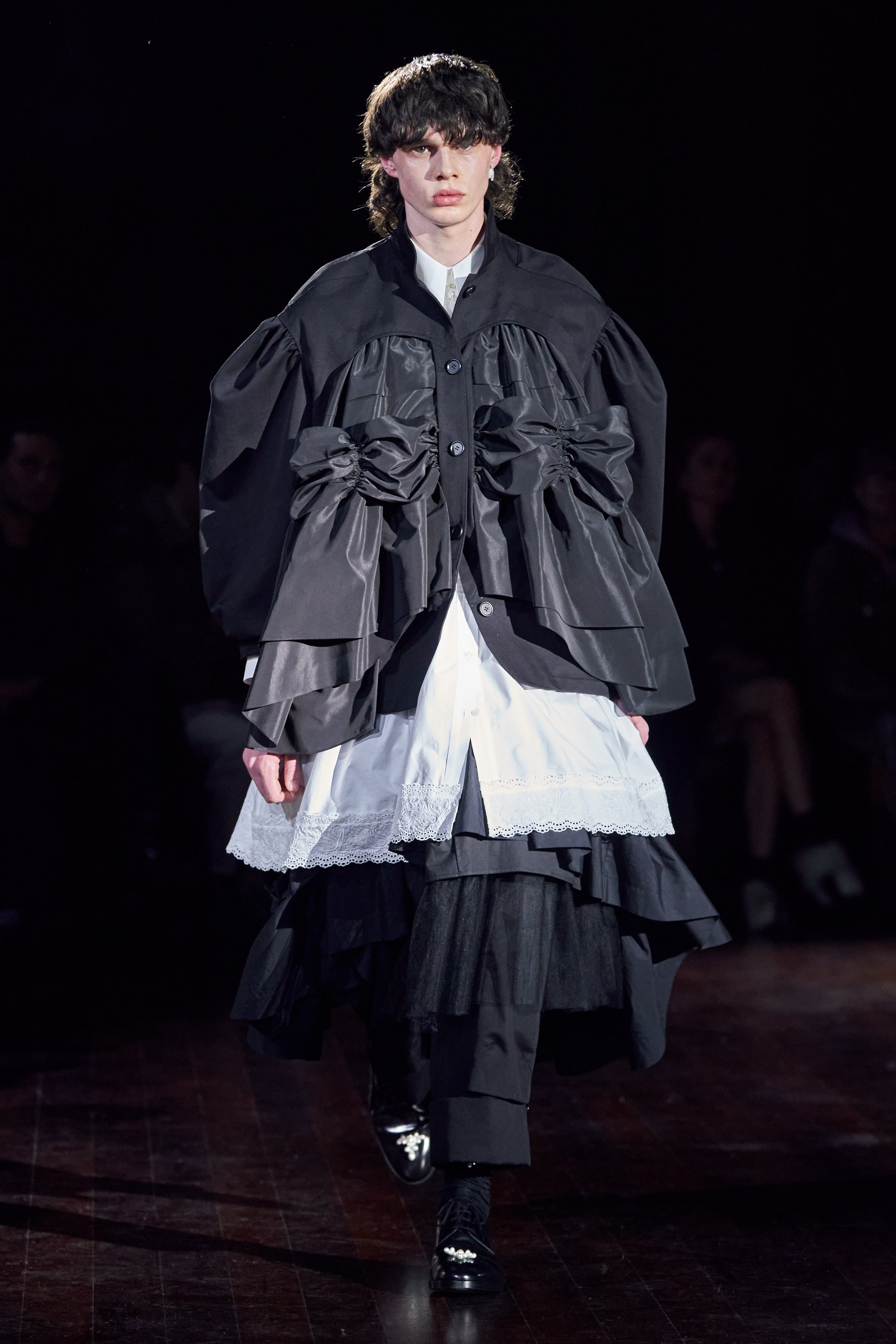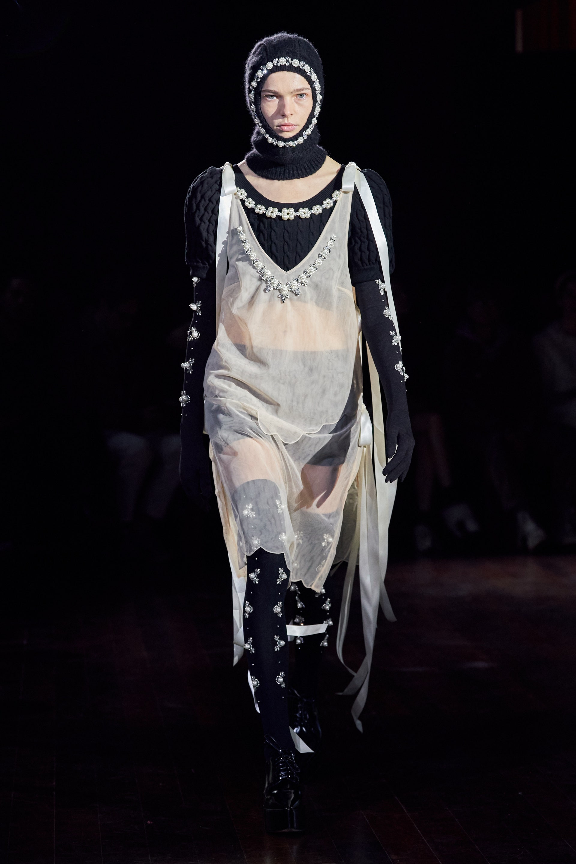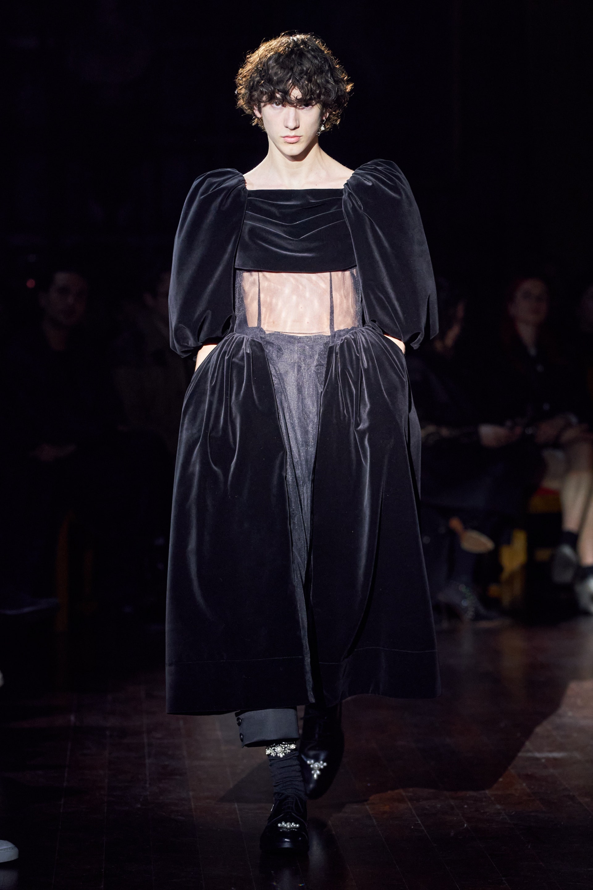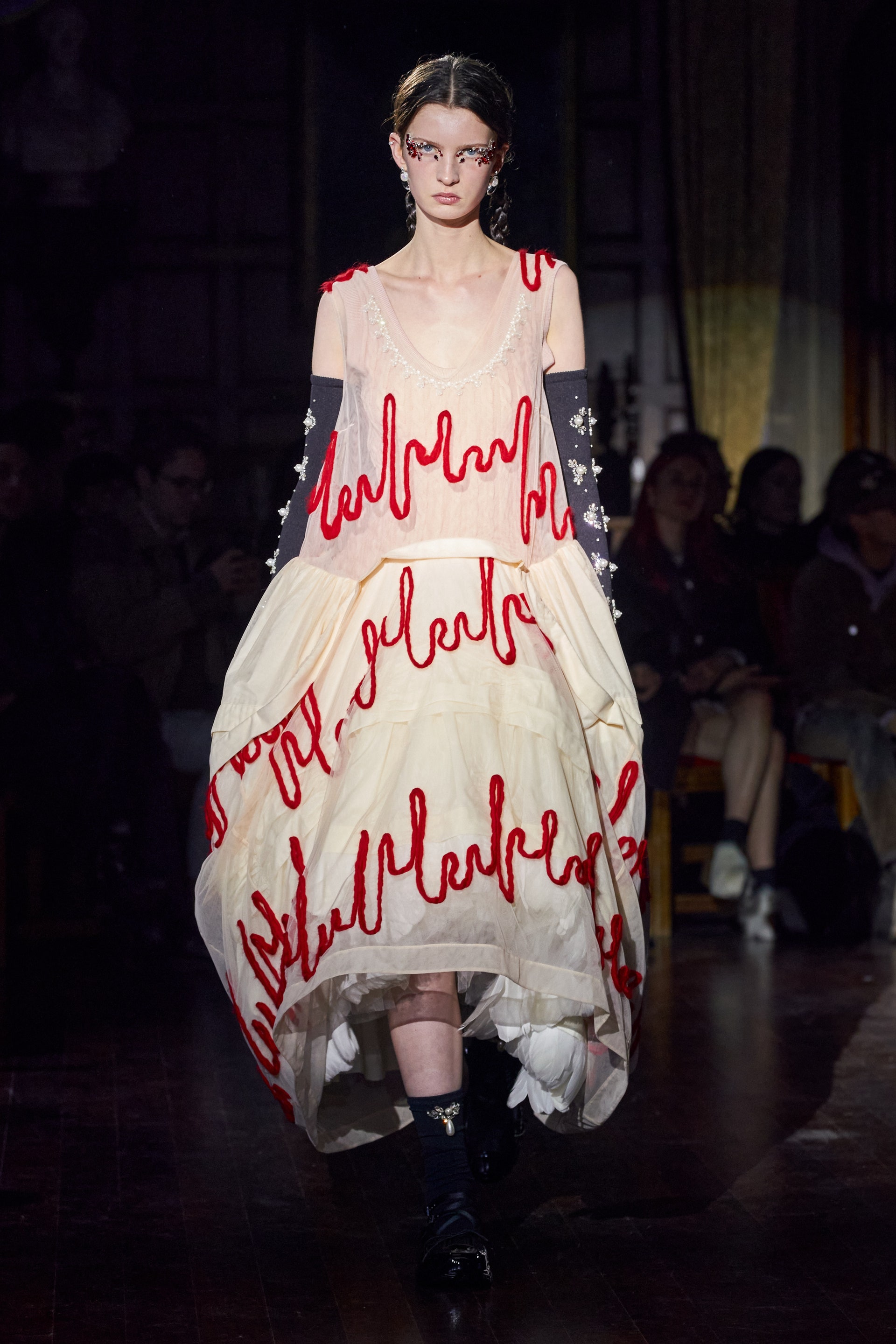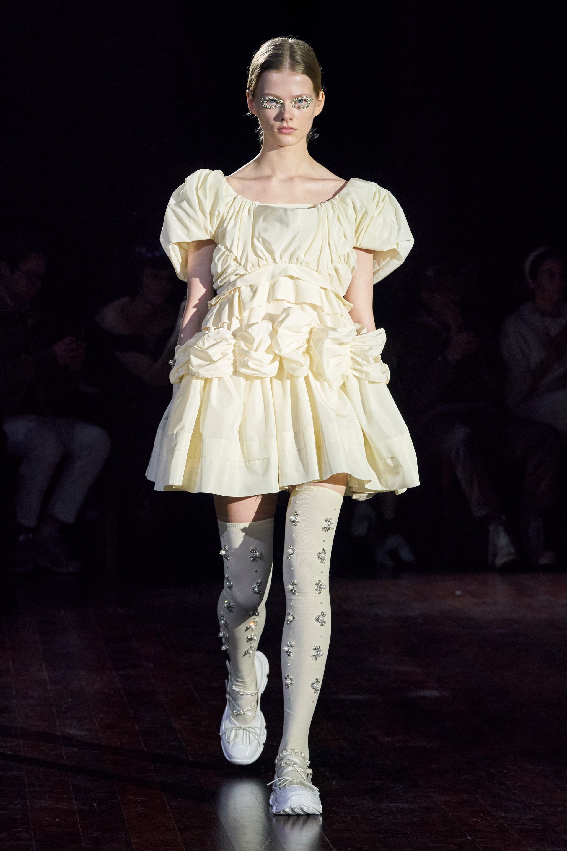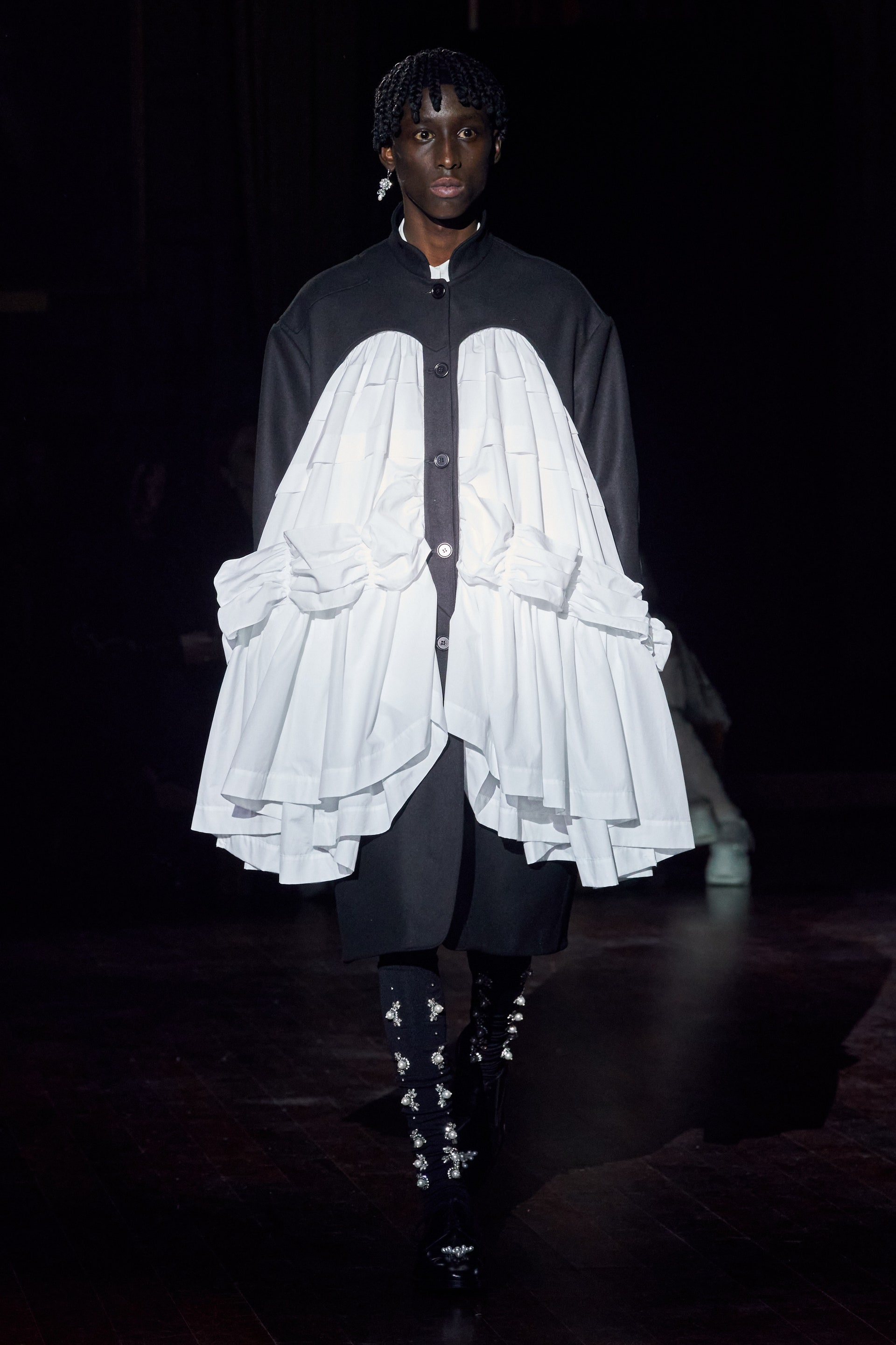 Немного тревожные (как и всегда в случае с Simone Rocha), полные романтического мистицизма образы на показе включали в себя "парящие" платья и юбки на кринолинах, вязаные капоры, стеганую верхнюю одежду и вязаные микрокардиганы. Фирменные куртки-косухи дизайнер "разъединила" в сложносоставные накидки, а объемные плащи дополнила бантами и белоснежными занавесями. Сообразно трагичному лейтмотиву фольклорного предания, наряды коллекции украшены рубиновыми капельками крови, при этом расшиты жемчугом и кристаллами, что подсвечивает царственность лебедей, в которых были превращены трое сыновей и дочь Лира.