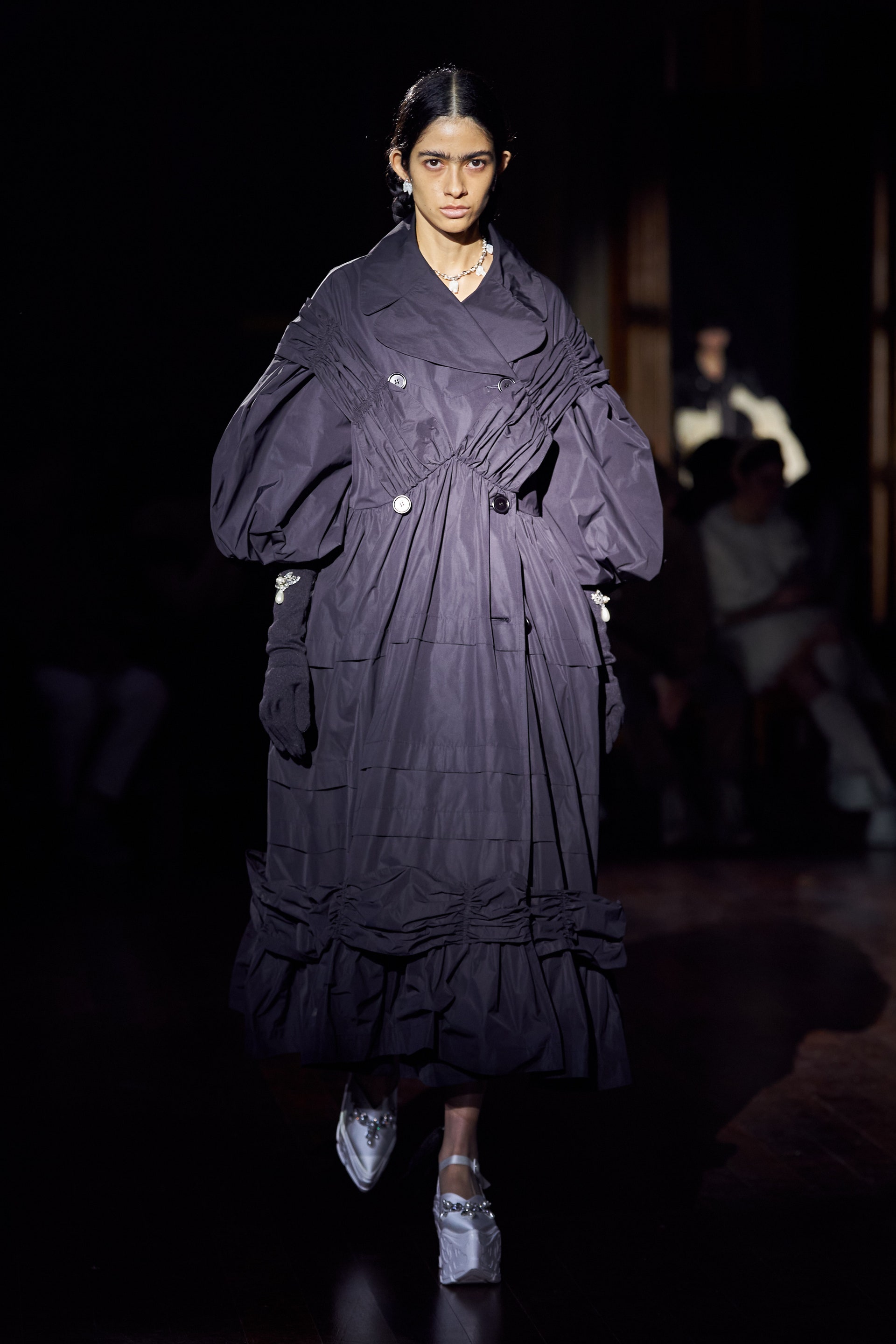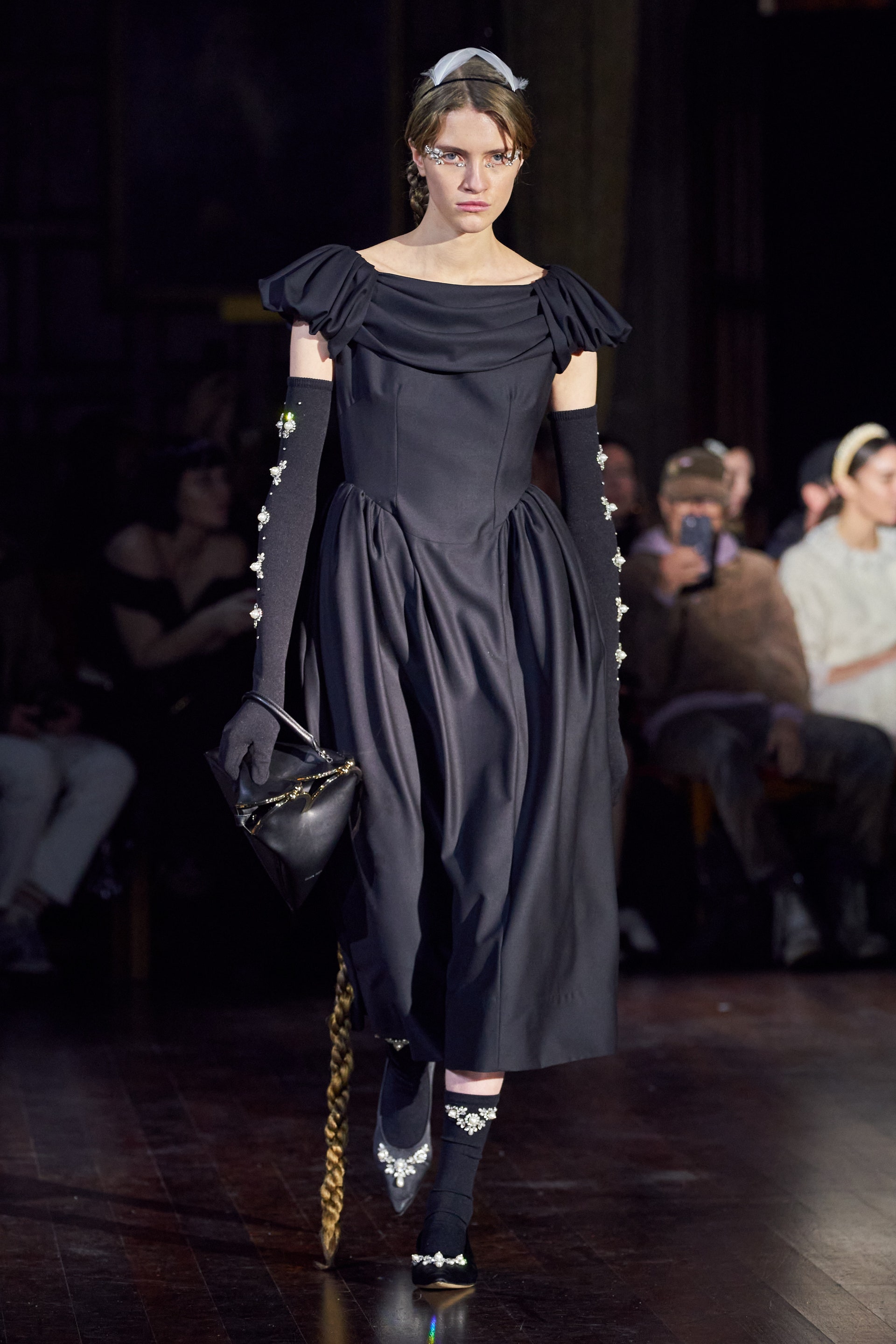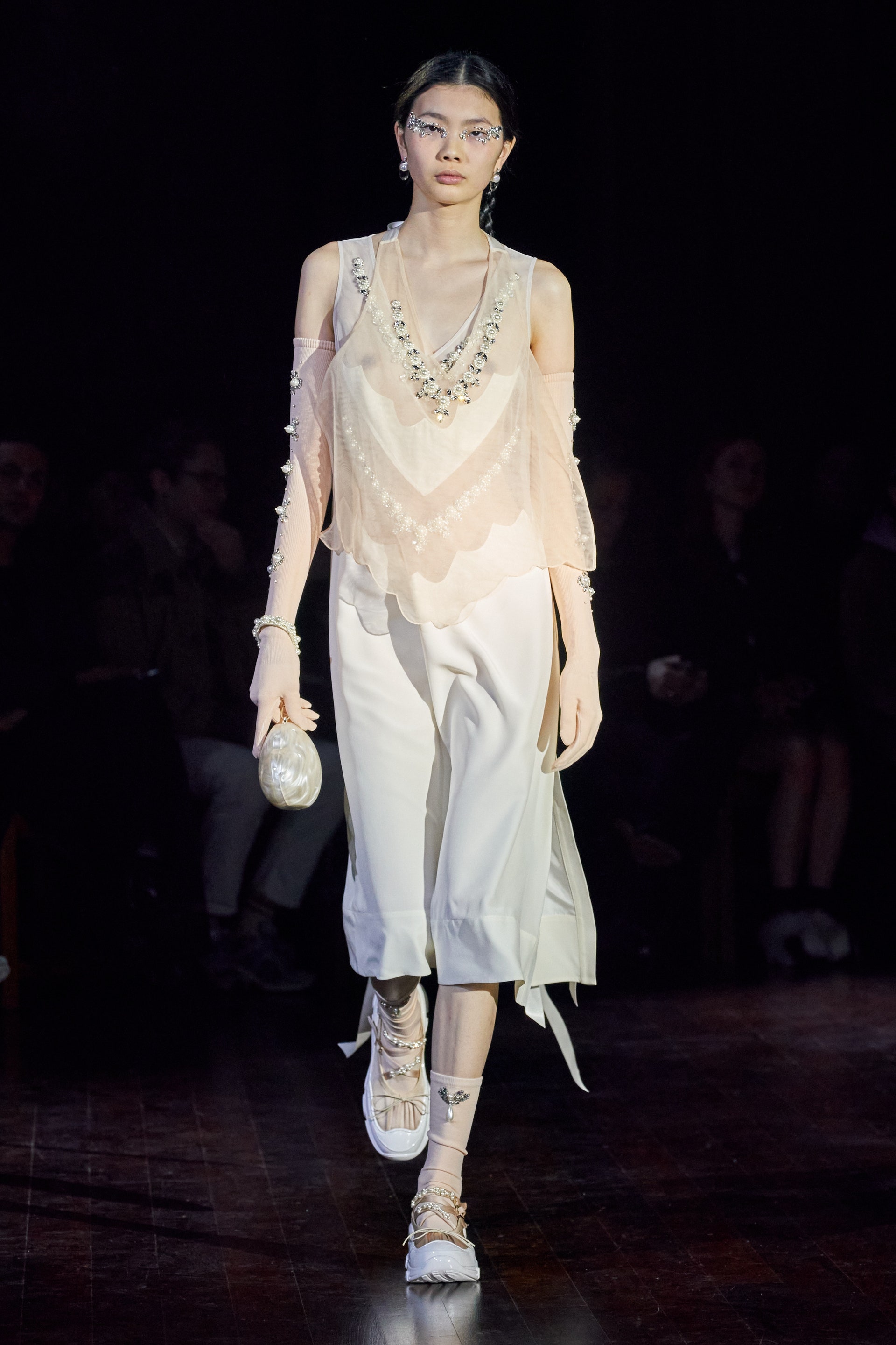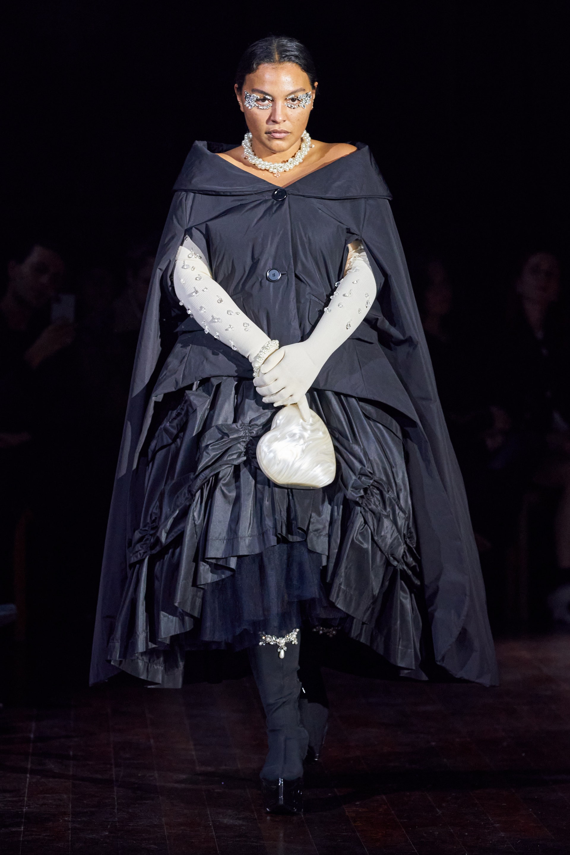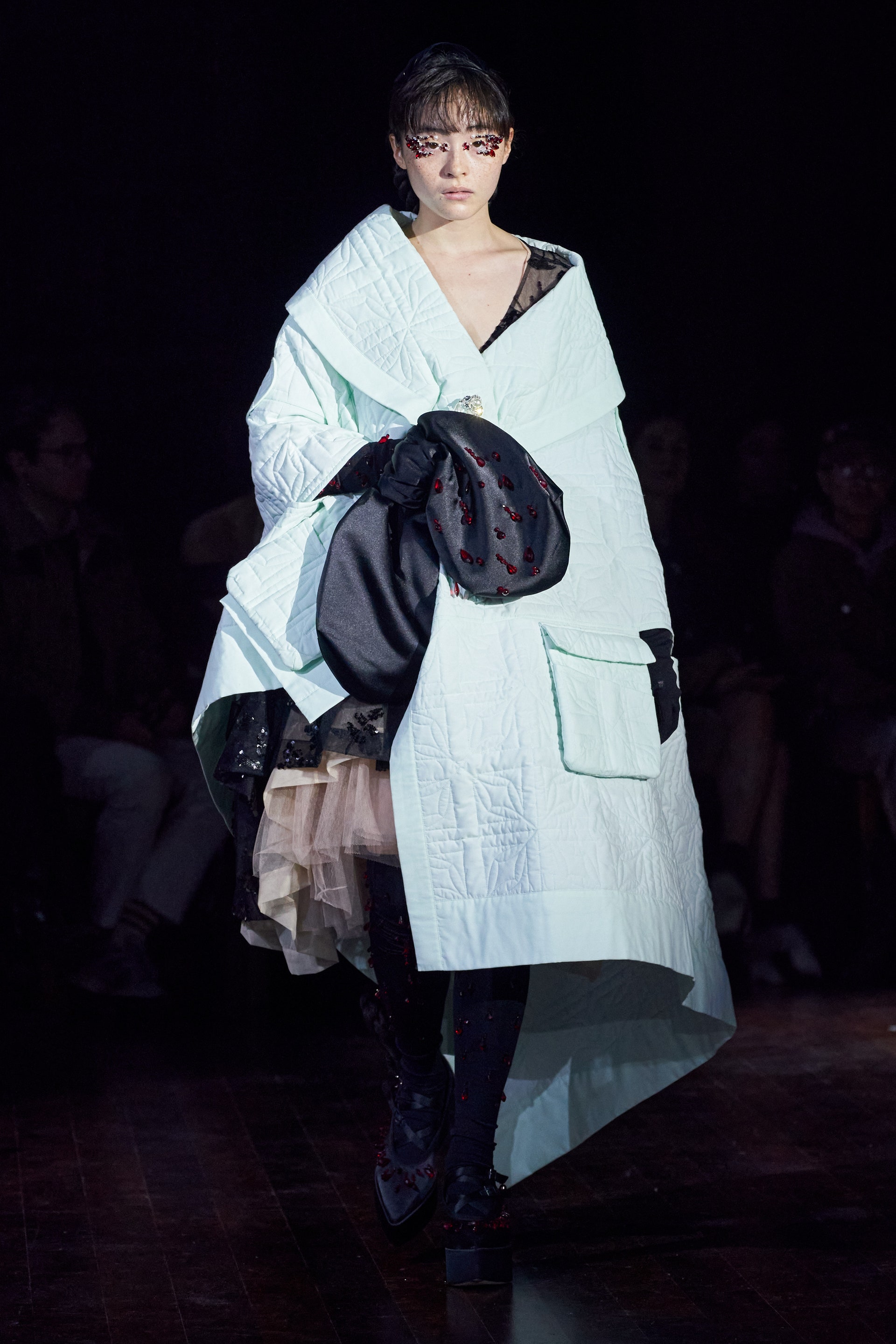 Немного тревожные (как и всегда в случае с Simone Rocha), полные романтического мистицизма образы на показе включали в себя "парящие" платья и юбки на кринолинах, вязаные капоры, стеганую верхнюю одежду и вязаные микрокардиганы. Фирменные куртки-косухи дизайнер "разъединила" в сложносоставные накидки, а объемные плащи дополнила бантами и белоснежными занавесями. Сообразно трагичному лейтмотиву фольклорного предания, наряды коллекции украшены рубиновыми капельками крови, при этом расшиты жемчугом и кристаллами, что подсвечивает царственность лебедей, в которых были превращены трое сыновей и дочь Лира.