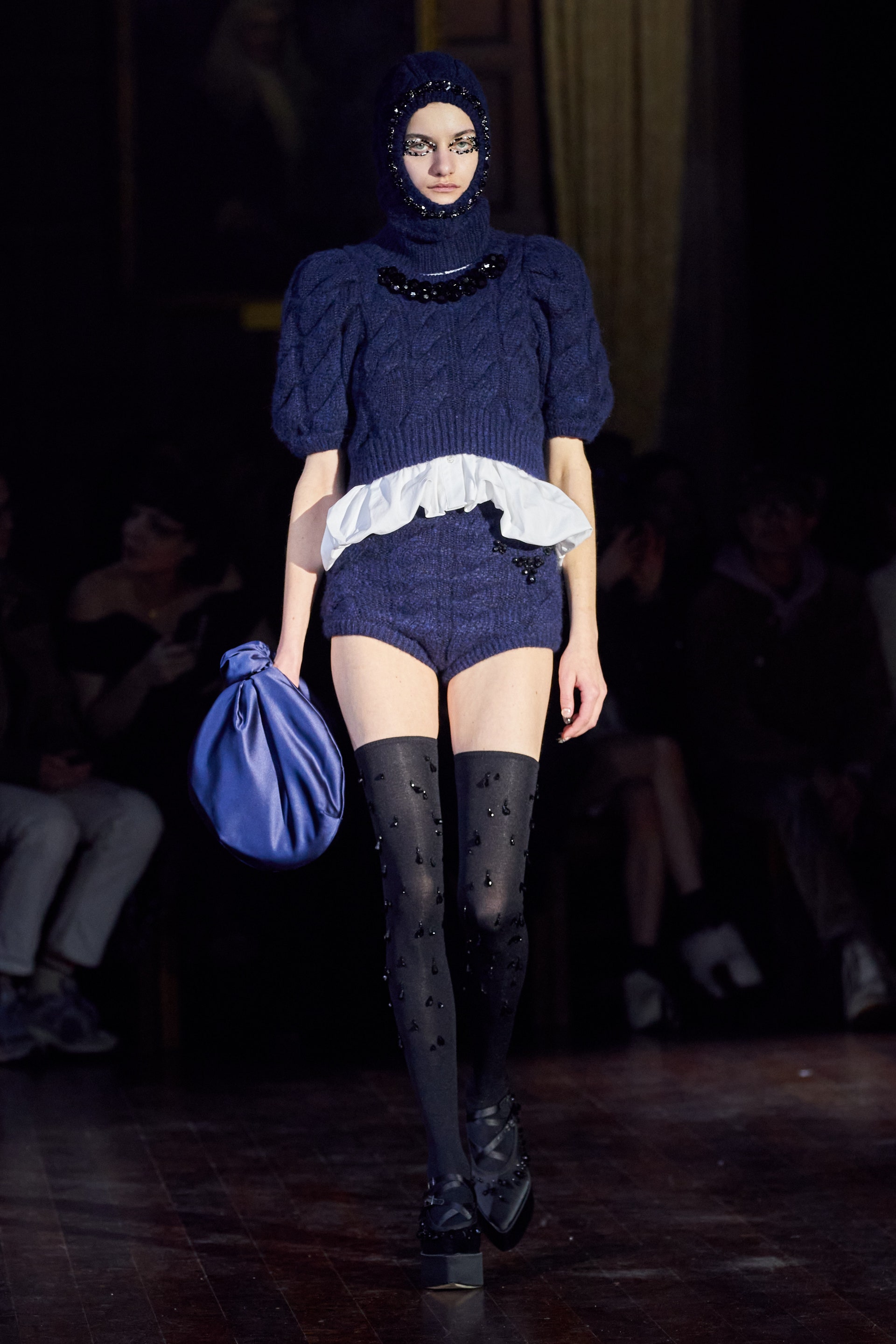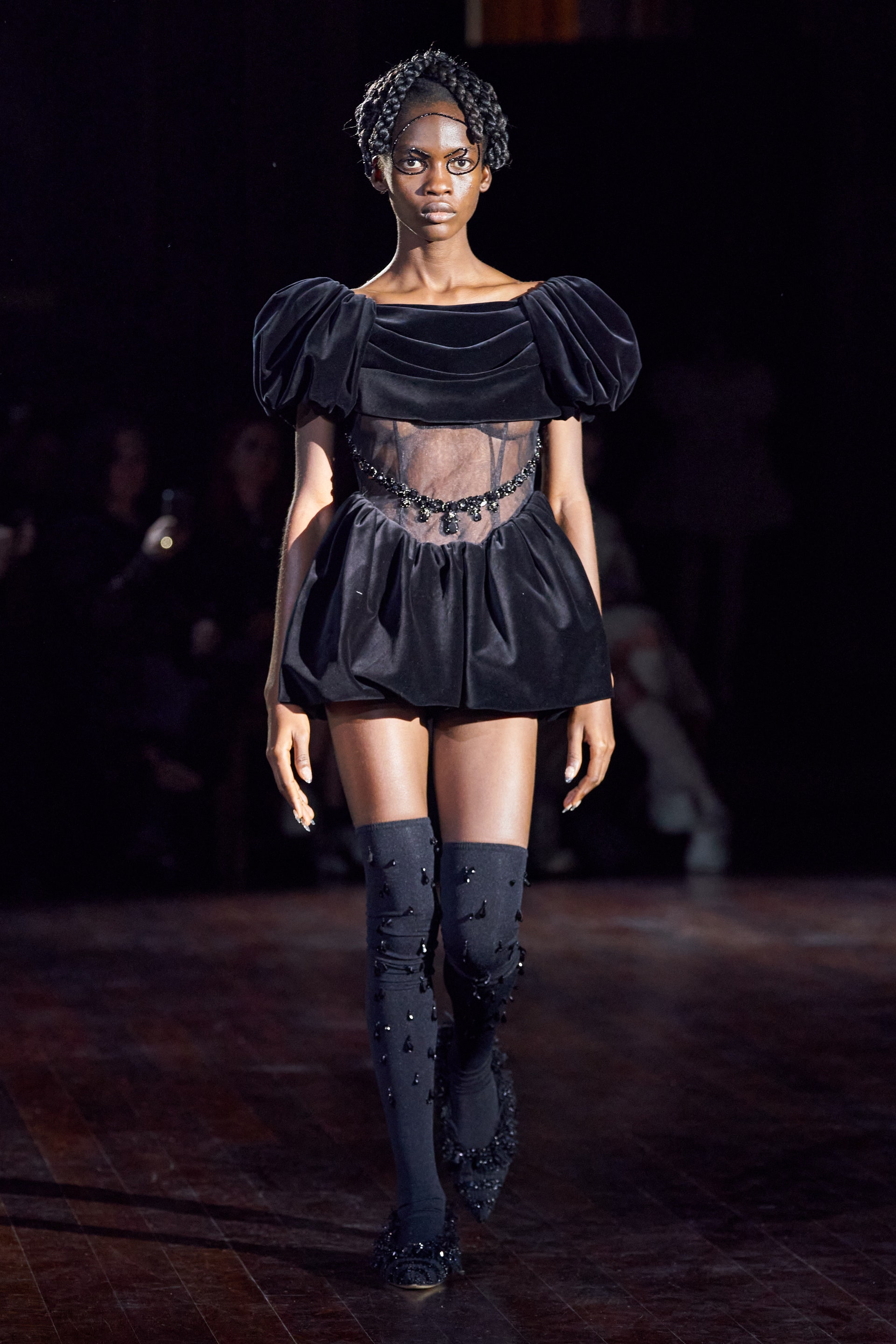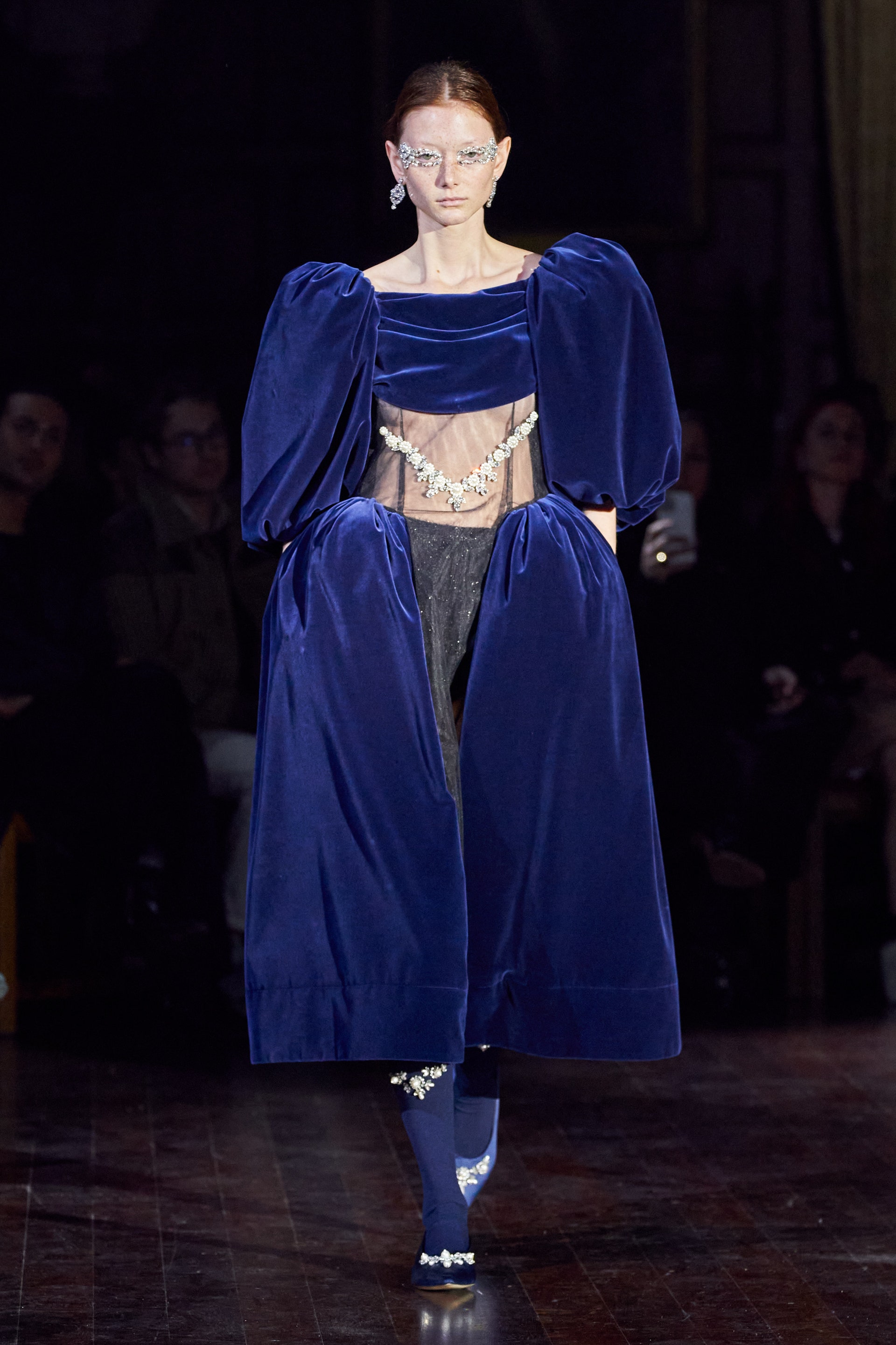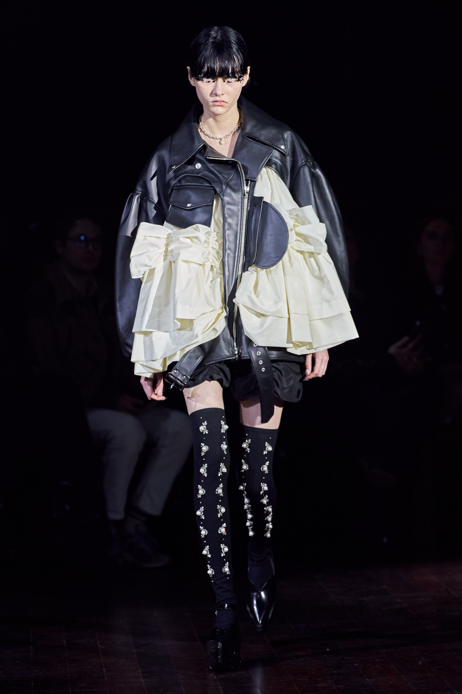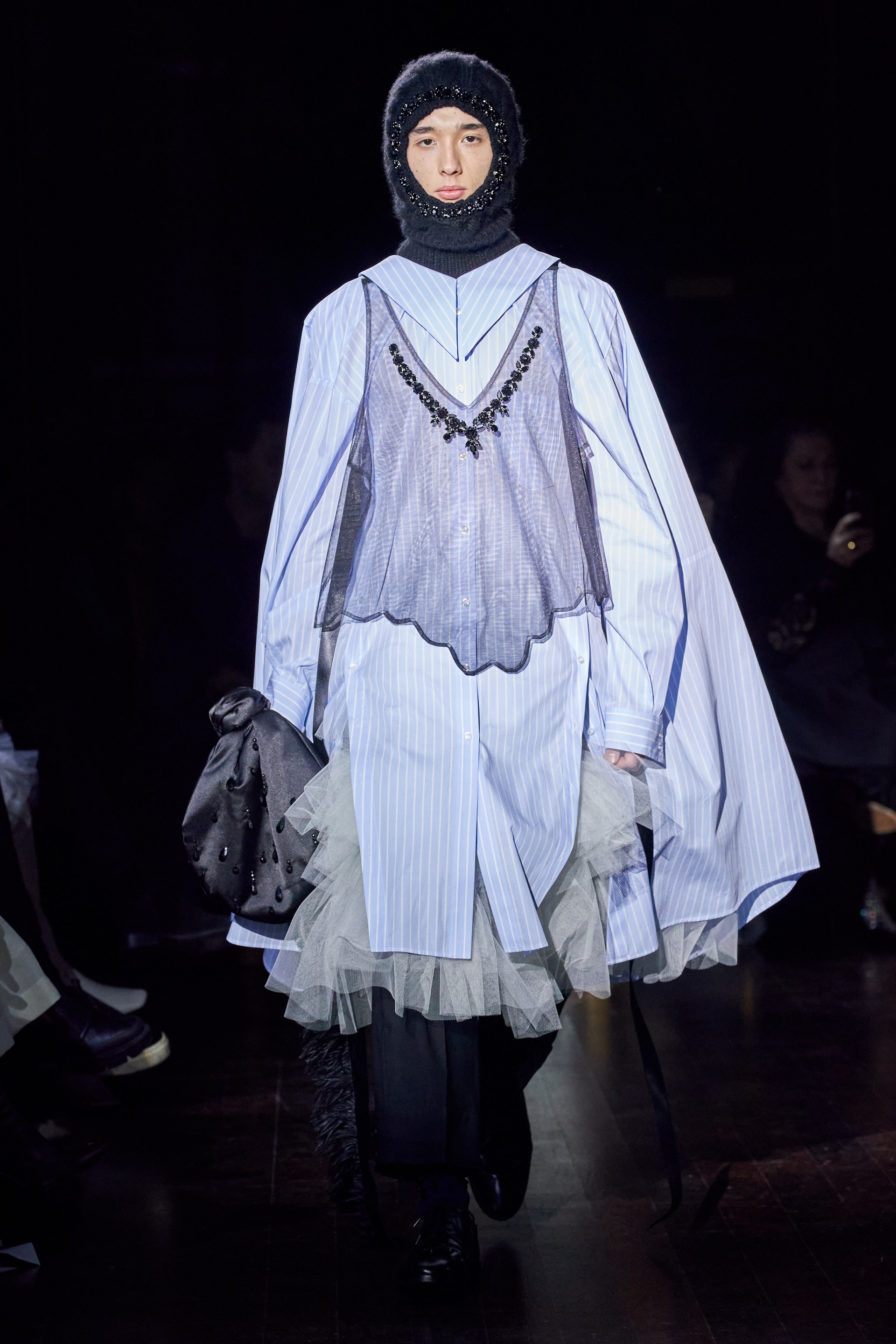 Немного тревожные (как и всегда в случае с Simone Rocha), полные романтического мистицизма образы на показе включали в себя "парящие" платья и юбки на кринолинах, вязаные капоры, стеганую верхнюю одежду и вязаные микрокардиганы. Фирменные куртки-косухи дизайнер "разъединила" в сложносоставные накидки, а объемные плащи дополнила бантами и белоснежными занавесями. Сообразно трагичному лейтмотиву фольклорного предания, наряды коллекции украшены рубиновыми капельками крови, при этом расшиты жемчугом и кристаллами, что подсвечивает царственность лебедей, в которых были превращены трое сыновей и дочь Лира.