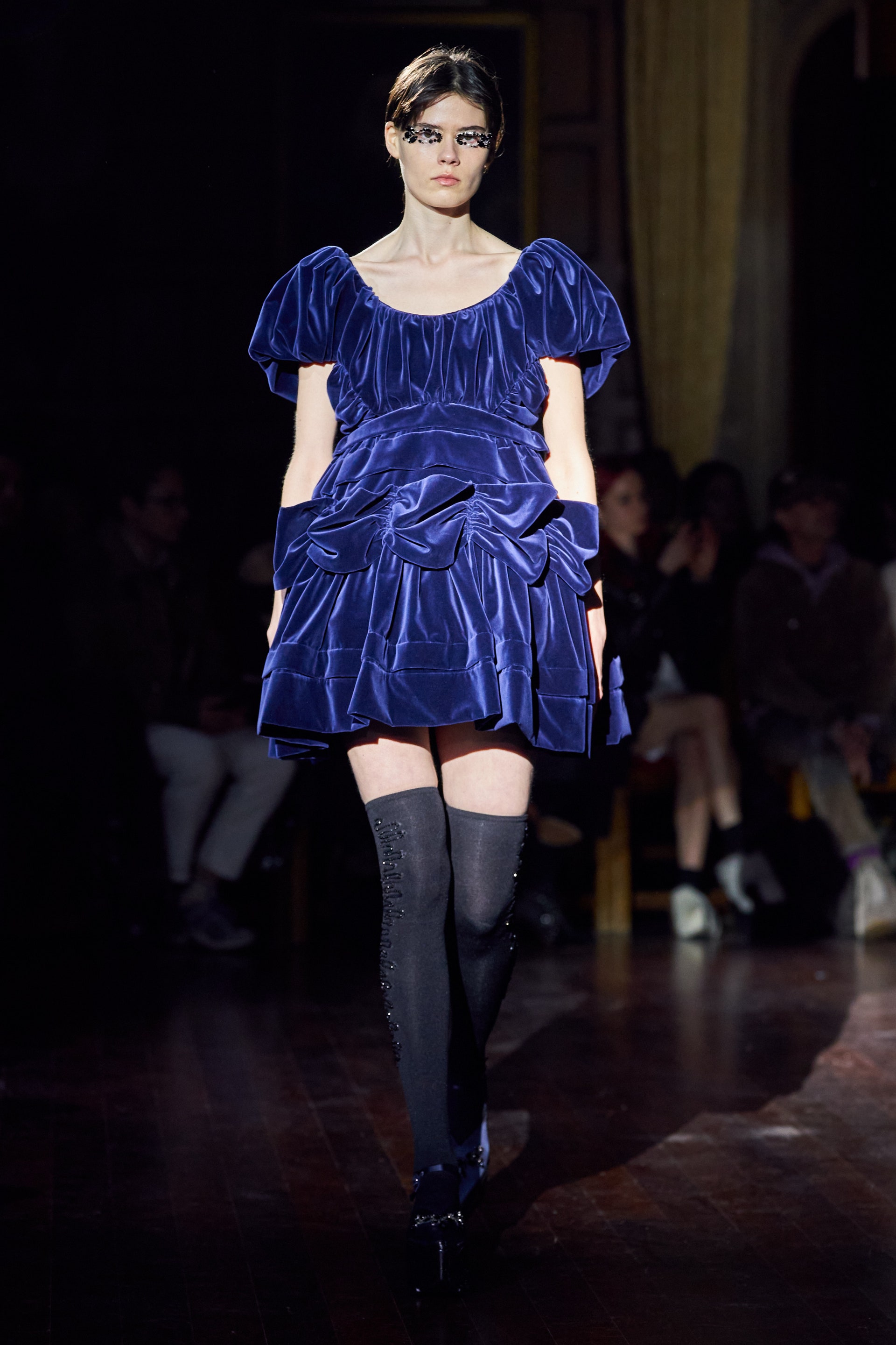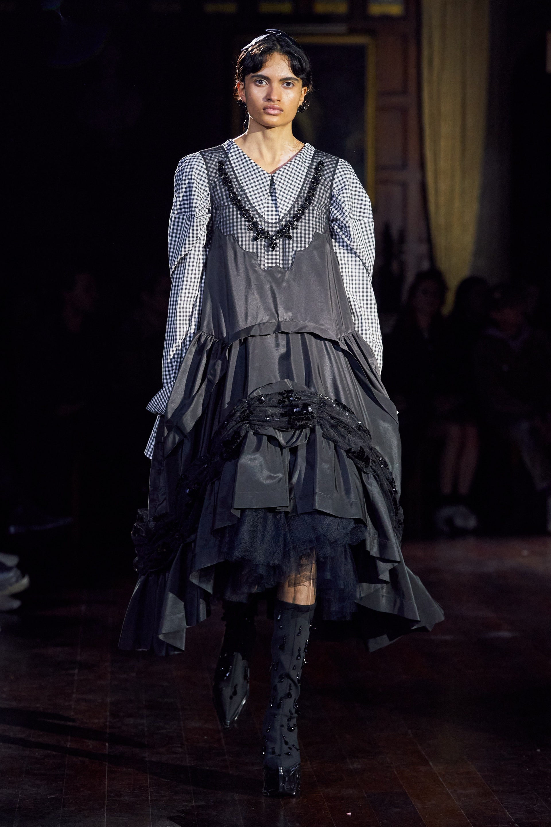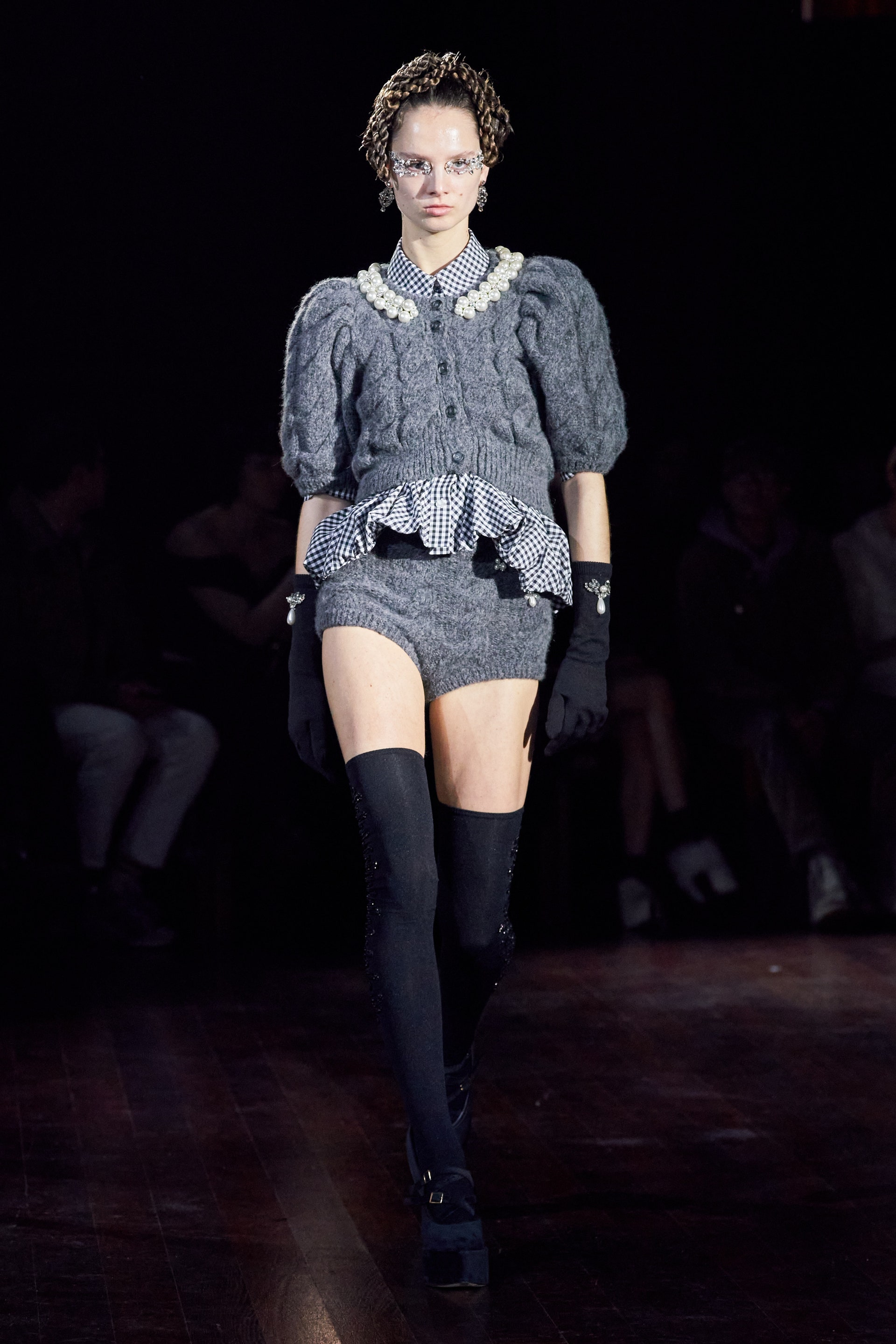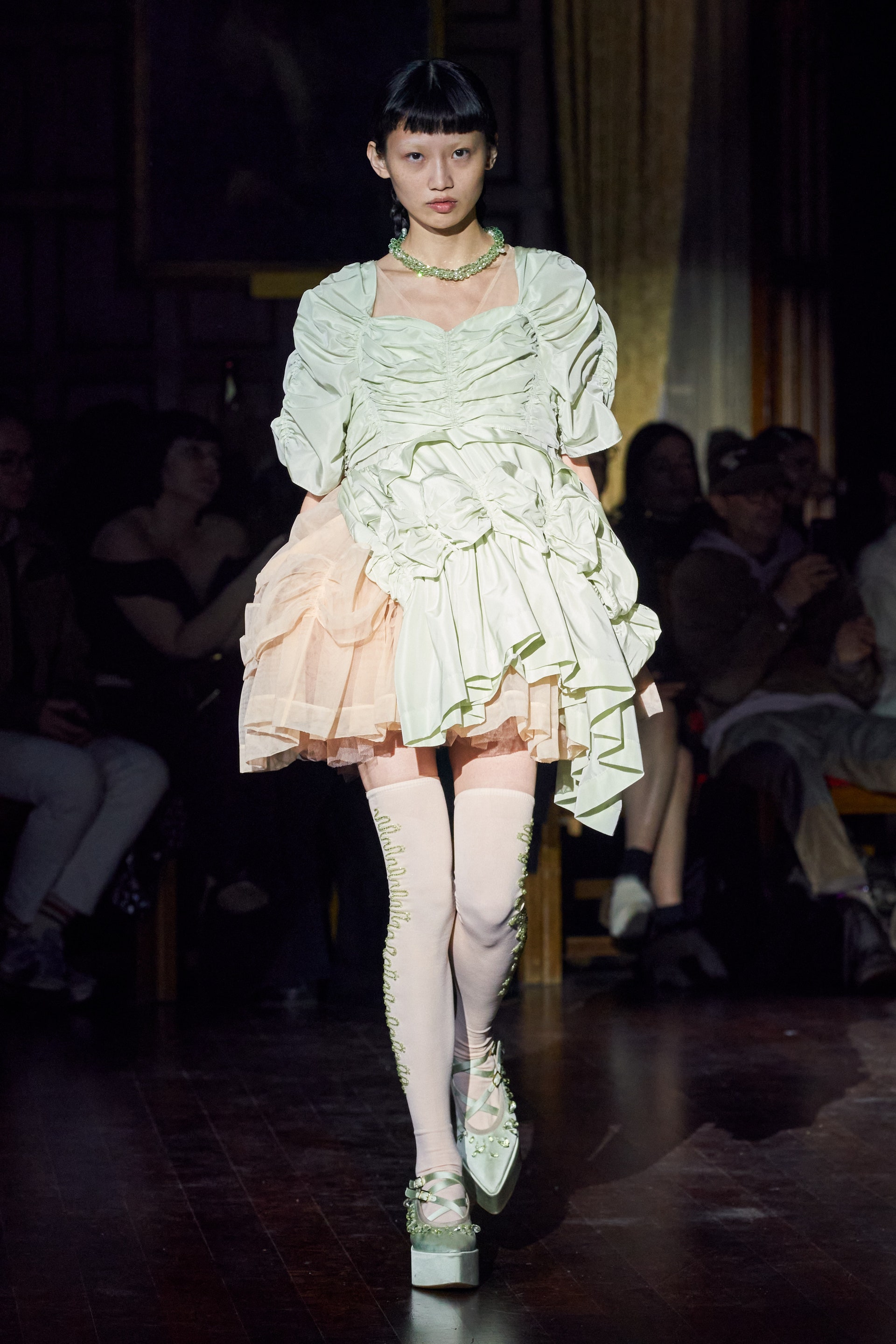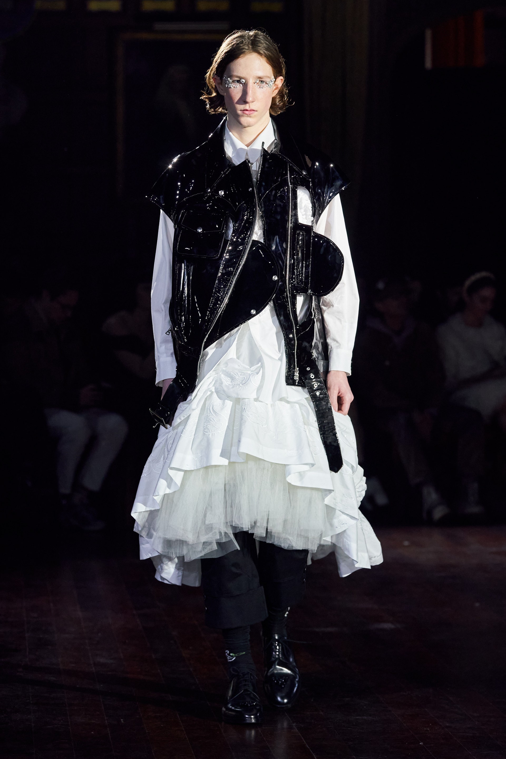 Немного тревожные (как и всегда в случае с Simone Rocha), полные романтического мистицизма образы на показе включали в себя "парящие" платья и юбки на кринолинах, вязаные капоры, стеганую верхнюю одежду и вязаные микрокардиганы. Фирменные куртки-косухи дизайнер "разъединила" в сложносоставные накидки, а объемные плащи дополнила бантами и белоснежными занавесями. Сообразно трагичному лейтмотиву фольклорного предания, наряды коллекции украшены рубиновыми капельками крови, при этом расшиты жемчугом и кристаллами, что подсвечивает царственность лебедей, в которых были превращены трое сыновей и дочь Лира.