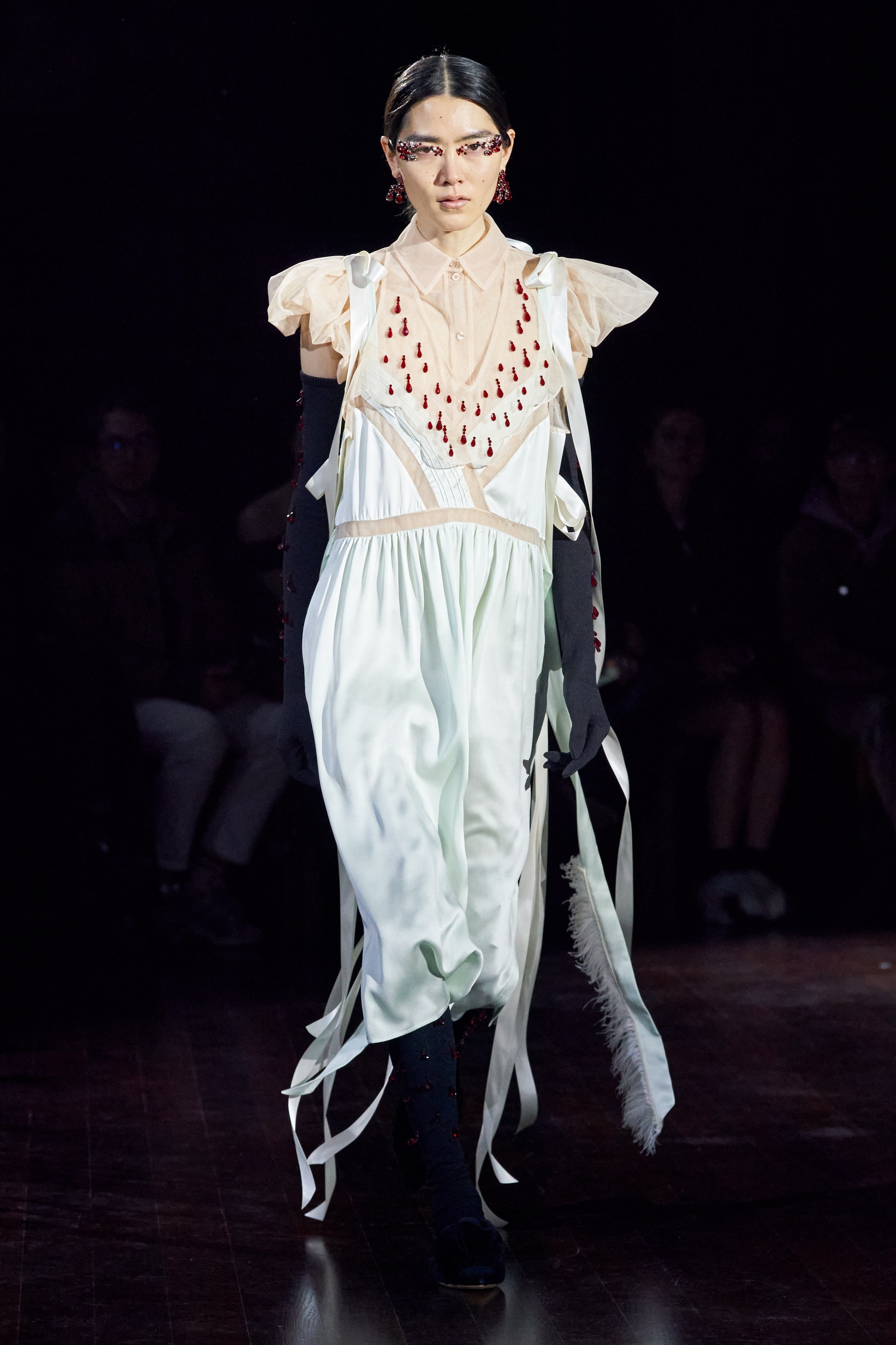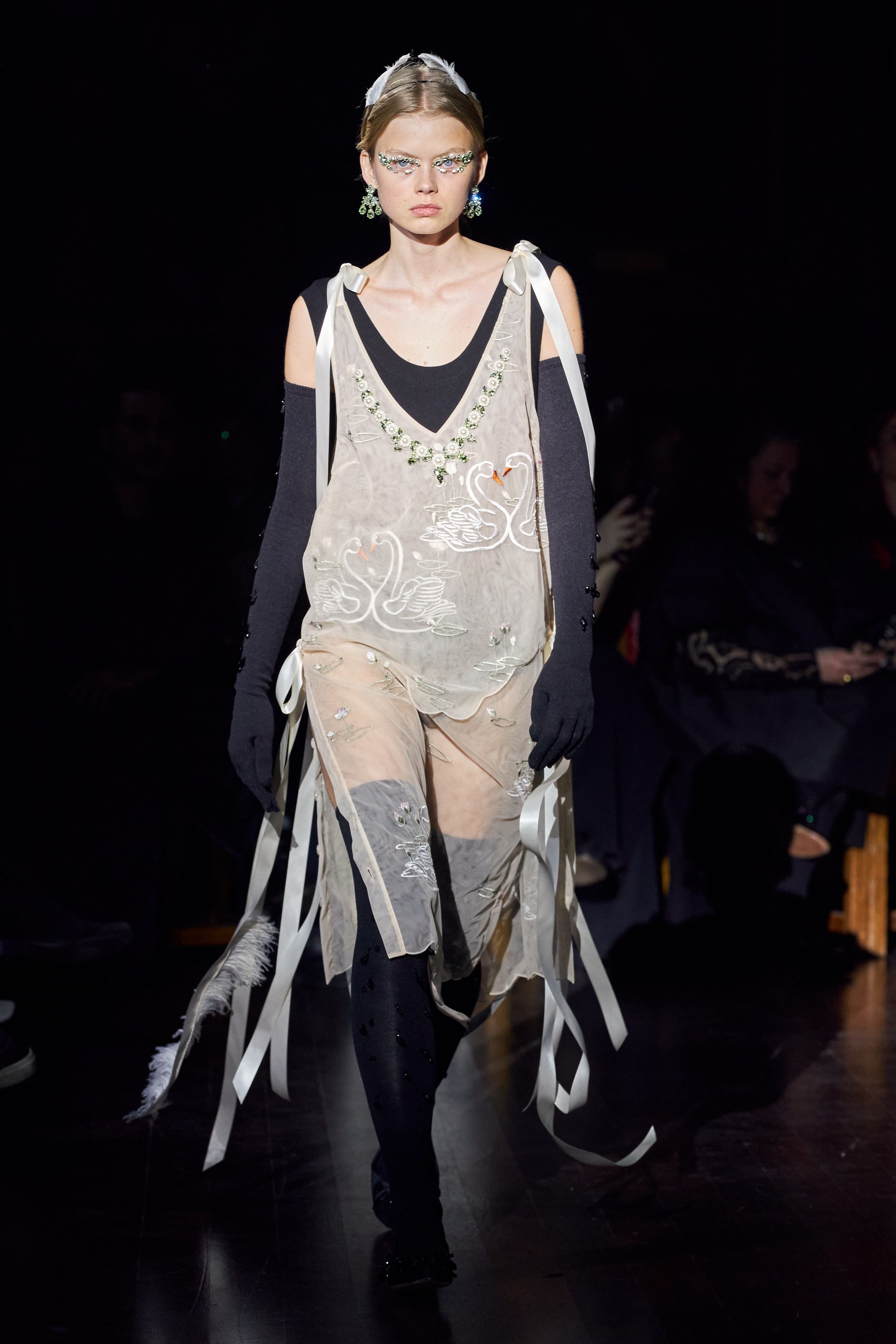 Ирландский фольклор является неизменным источником вдохновения для Симон Роша, и новый сезон не стал исключением из правил. Осеннюю коллекцию дизайнер посвятила сказке "Дети Лира". Рассматривая молочно-белые слоистые наряды со множеством лент и рюшей, можно заметить перья. Согласно легенде, злая мачеха превратила четверых детей Лира в лебедей. Изящные и печальные птицы были изображены на прозрачных туниках и платьях из органзы, и даже скульптурные объемы фирменных викторианских парок и курток напоминали лебединые очертания.