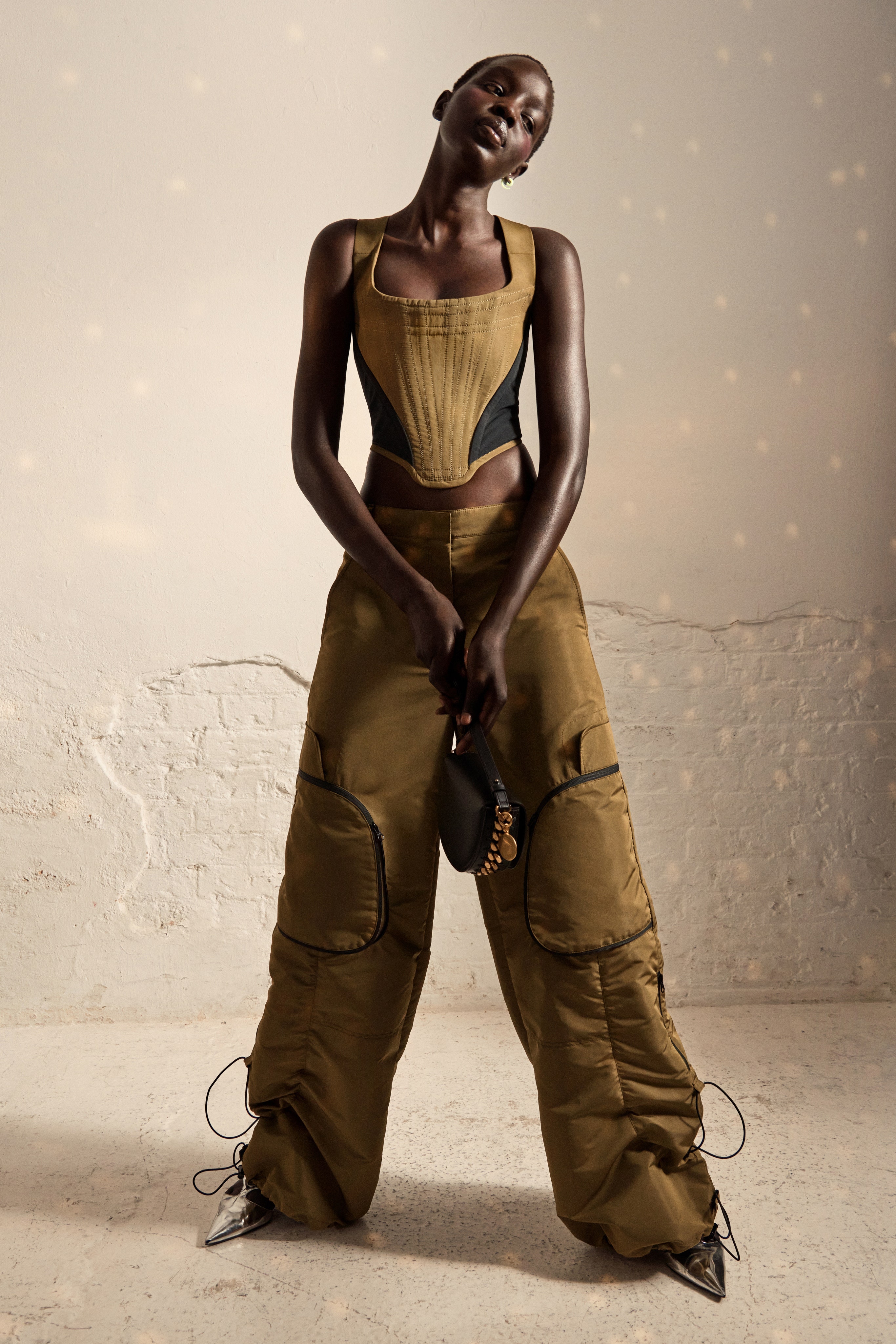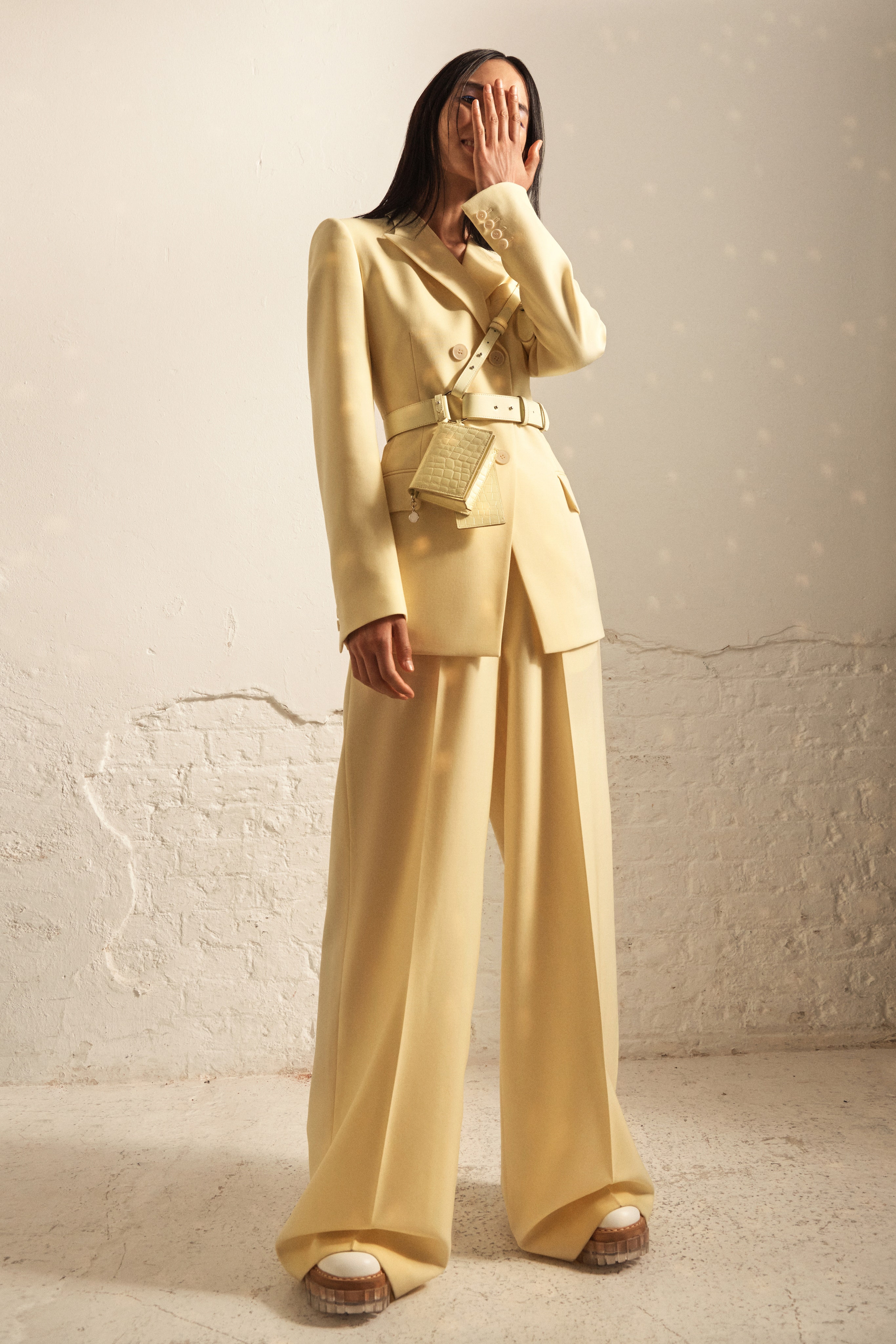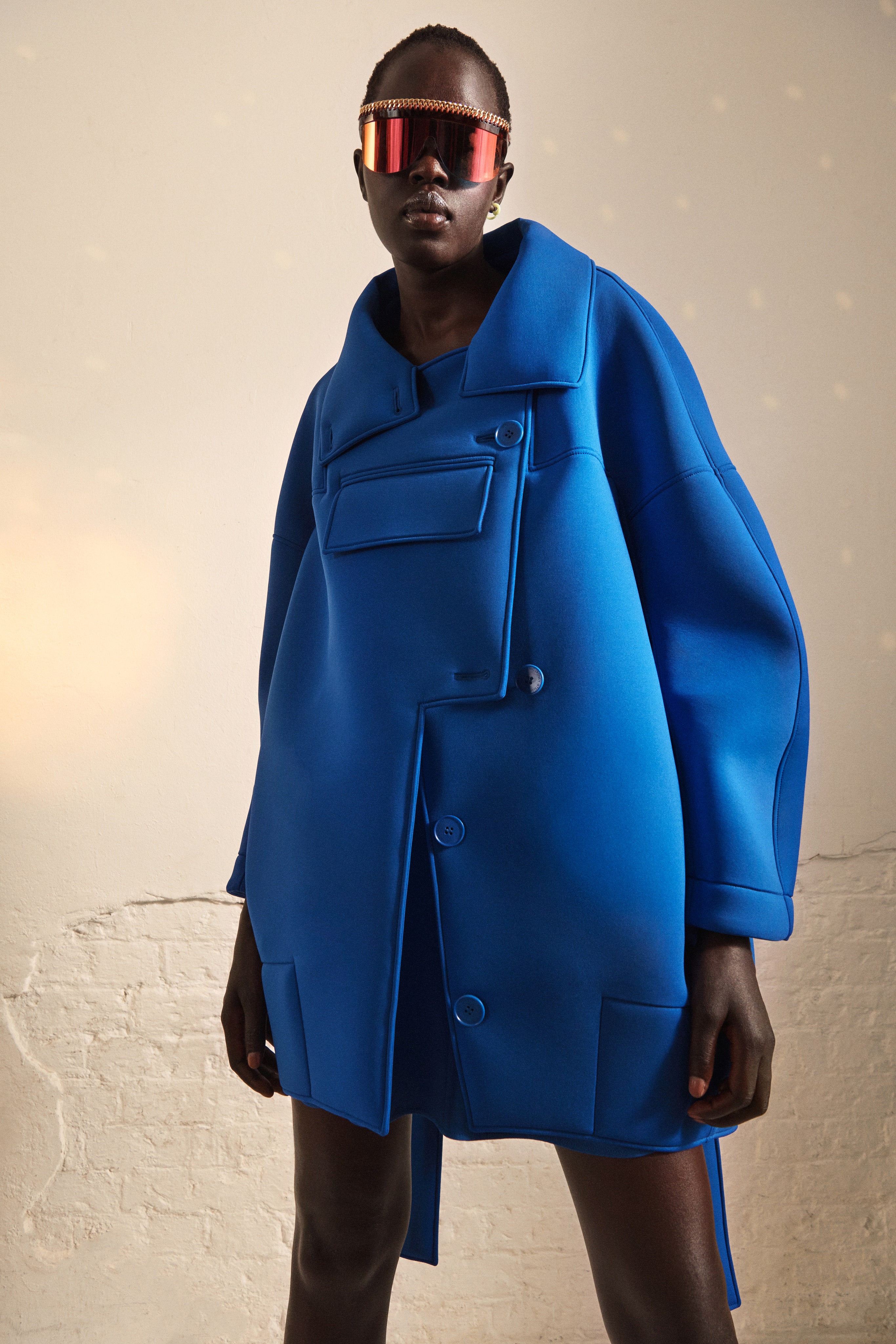 Девушки в лукбуке круизной коллекции веселятся в неоновых платьях и колготках с психоделическими принтами William Bradley и Haight Ashbury, корсетных топах и массивных лыжных брюках, в которых любая модница тут же захочет отправиться на рейв. Конфетная пастель в некоторых образах отсылает к эпохе богемных 60-х, а архитектурные пальто с геометрическими застежками и лацканами усиливают это впечатление, навевая мысли о кутюрном наследии Андре Куррежа.