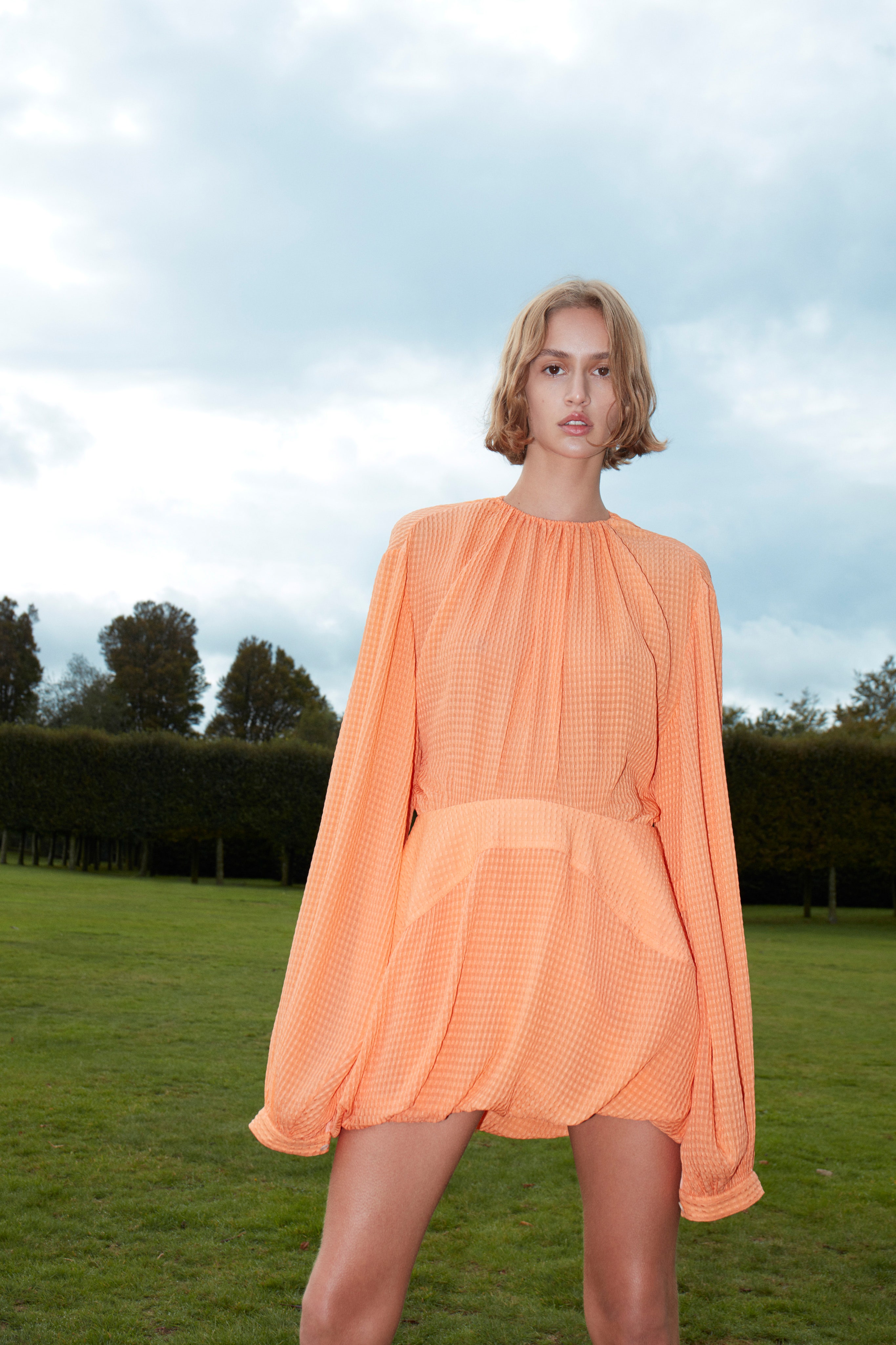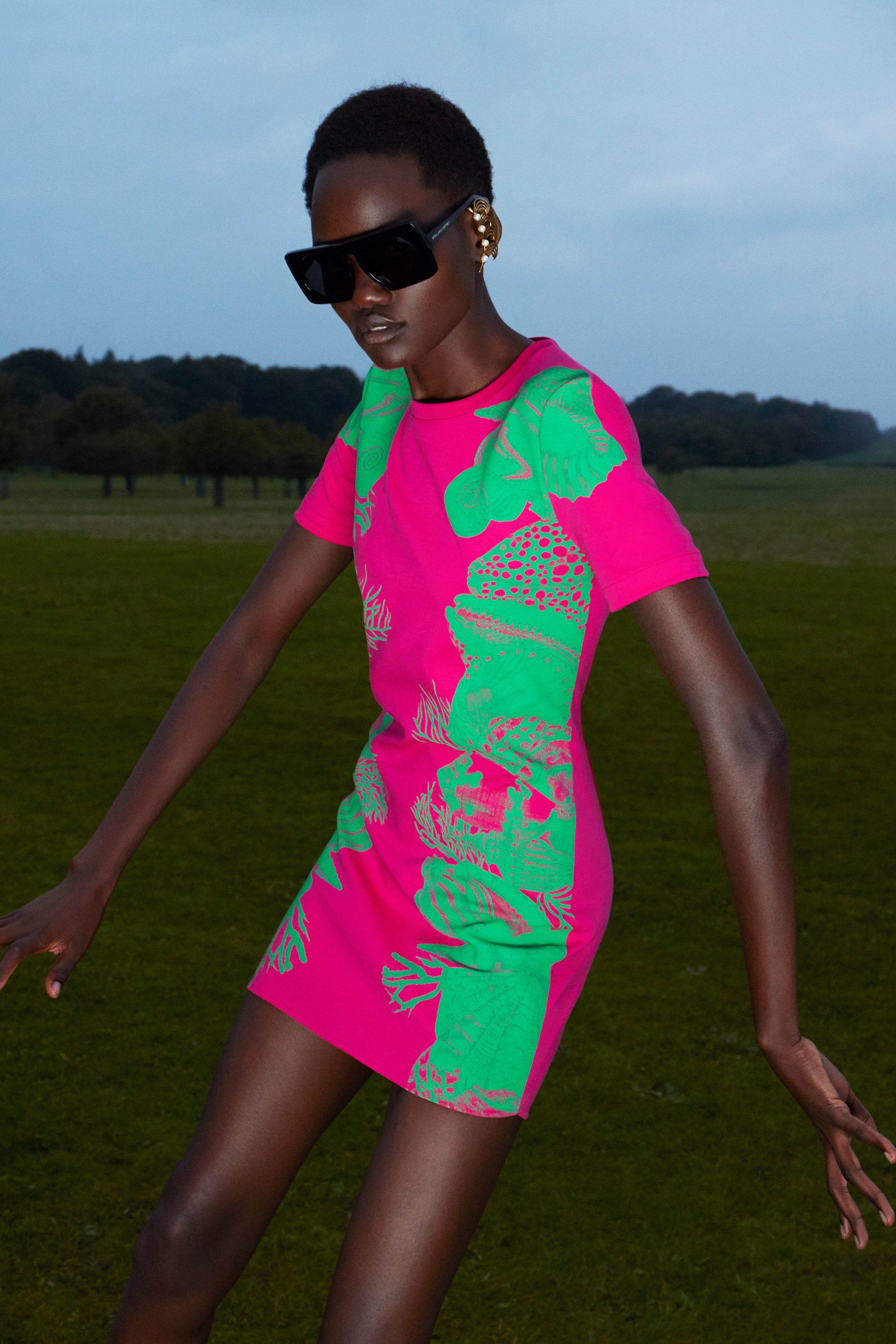 Неоновые спортивные и кружевные платья, топы с анатомическим декором, повторяющим округлые линии груди, корсетные топы в духе исторического шика и куртки милитари выполнены из переработанных и органически устойчивых материалов. Контрапунктом к ультраженственным вещам стали свободные брючные костюмы и урбанистические комбинезоны, окрашенные вручную. Один из наиболее удивительных образов коллекции — спортивный костюм из округлых брюк и топа силуэта 18 столетия.
