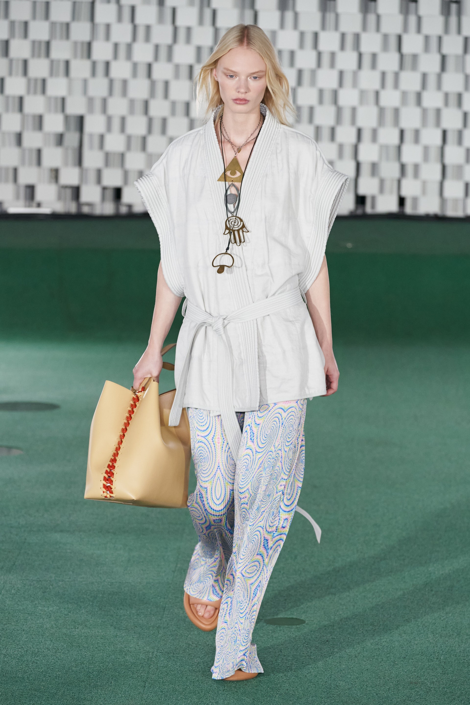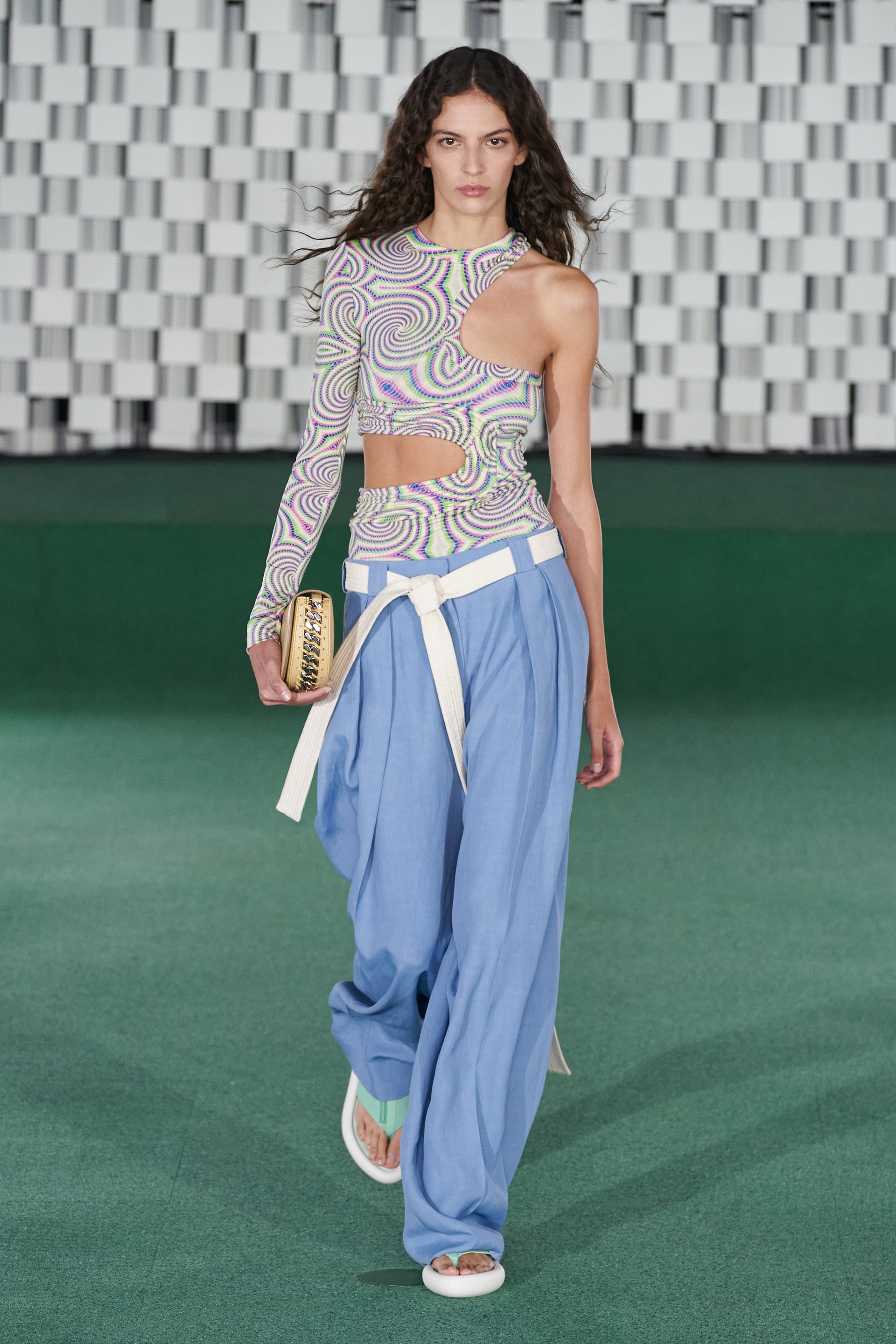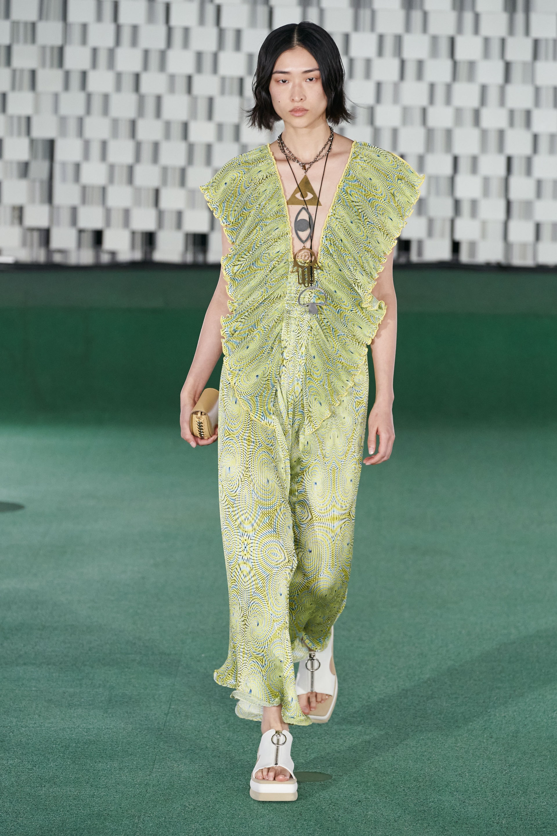 Лаборатории Mylo, с которыми Стелла Маккартни сотрудничает уже не первый сезон, выращивают грибы и производят из них искусственную кожу. Дизайнер наконец-то представила аксессуары, выполненные из такой грибной кожи, — вместительные сумки, цитирующие известную модель бренда Frayme. Грибы Стелла назвала будущим моды и сделала их главным мотивом весенней коллекции. Принт в стиле туаль де Жуи с грибами вместо привычных пасторальных мотивов покрыл юбки макси и топы "в лапшу", платья со стегаными рукавами и жилеты. Саундтреком к показу стали звуки роста грибов, добытые с помощью прикрепленных в лаборатории микрофонов.