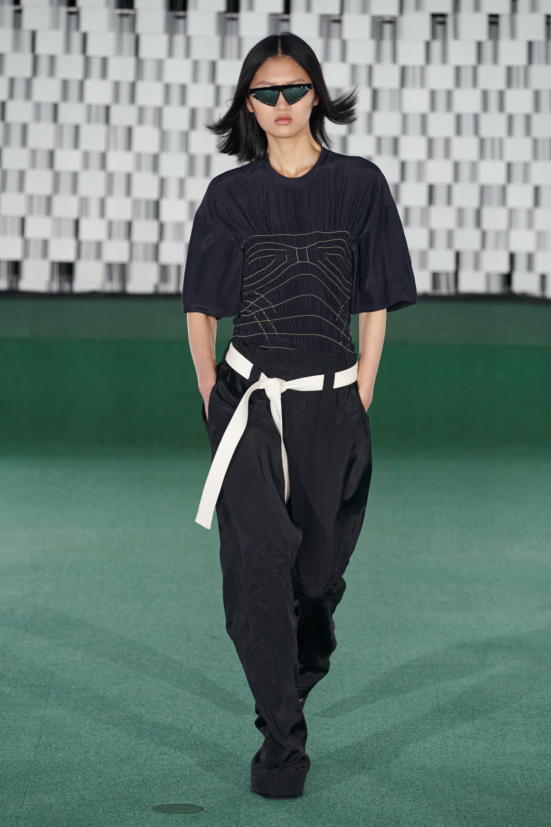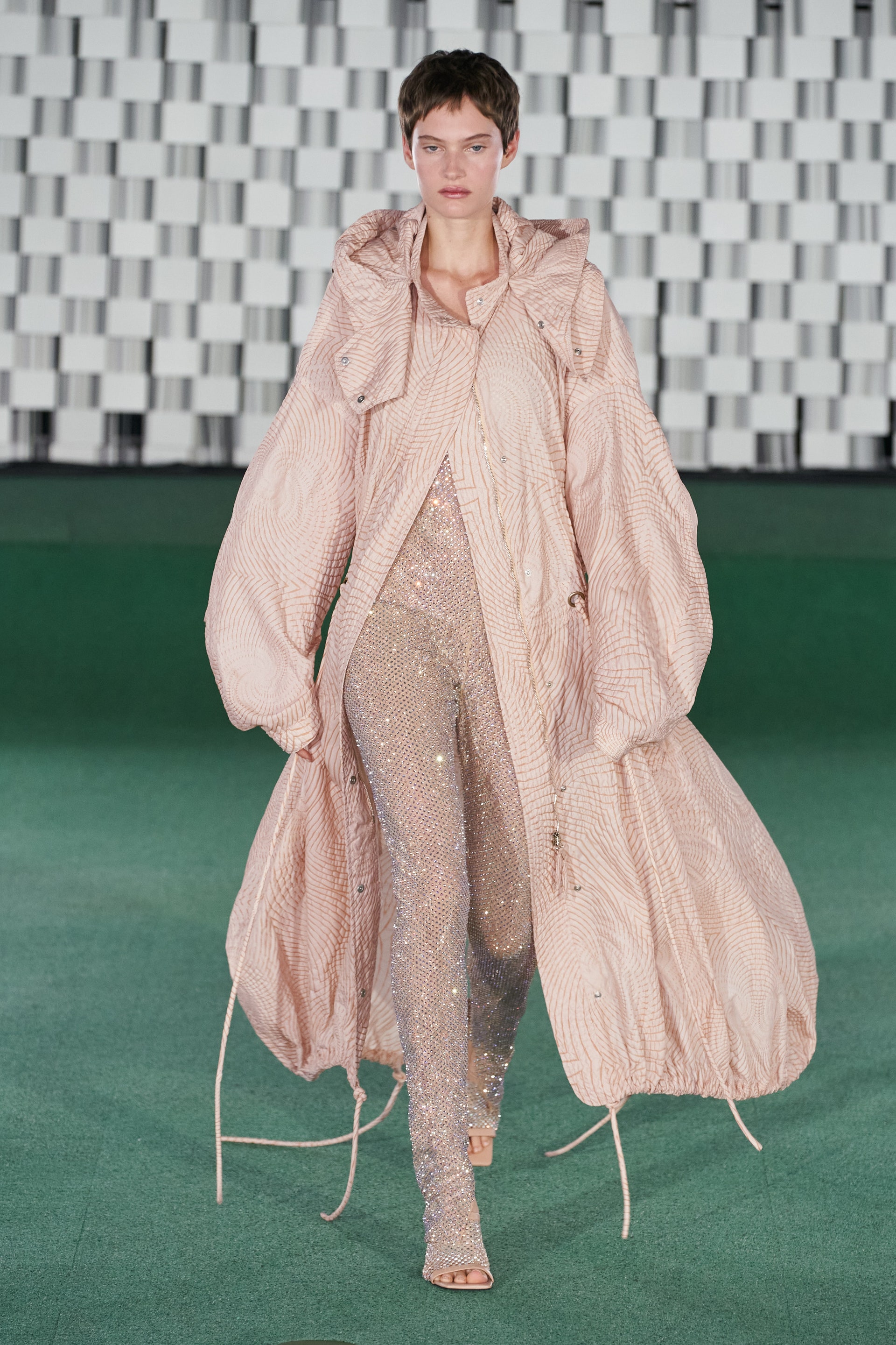Коллекция будущей весны наполнена психоделическими принтами-голограммами, динамикой, благодаря подвижной бахроме, и легкостью. Некоторые платья и комбинезоны оказались скроены как купальники — поверх модели носили просторные защитные плащи, невесомые прозрачные топы и платья-чехлы усыпали мириады блесток, а дополнили образы подвески с сакральными эзотерическими символами и очки, напоминающие форму глаз инопланетян.