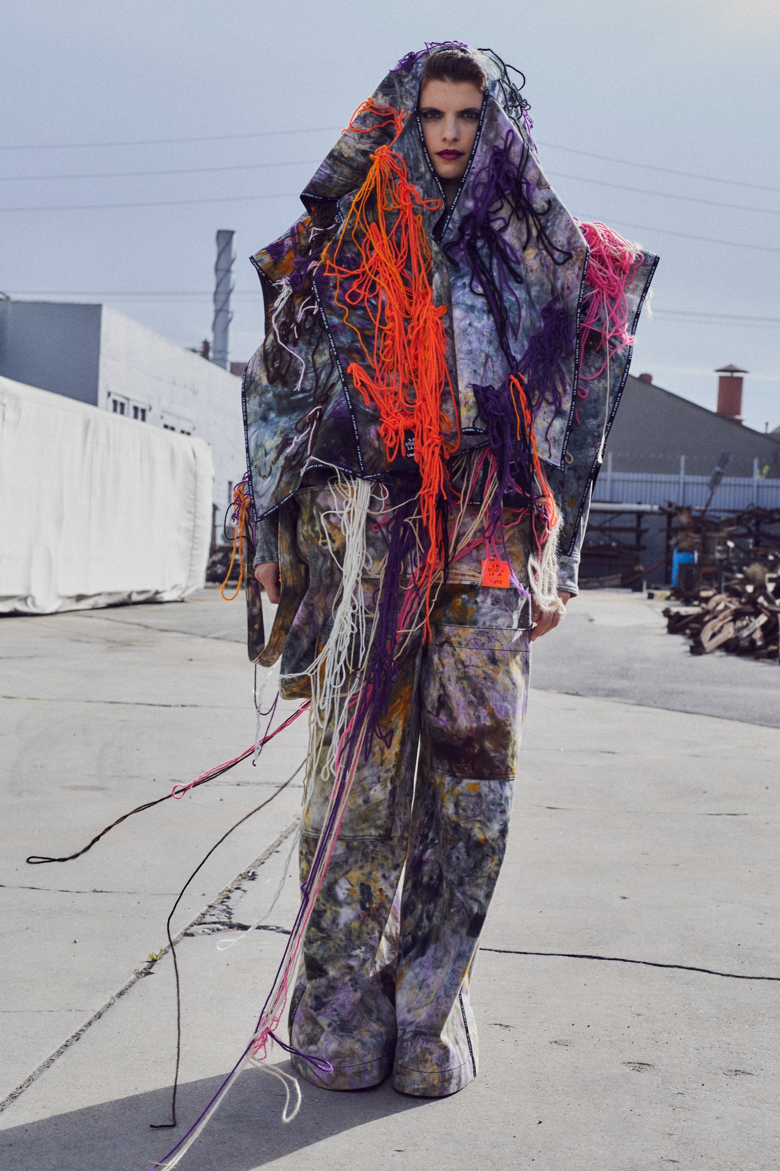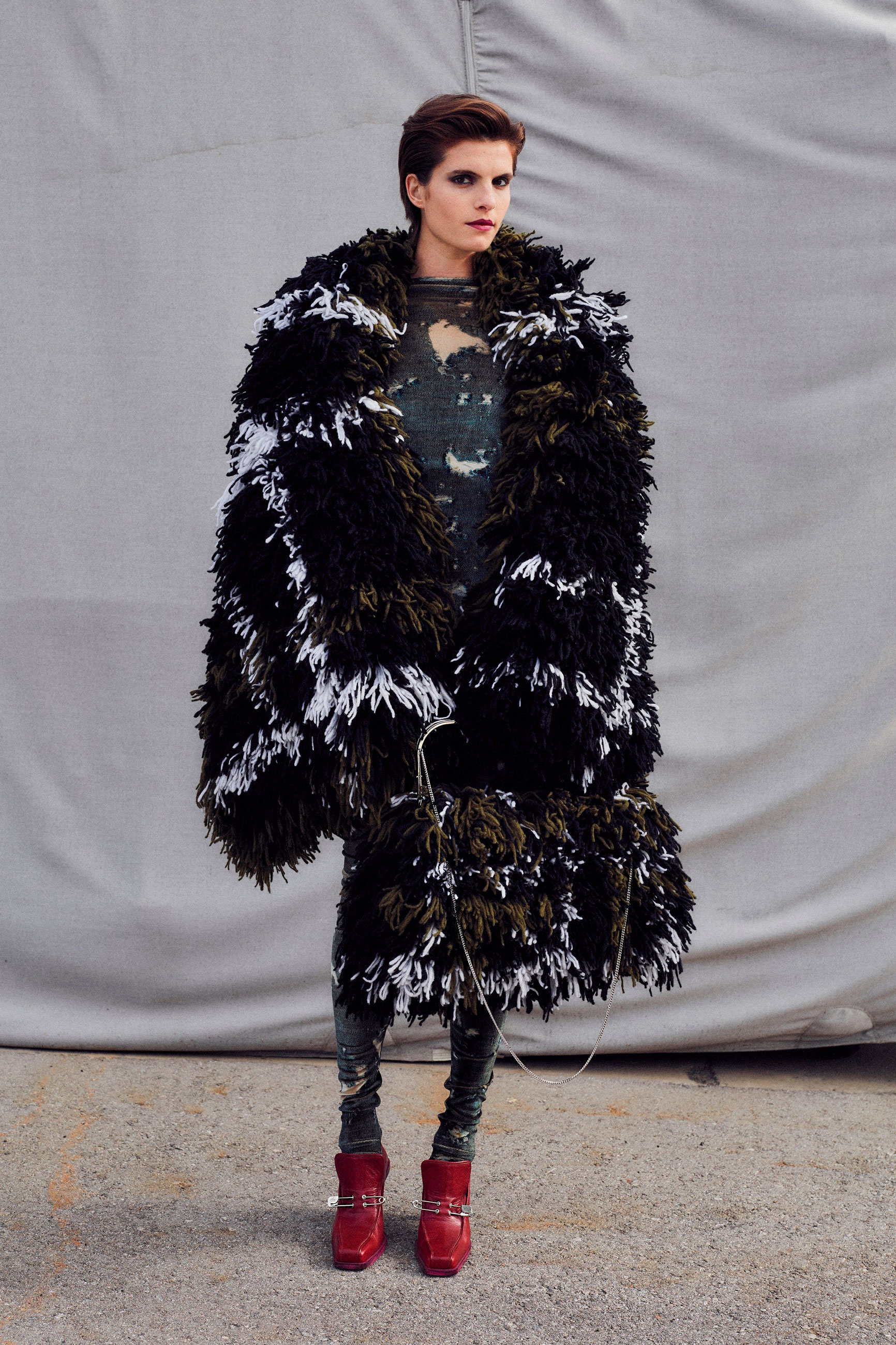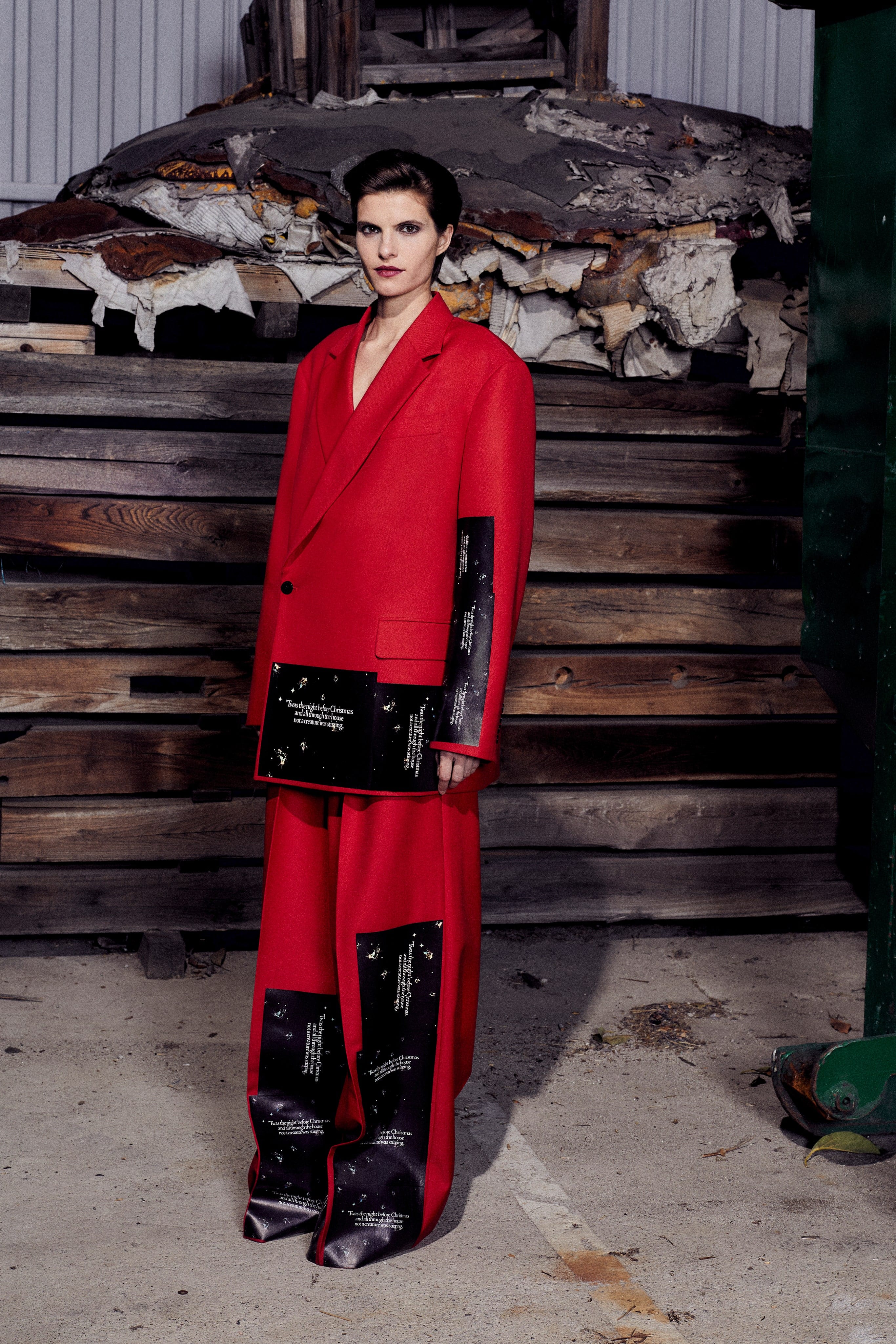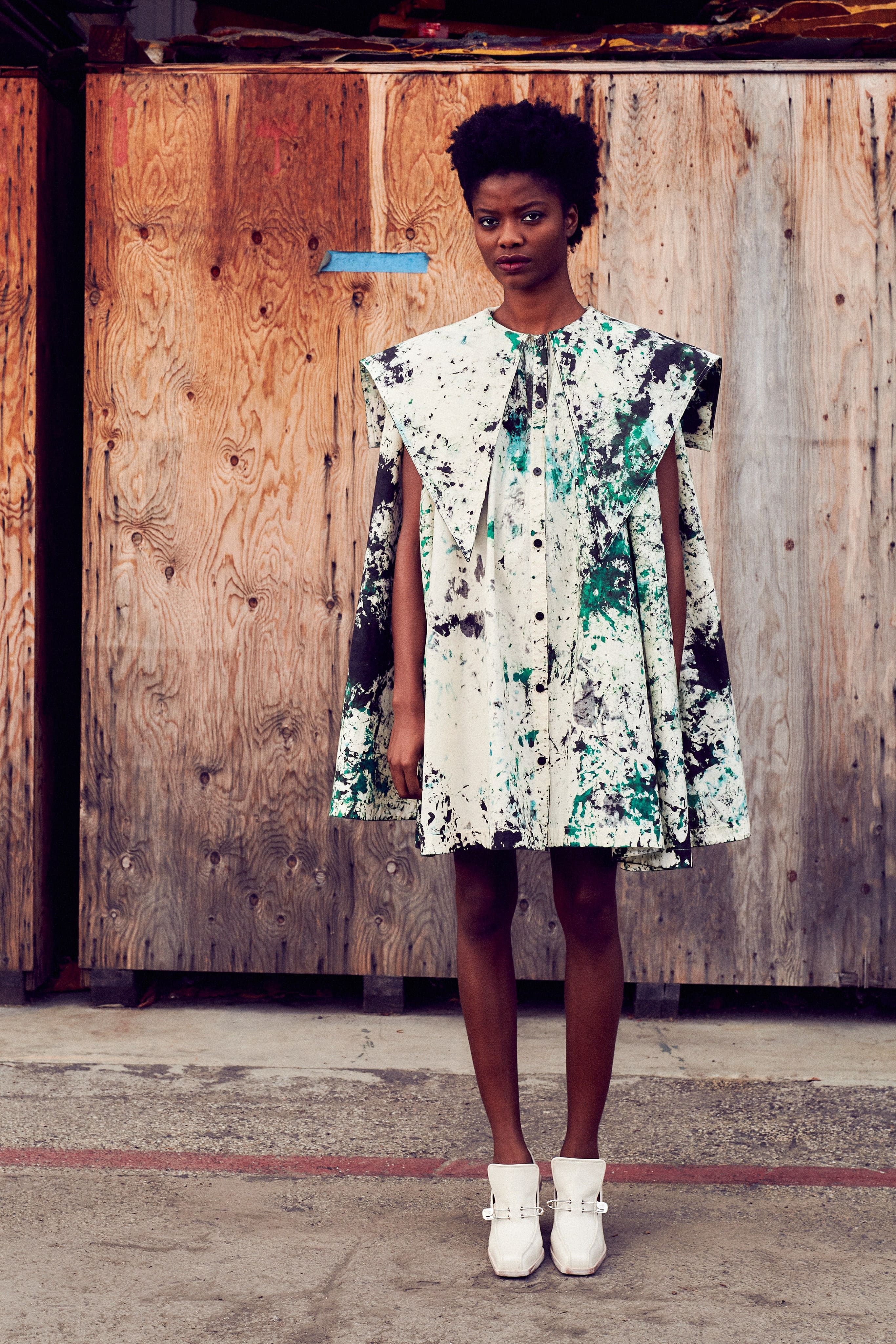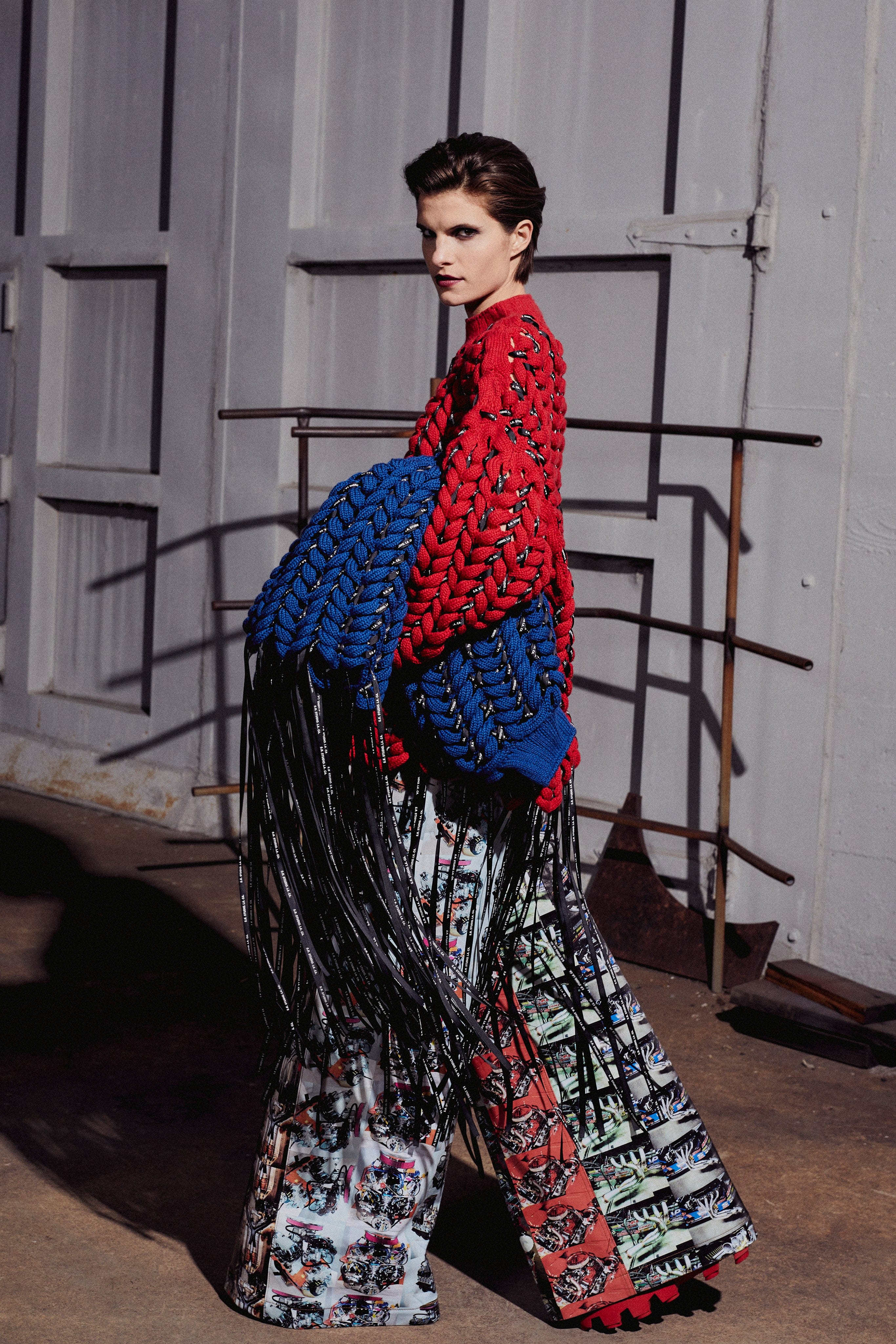 Монументальные наряды устойчивых, приземленных силуэтов сохраняют в то же время воздушность и таинственность женских туалетов прошлого: это и пышные кутюрные платья из плотного шелка, "призрачные" рукава из шифона, множество сборок и складок, а также обилие декора из пряжи, которая также была выткана вручную на веретене. Знаковый для Руби "вареный" деним, промытый и окрашенный цветными ферментами, сделал историческую аллюзию инновационной. Вместе со своей женой, фотографом Мелани Шифф, дизайнер экспериментирует в создании принтов, накладывая абстрактные текстуры и многослойные снимки поверх брызг краски и собственных коллажей. Доля романтизма в дизайне Руби приправлена мыслями об активной outdoor-моде сегодняшних дней — сам дизайнер обожает кататься на лыжах и не счел лишним создать элегантные костюмы с контрастными деталями, напоминающие одежду для сноубординга. И в таком костюме можно отправляться даже на королевский прием.