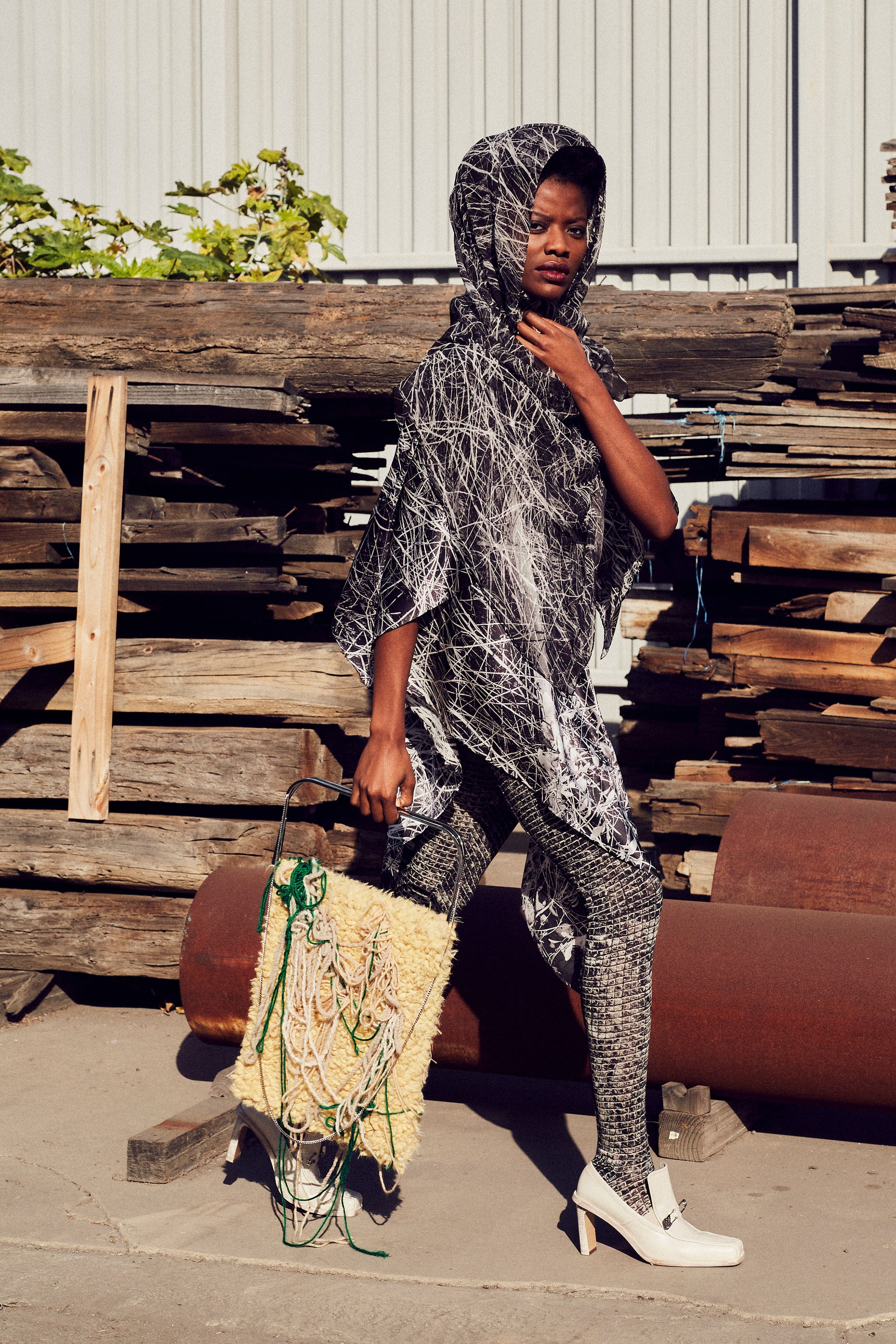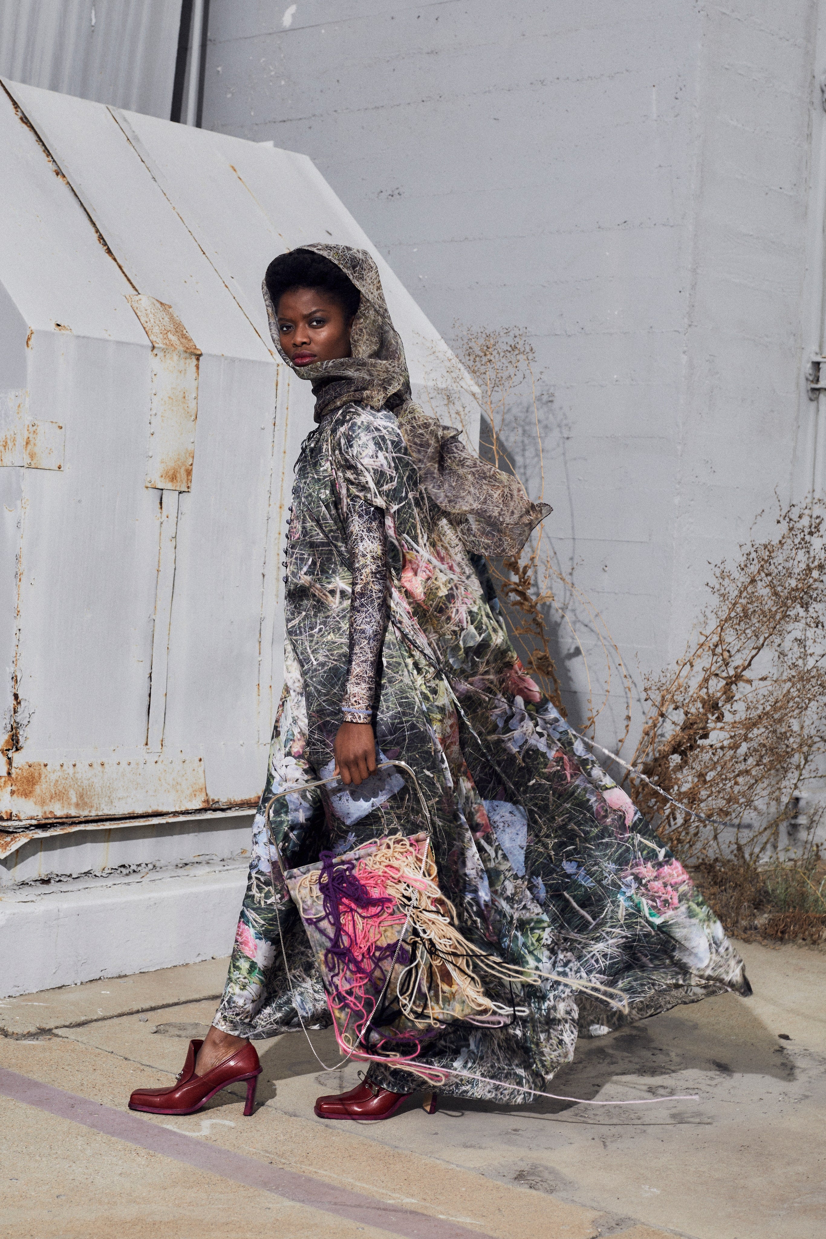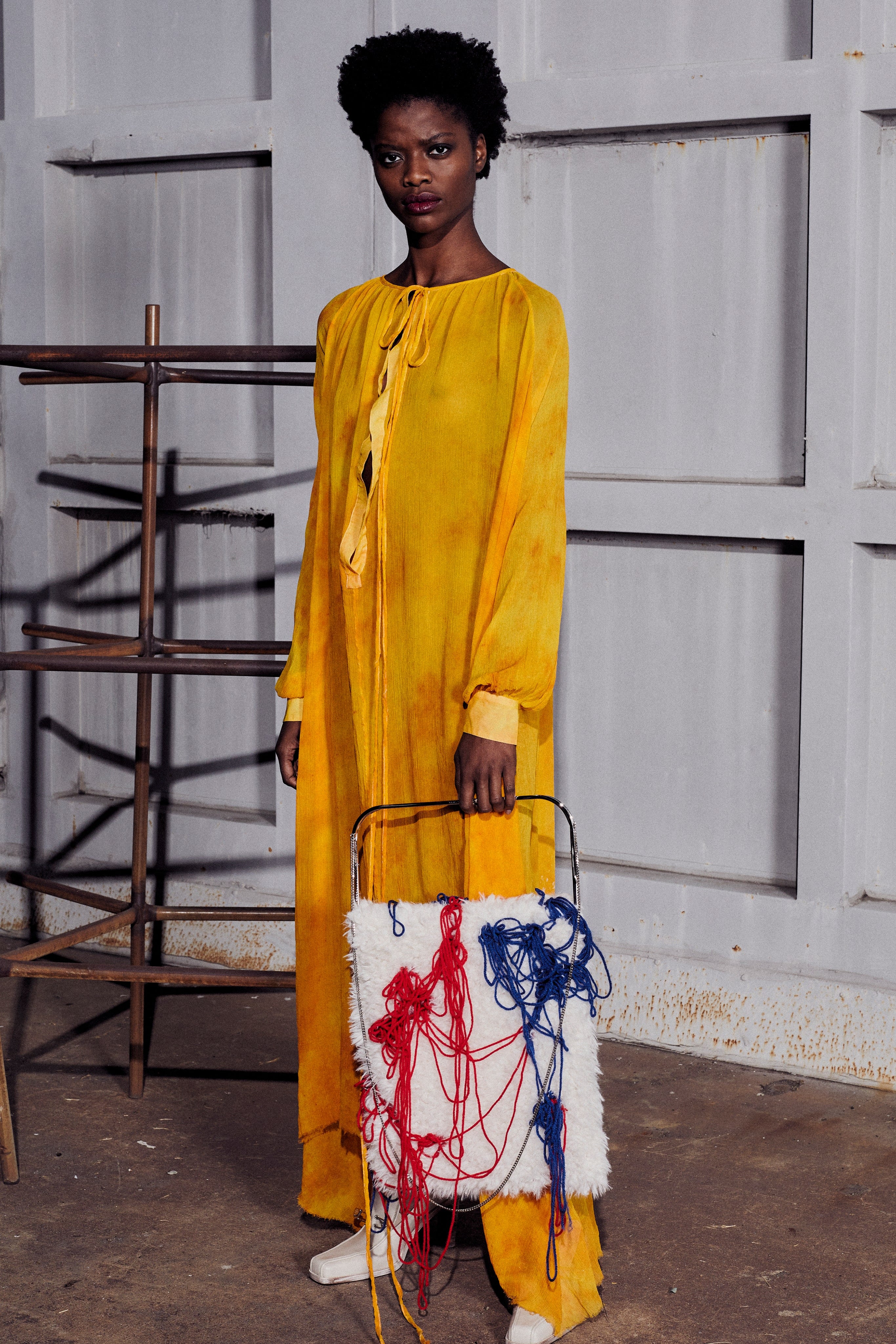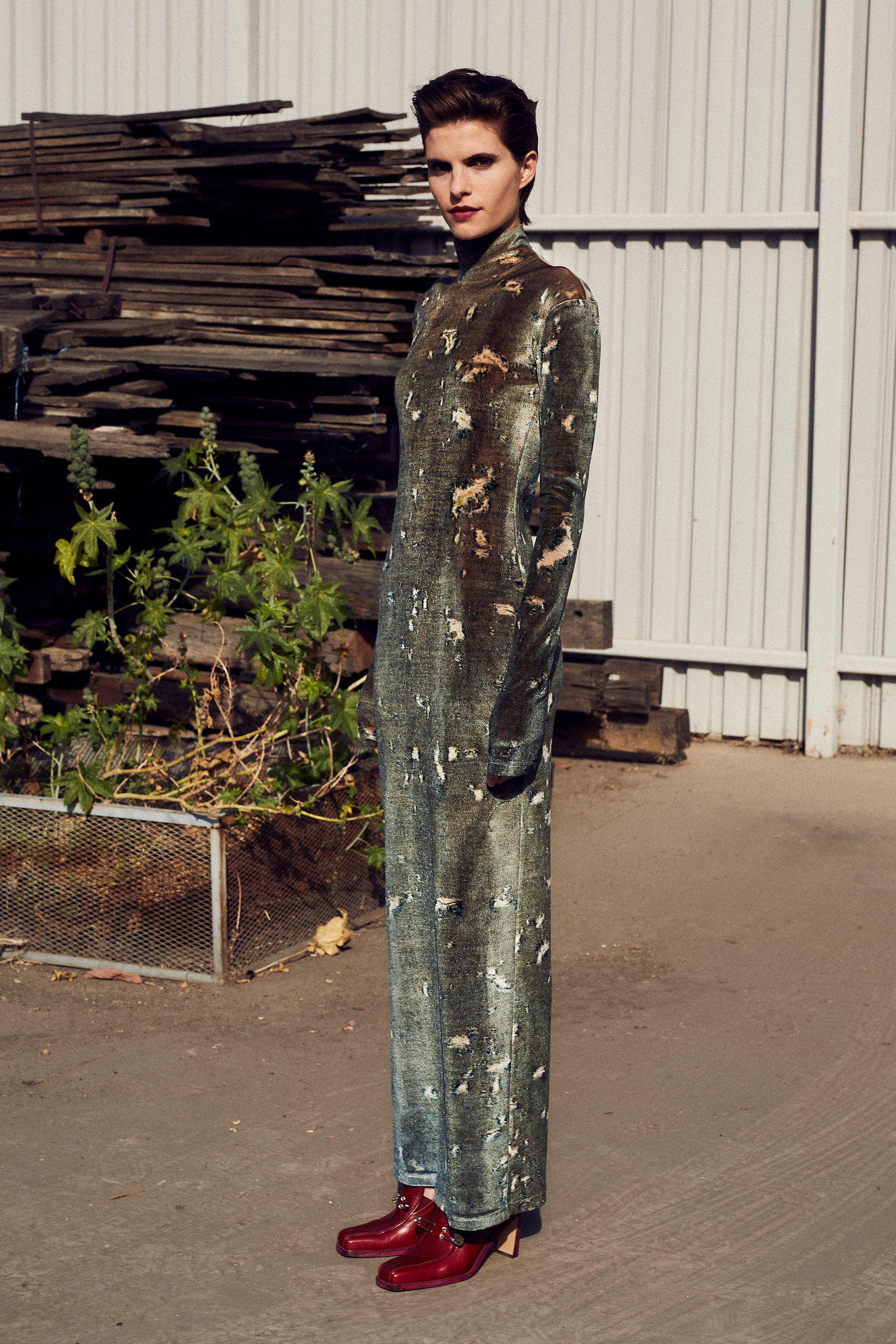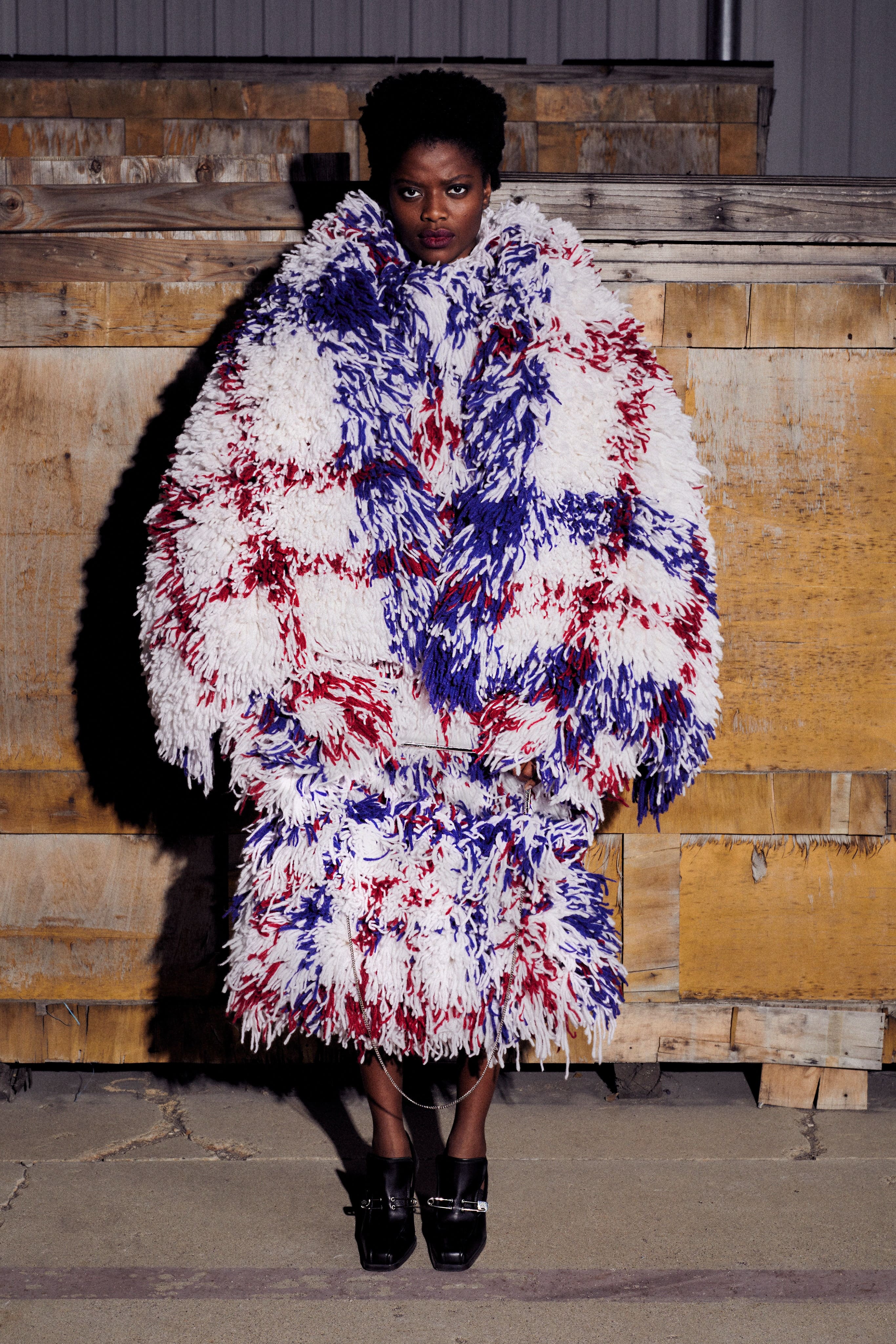 Монументальные наряды устойчивых, приземленных силуэтов сохраняют в то же время воздушность и таинственность женских туалетов прошлого: это и пышные кутюрные платья из плотного шелка, "призрачные" рукава из шифона, множество сборок и складок, а также обилие декора из пряжи, которая также была выткана вручную на веретене. Знаковый для Руби "вареный" деним, промытый и окрашенный цветными ферментами, сделал историческую аллюзию инновационной. Вместе со своей женой, фотографом Мелани Шифф, дизайнер экспериментирует в создании принтов, накладывая абстрактные текстуры и многослойные снимки поверх брызг краски и собственных коллажей. Доля романтизма в дизайне Руби приправлена мыслями об активной outdoor-моде сегодняшних дней — сам дизайнер обожает кататься на лыжах и не счел лишним создать элегантные костюмы с контрастными деталями, напоминающие одежду для сноубординга. И в таком костюме можно отправляться даже на королевский прием.