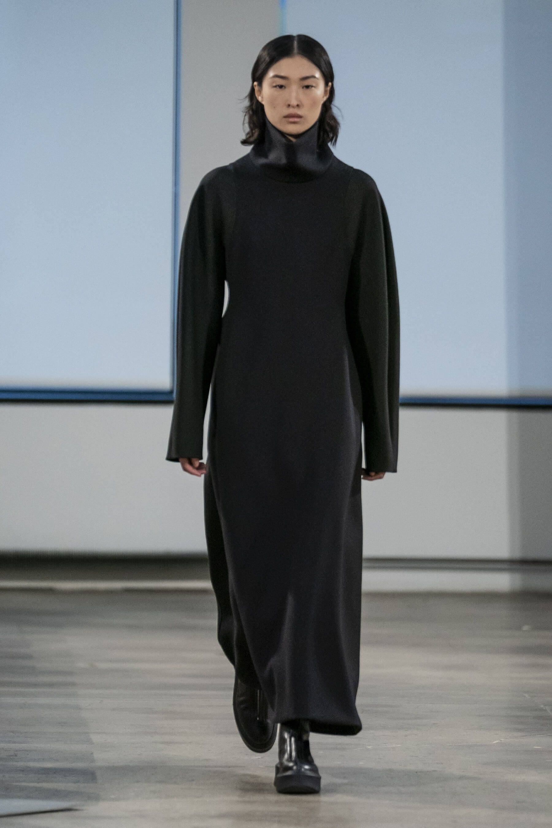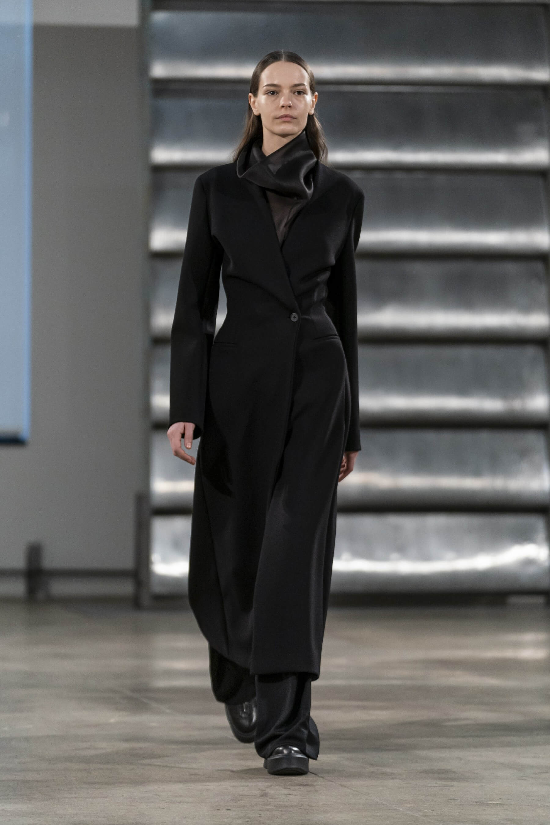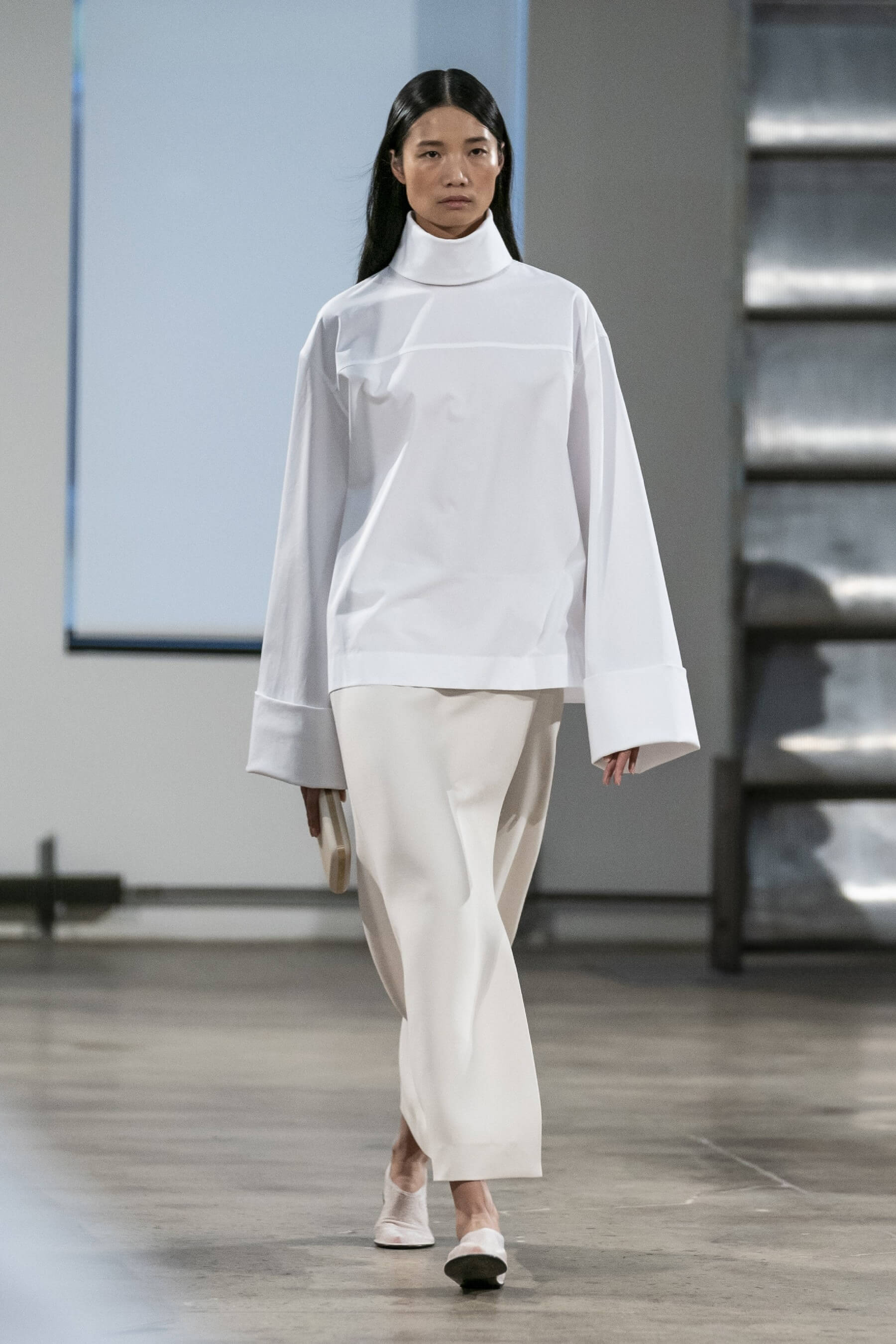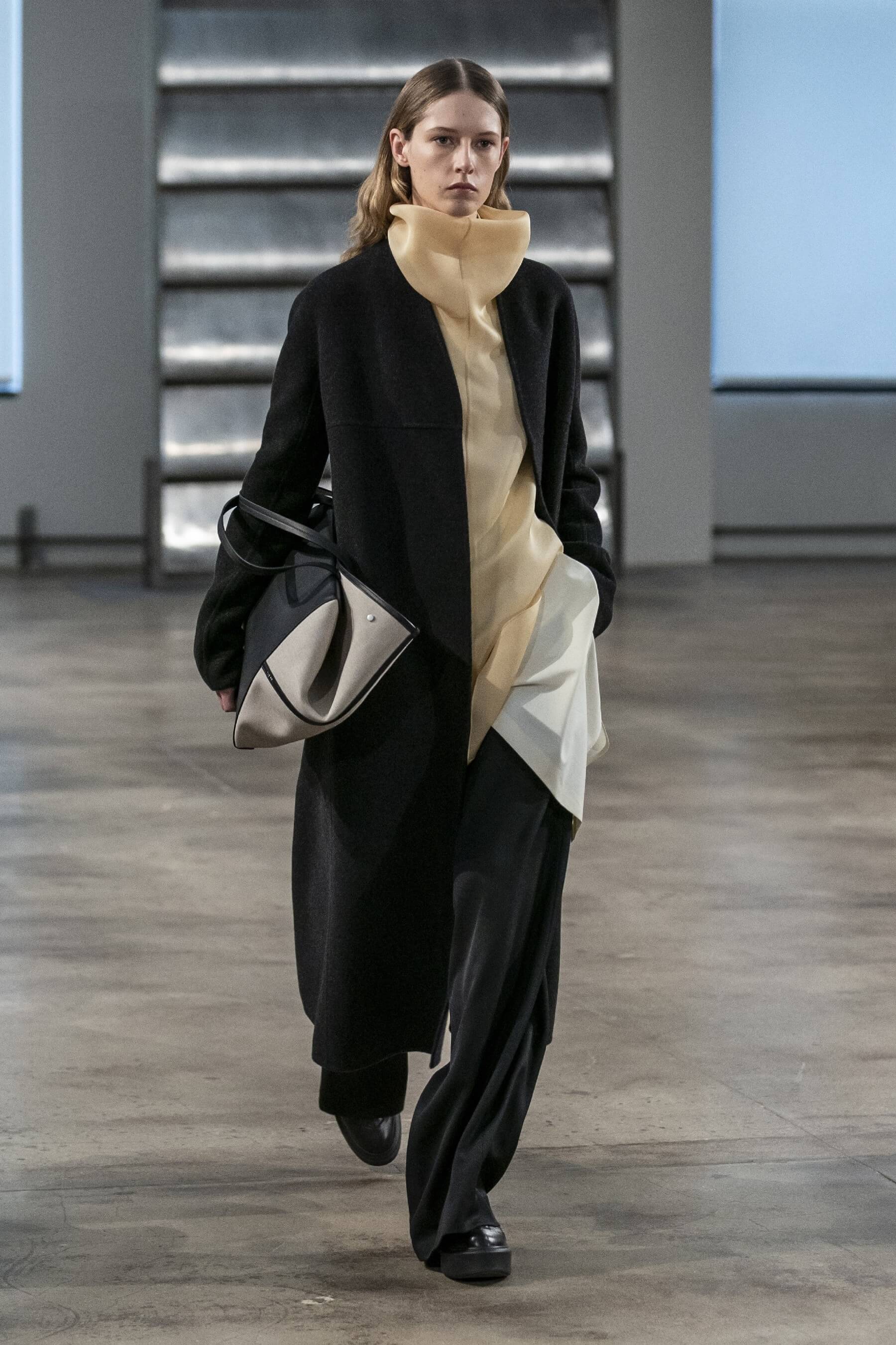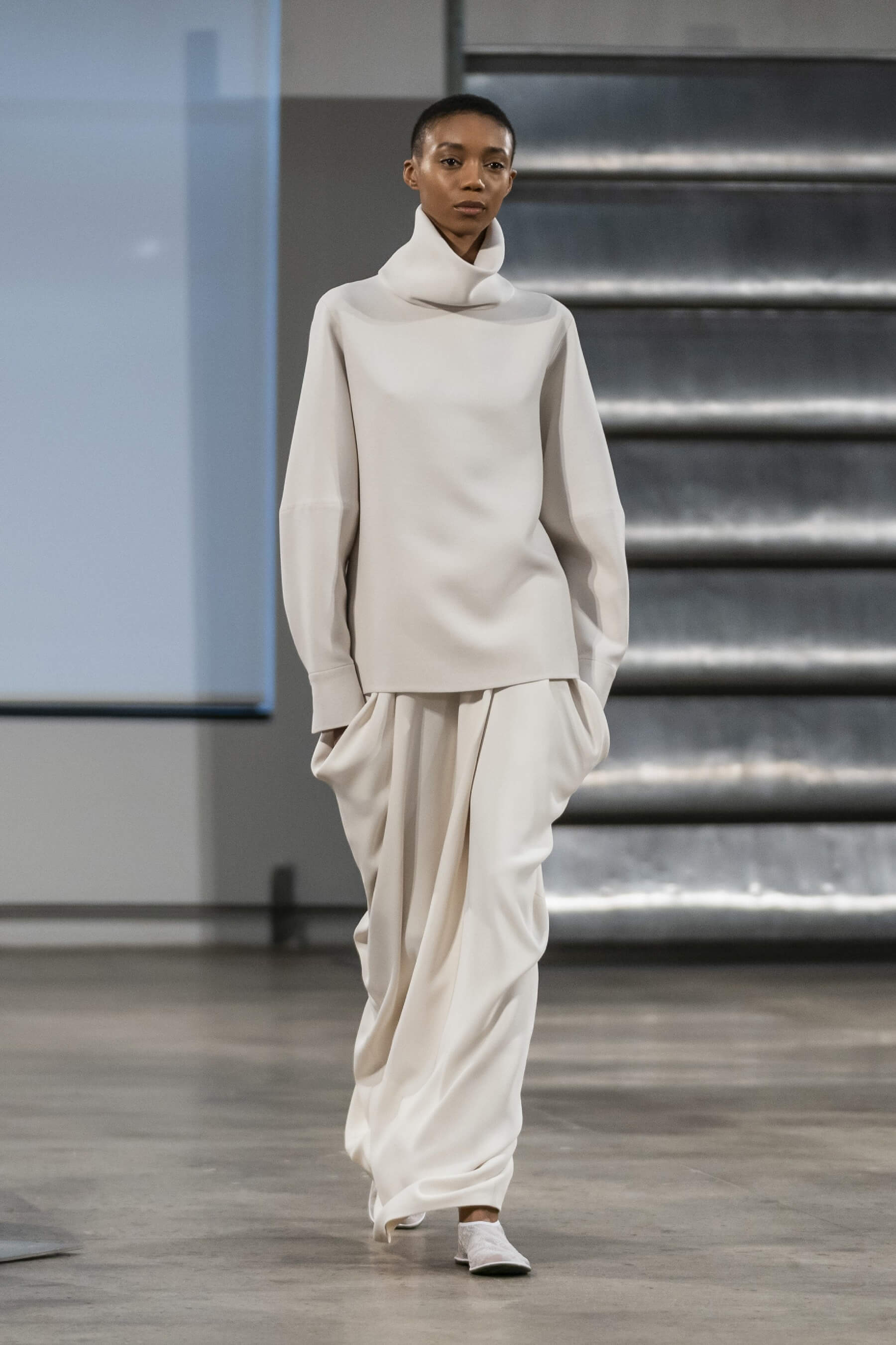 В новом силуэте пальто и жакетов акцент смещен на талию, а полочки приподняты на уровне груди в конструктивный объем, мягко обволакивающий тело. Еще одним ключевым элементом коллекции являются эффектные топы и свитера с цельнокроеными воротами, свободно опоясывающими шею, надетые поверх шелковых платьев с мягкими драпировками или под прямые сюртуки с широким плечом, ставшие классикой The Row.