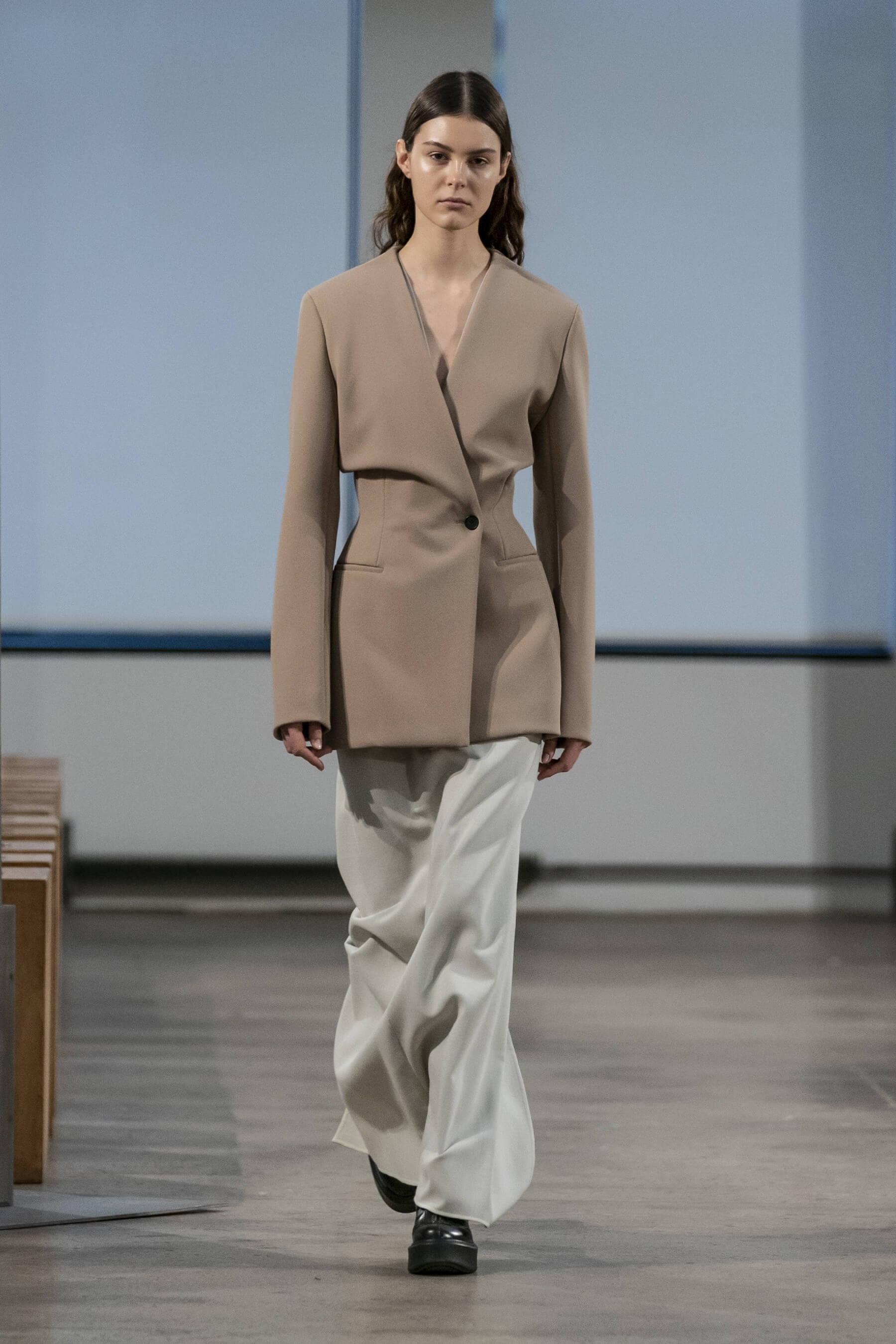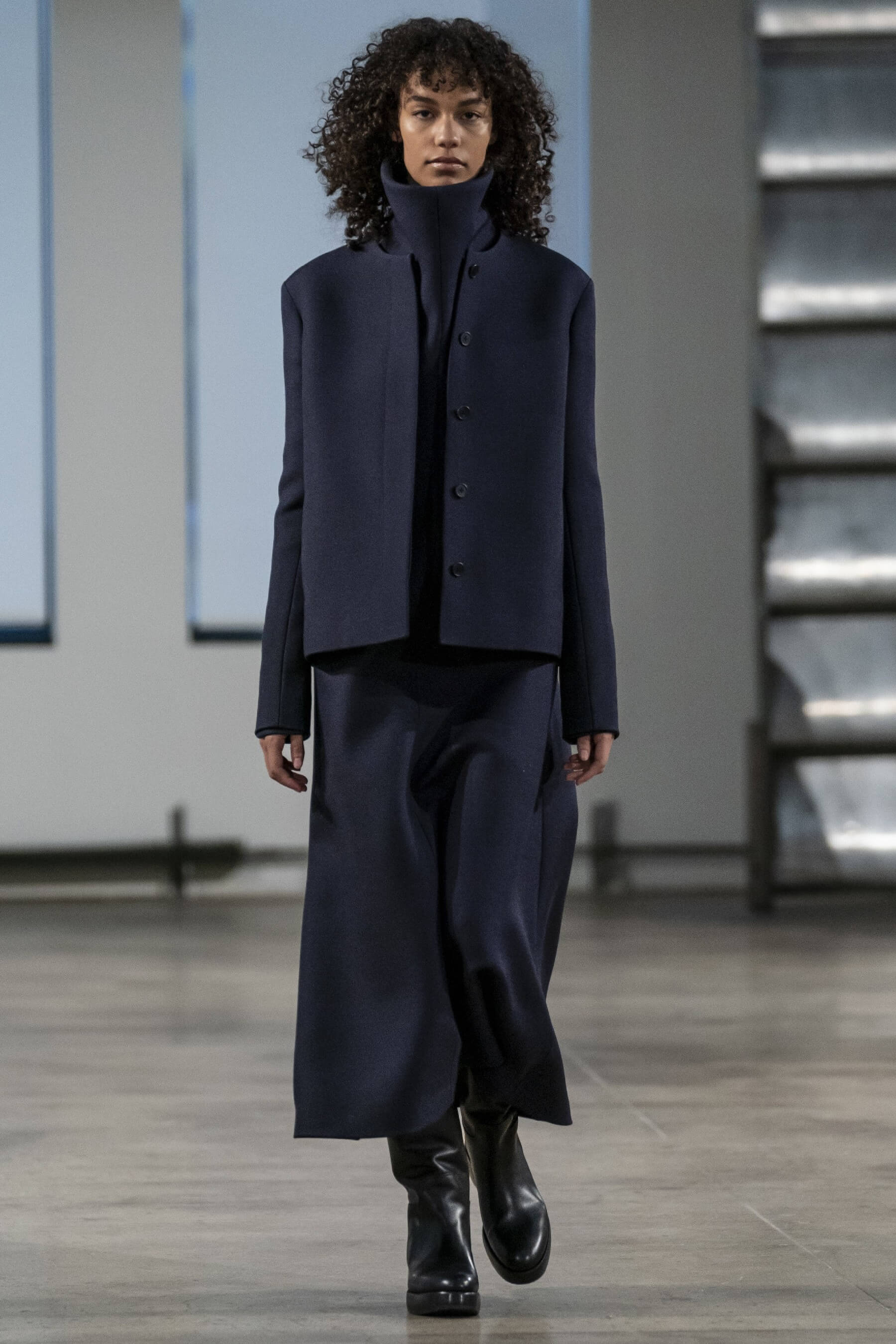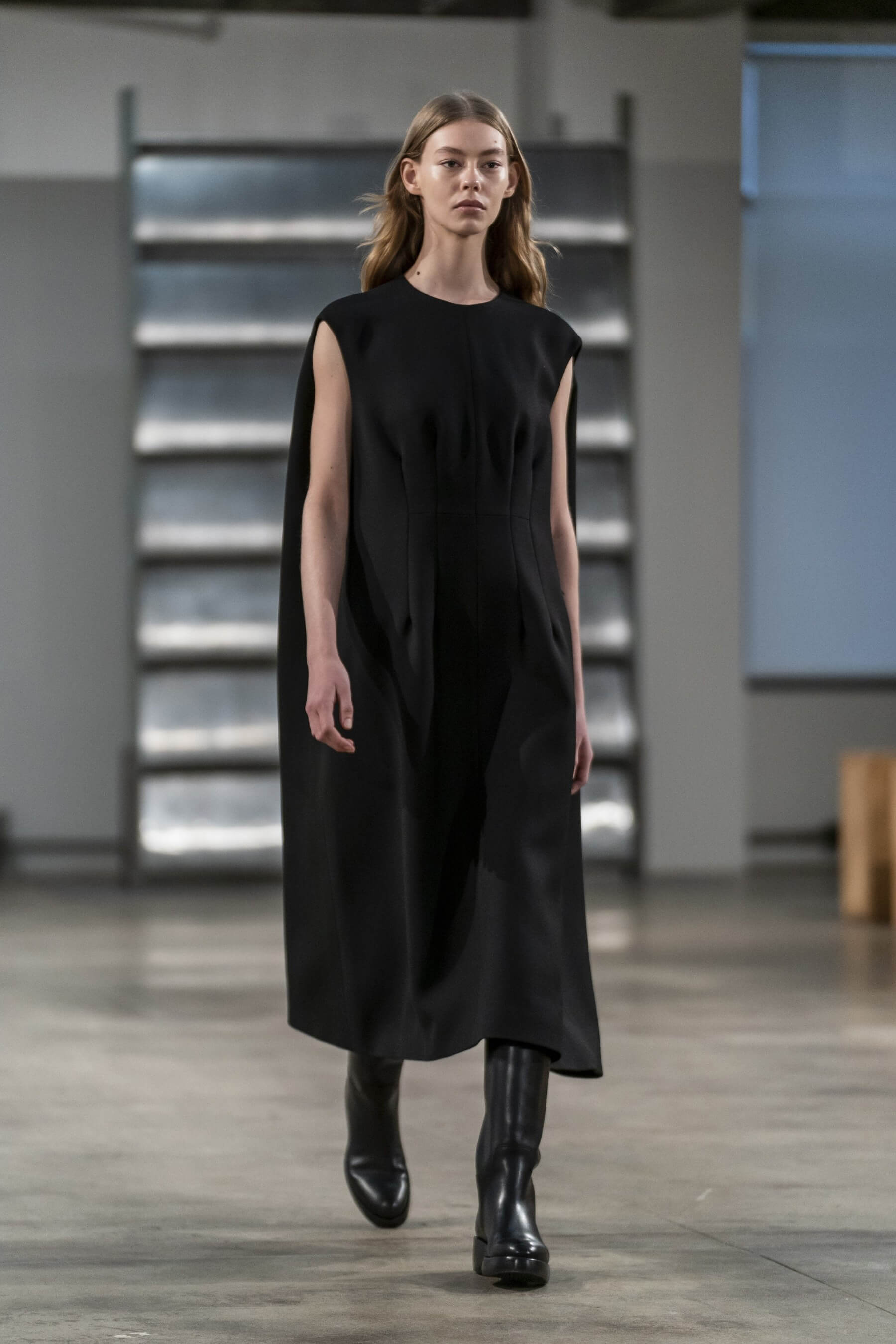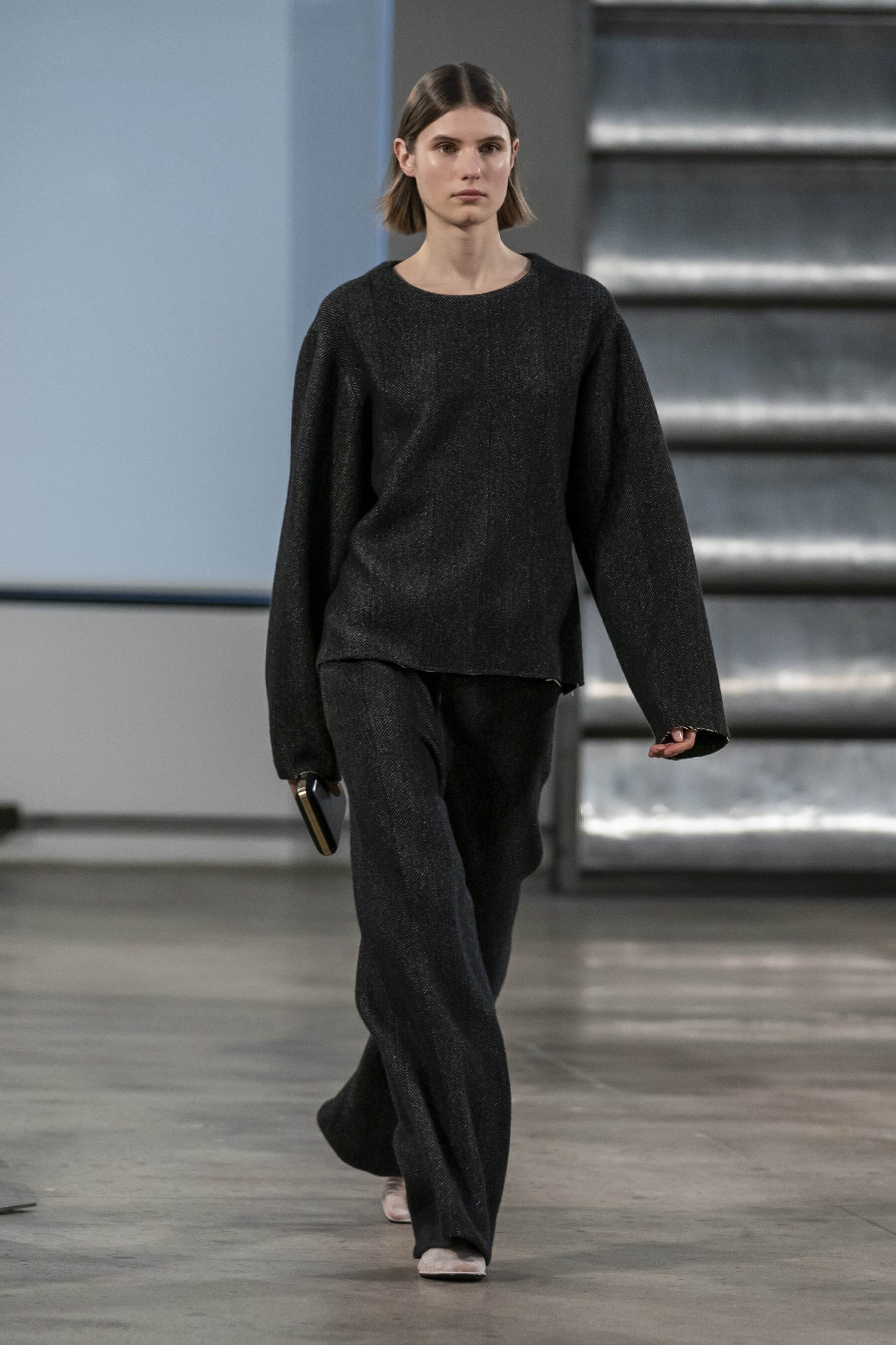 В новом силуэте пальто и жакетов акцент смещен на талию, а полочки приподняты на уровне груди в конструктивный объем, мягко обволакивающий тело. Еще одним ключевым элементом коллекции являются эффектные топы и свитера с цельнокроеными воротами, свободно опоясывающими шею, надетые поверх шелковых платьев с мягкими драпировками или под прямые сюртуки с широким плечом, ставшие классикой The Row.