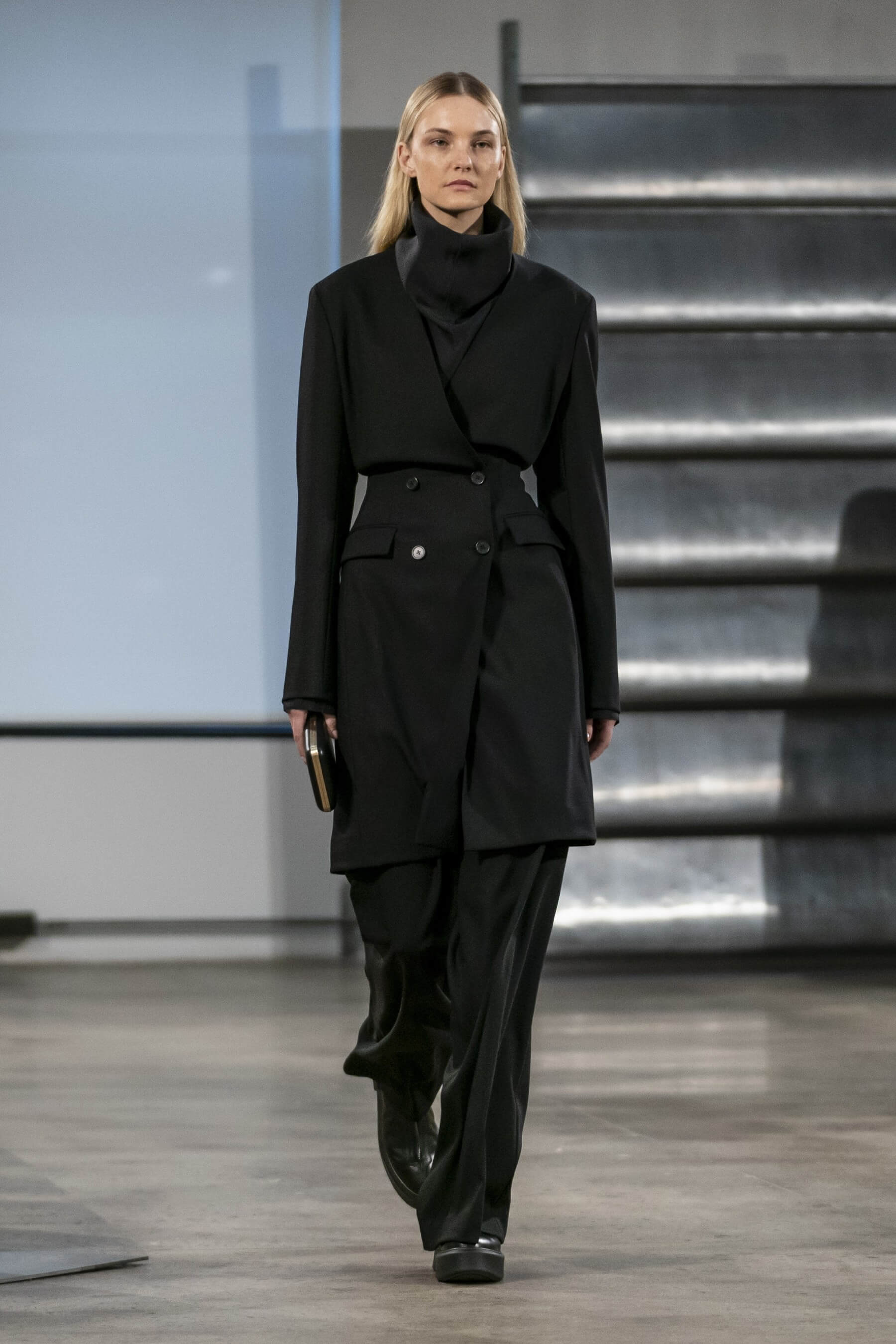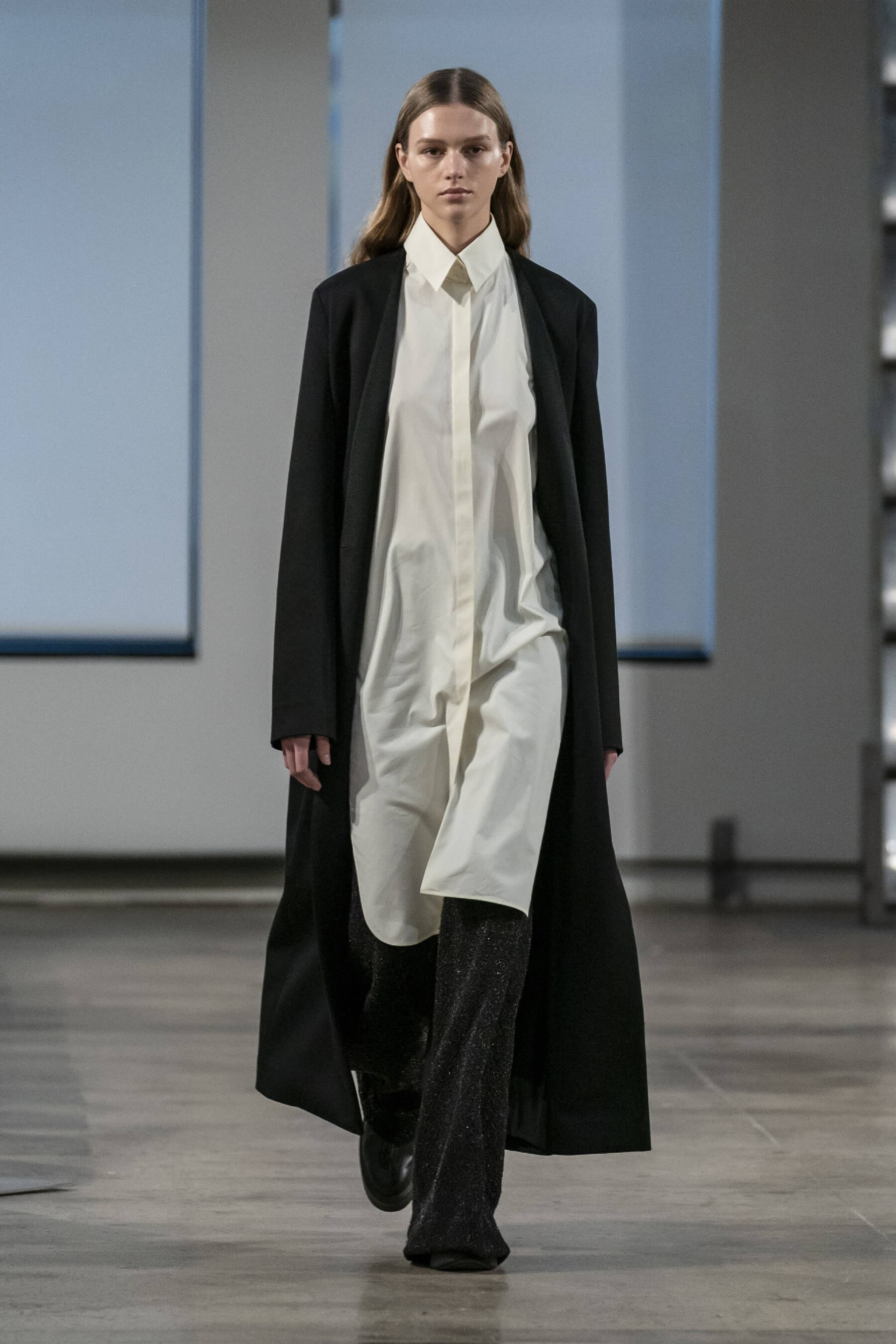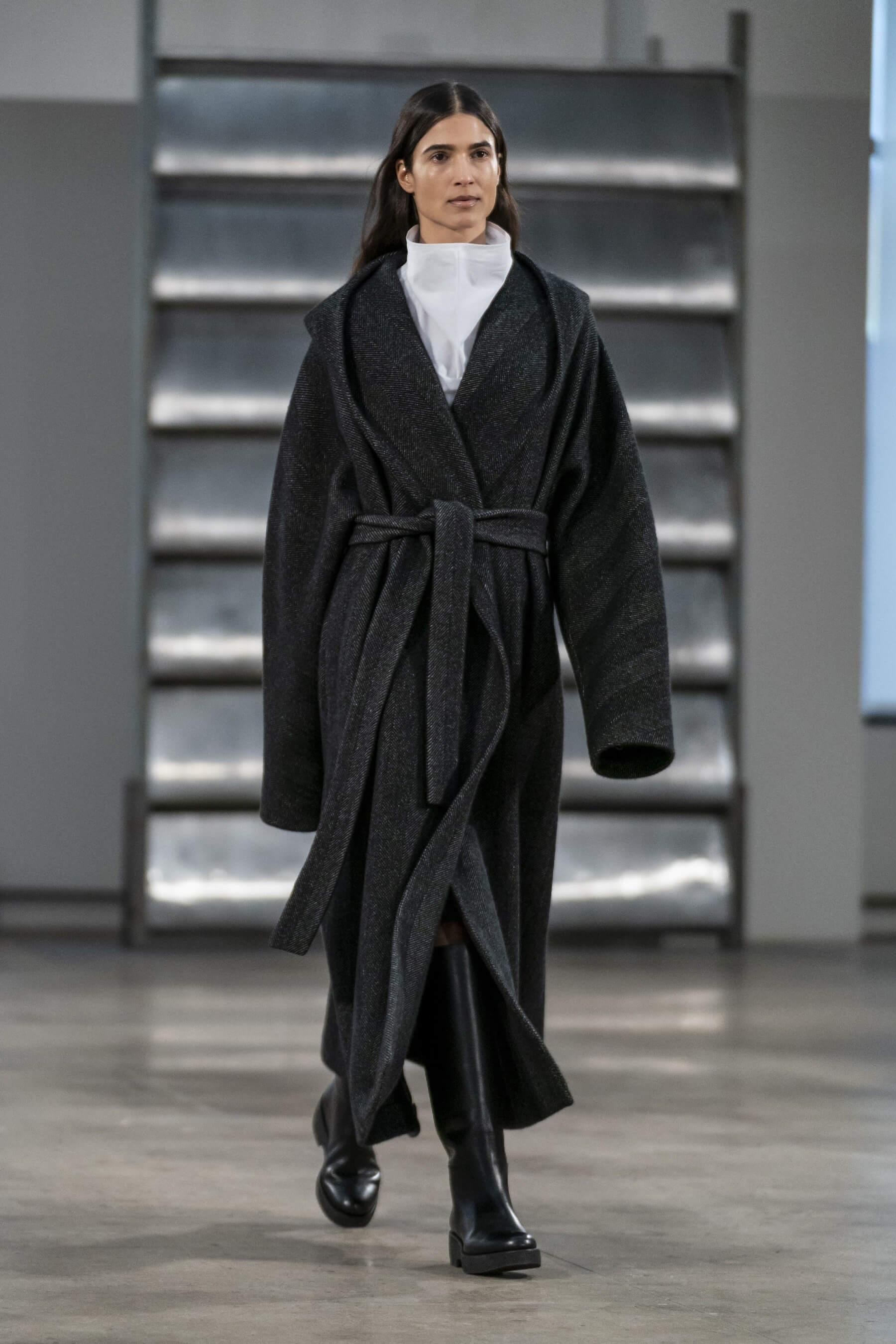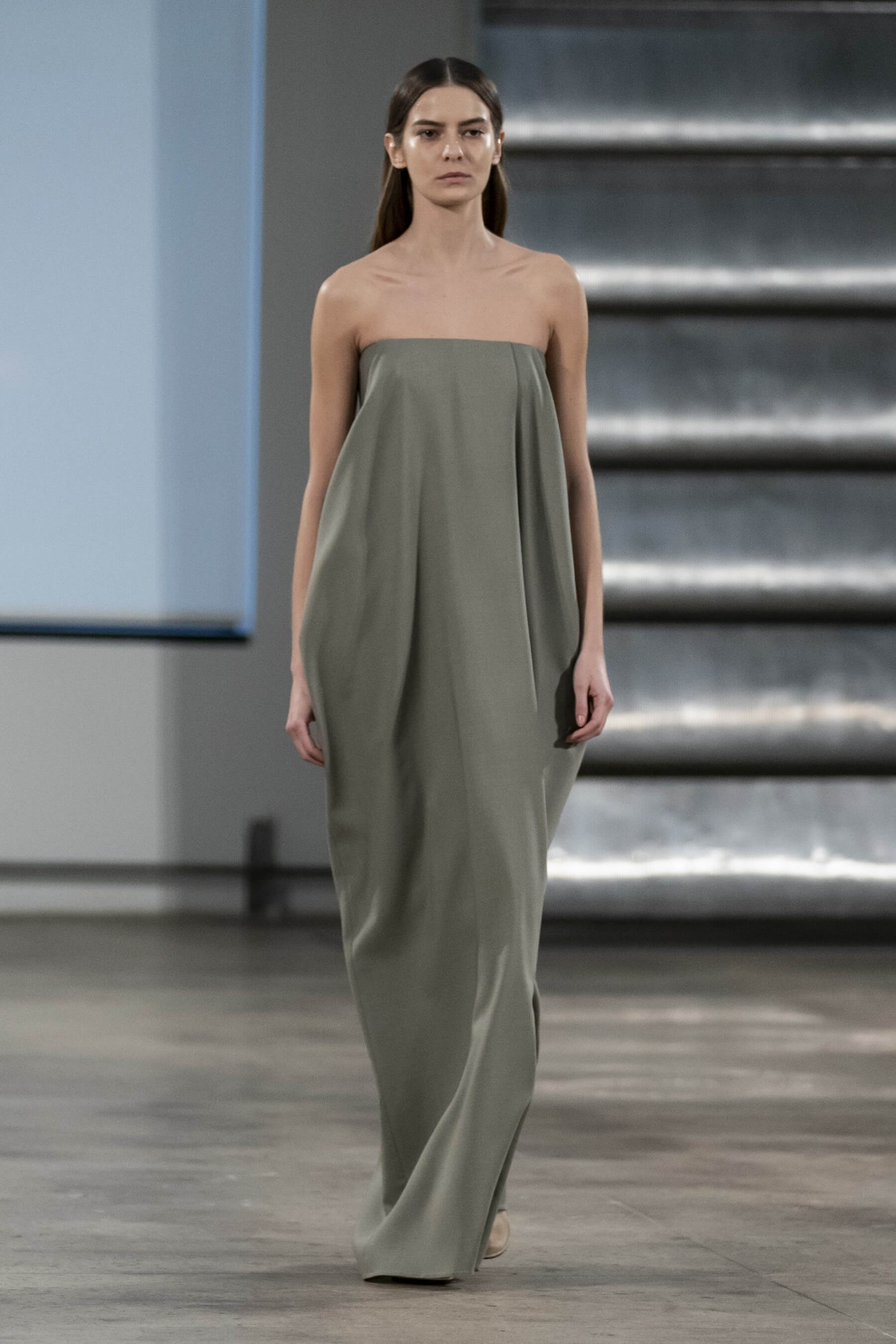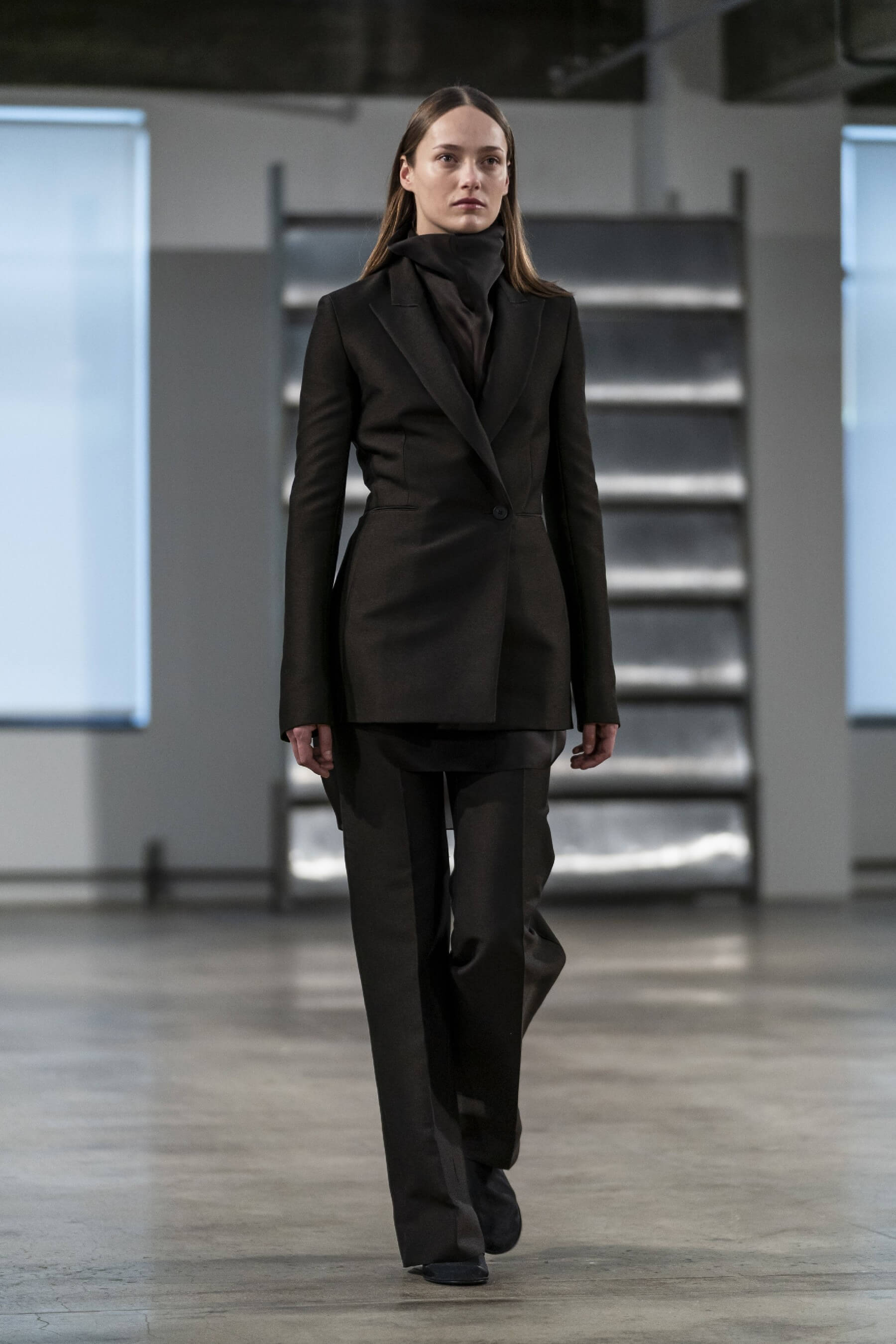 В новом силуэте пальто и жакетов акцент смещен на талию, а полочки приподняты на уровне груди в конструктивный объем, мягко обволакивающий тело. Еще одним ключевым элементом коллекции являются эффектные топы и свитера с цельнокроеными воротами, свободно опоясывающими шею, надетые поверх шелковых платьев с мягкими драпировками или под прямые сюртуки с широким плечом, ставшие классикой The Row.