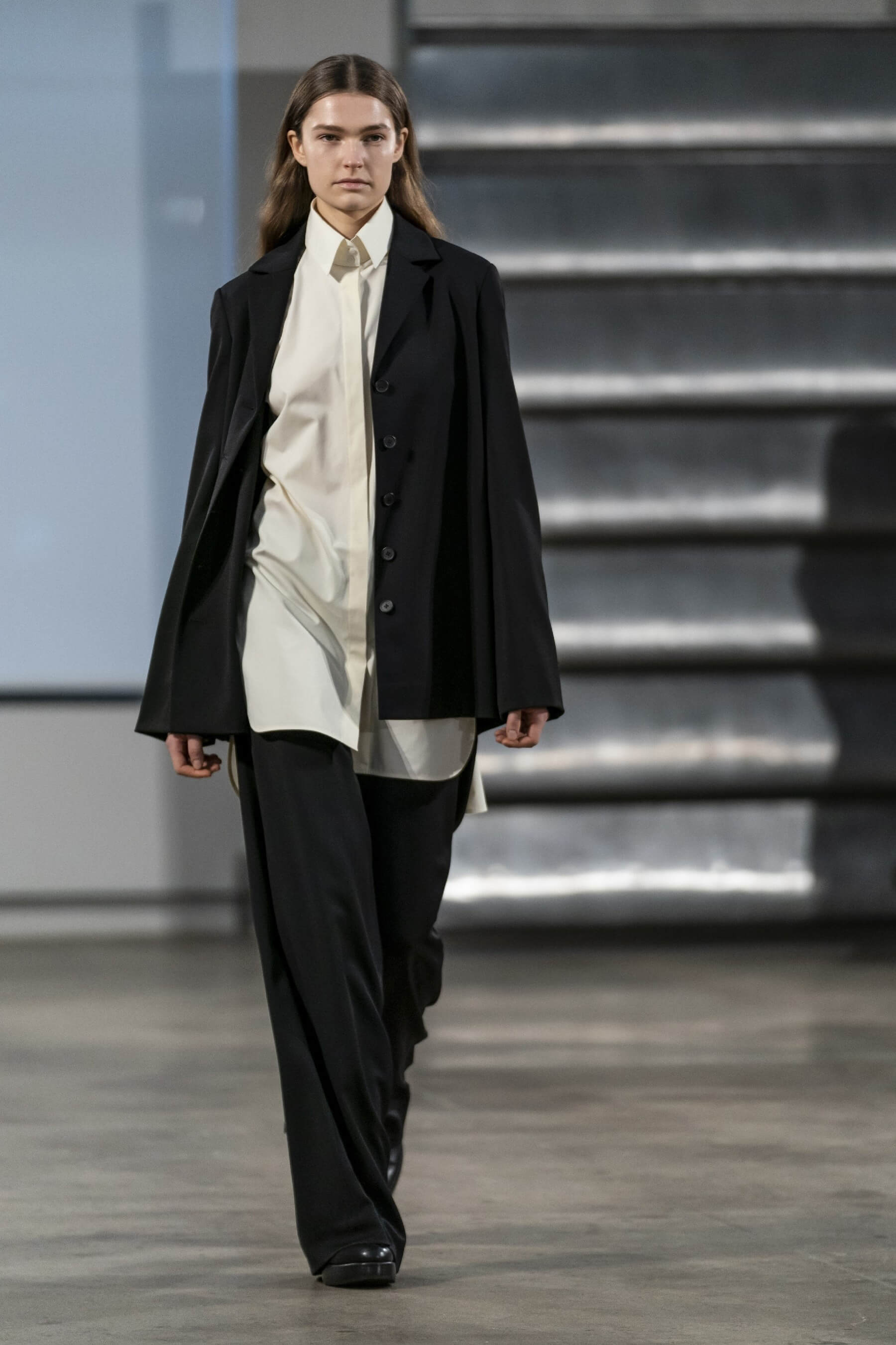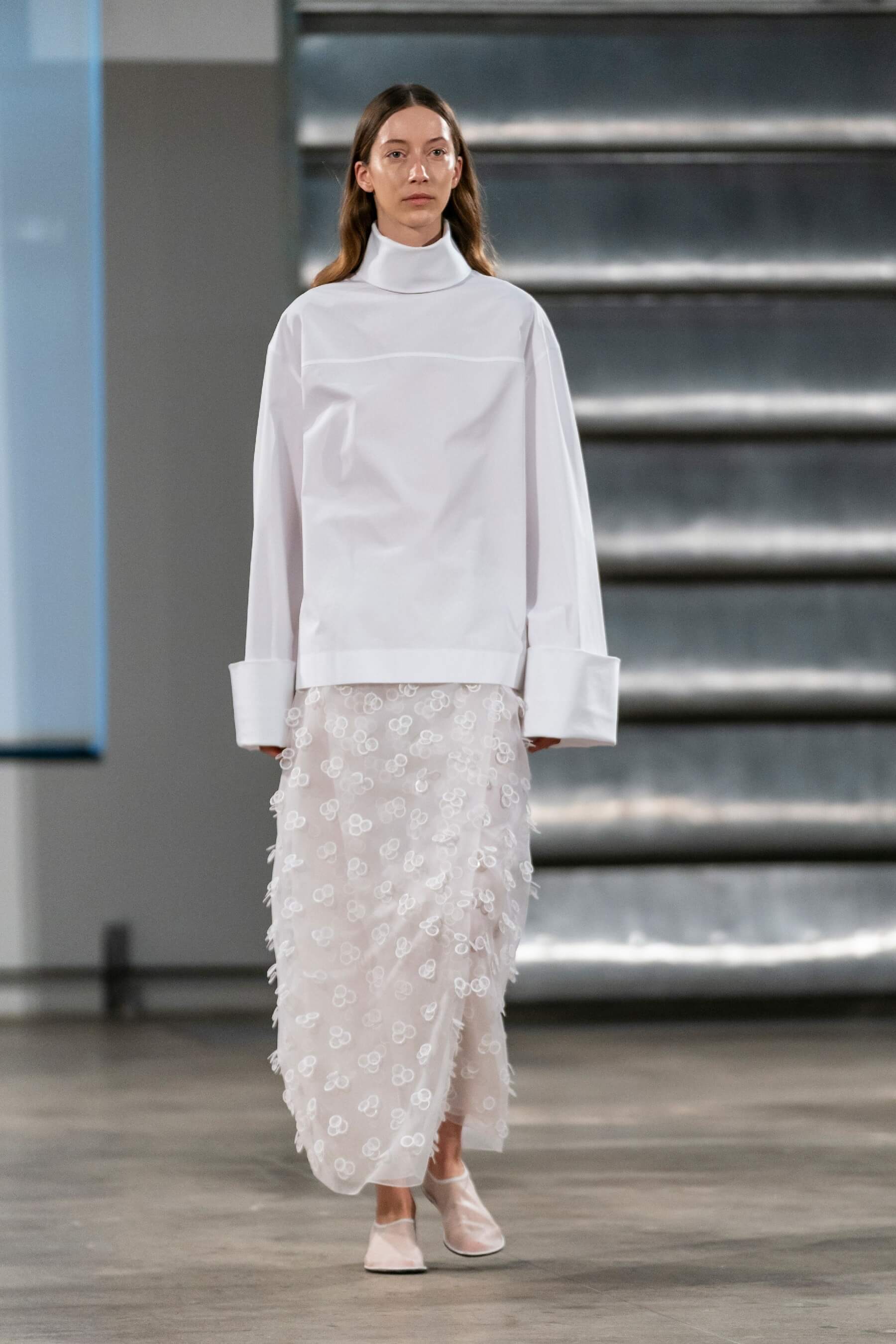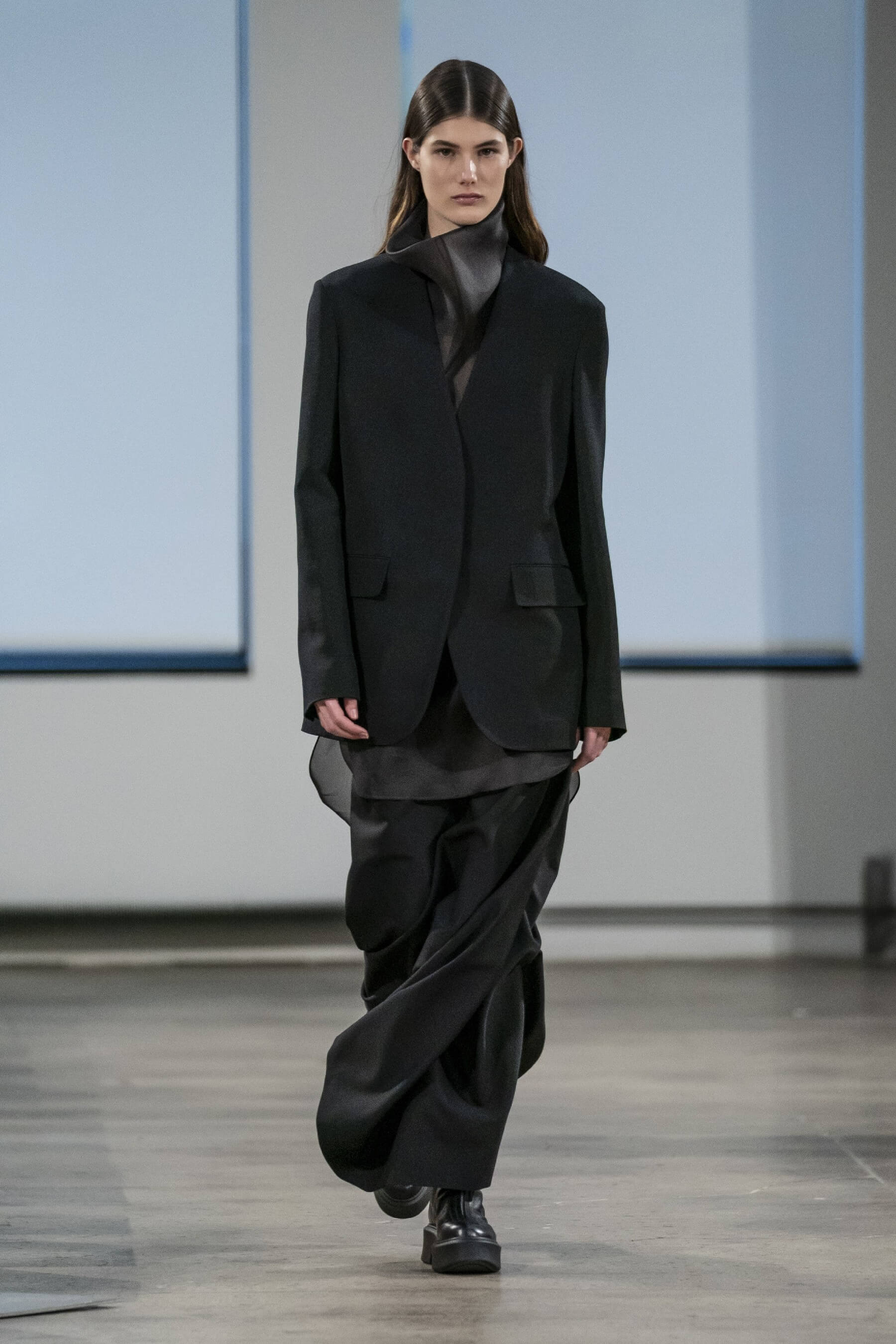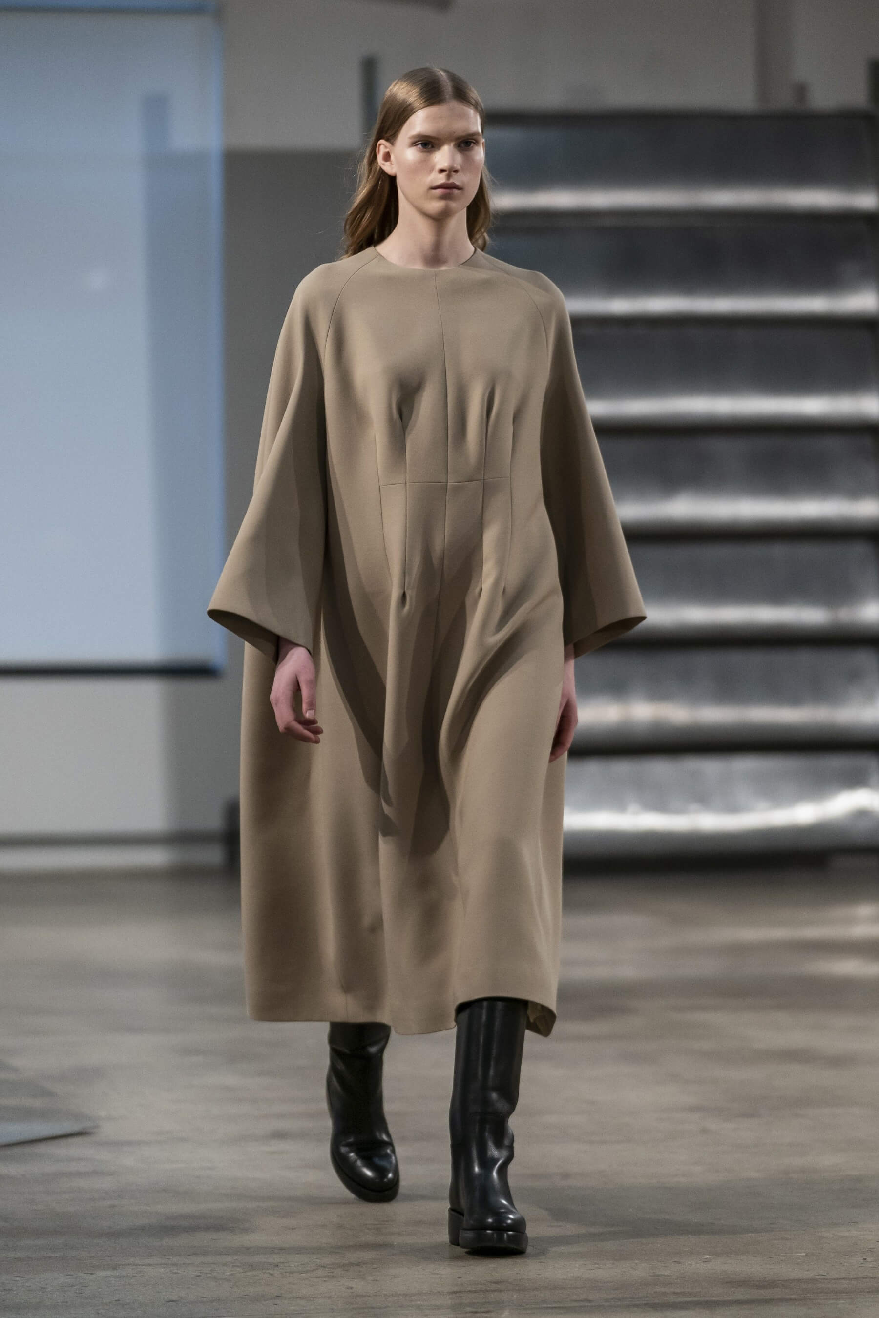 В новом силуэте пальто и жакетов акцент смещен на талию, а полочки приподняты на уровне груди в конструктивный объем, мягко обволакивающий тело. Еще одним ключевым элементом коллекции являются эффектные топы и свитера с цельнокроеными воротами, свободно опоясывающими шею, надетые поверх шелковых платьев с мягкими драпировками или под прямые сюртуки с широким плечом, ставшие классикой The Row.
