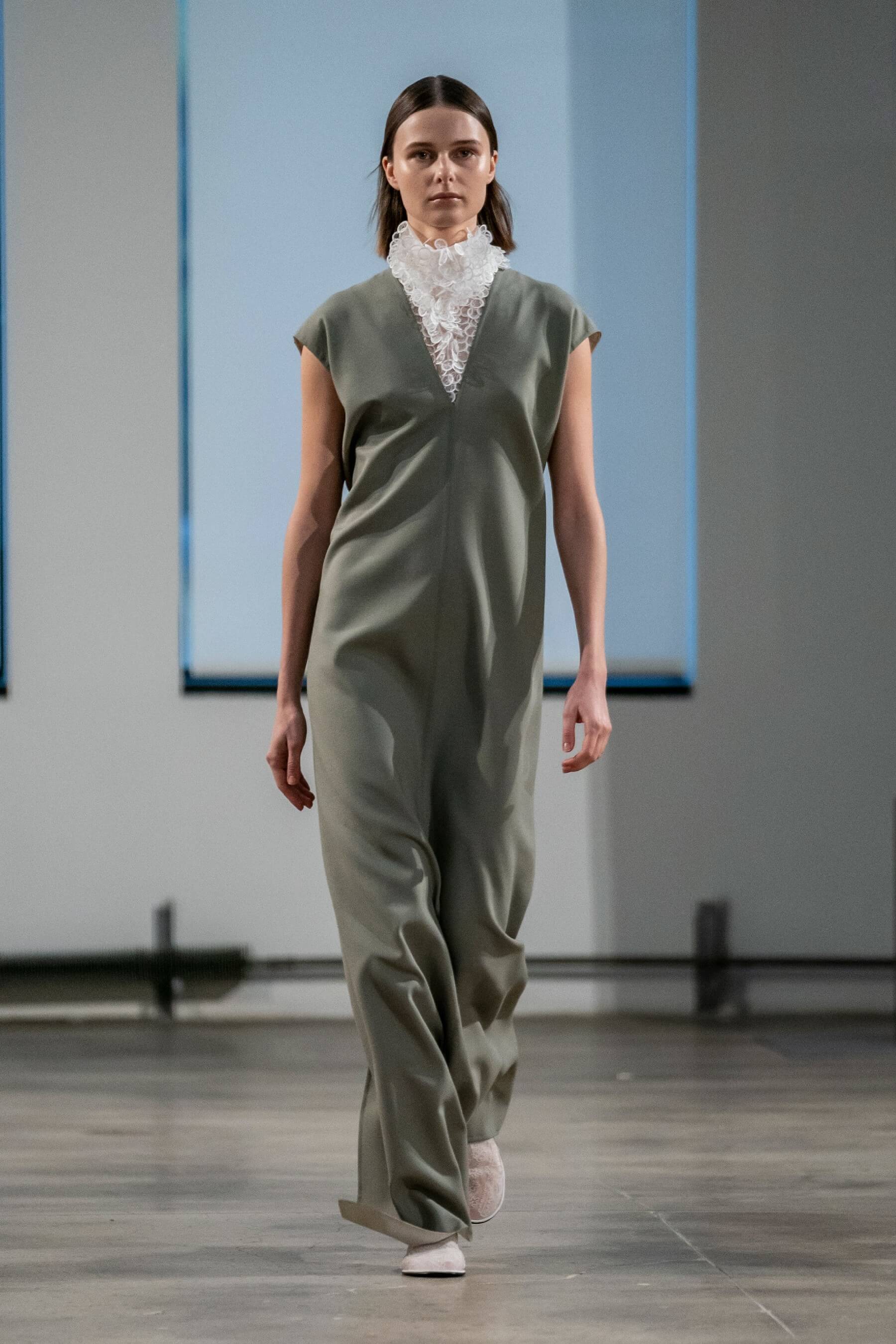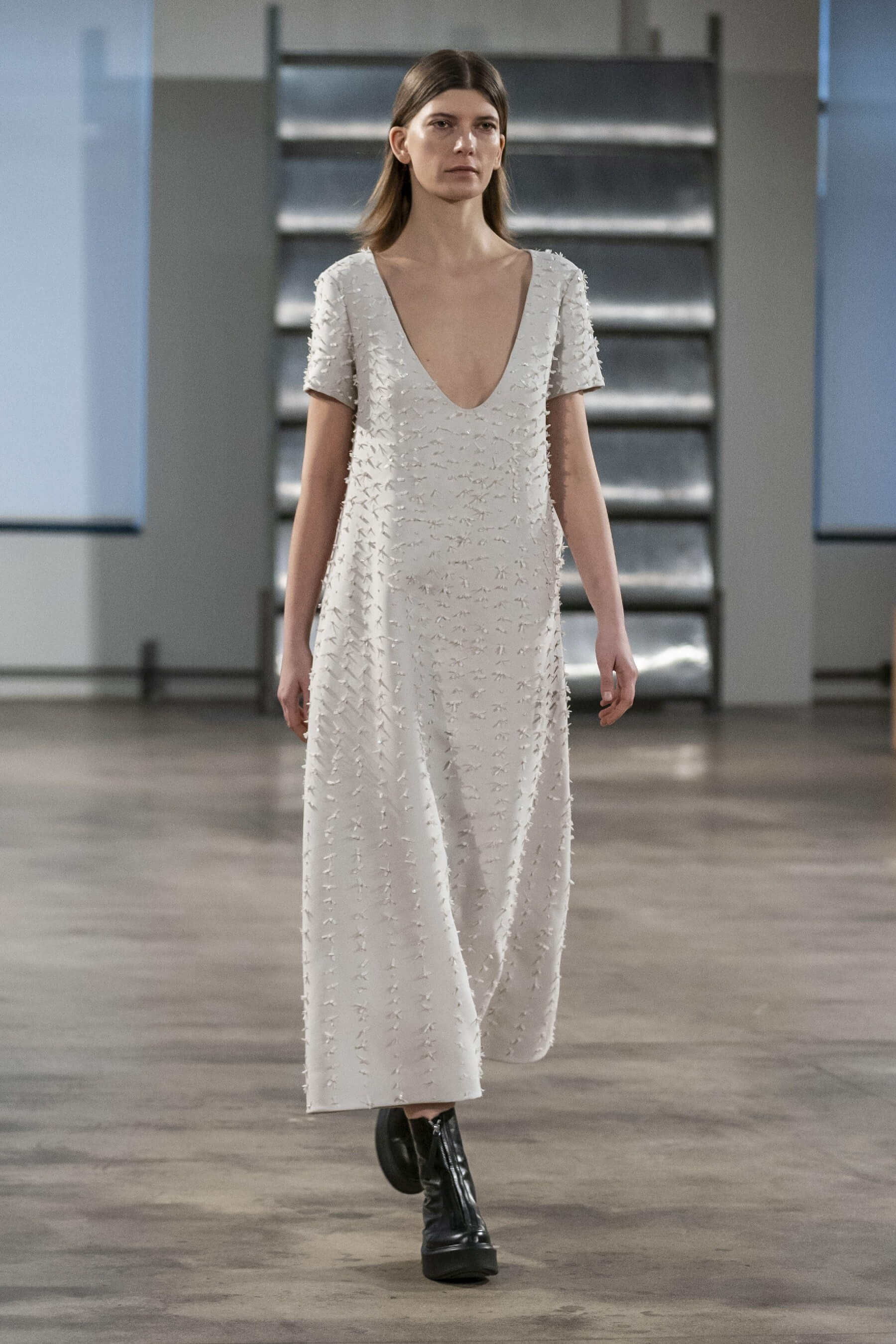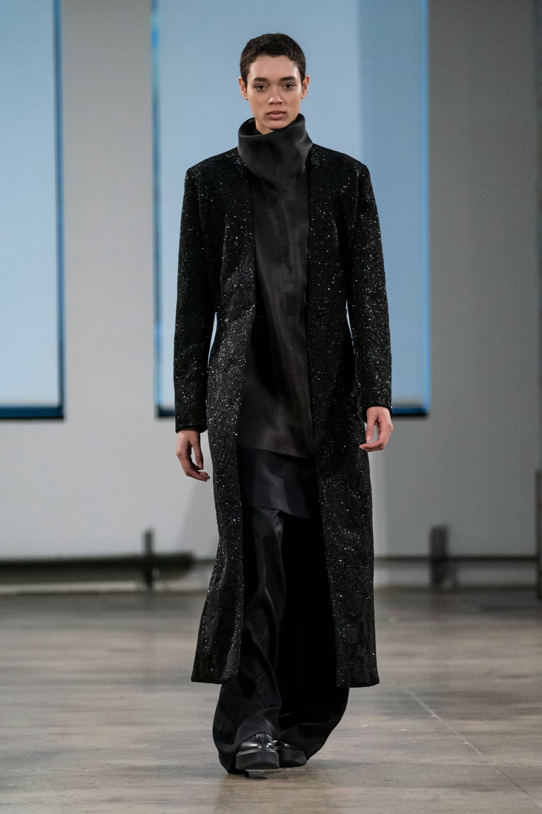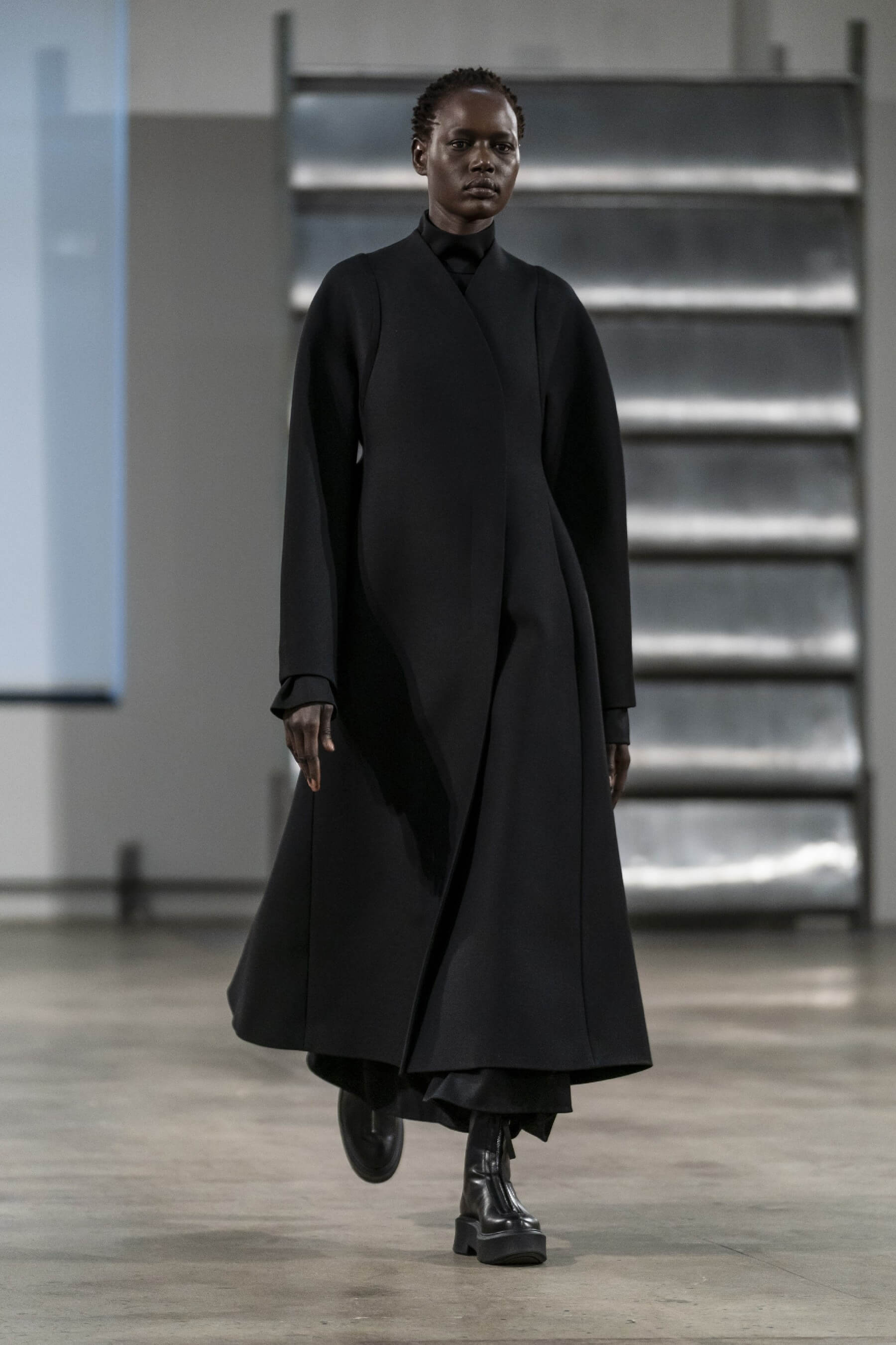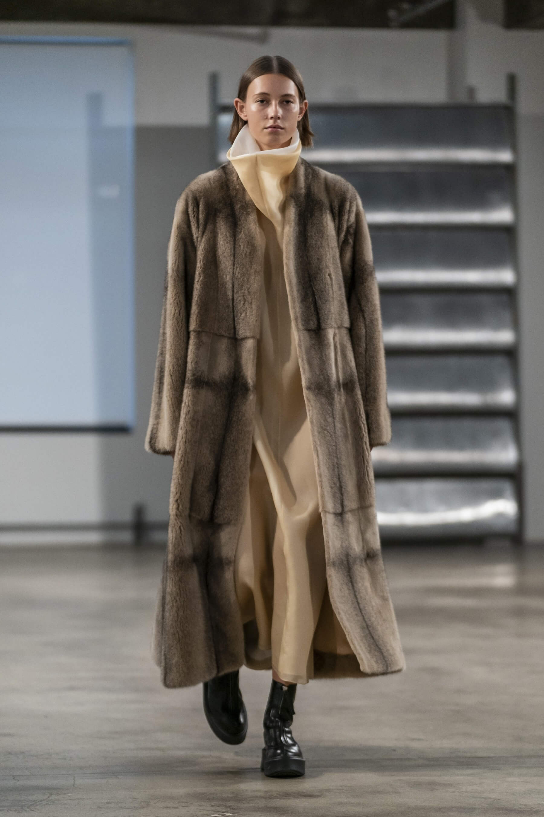В новом силуэте пальто и жакетов акцент смещен на талию, а полочки приподняты на уровне груди в конструктивный объем, мягко обволакивающий тело. Еще одним ключевым элементом коллекции являются эффектные топы и свитера с цельнокроеными воротами, свободно опоясывающими шею, надетые поверх шелковых платьев с мягкими драпировками или под прямые сюртуки с широким плечом, ставшие классикой The Row.