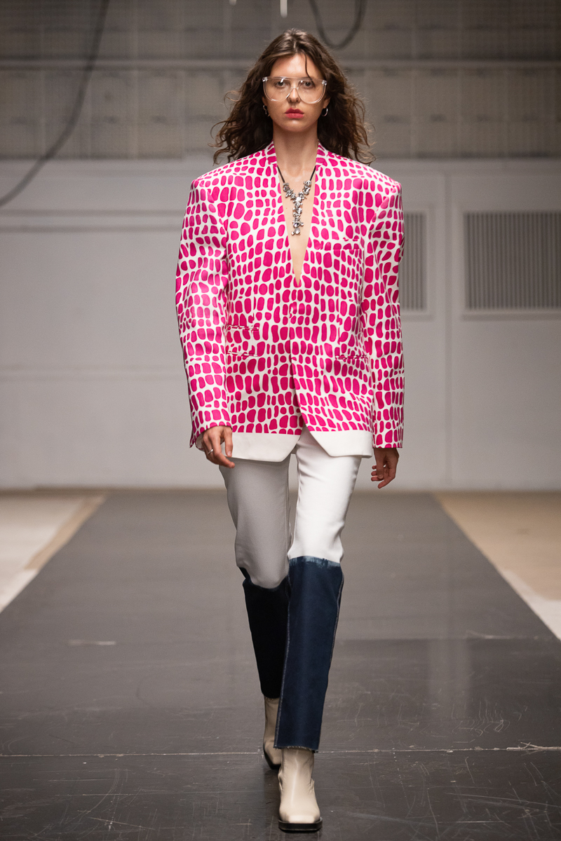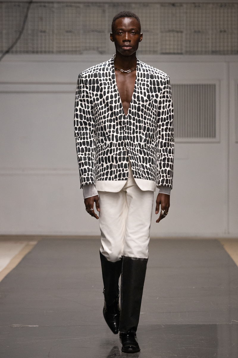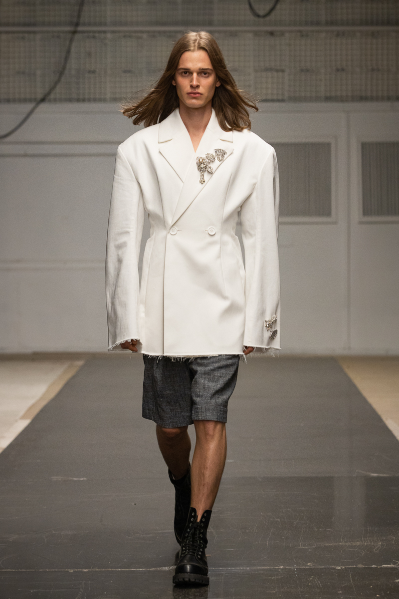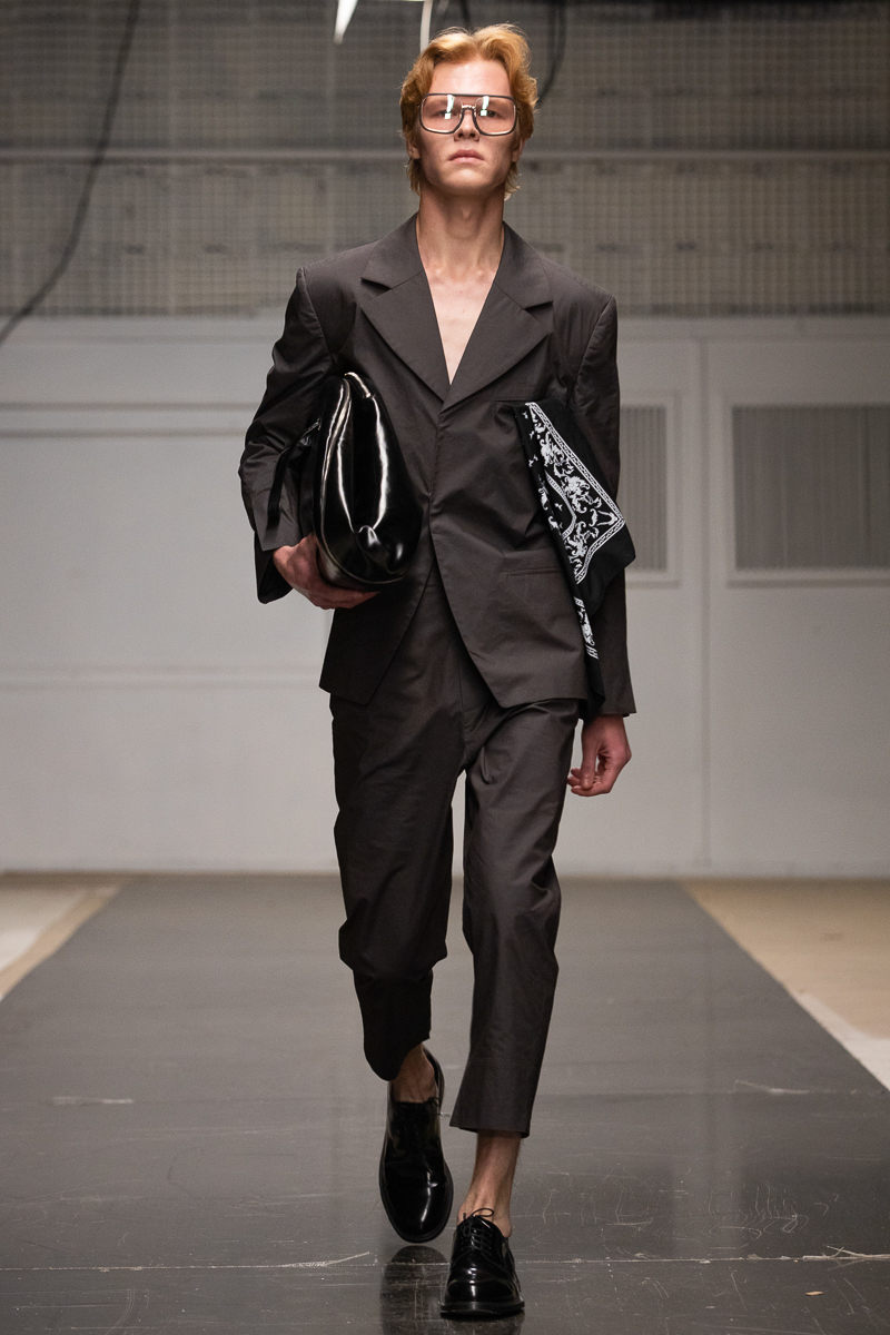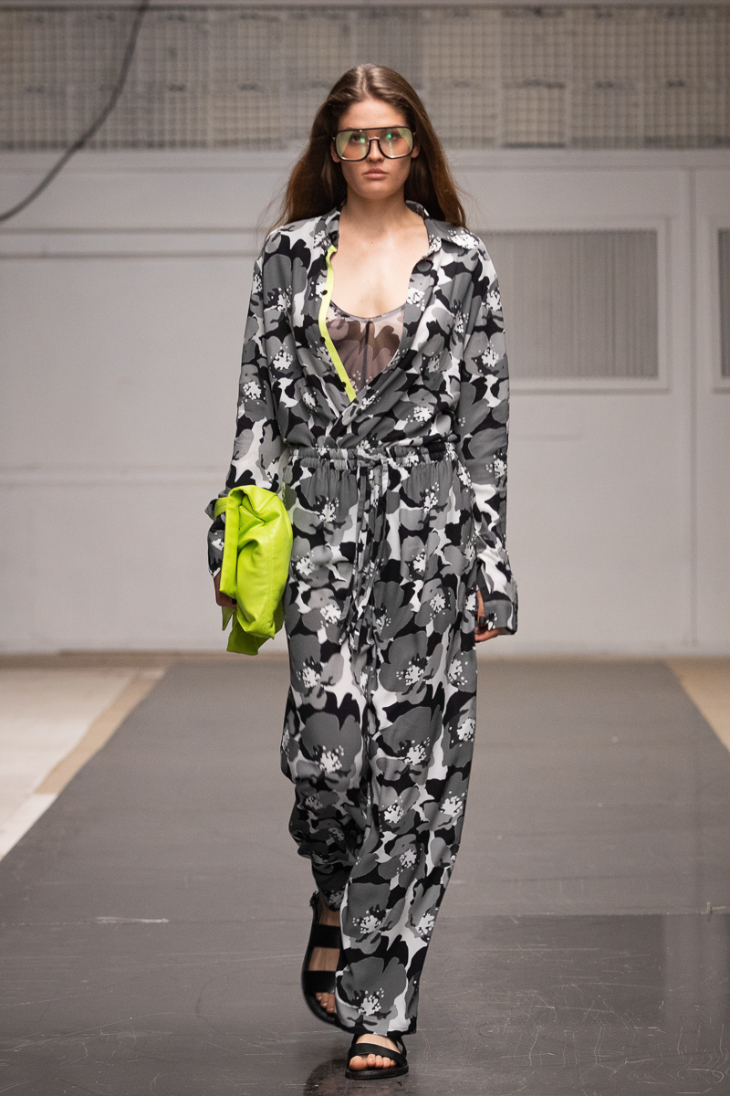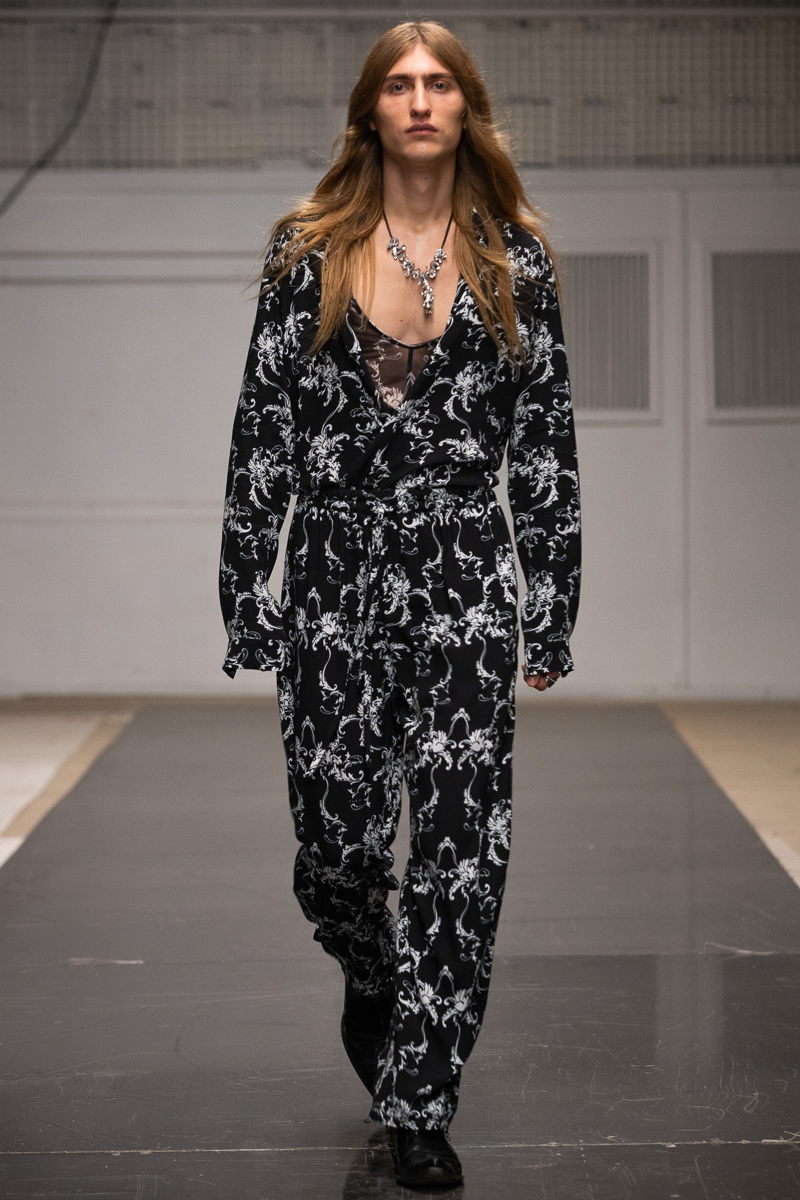 Дизайнер одел героиню бренда в графитовые сорочки и пальто, молочные костюмы с увеличенными пиджаками и трикотажные платья. Монохромный цветочный принт разбавили яркие всплески горохового, травянисто-зеленого и розового оттенков. В мужской линии коллекции — пятнистые пиджаки, лавандовые и фиалковые костюмы, а также кожаные шорты, которые эффектно дополняют полупрозрачные мужские топы и кремовые блейзеры. Вещи контрастны сами себе и в то же время составляют единую гармонию фактуры, силуэтов и цветовой гаммы.