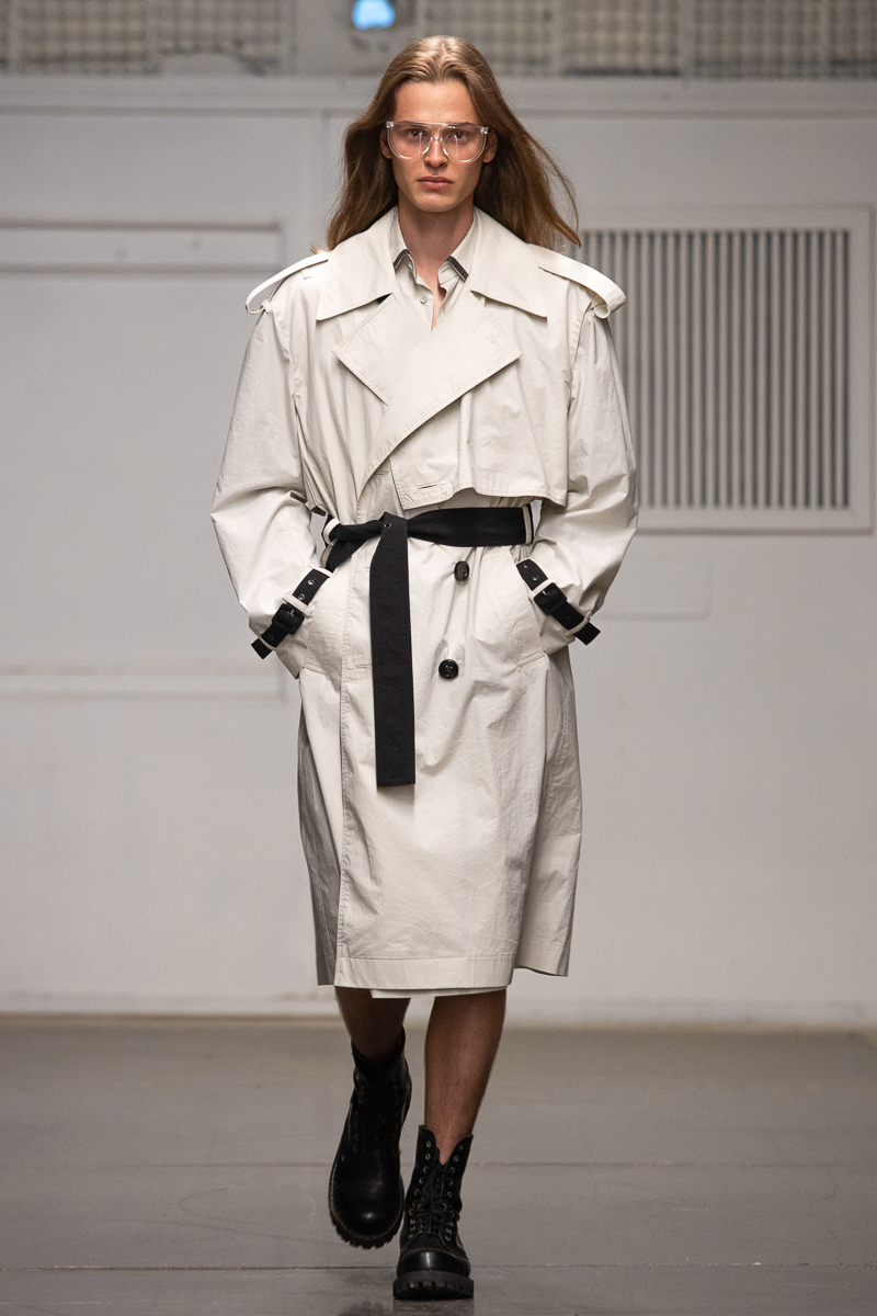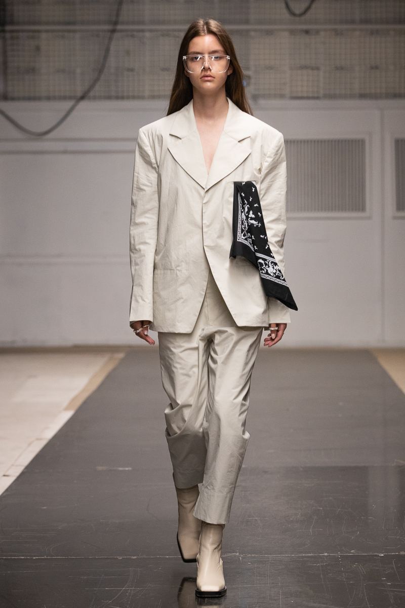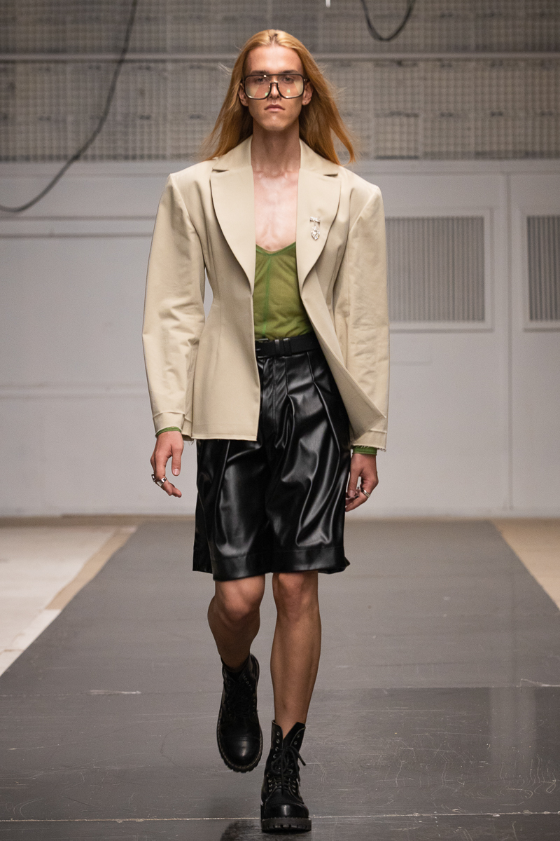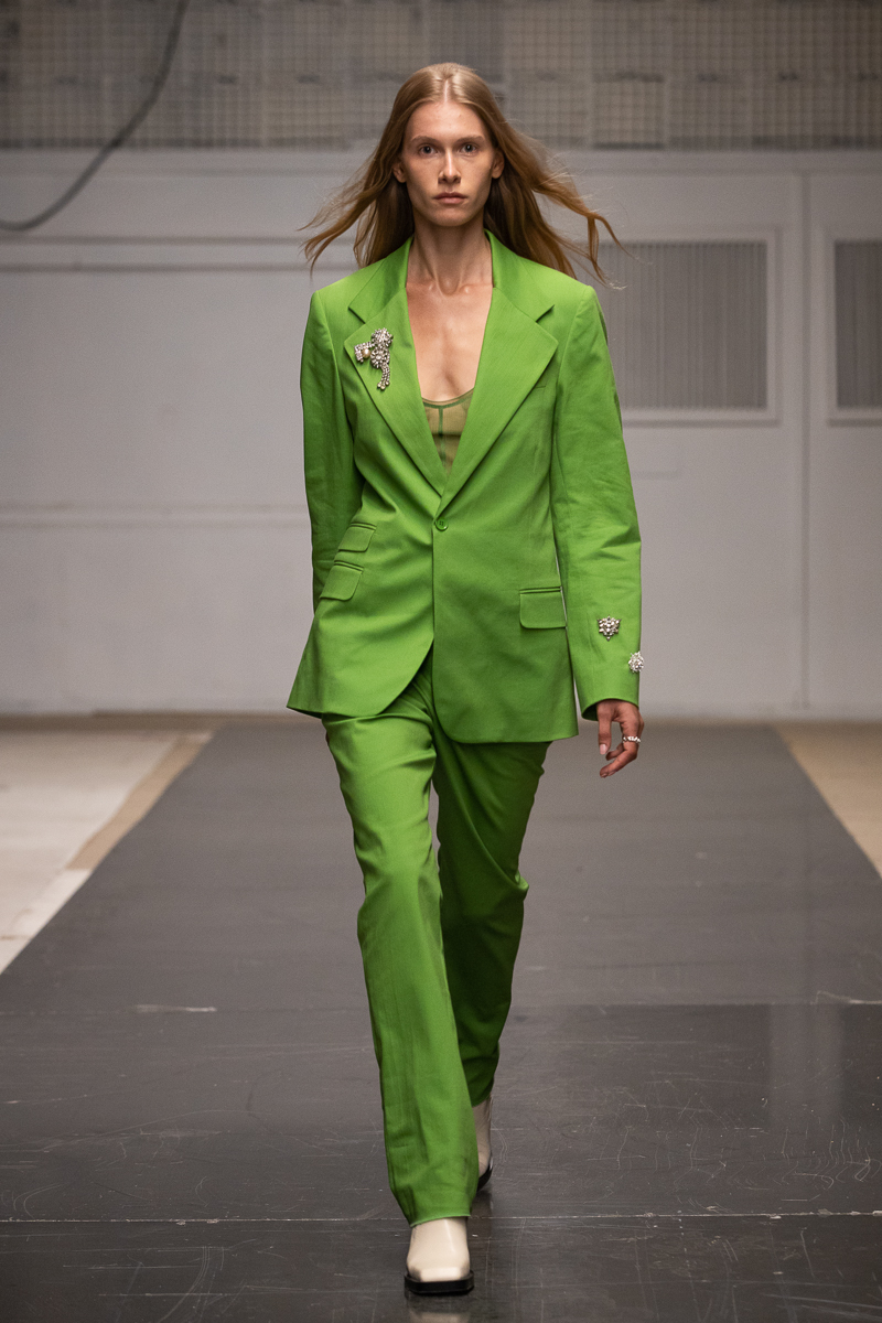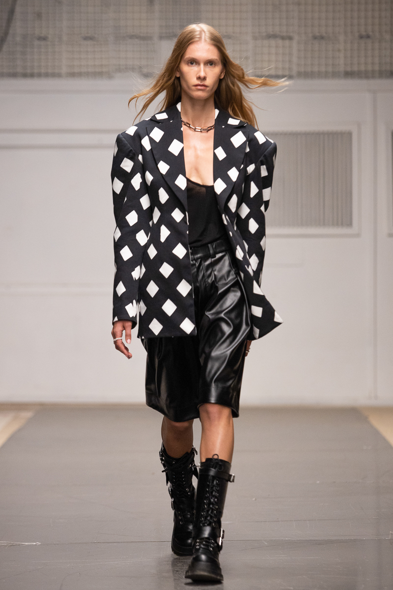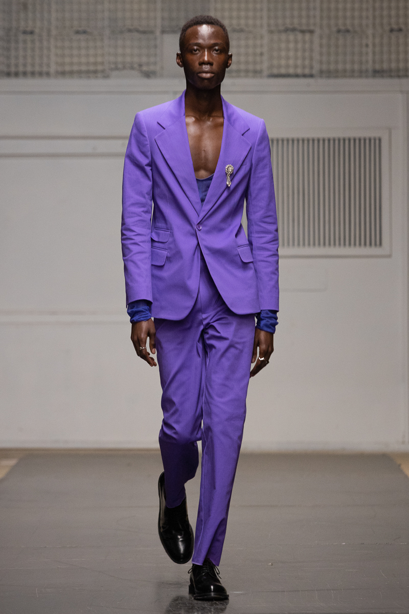 Дизайнер одел героиню бренда в графитовые сорочки и пальто, молочные костюмы с увеличенными пиджаками и трикотажные платья. Монохромный цветочный принт разбавили яркие всплески горохового, травянисто-зеленого и розового оттенков. В мужской линии коллекции — пятнистые пиджаки, лавандовые и фиалковые костюмы, а также кожаные шорты, которые эффектно дополняют полупрозрачные мужские топы и кремовые блейзеры. Вещи контрастны сами себе и в то же время составляют единую гармонию фактуры, силуэтов и цветовой гаммы.