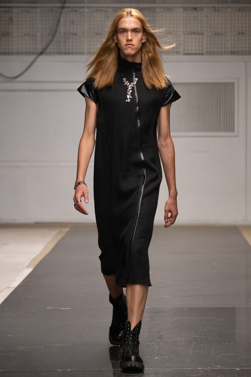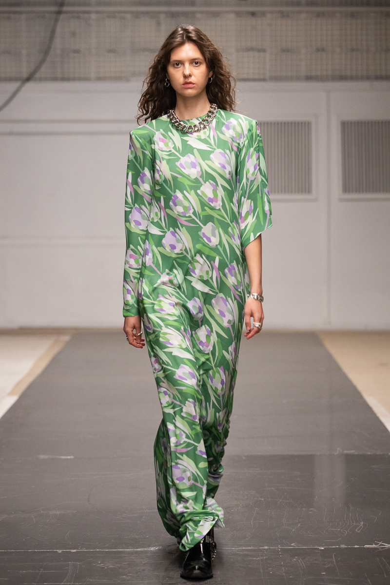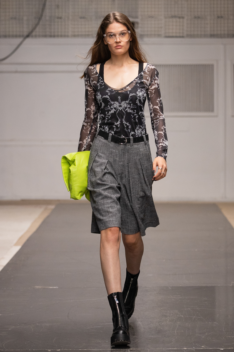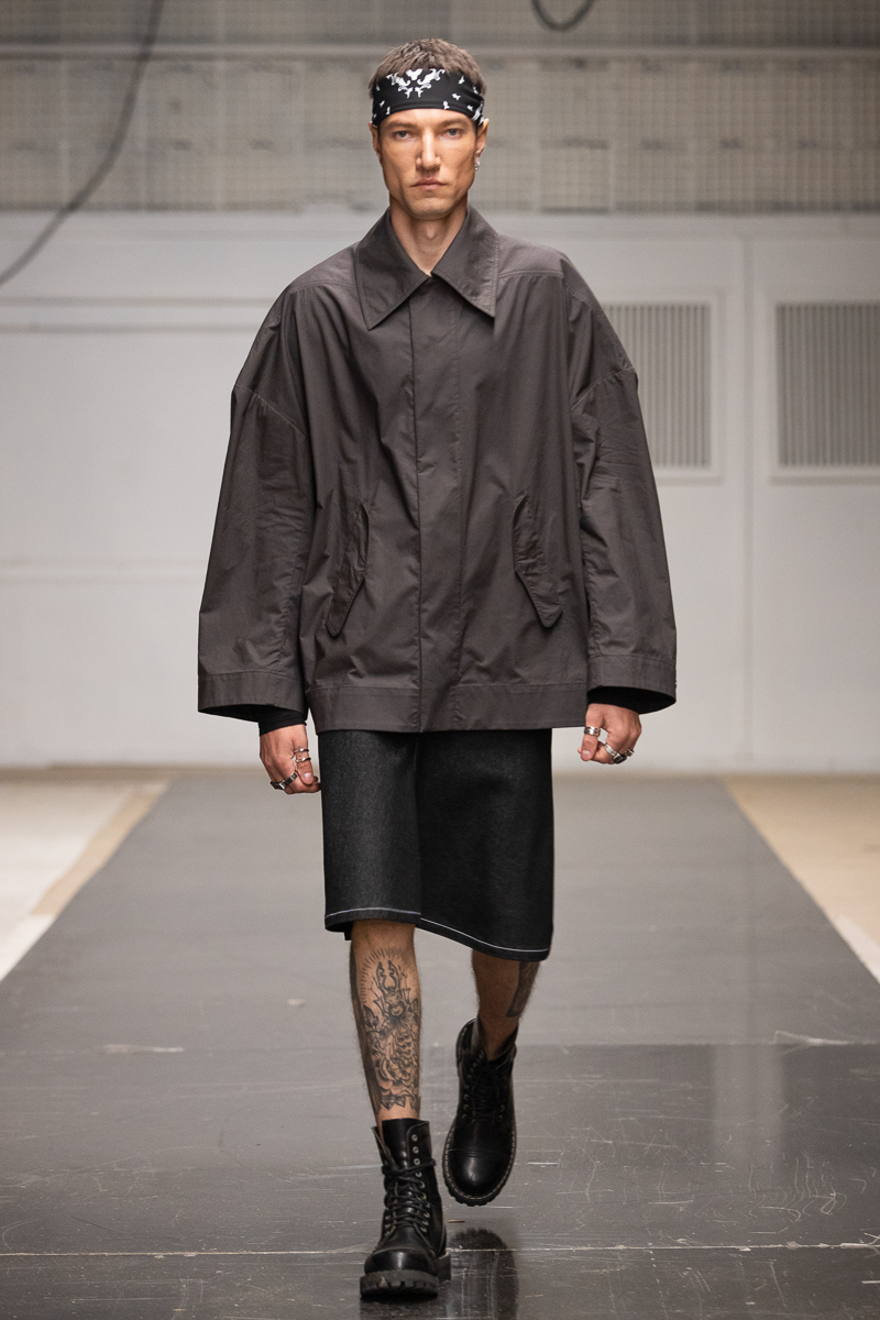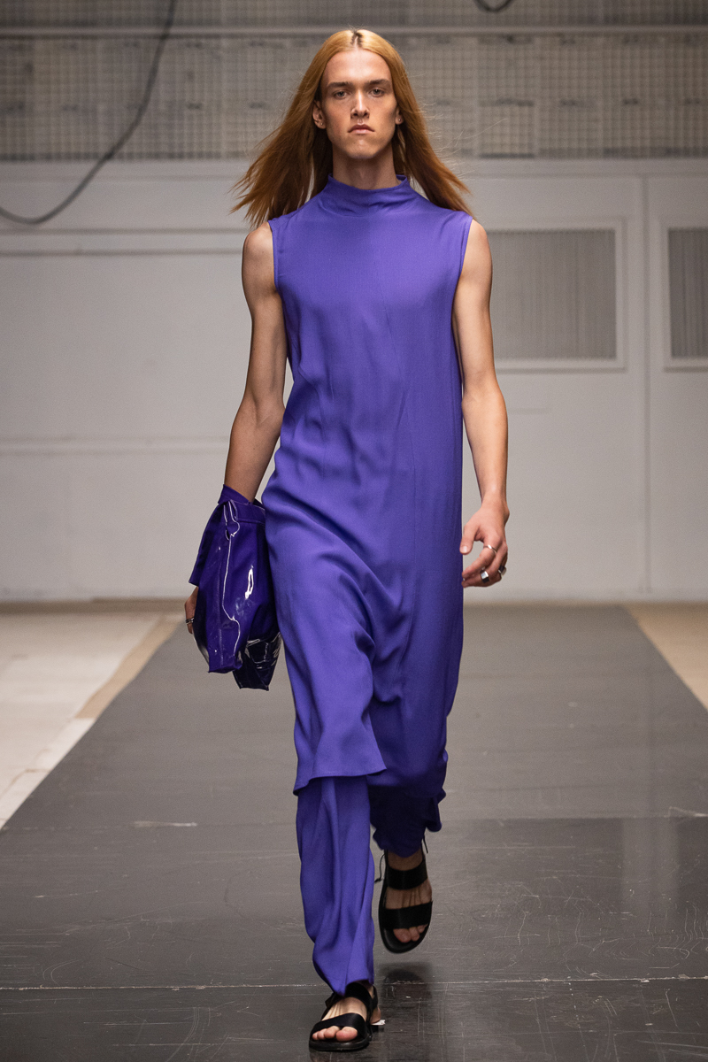 Дизайнер одел героиню бренда в графитовые сорочки и пальто, молочные костюмы с увеличенными пиджаками и трикотажные платья. Монохромный цветочный принт разбавили яркие всплески горохового, травянисто-зеленого и розового оттенков. В мужской линии коллекции — пятнистые пиджаки, лавандовые и фиалковые костюмы, а также кожаные шорты, которые эффектно дополняют полупрозрачные мужские топы и кремовые блейзеры. Вещи контрастны сами себе и в то же время составляют единую гармонию фактуры, силуэтов и цветовой гаммы.
