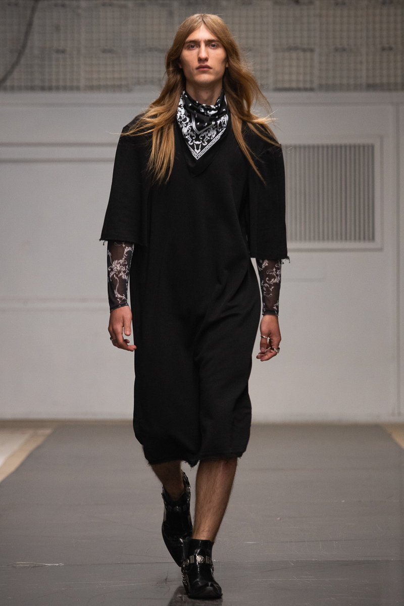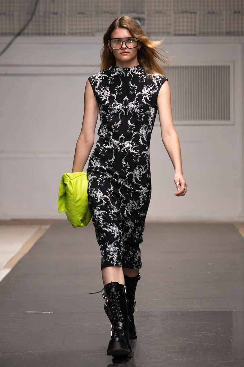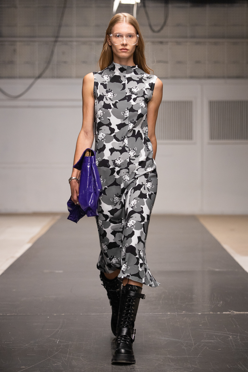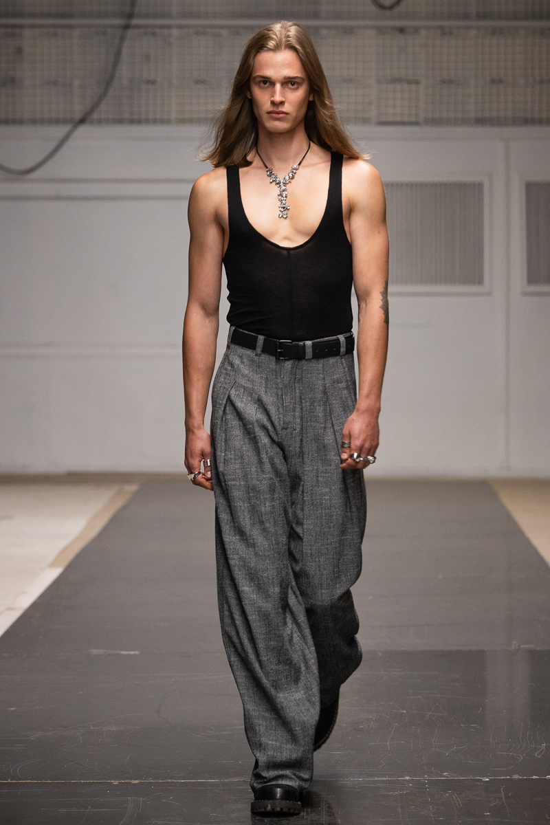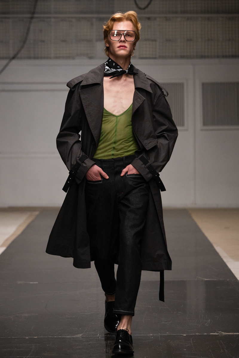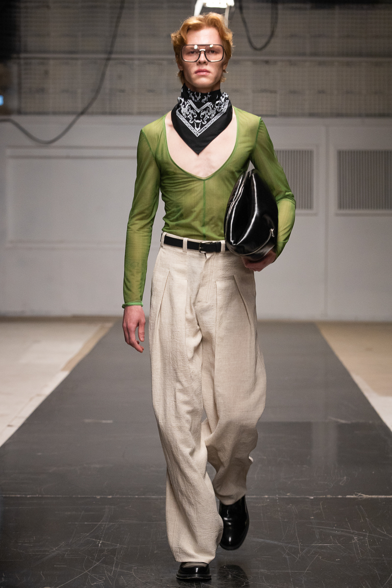 Дизайнер одел героиню бренда в графитовые сорочки и пальто, молочные костюмы с увеличенными пиджаками и трикотажные платья. Монохромный цветочный принт разбавили яркие всплески горохового, травянисто-зеленого и розового оттенков. В мужской линии коллекции — пятнистые пиджаки, лавандовые и фиалковые костюмы, а также кожаные шорты, которые эффектно дополняют полупрозрачные мужские топы и кремовые блейзеры. Вещи контрастны сами себе и в то же время составляют единую гармонию фактуры, силуэтов и цветовой гаммы.