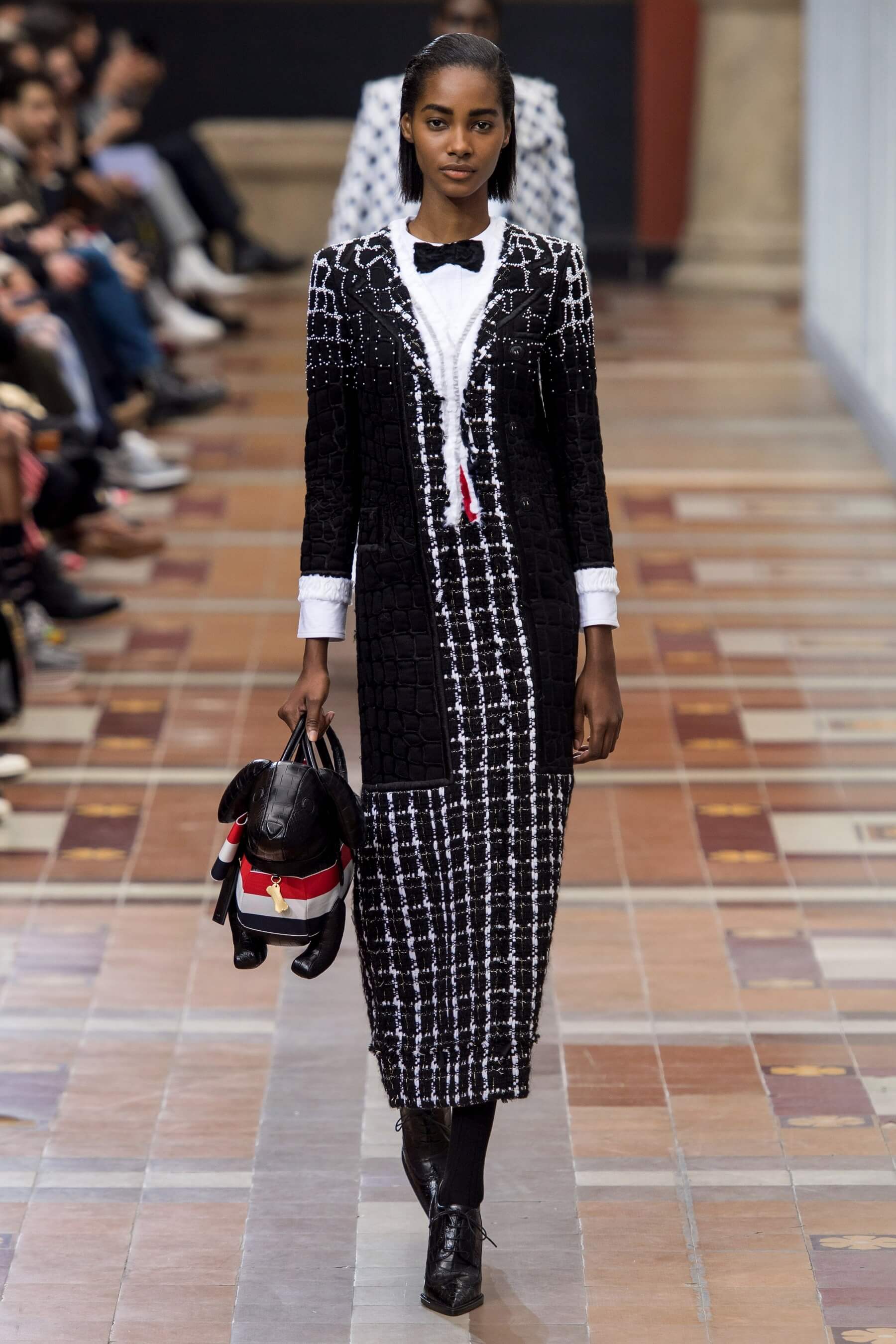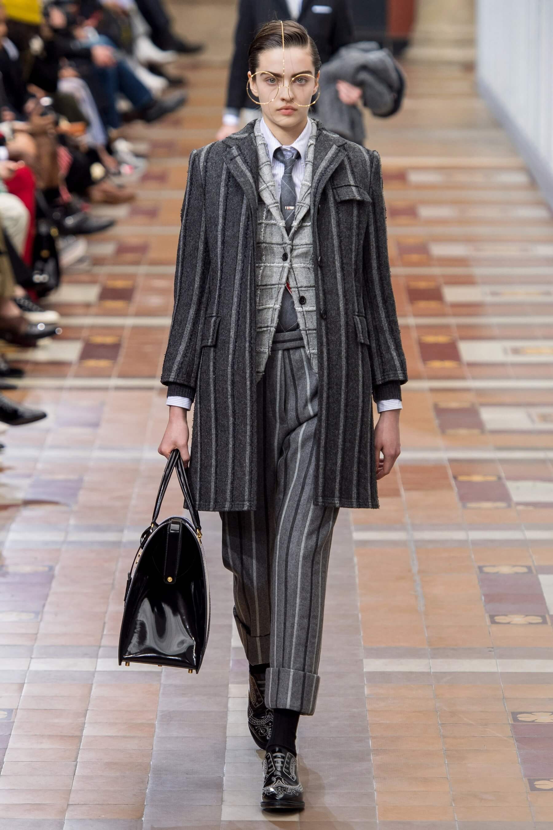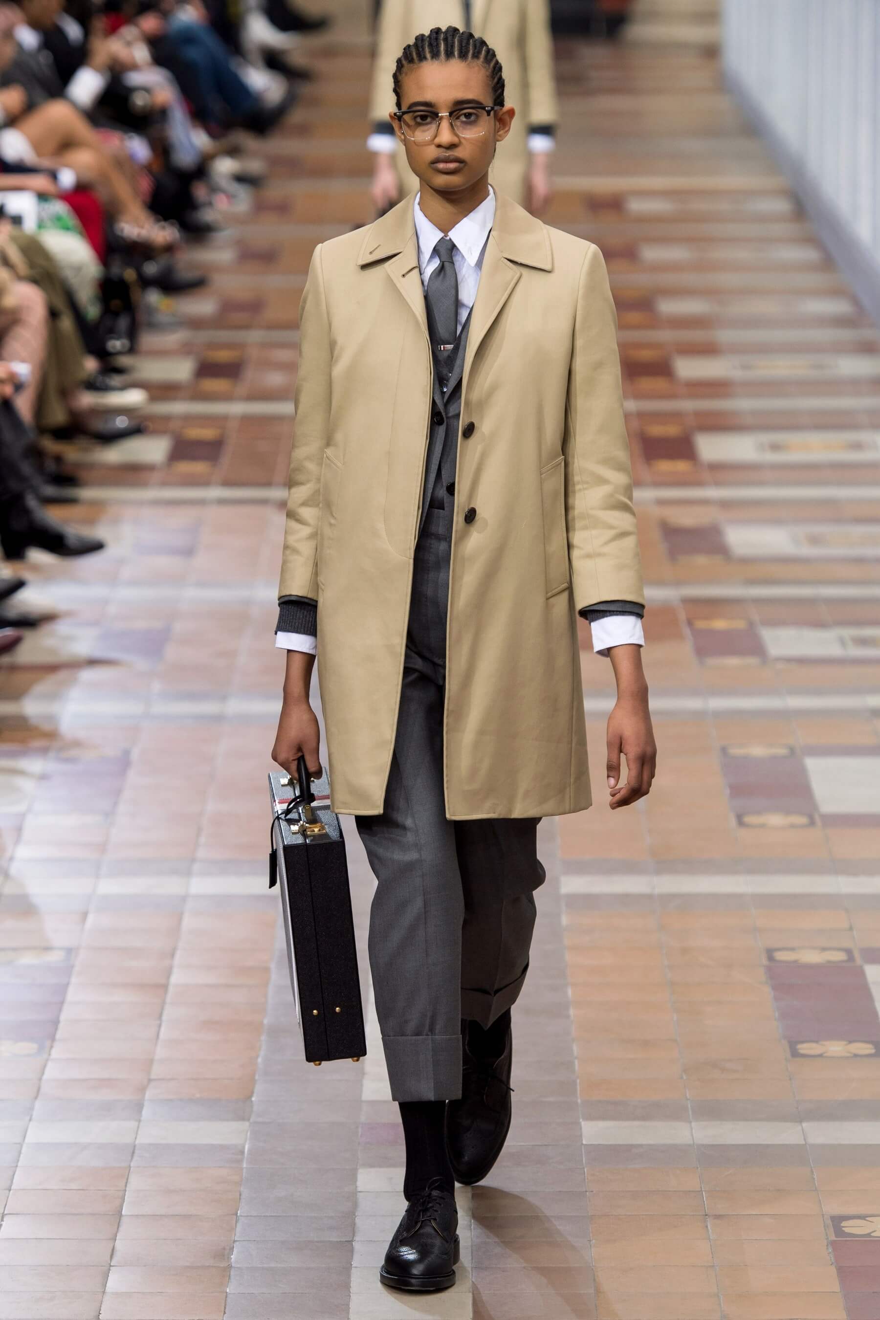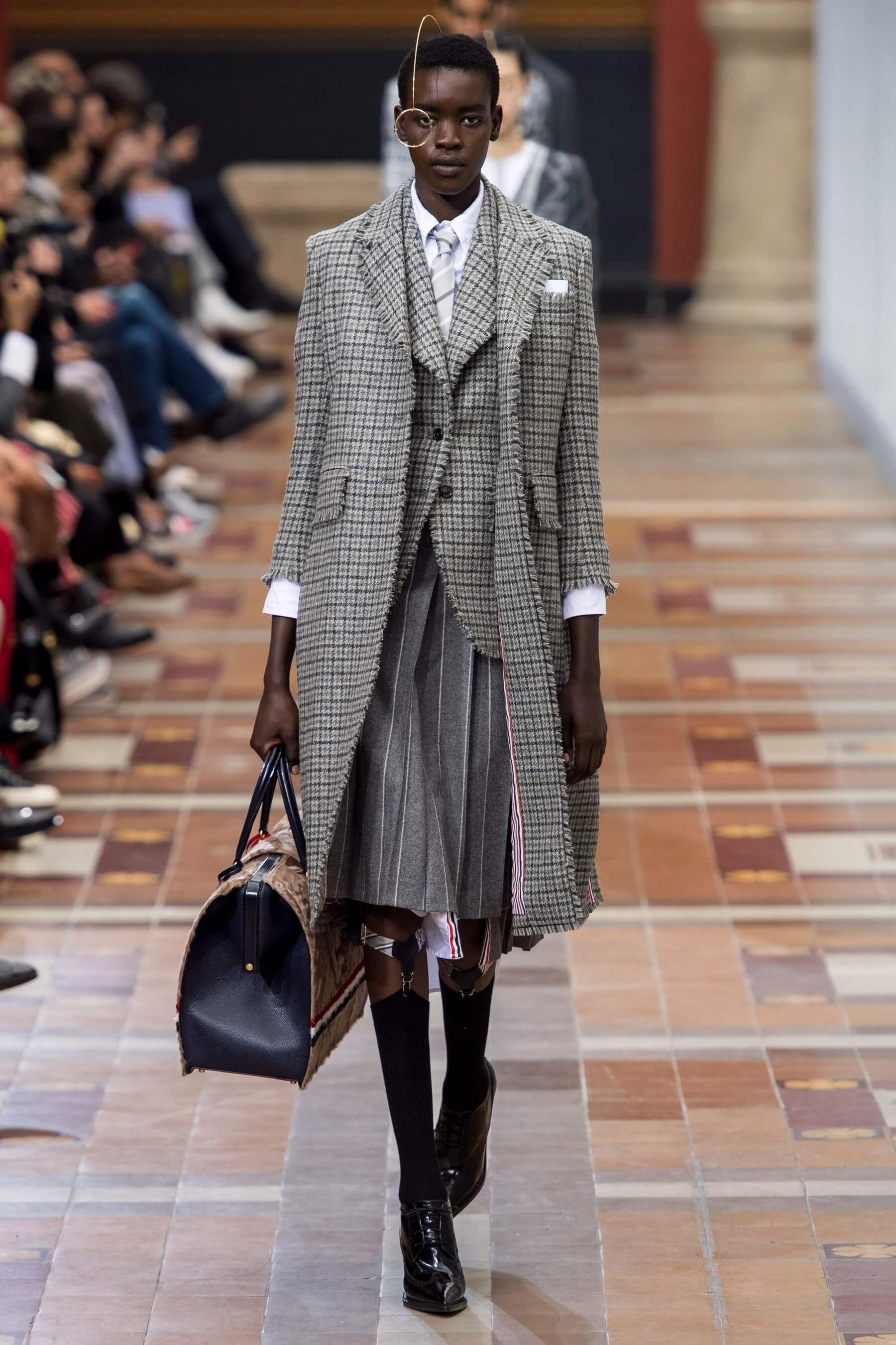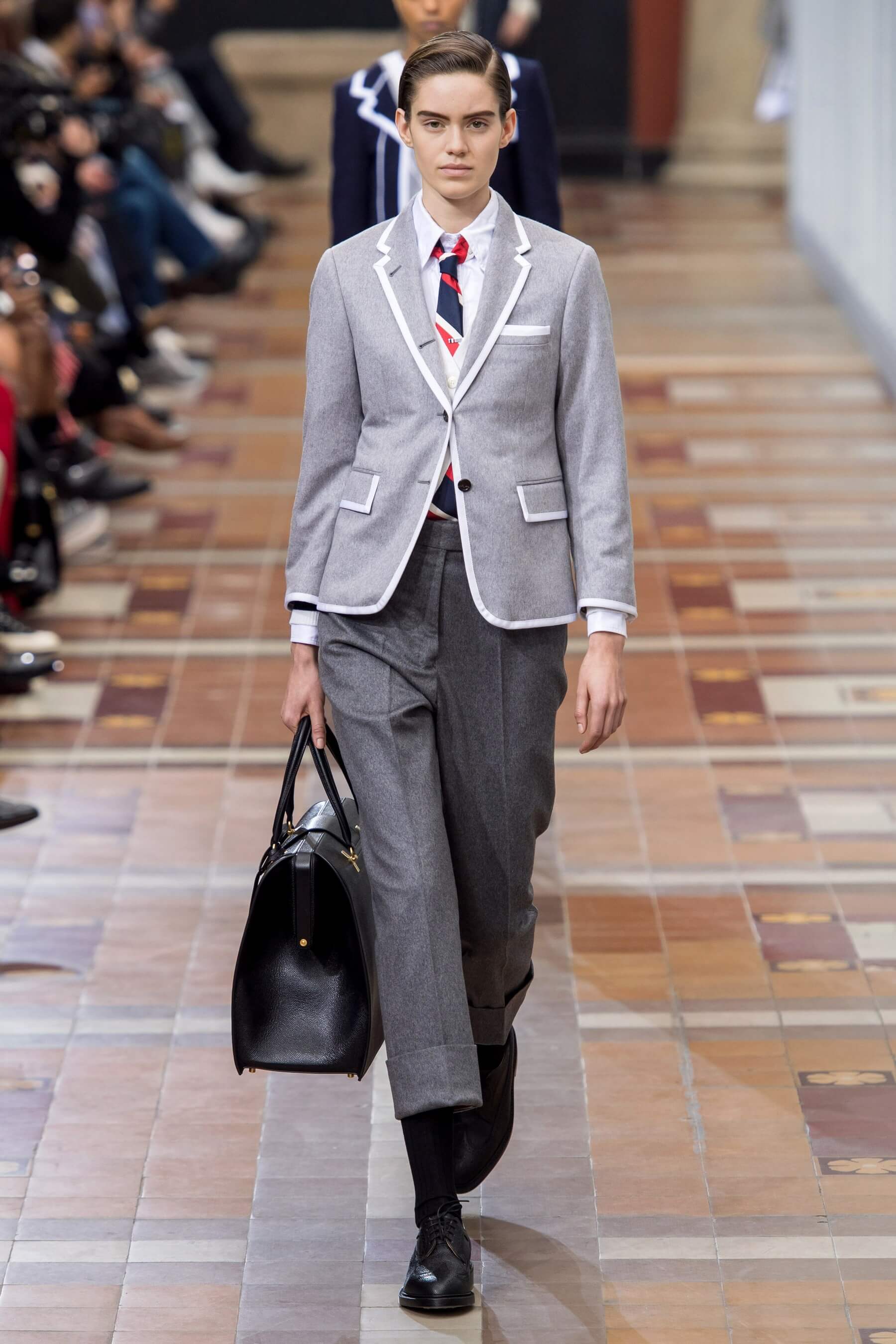 Показ Thom Browne под названием Working Girl прошел в парижской Национальной высшей школе изящных искусств. Внутри одного из залов был выстроен импровизированный офис с рабочими местами и печатными машинками. Модели заходили внутрь, рассаживались за столы и набирали тексты, после чего вставали и расходились по подиуму — в строгих серых костюмах, бежевых макинтошах, вязанных на мужской манер кардиганах, с дипломатами в руках и в гольфах, закрепленных на ногах мужскими подтяжками.