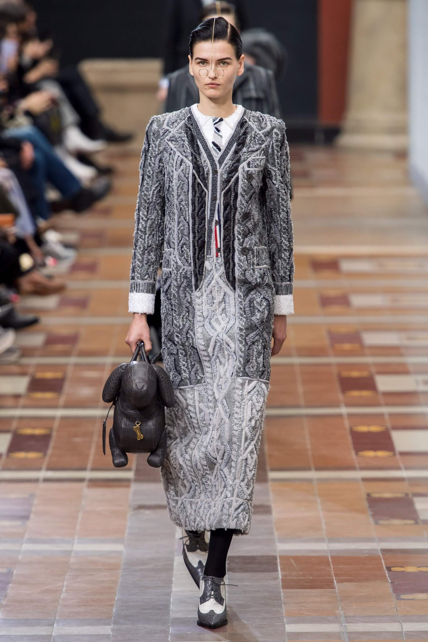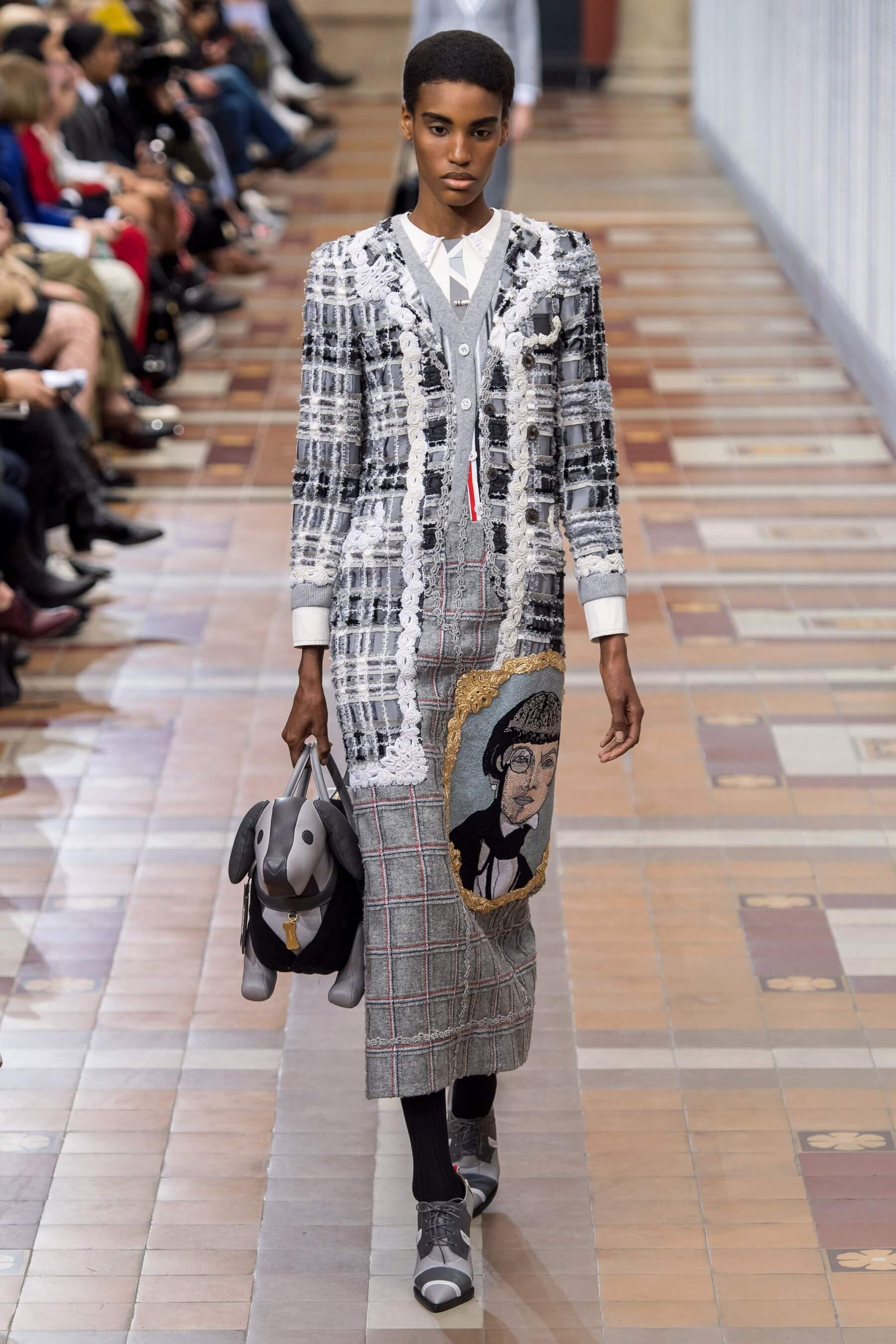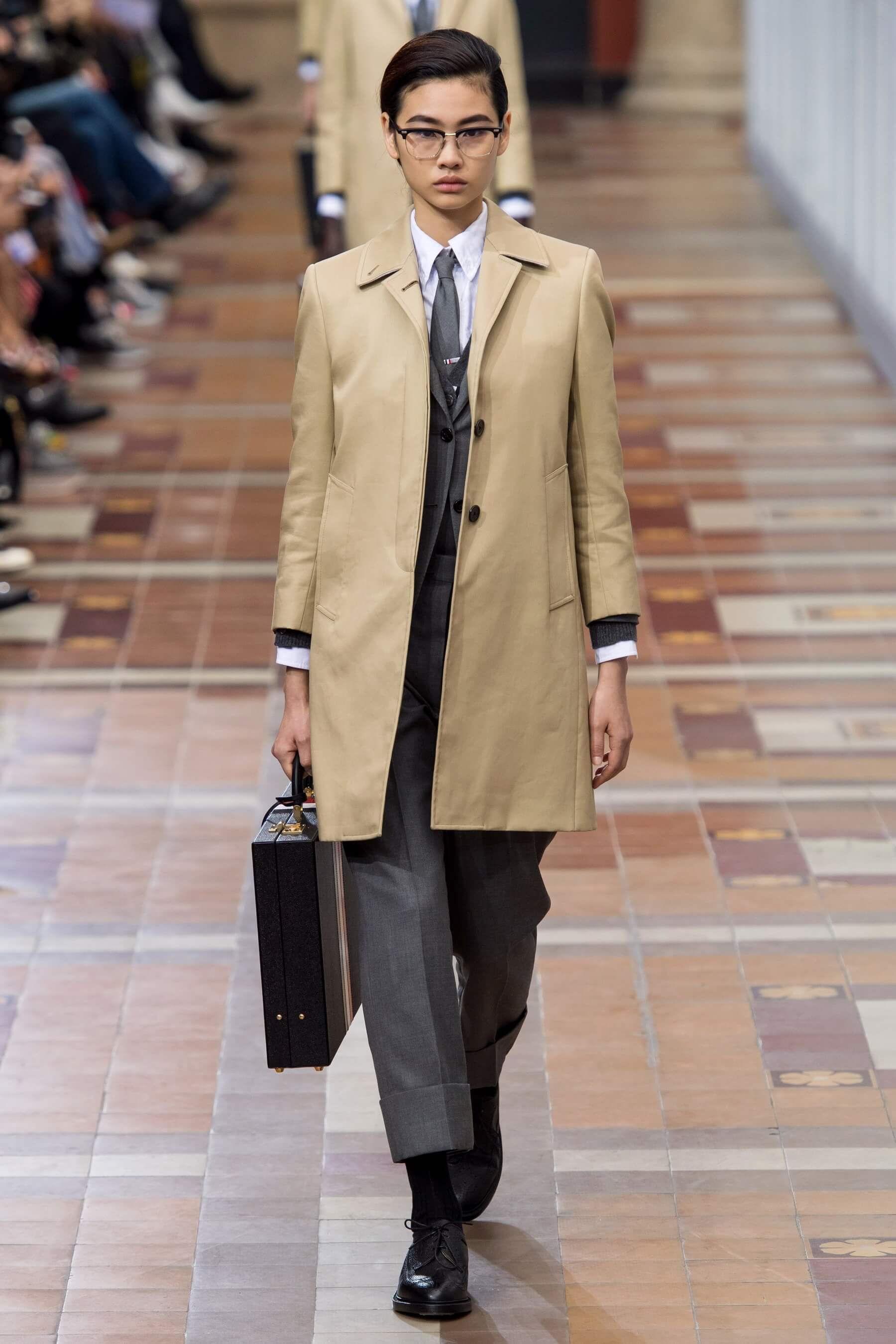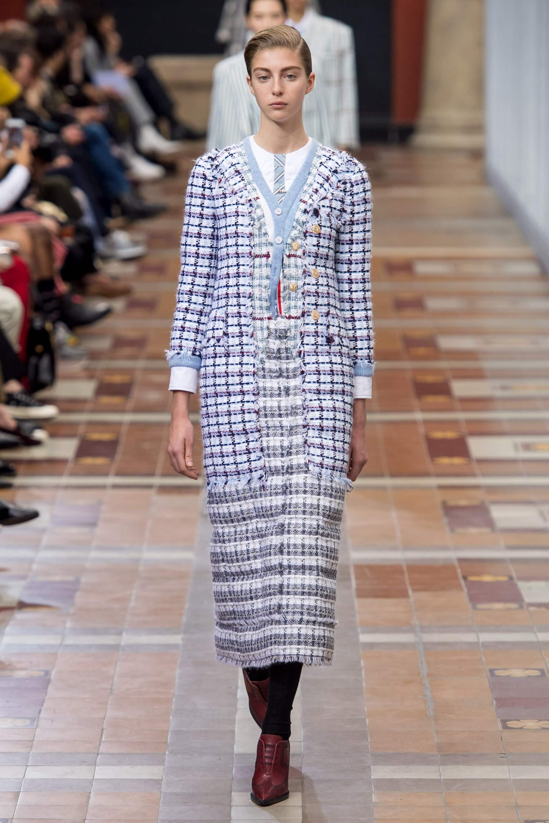 Показ Thom Browne под названием Working Girl прошел в парижской Национальной высшей школе изящных искусств. Внутри одного из залов был выстроен импровизированный офис с рабочими местами и печатными машинками. Модели заходили внутрь, рассаживались за столы и набирали тексты, после чего вставали и расходились по подиуму — в строгих серых костюмах, бежевых макинтошах, вязанных на мужской манер кардиганах, с дипломатами в руках и в гольфах, закрепленных на ногах мужскими подтяжками.