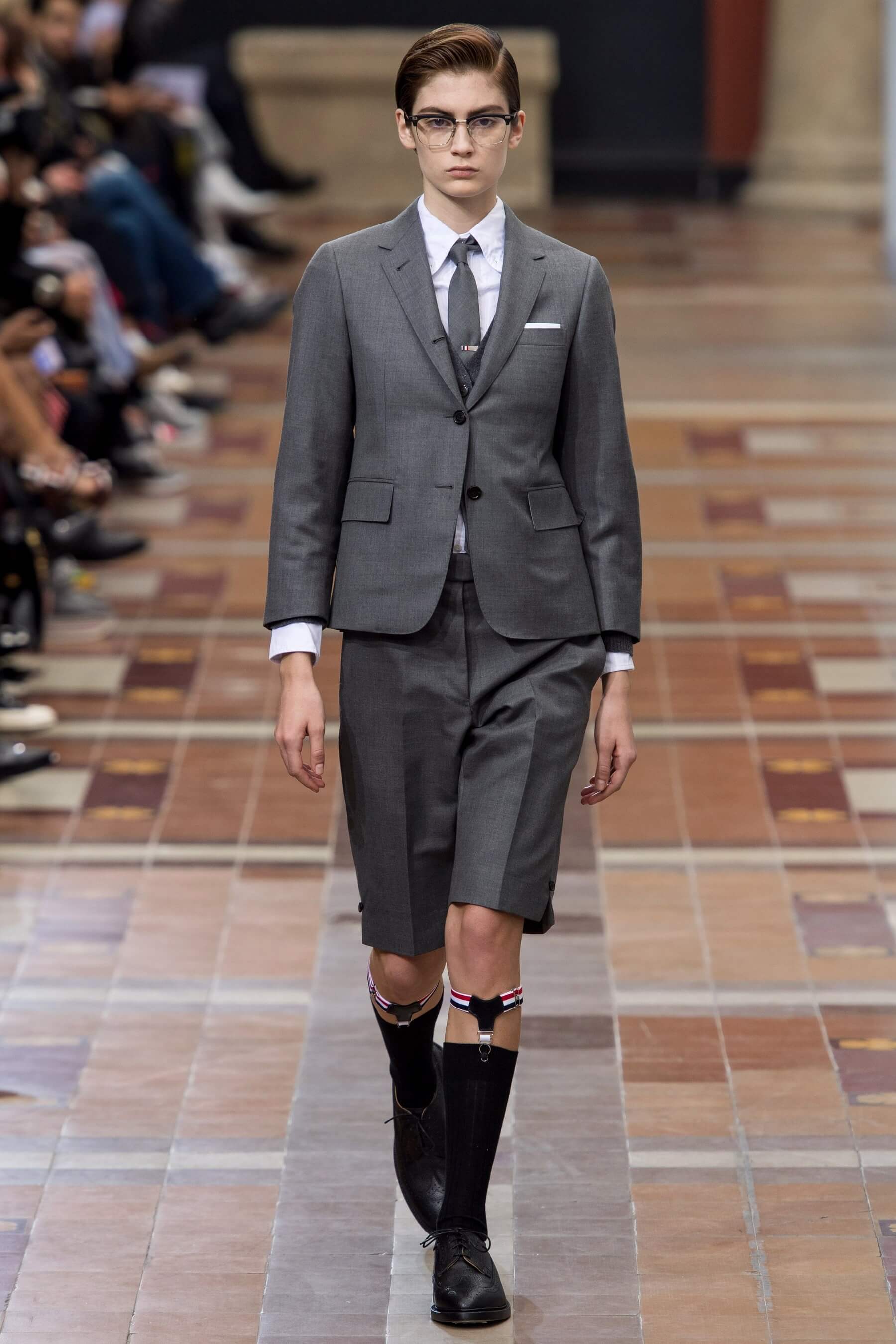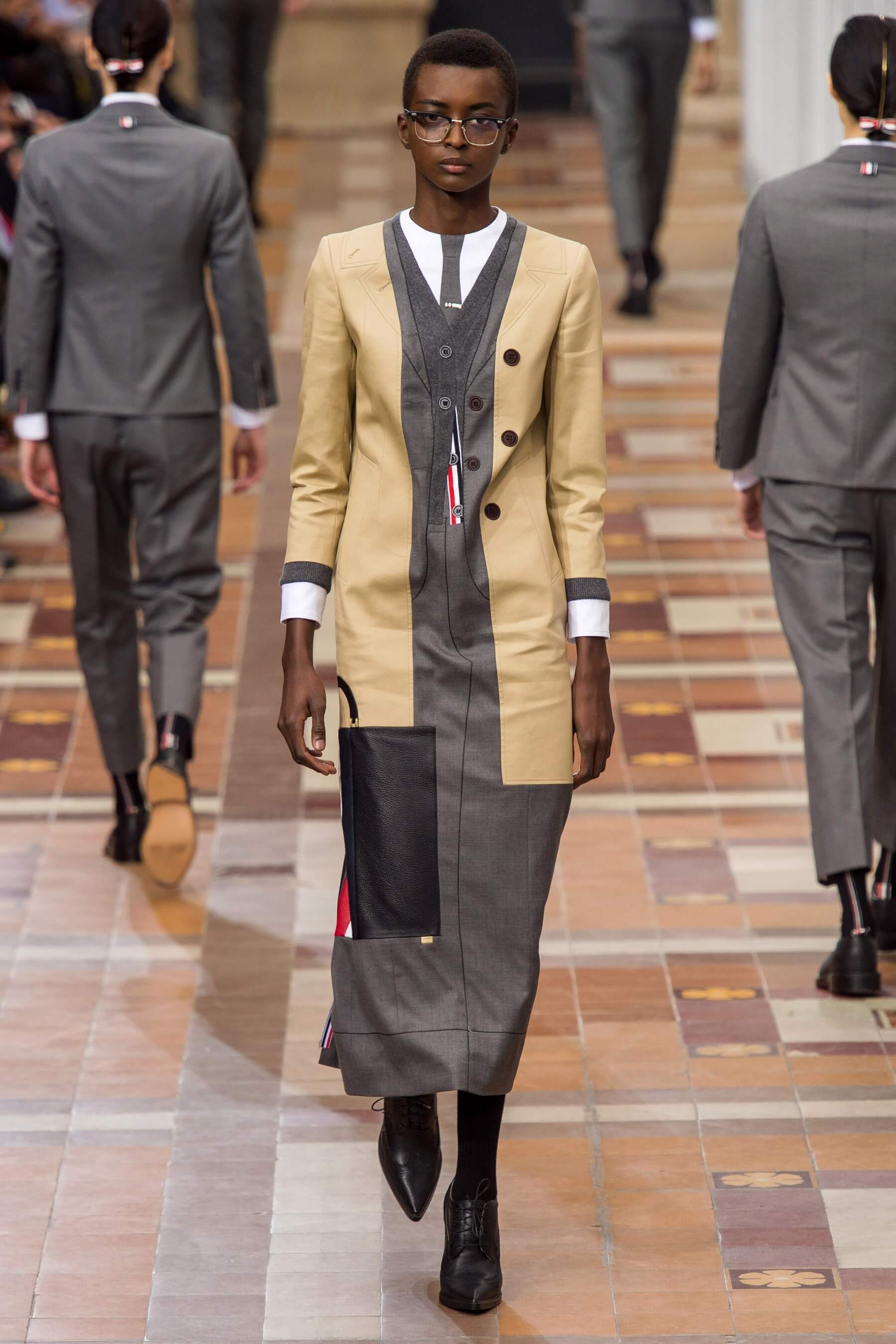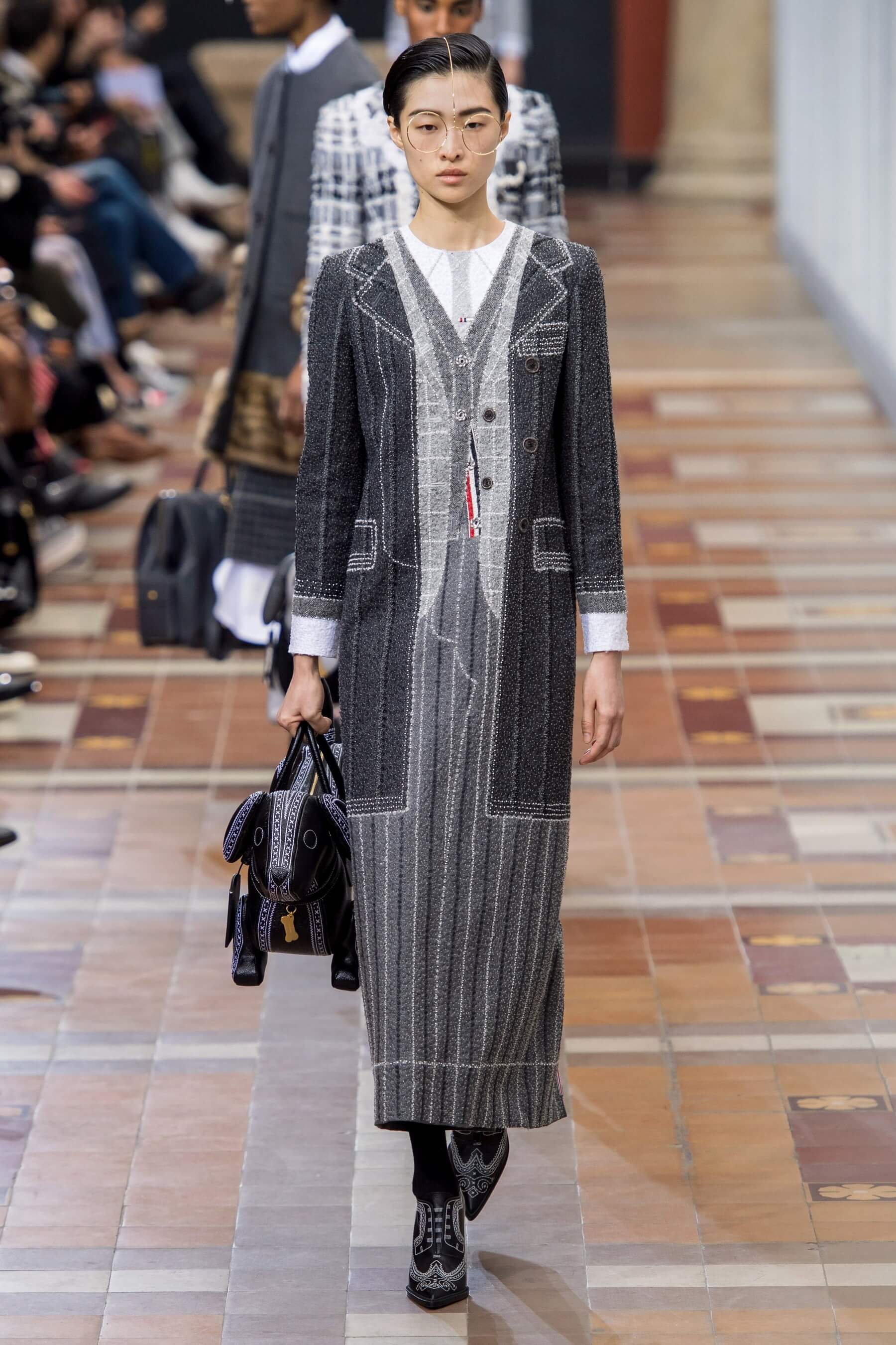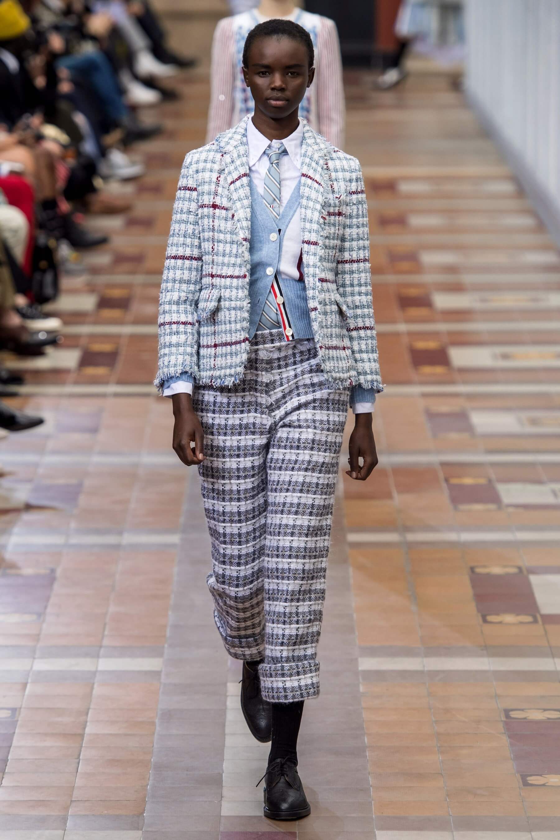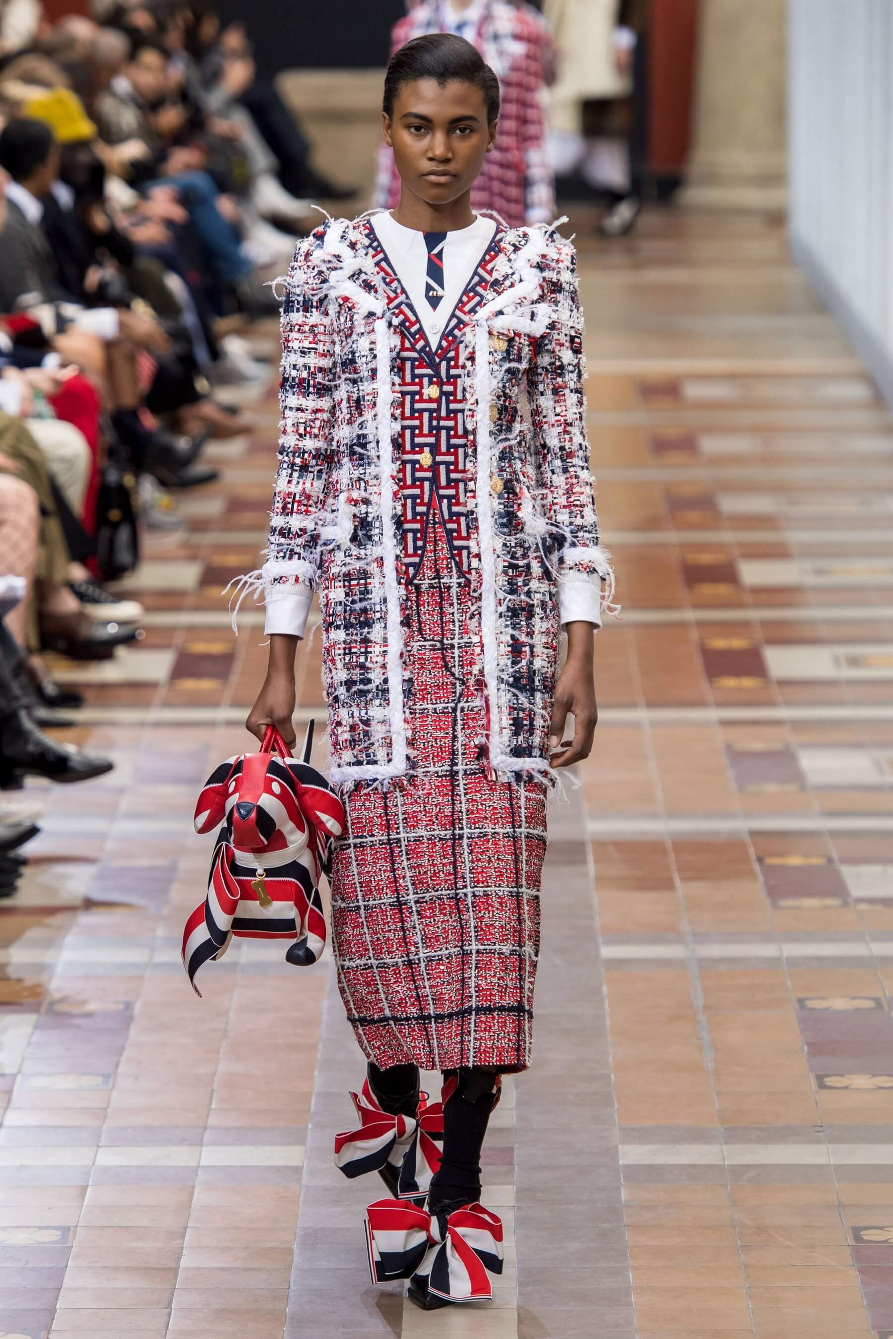 Показ Thom Browne под названием Working Girl прошел в парижской Национальной высшей школе изящных искусств. Внутри одного из залов был выстроен импровизированный офис с рабочими местами и печатными машинками. Модели заходили внутрь, рассаживались за столы и набирали тексты, после чего вставали и расходились по подиуму — в строгих серых костюмах, бежевых макинтошах, вязанных на мужской манер кардиганах, с дипломатами в руках и в гольфах, закрепленных на ногах мужскими подтяжками.