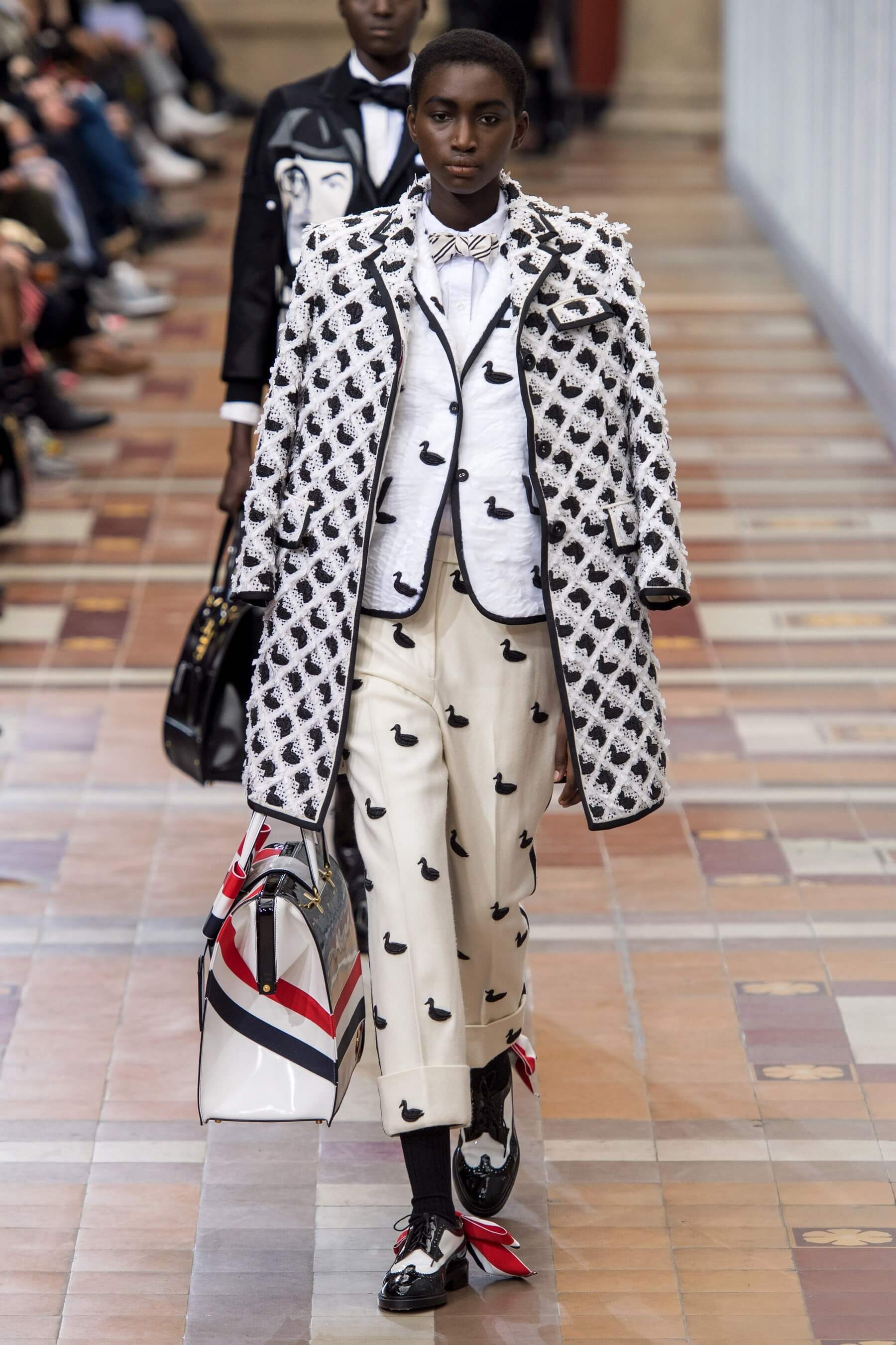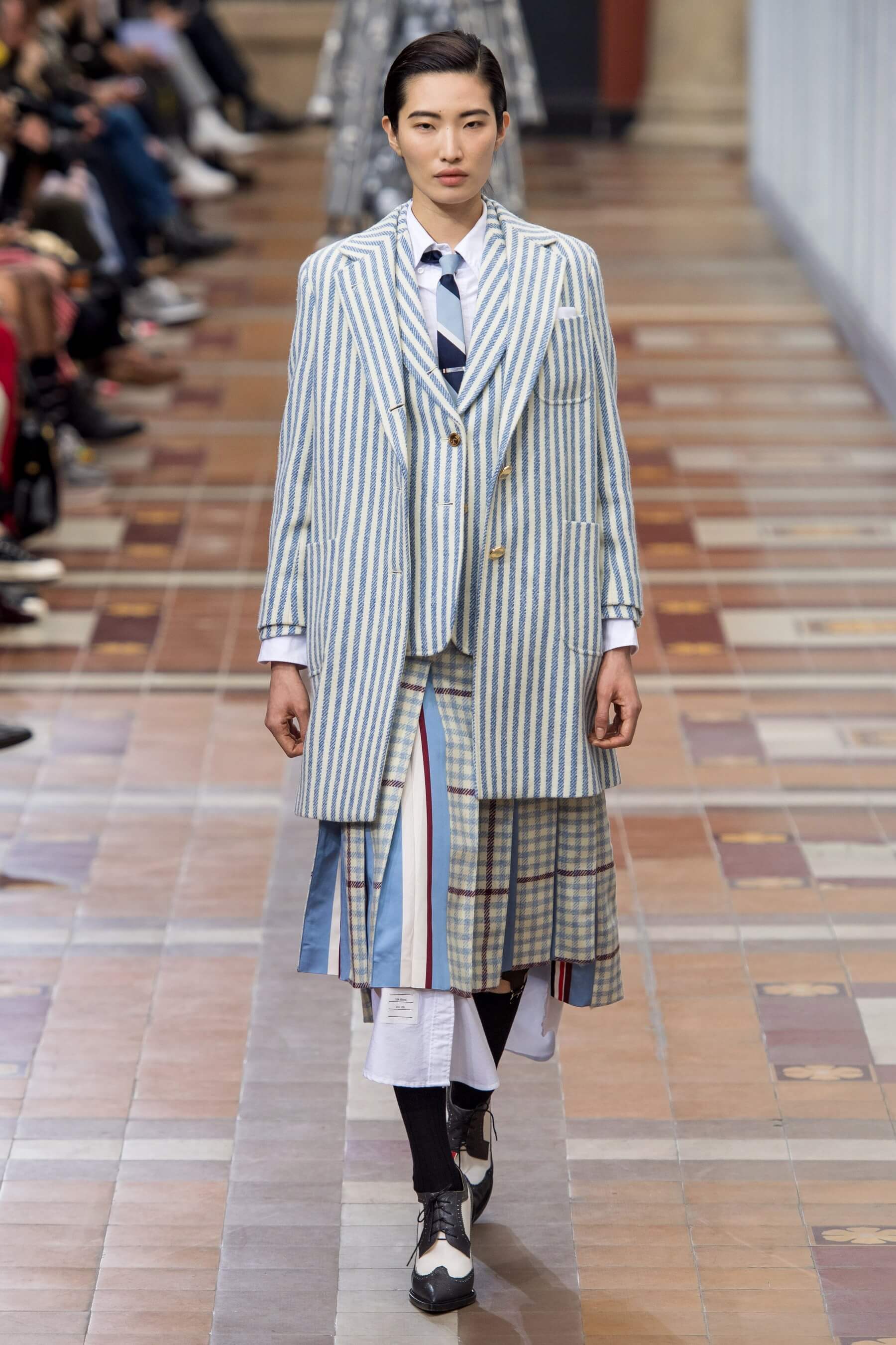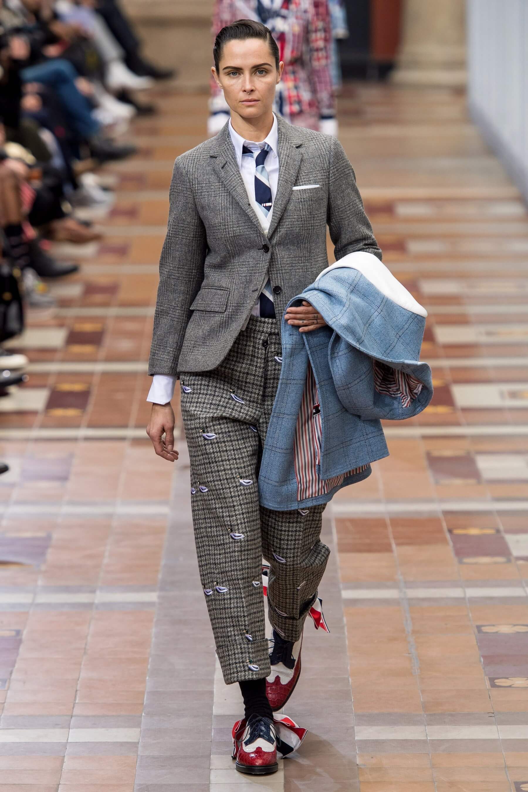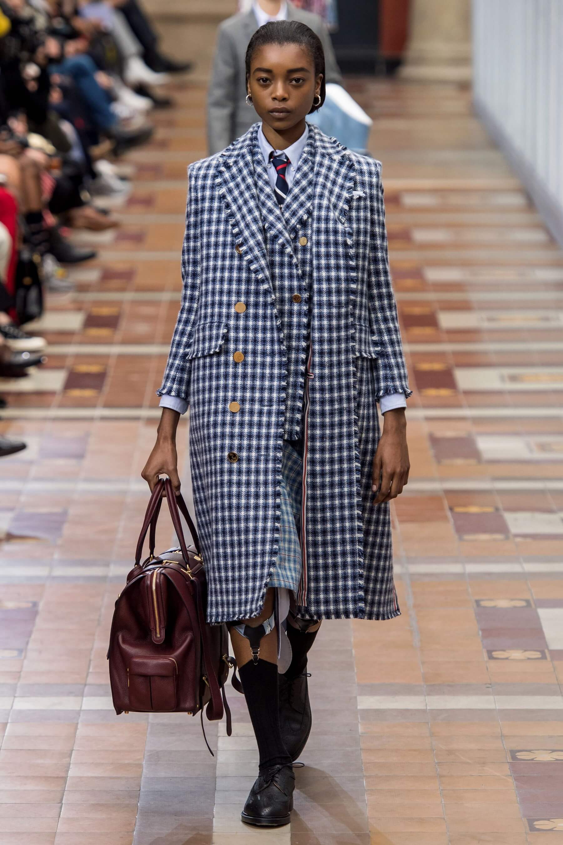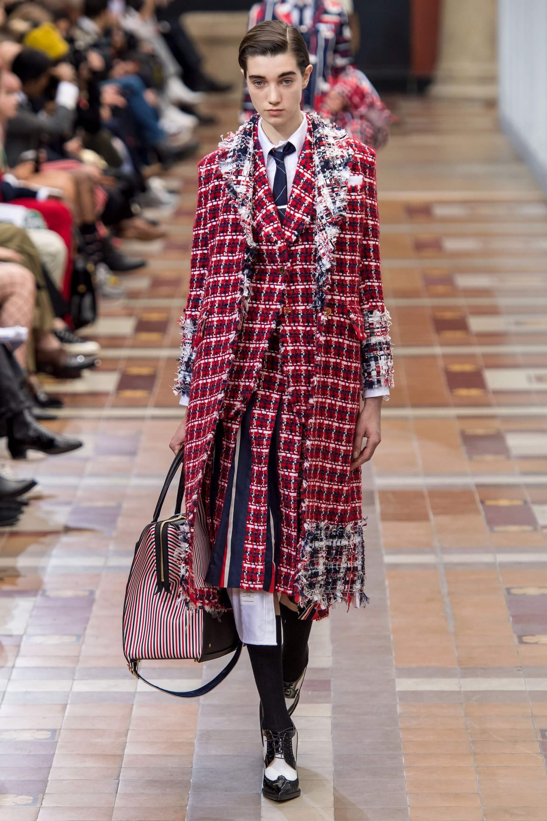 Показ Thom Browne под названием Working Girl прошел в парижской Национальной высшей школе изящных искусств. Внутри одного из залов был выстроен импровизированный офис с рабочими местами и печатными машинками. Модели заходили внутрь, рассаживались за столы и набирали тексты, после чего вставали и расходились по подиуму — в строгих серых костюмах, бежевых макинтошах, вязанных на мужской манер кардиганах, с дипломатами в руках и в гольфах, закрепленных на ногах мужскими подтяжками.