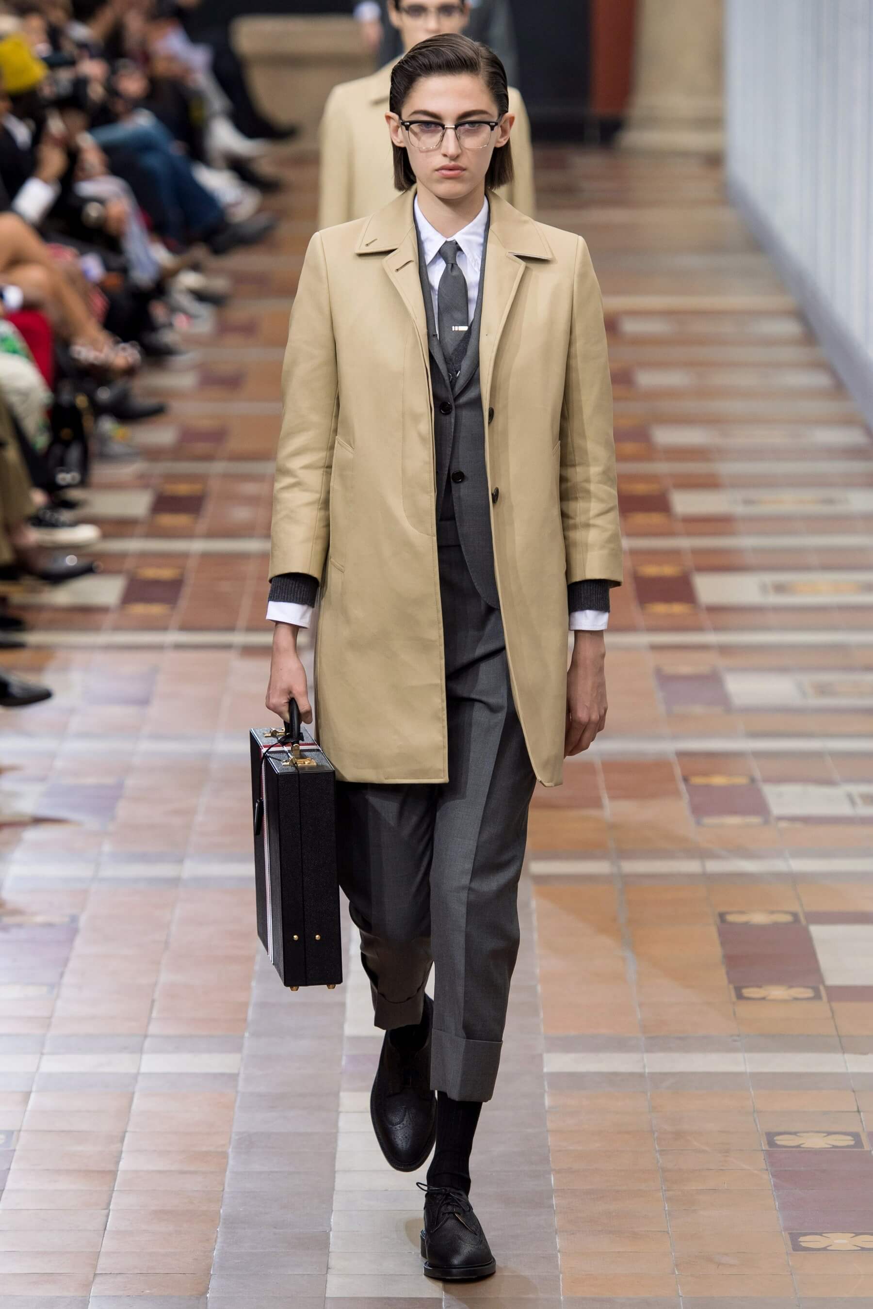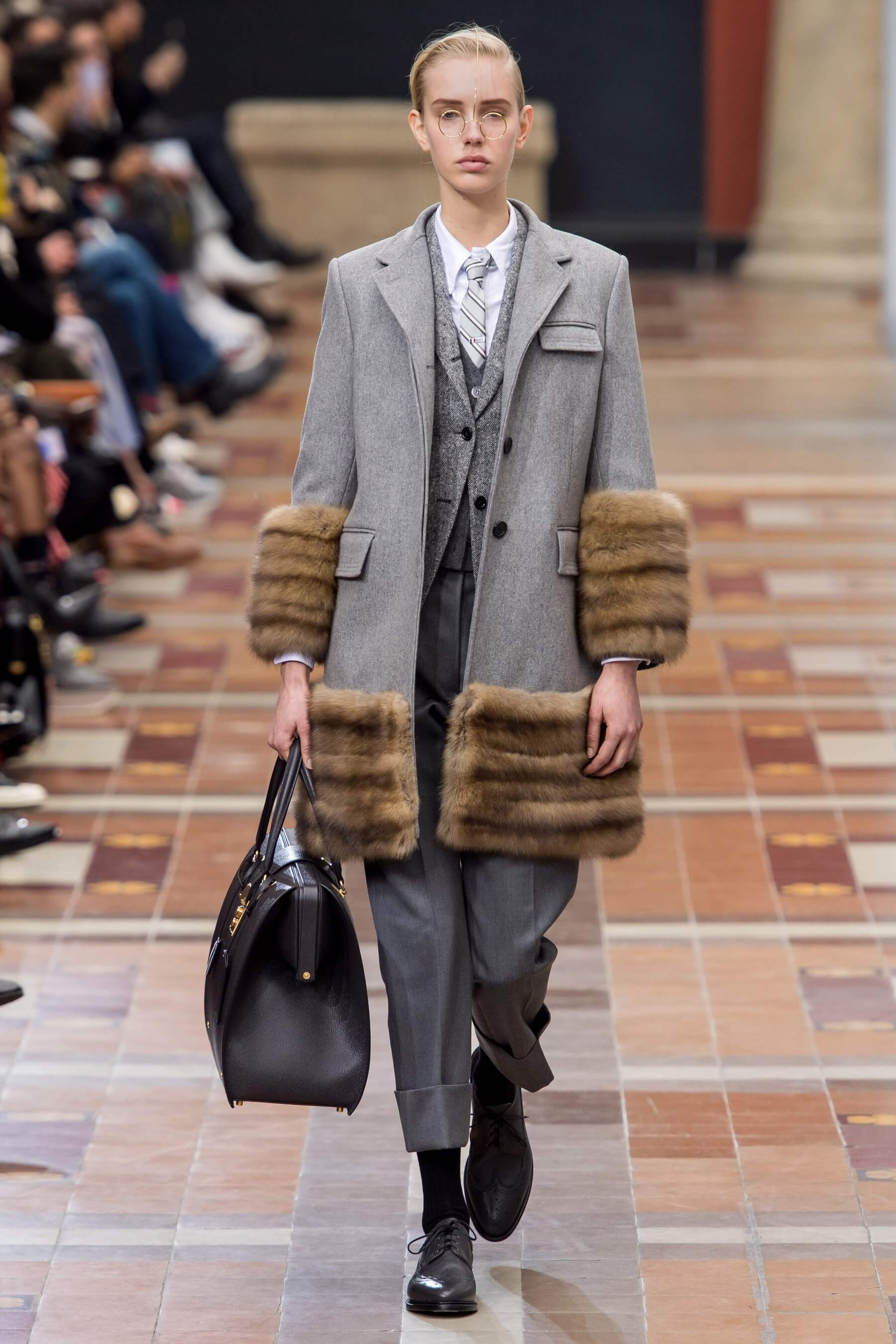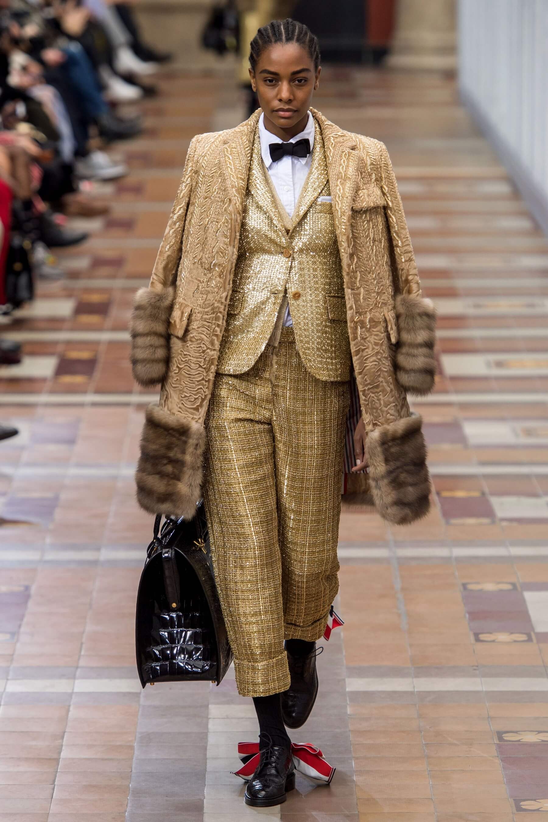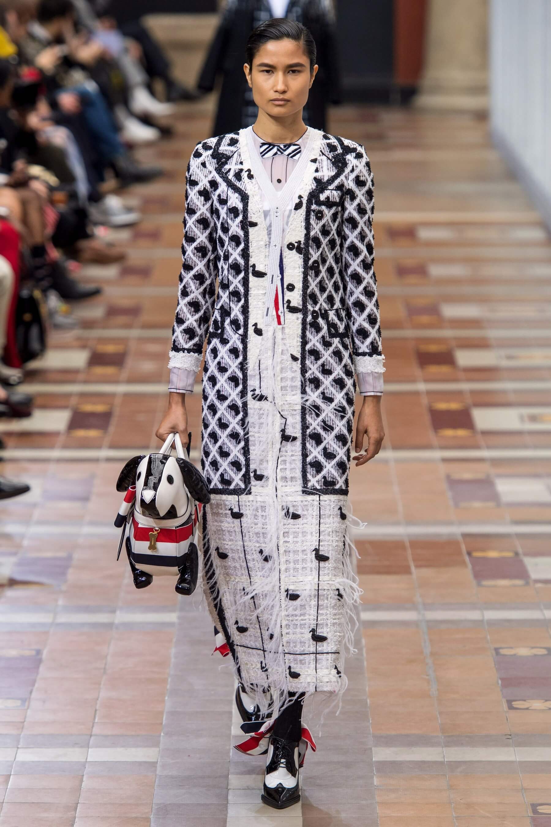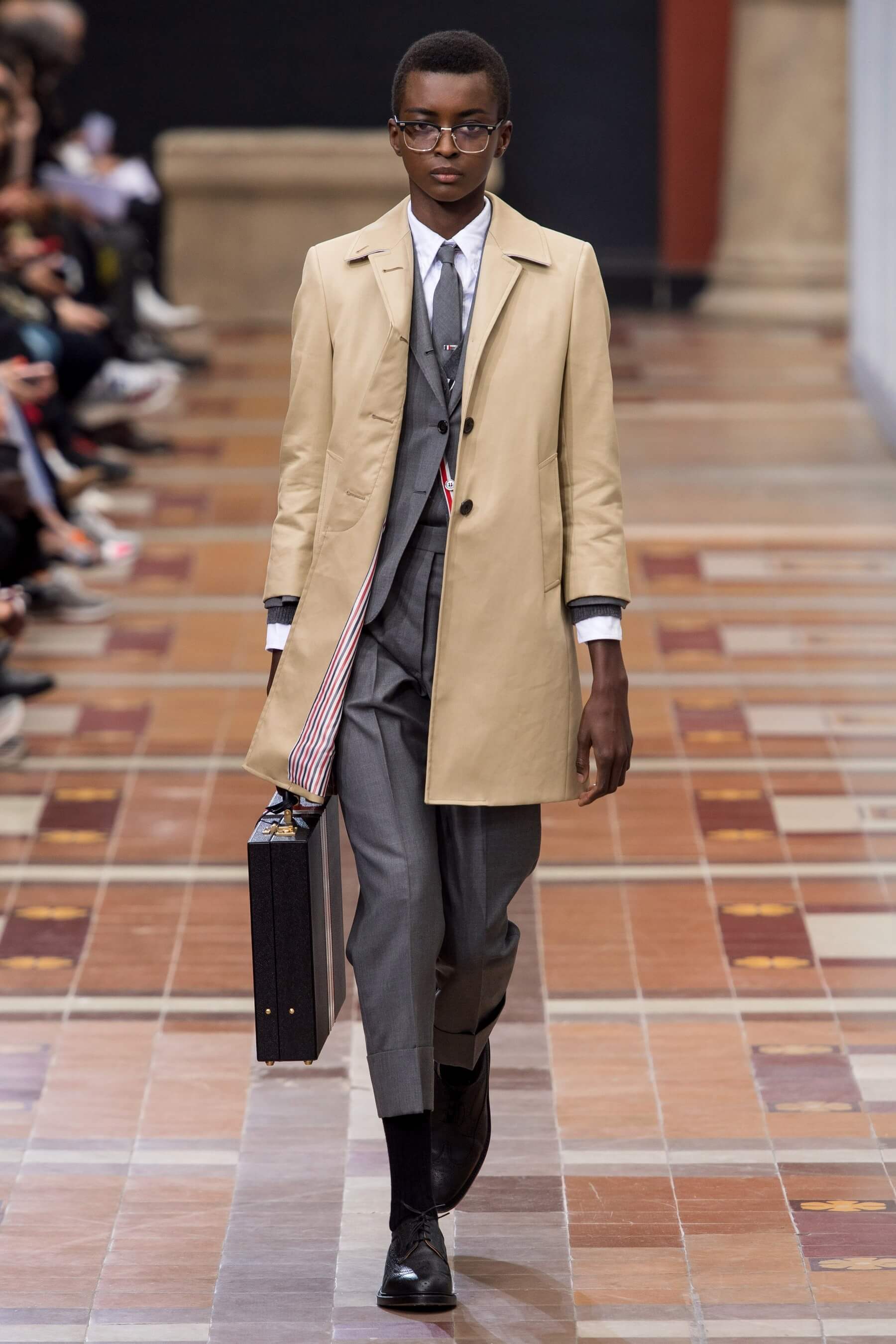 Показ Thom Browne под названием Working Girl прошел в парижской Национальной высшей школе изящных искусств. Внутри одного из залов был выстроен импровизированный офис с рабочими местами и печатными машинками. Модели заходили внутрь, рассаживались за столы и набирали тексты, после чего вставали и расходились по подиуму — в строгих серых костюмах, бежевых макинтошах, вязанных на мужской манер кардиганах, с дипломатами в руках и в гольфах, закрепленных на ногах мужскими подтяжками.