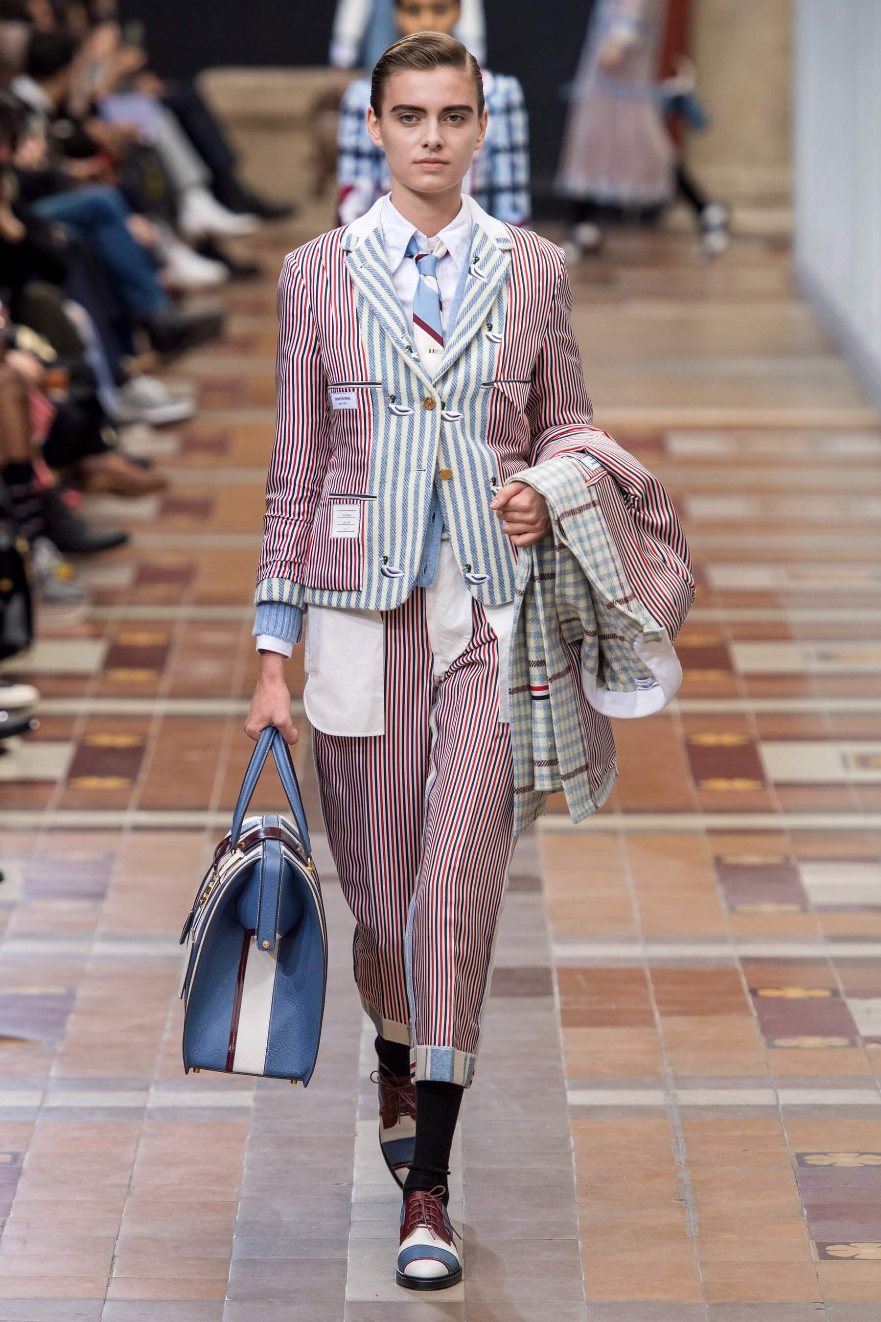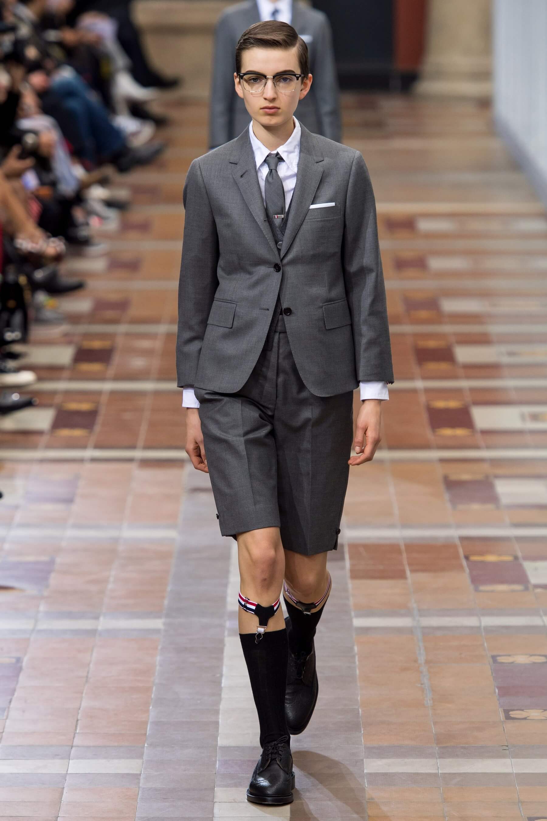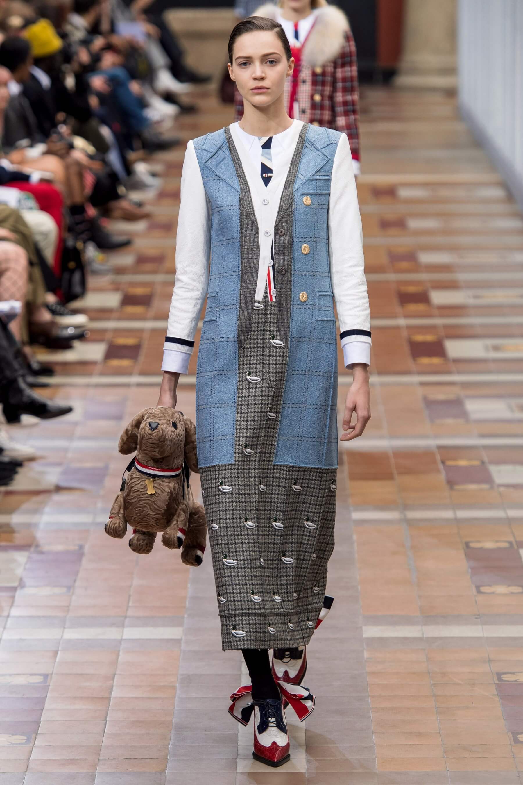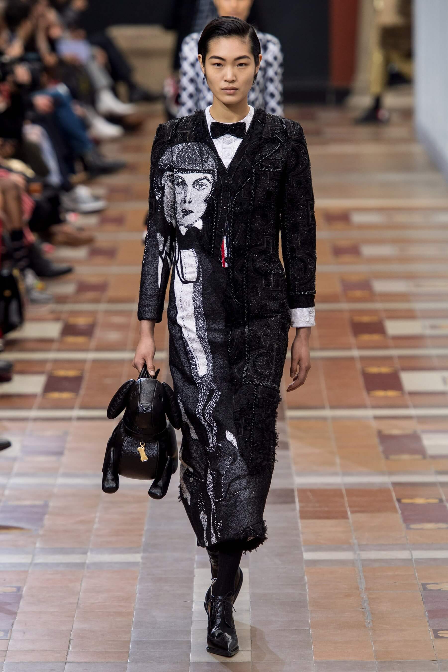 Показ Thom Browne под названием Working Girl прошел в парижской Национальной высшей школе изящных искусств. Внутри одного из залов был выстроен импровизированный офис с рабочими местами и печатными машинками. Модели заходили внутрь, рассаживались за столы и набирали тексты, после чего вставали и расходились по подиуму — в строгих серых костюмах, бежевых макинтошах, вязанных на мужской манер кардиганах, с дипломатами в руках и в гольфах, закрепленных на ногах мужскими подтяжками.