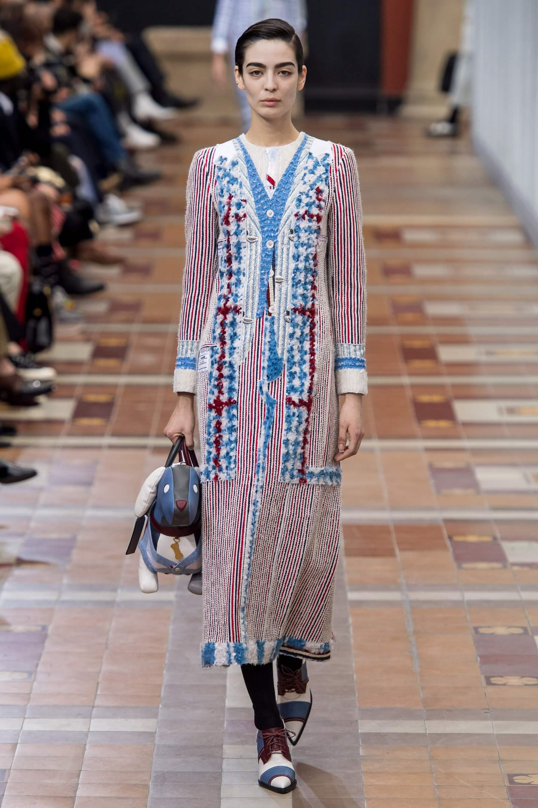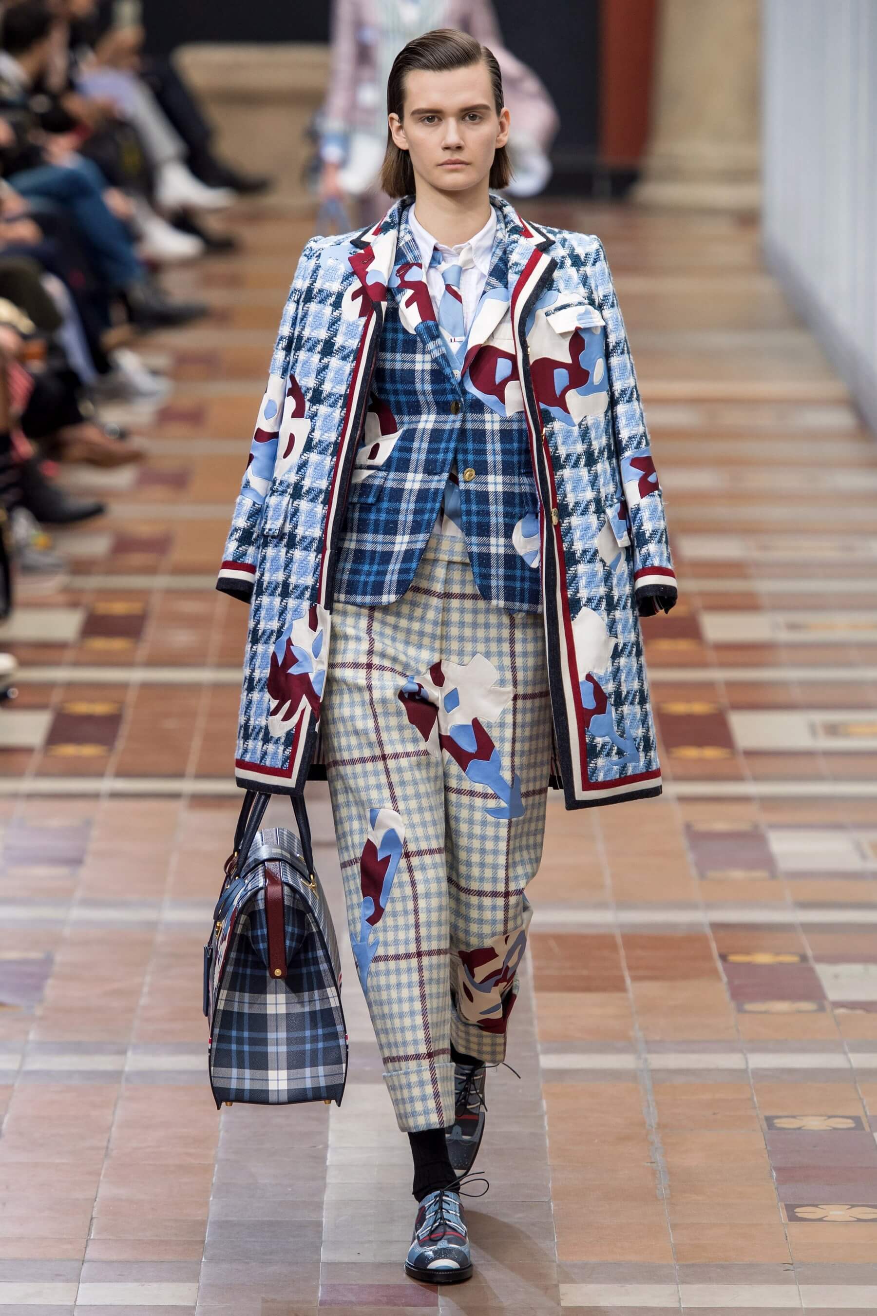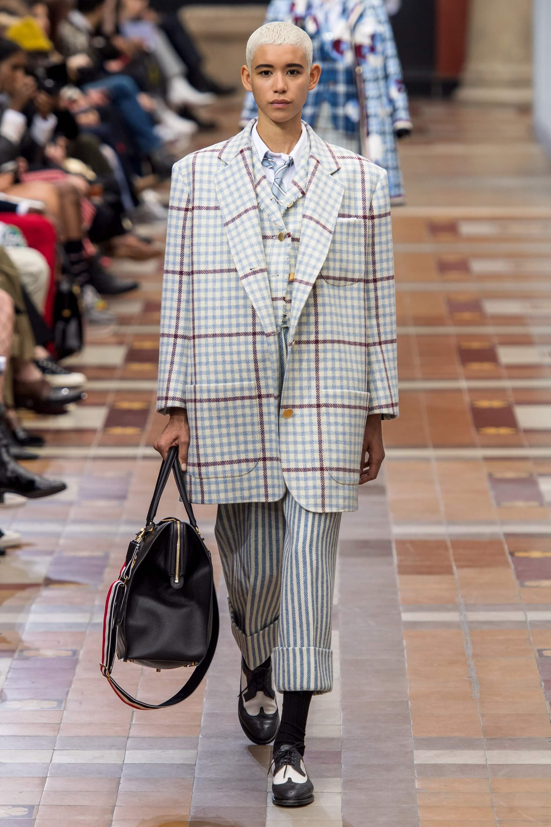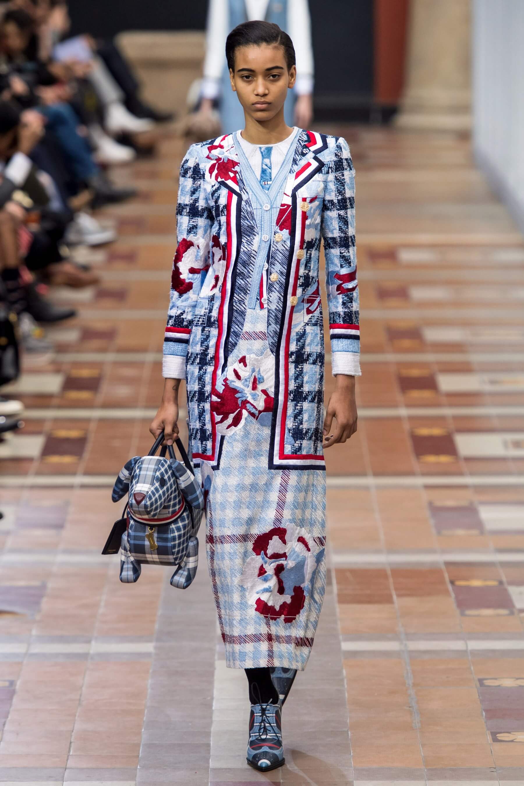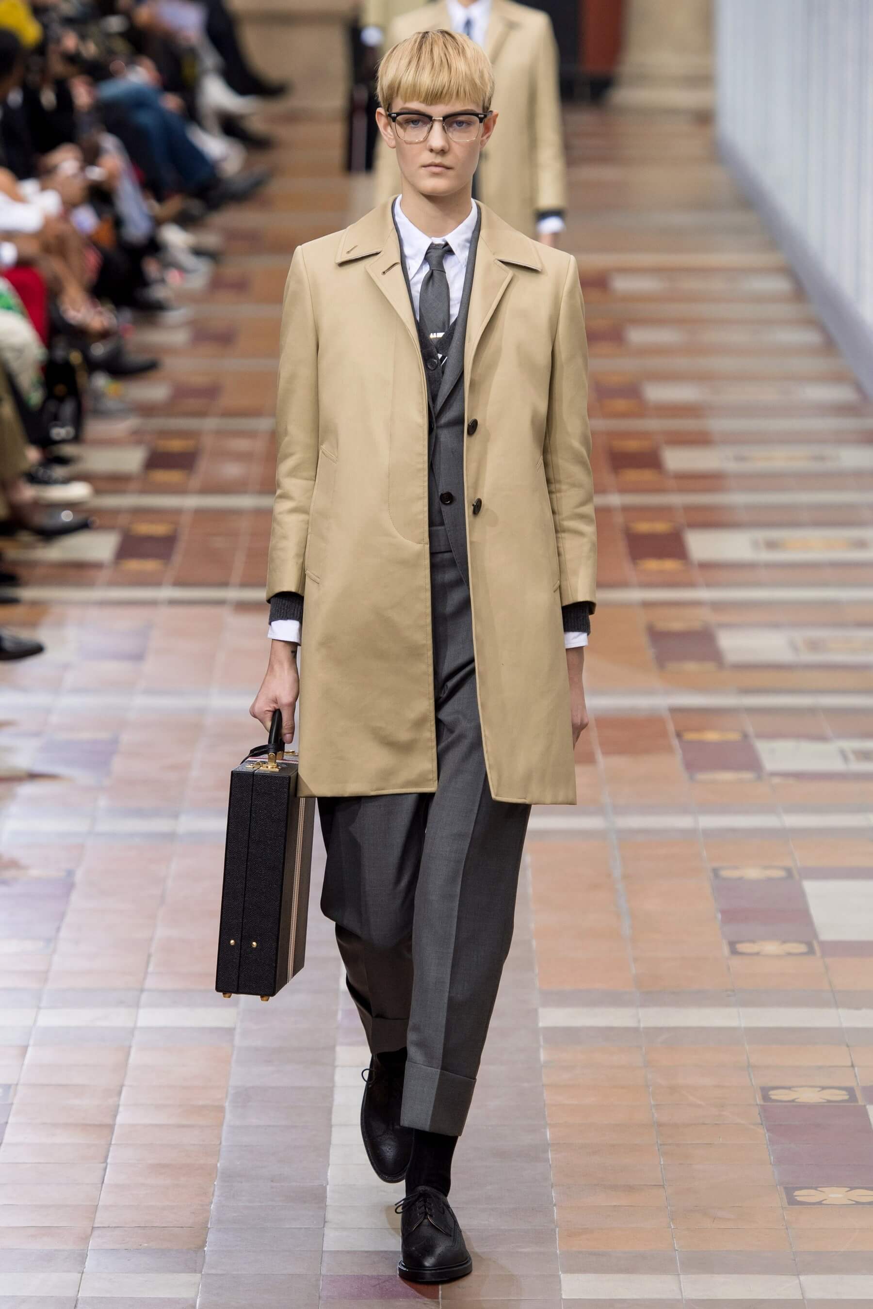 Показ Thom Browne под названием Working Girl прошел в парижской Национальной высшей школе изящных искусств. Внутри одного из залов был выстроен импровизированный офис с рабочими местами и печатными машинками. Модели заходили внутрь, рассаживались за столы и набирали тексты, после чего вставали и расходились по подиуму — в строгих серых костюмах, бежевых макинтошах, вязанных на мужской манер кардиганах, с дипломатами в руках и в гольфах, закрепленных на ногах мужскими подтяжками.