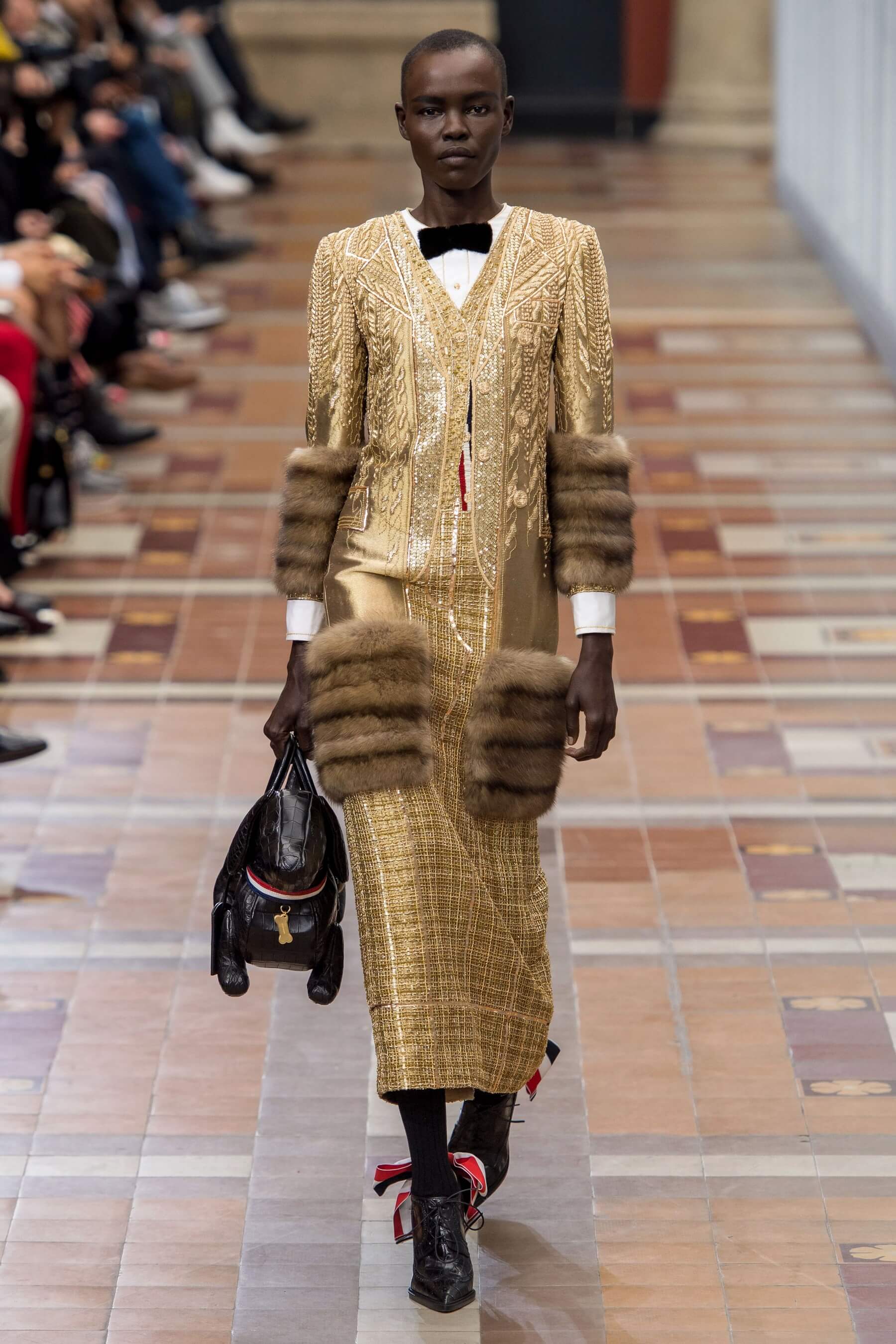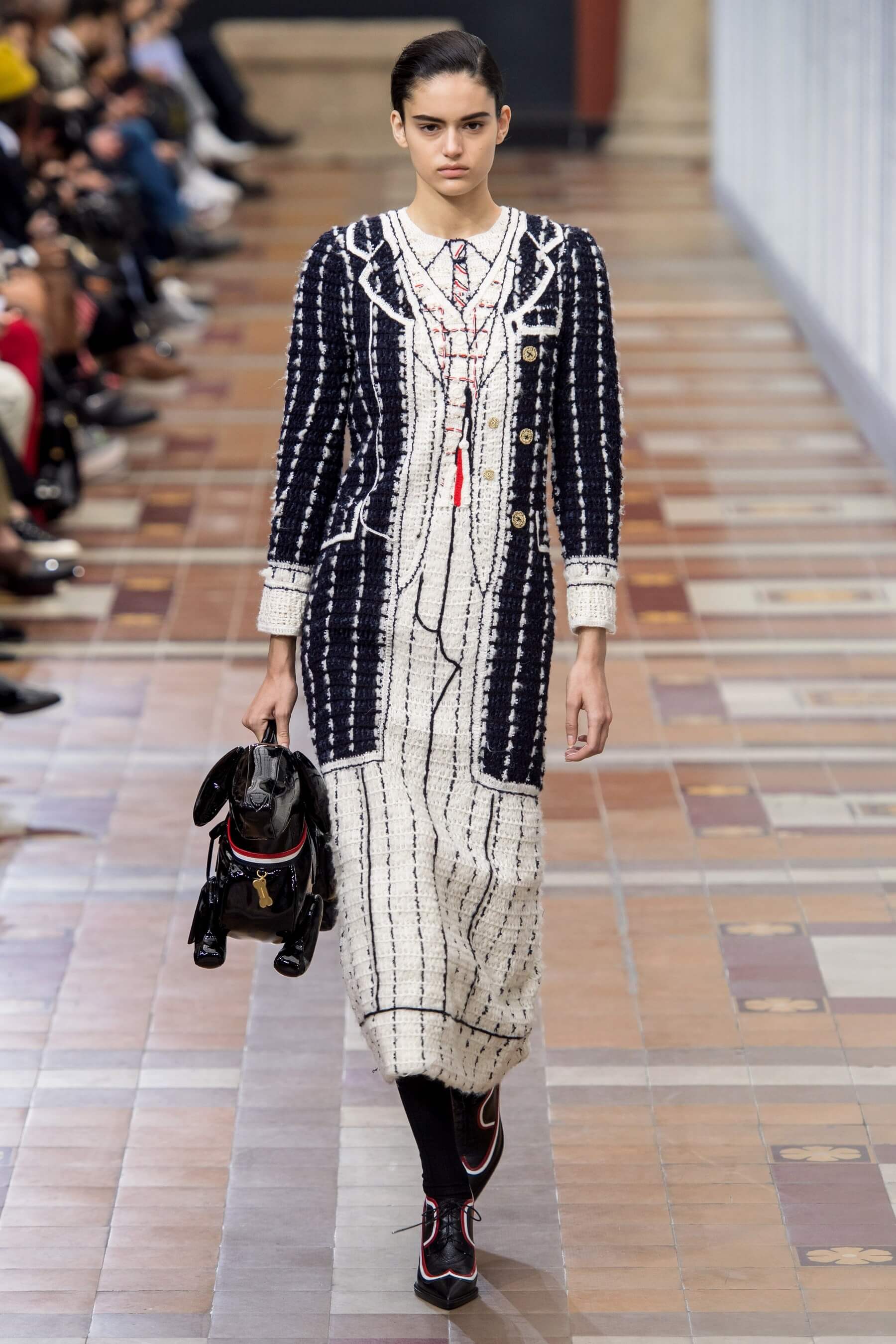 Твидовые костюмы, гламурные пальто с меховыми манжетами и полами и платья с контрастными черно-белыми стежками дополнили уже знакомые сумки в виде собак, а на отдельных костюмах расположились ироничные уточки, которых мы также видели на показе в январе. В качестве украшений к волосам моделей были прикреплены очки и монокли в тонких золотых оправах.