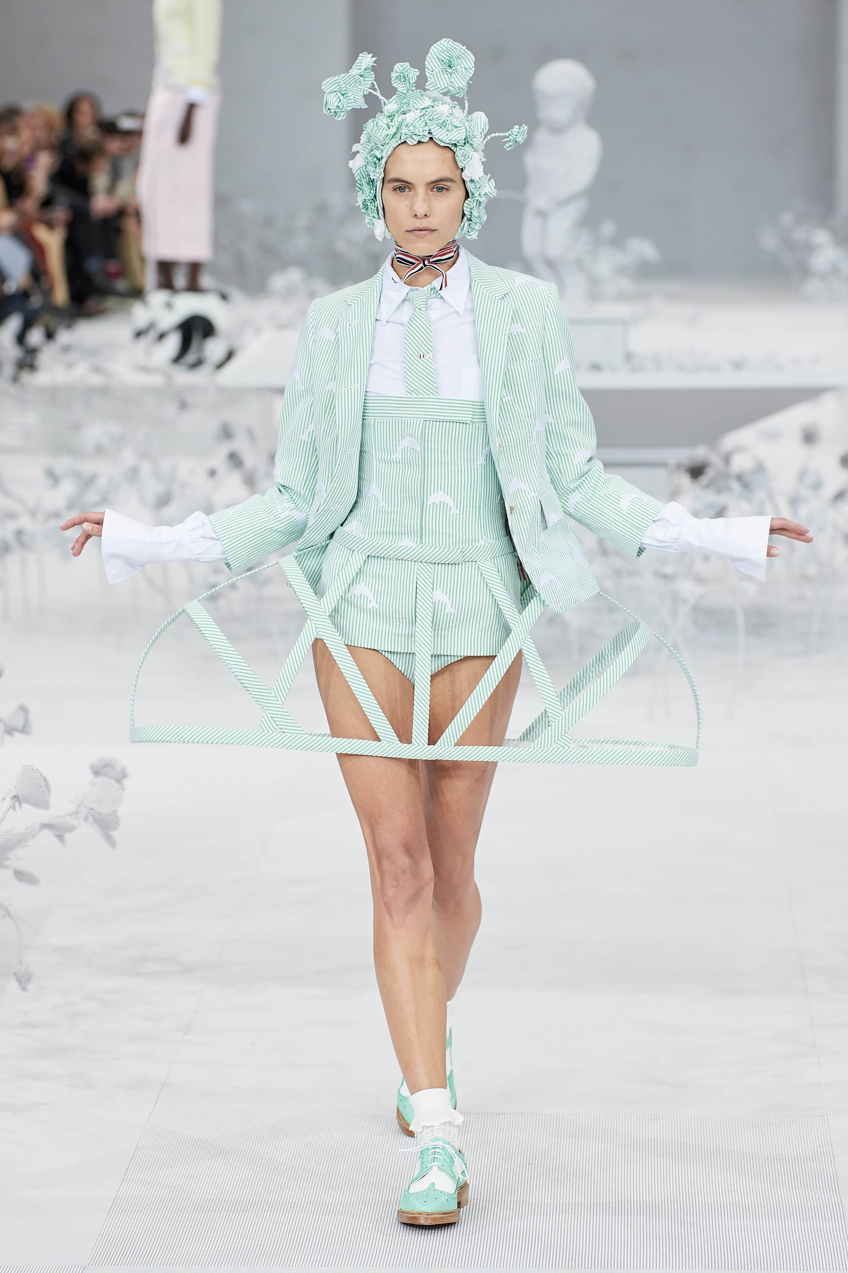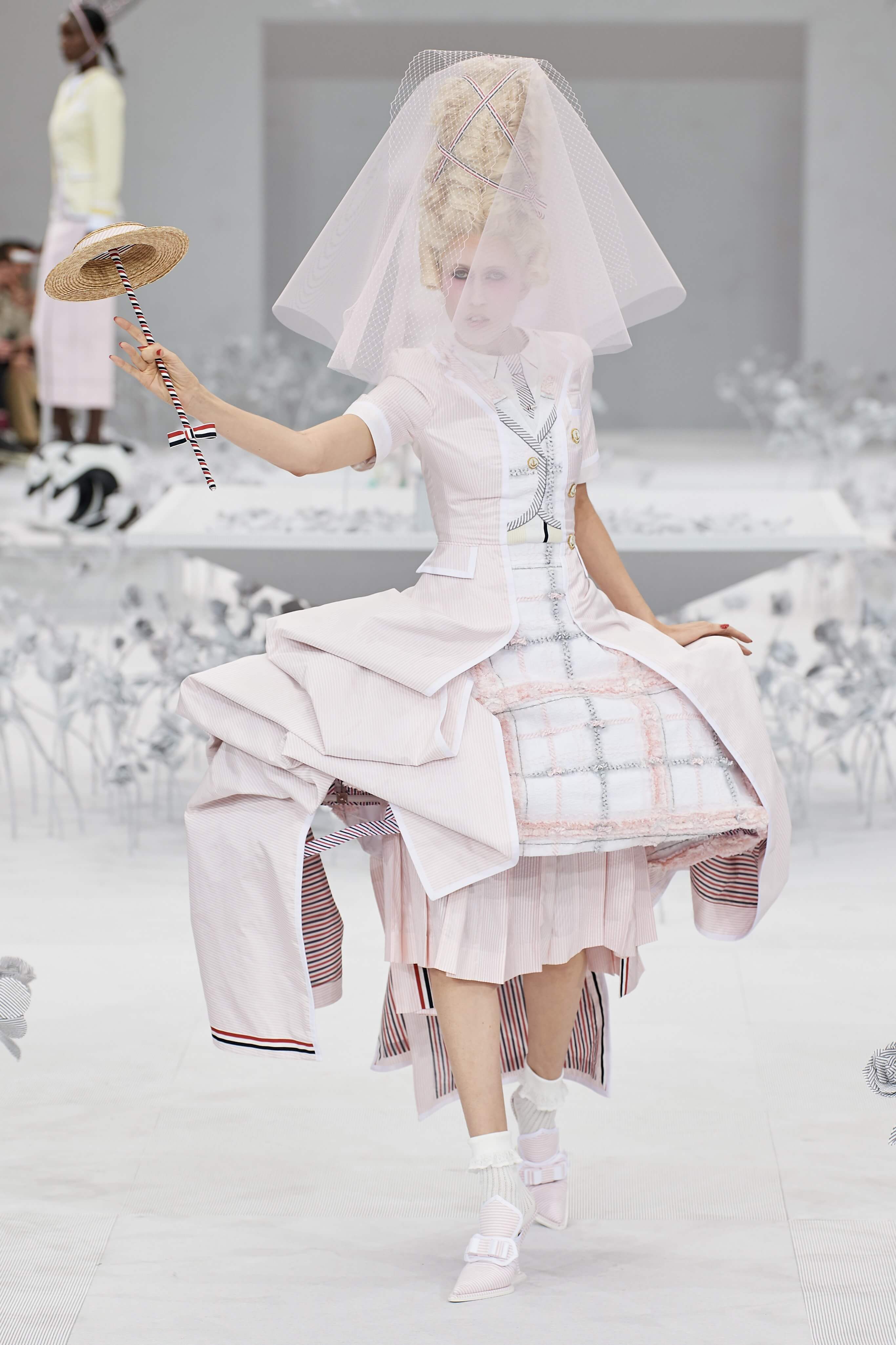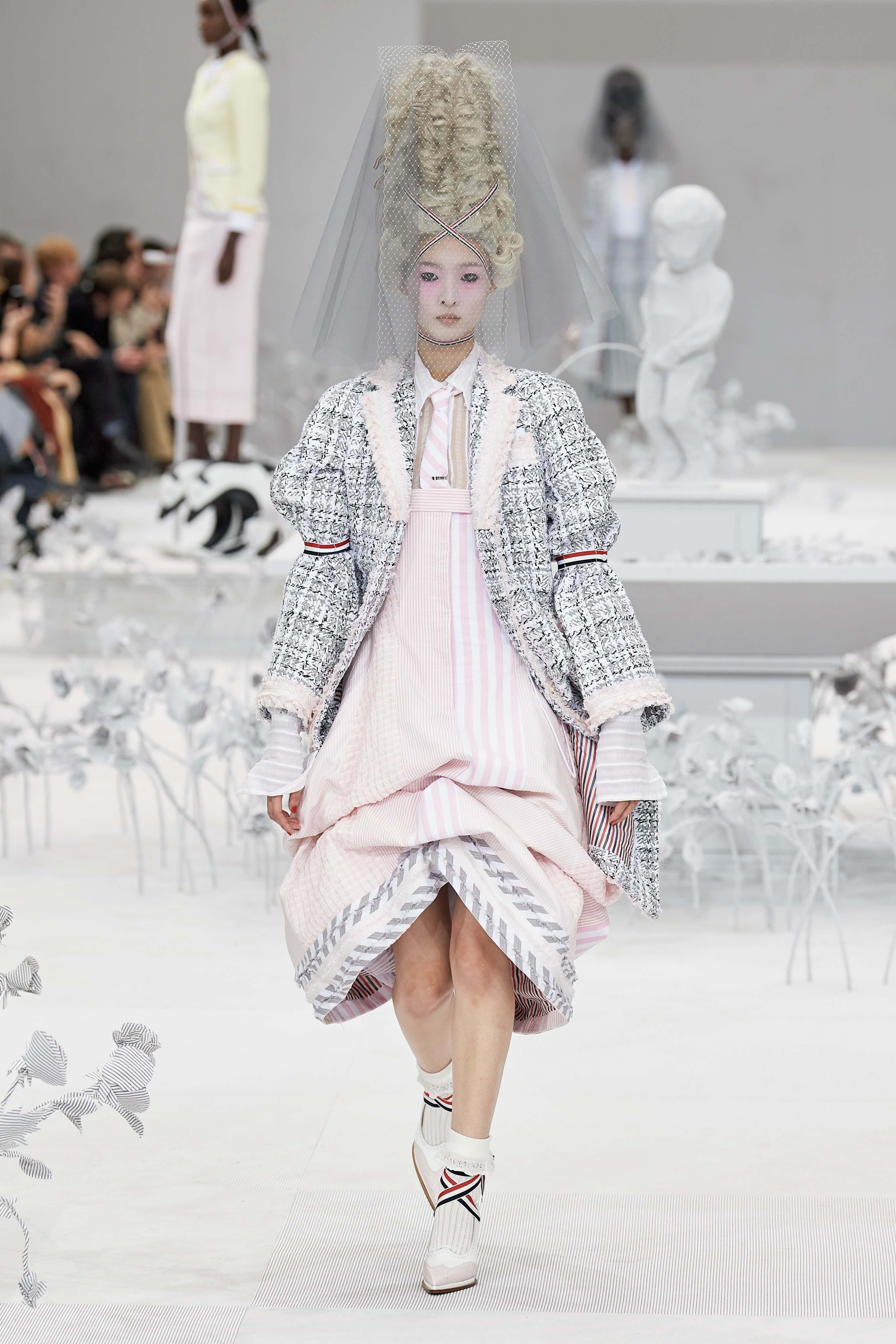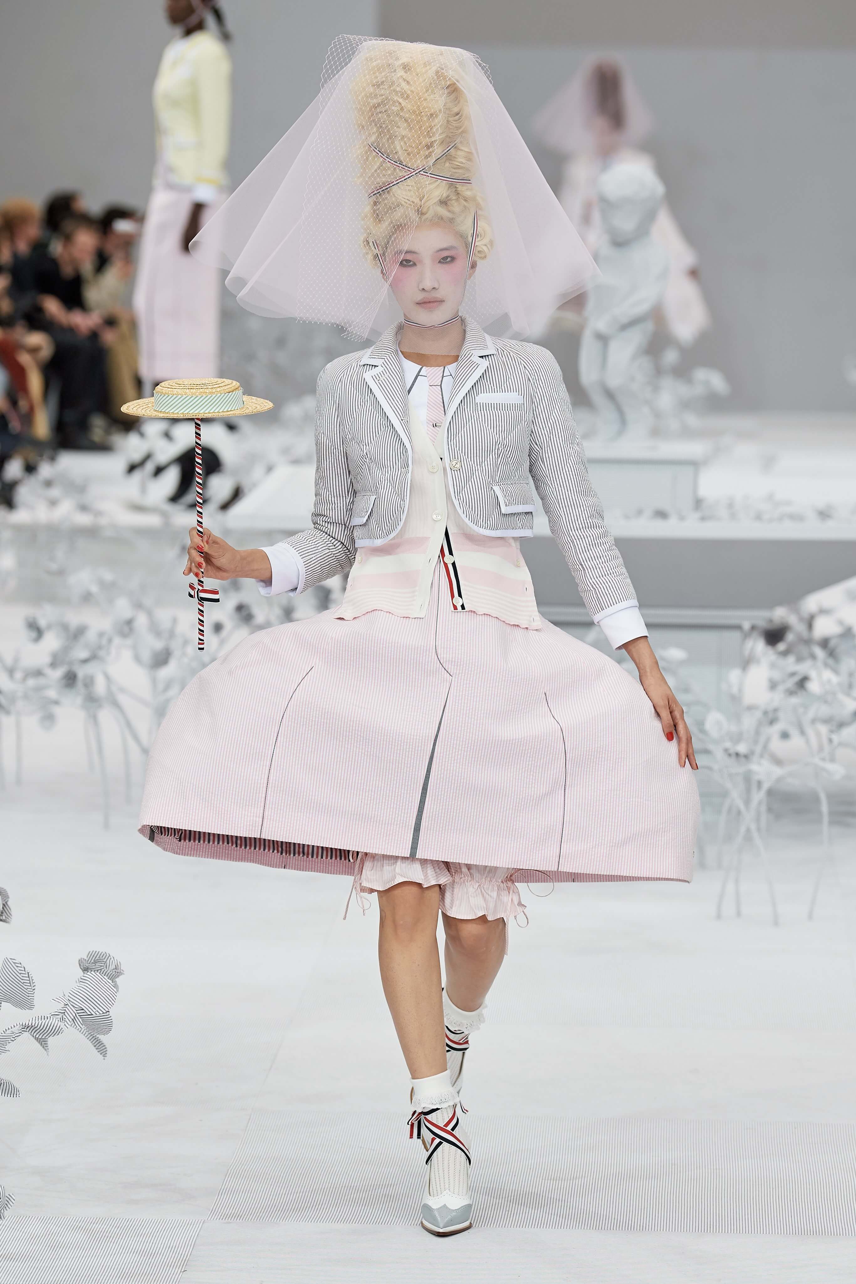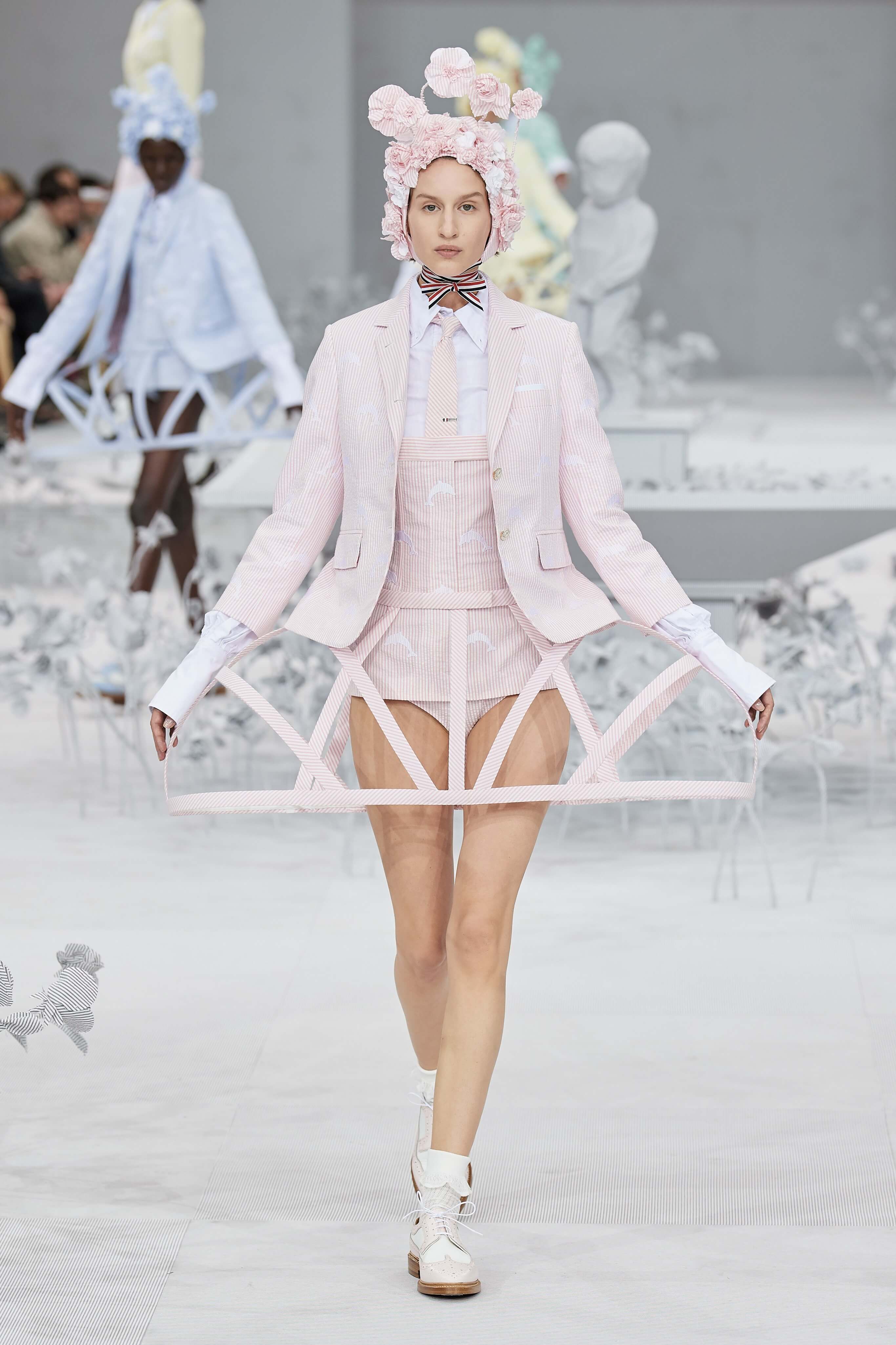 Конфетные костюмы с кринолинами вместо брюк, культовые платья Thom Browne с нарисованными тройками и галстуками, остроносые туфли с бантами, корсеты с розами, напоминающие бейсбольную экипировку, десятки метров прозрачного тюля и необыкновенно женственные платья из собранных в кокетливые драпировки твида и костюмного хлопка — всё это обильно декорировано бантиками и дополнено маленькими соломенными шляпками, которые модели держат в руках на палочках, как леденцы. Шуршащие юбки из наслоений лекал мужских костюмов, цикламеновые румяна, высокие прически с вуалями и неизменно ироничные аппликации на пастельных нарядах, как, например, тряпичный корабль, качающийся на волнах пышной юбки.